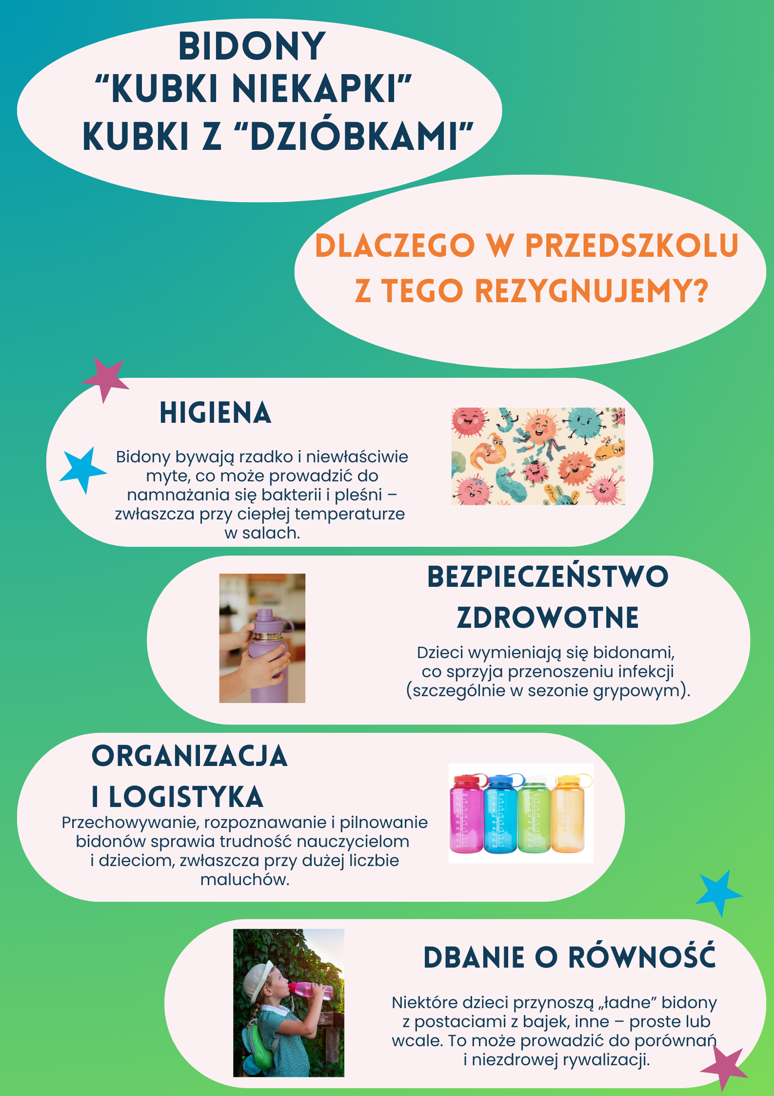 Prosimy, aby dzieci nie przynosiły do przedszkola napojów w bidonach ze słomką, kubkach z dzióbkami, kubkach "niekapkach".