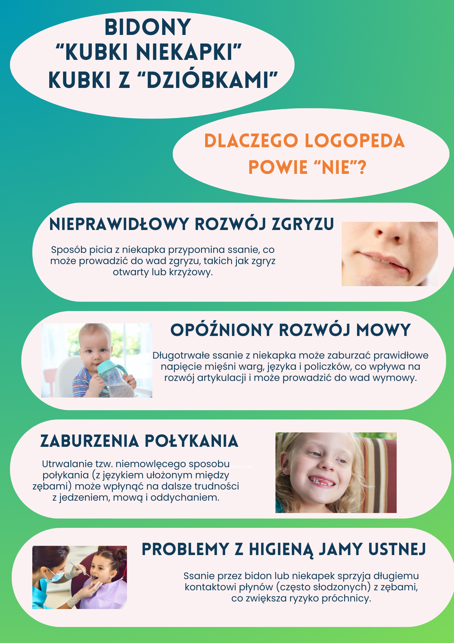 Także poza przedszkolem ograniczajcie picie Waszych pociech z tego rodzaju pojemników. Kiedy dziecko dostaje taki bidon zbyt wcześnie, zwykle ssie tak, jak wcześniej pierś lub butelkę - wysuwając język do przodu. To prosta droga do: