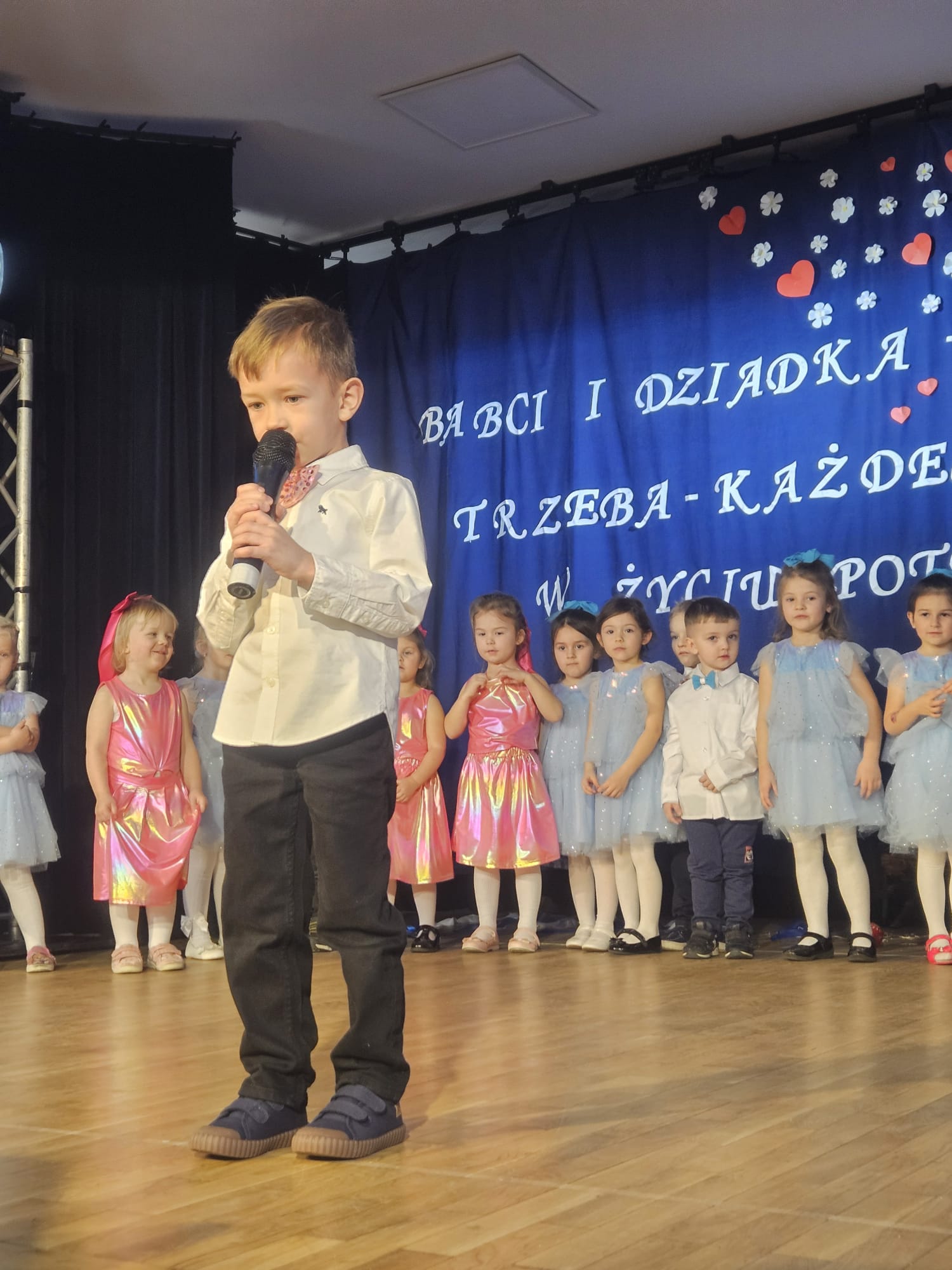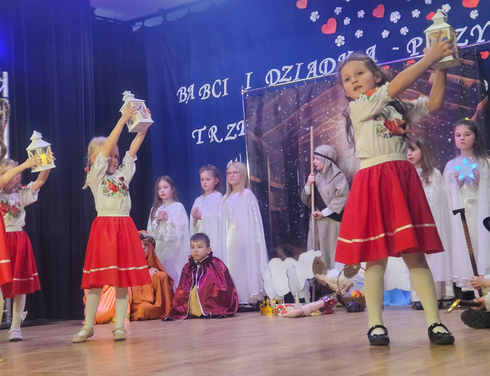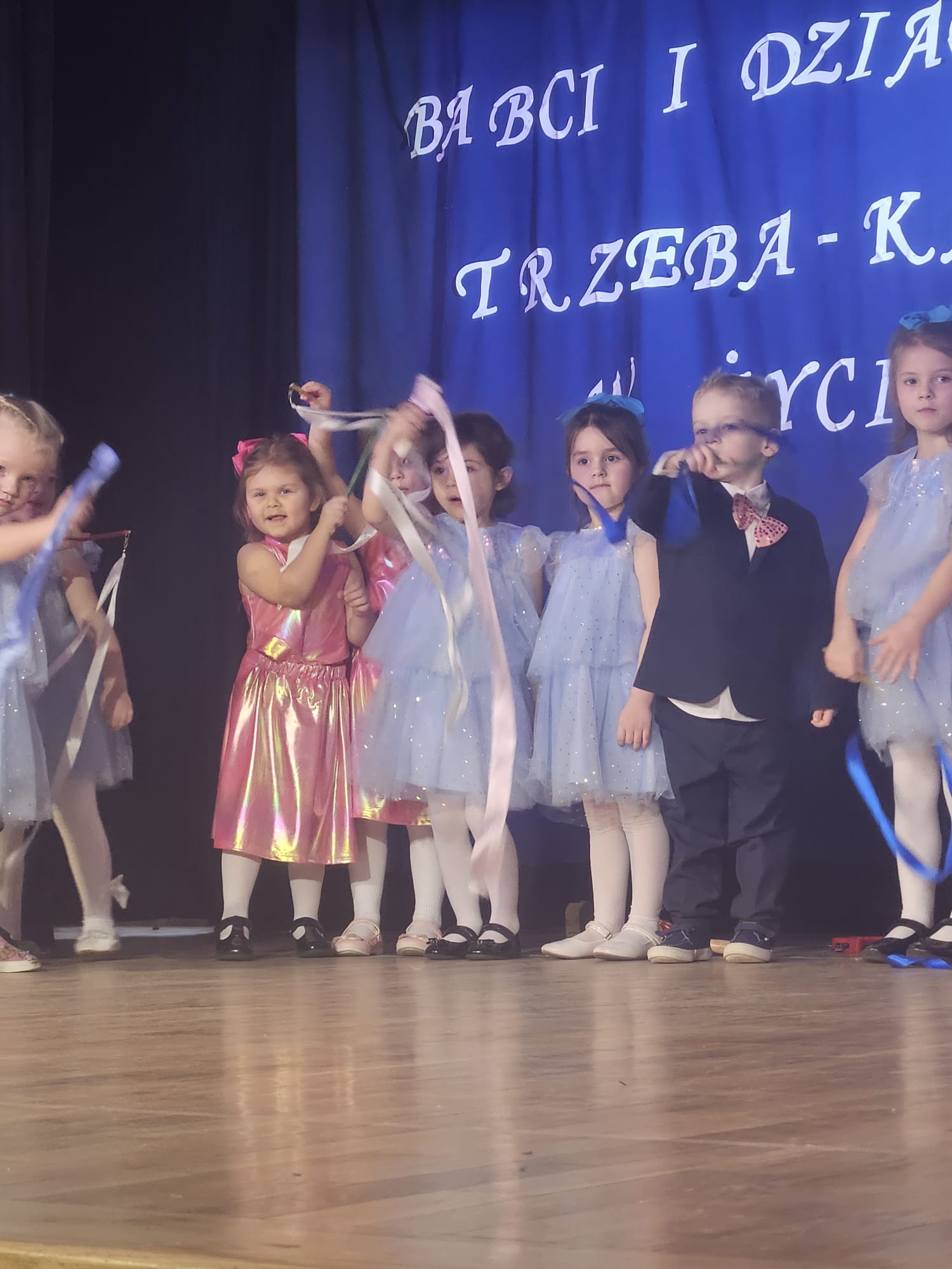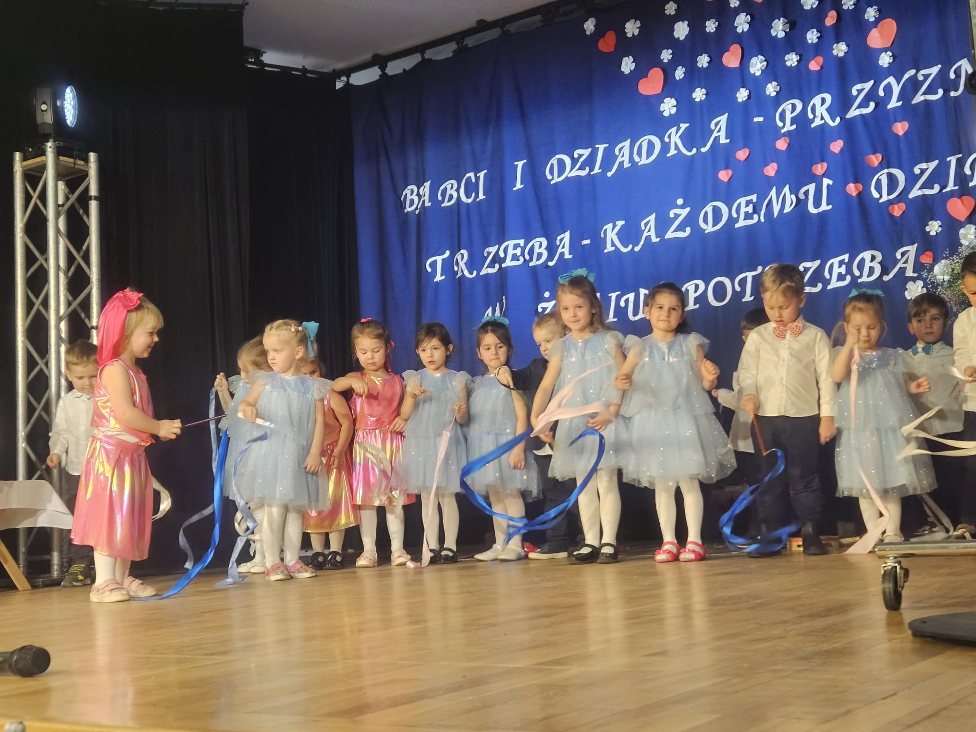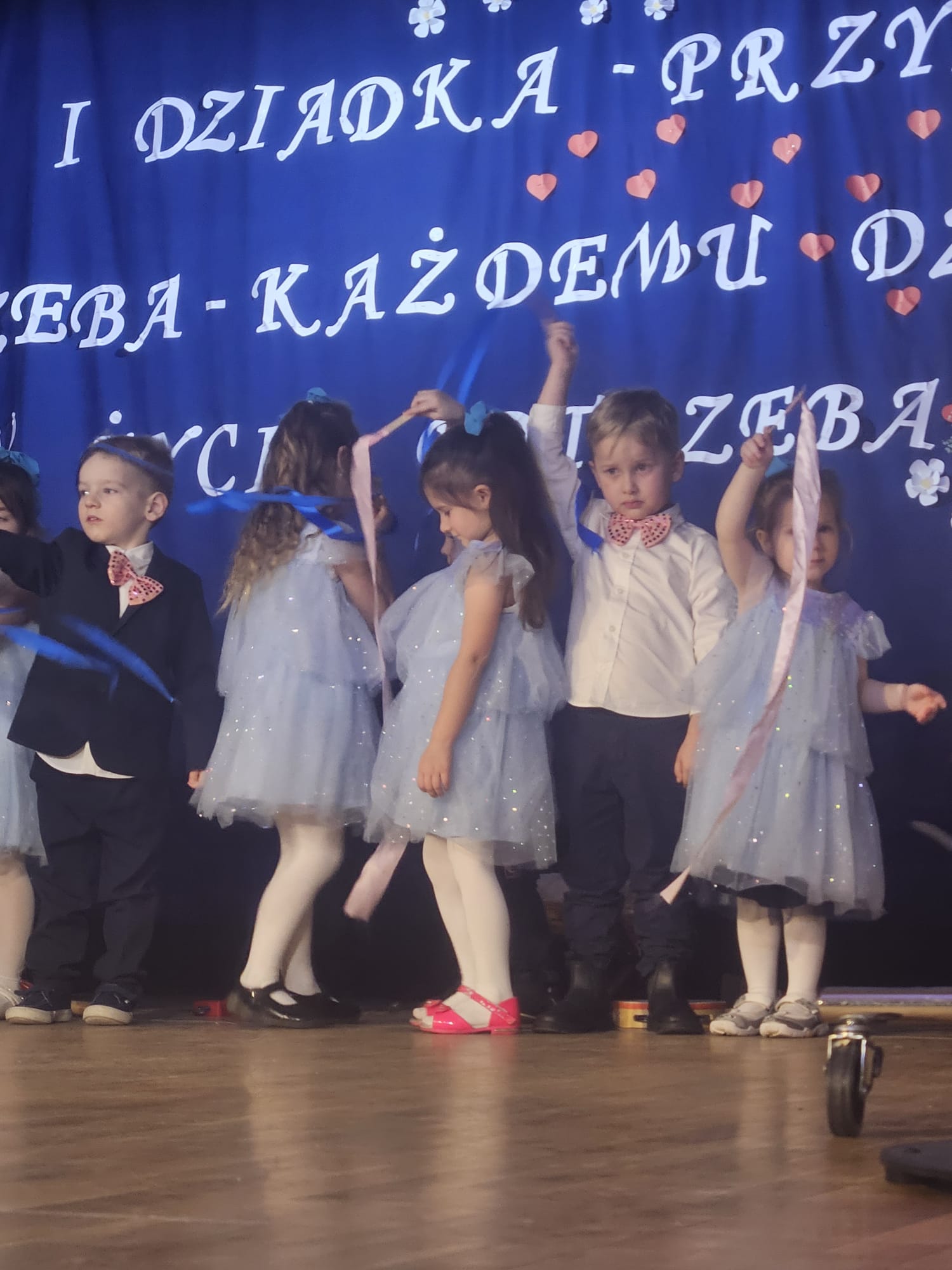 Na samym początku wszystkich licznie przybyłych gości przywitała Pani Dyrektor Ewa Paruch. W pierwszej kolejności wystąpiła grupa Słoneczek. Przedszkolaki zachwyciły publiczność pięknym występem pełnym radości i uśmiechu. Dzieci recytowały wzruszające wierszyki, śpiewały wesołe piosenki, a całość dopełniła zabawna scenka, w której babcia marzyła o zostaniu tancerką. W trakcie przedstawienia spotkała dziadka i razem, przy dźwiękach muzyki. Grupa Motylków z kolei zaprezentowała piękne jasełka, wprowadzając wszystkich w wyjątkowy nastrój. Dzieci śpiewały piosenki dedykowane Babciom i Dziadkom, sprawiając im wiele radości i wzruszeń. Swoją obecnością zaszczyciła nas również Pani wicewójt Joanna Pyrz, która wygłosiła przemówienie po występach dzieci. Na sam koniec wszystkie dzieci zebrały się razem na scenie, aby wyśpiewać Babciom i Dziadkom gromkie "Sto lat". Uroczystość uświetnił również występ Pana Krzysztofa Mirowskiego oraz jednej z naszych nauczycielek - Pani Mileny Bodurki.