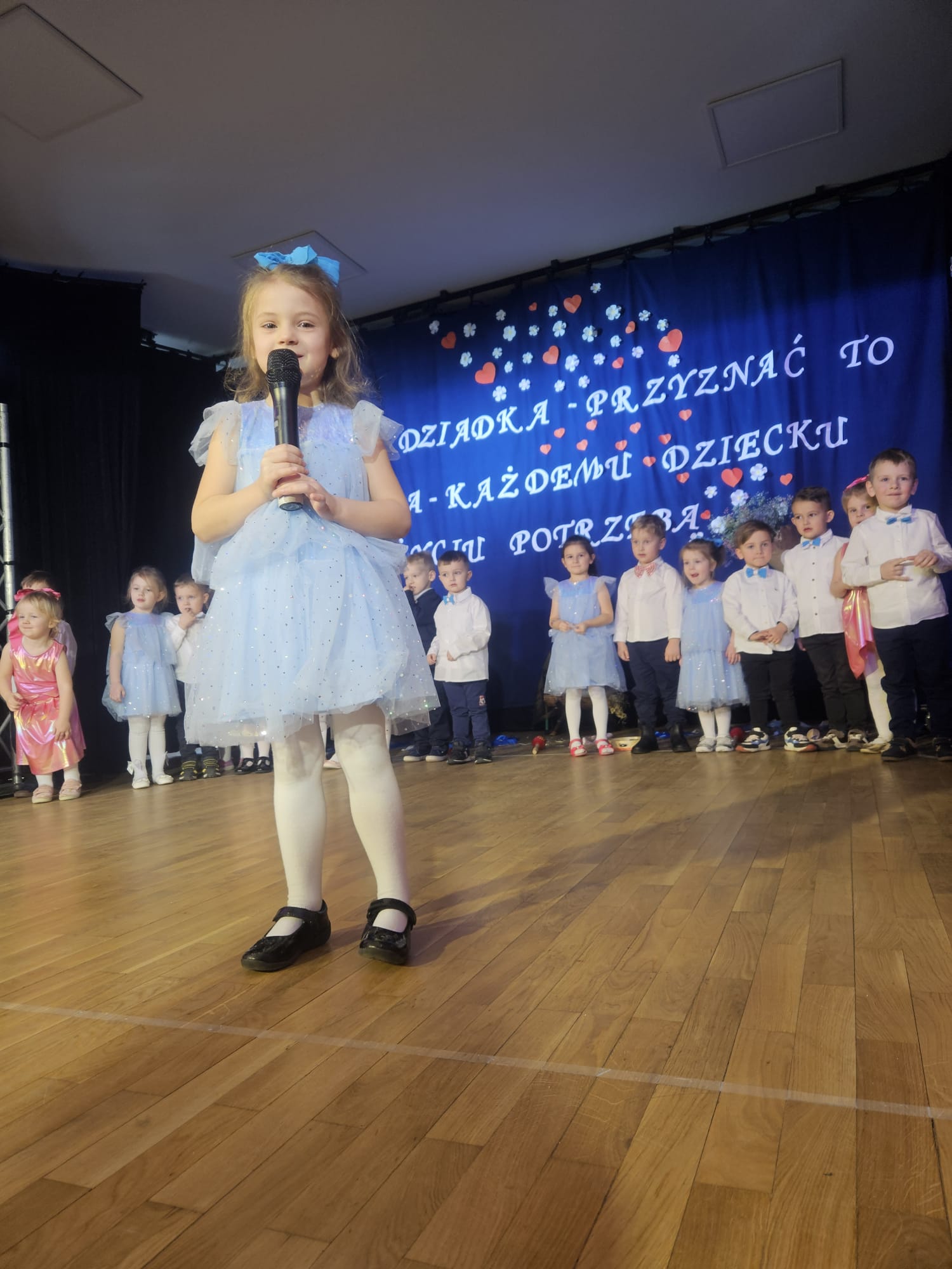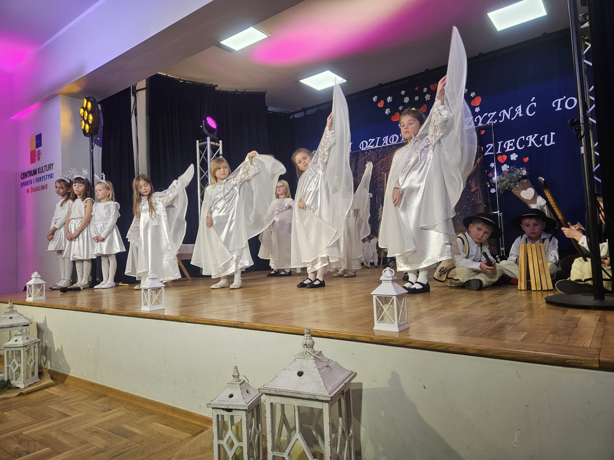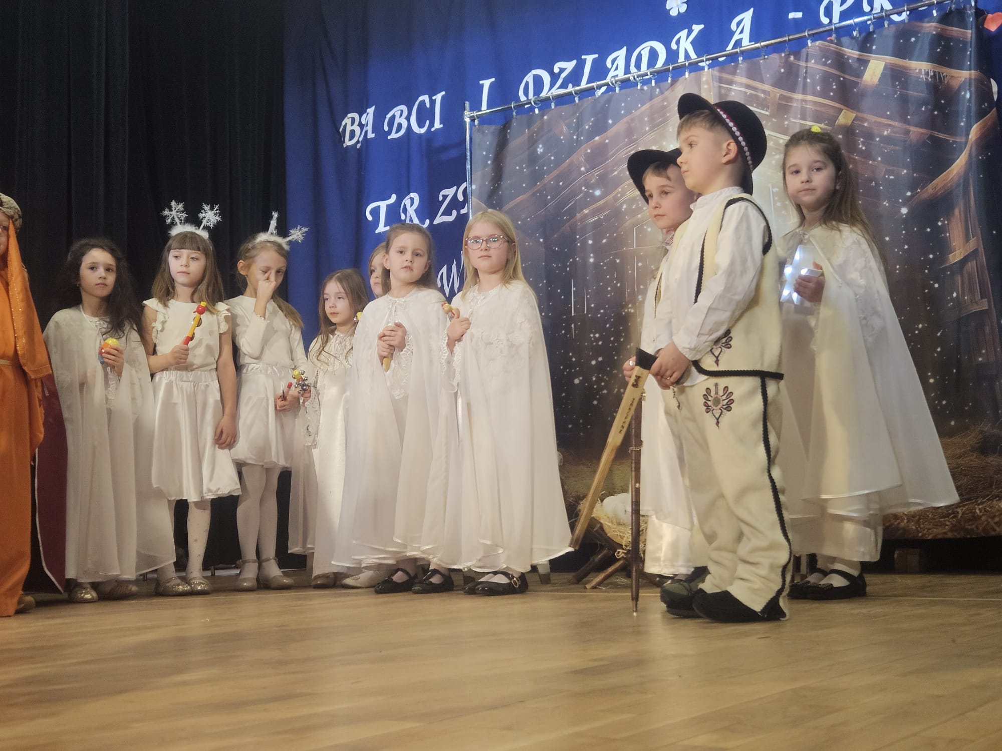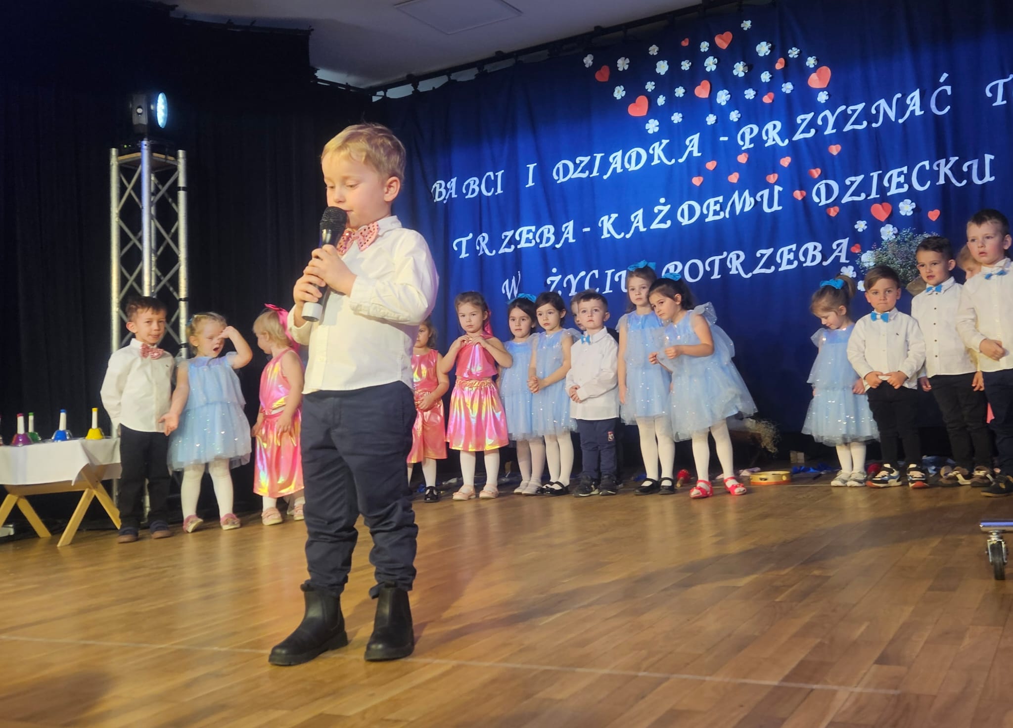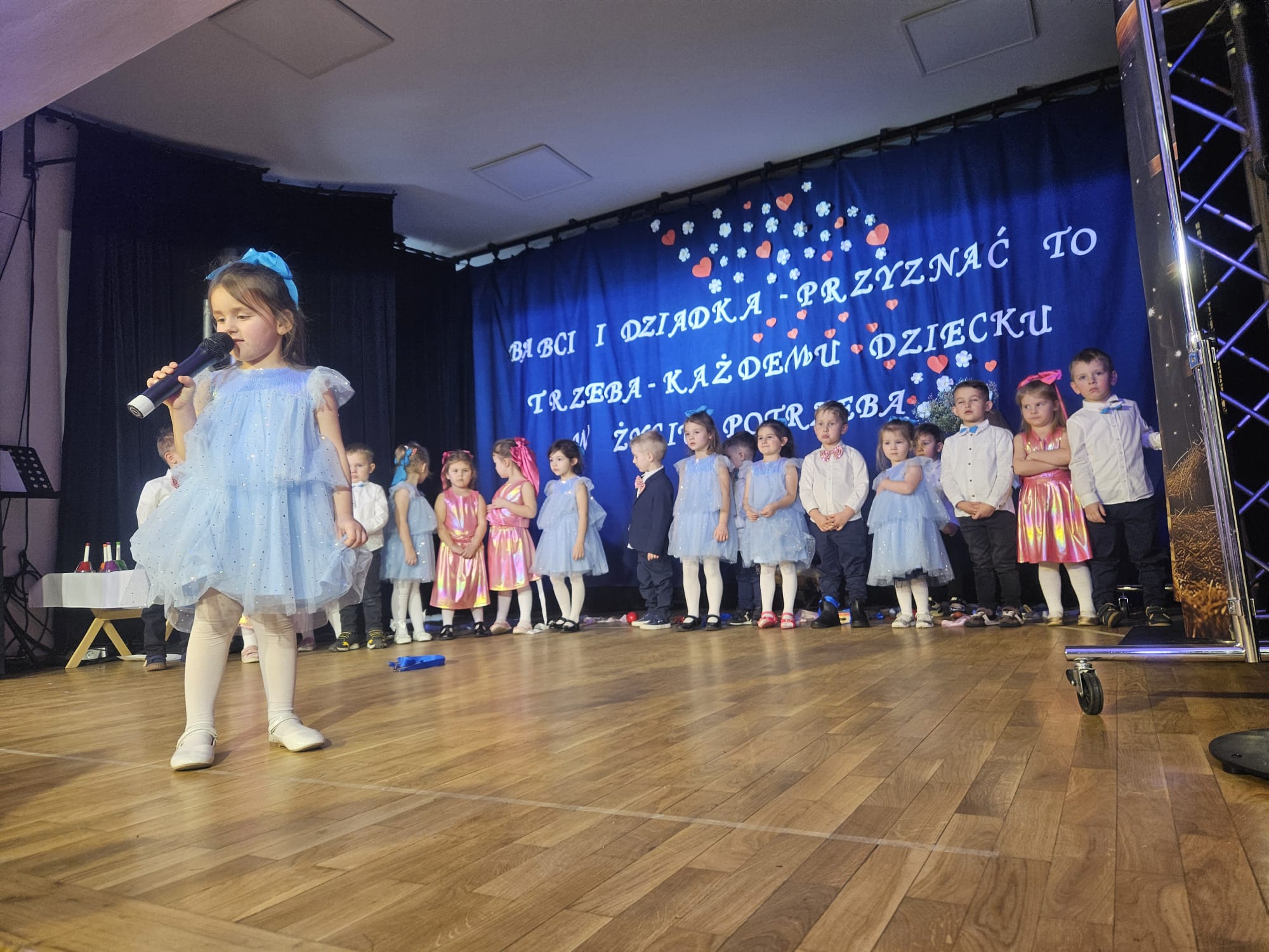 Na samym początku wszystkich licznie przybyłych gości przywitała Pani Dyrektor Ewa Paruch. W pierwszej kolejności wystąpiła grupa Słoneczek. Przedszkolaki zachwyciły publiczność pięknym występem pełnym radości i uśmiechu. Dzieci recytowały wzruszające wierszyki, śpiewały wesołe piosenki, a całość dopełniła zabawna scenka, w której babcia marzyła o zostaniu tancerką. W trakcie przedstawienia spotkała dziadka i razem, przy dźwiękach muzyki. Grupa Motylków z kolei zaprezentowała piękne jasełka, wprowadzając wszystkich w wyjątkowy nastrój. Dzieci śpiewały piosenki dedykowane Babciom i Dziadkom, sprawiając im wiele radości i wzruszeń. Swoją obecnością zaszczyciła nas również Pani wicewójt Joanna Pyrz, która wygłosiła przemówienie po występach dzieci. Na sam koniec wszystkie dzieci zebrały się razem na scenie, aby wyśpiewać Babciom i Dziadkom gromkie "Sto lat". Uroczystość uświetnił również występ Pana Krzysztofa Mirowskiego oraz jednej z naszych nauczycielek - Pani Mileny Bodurki.