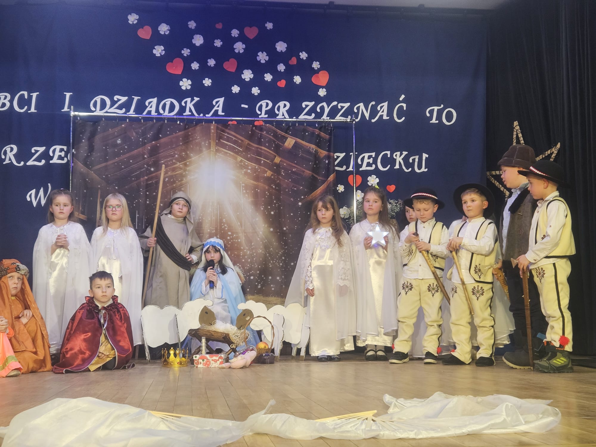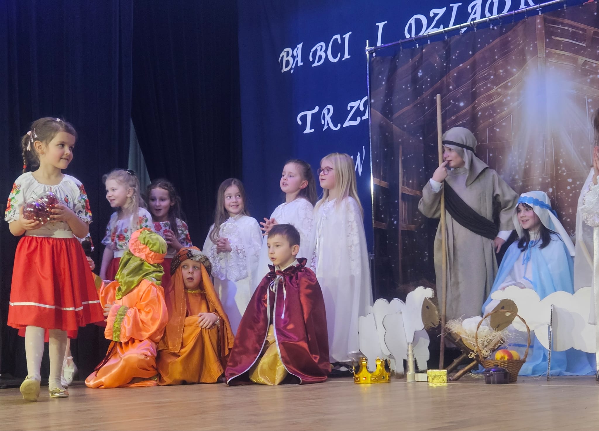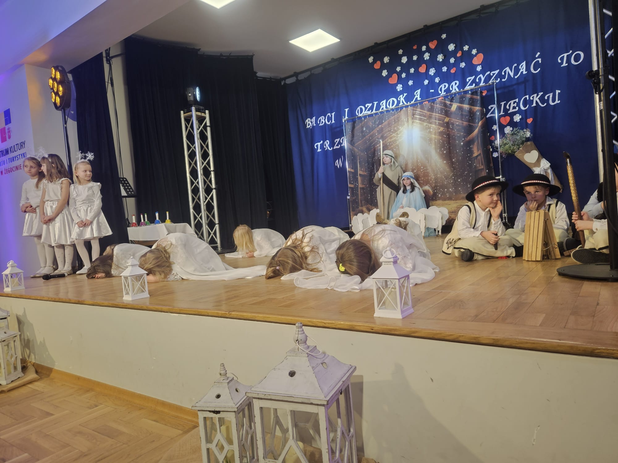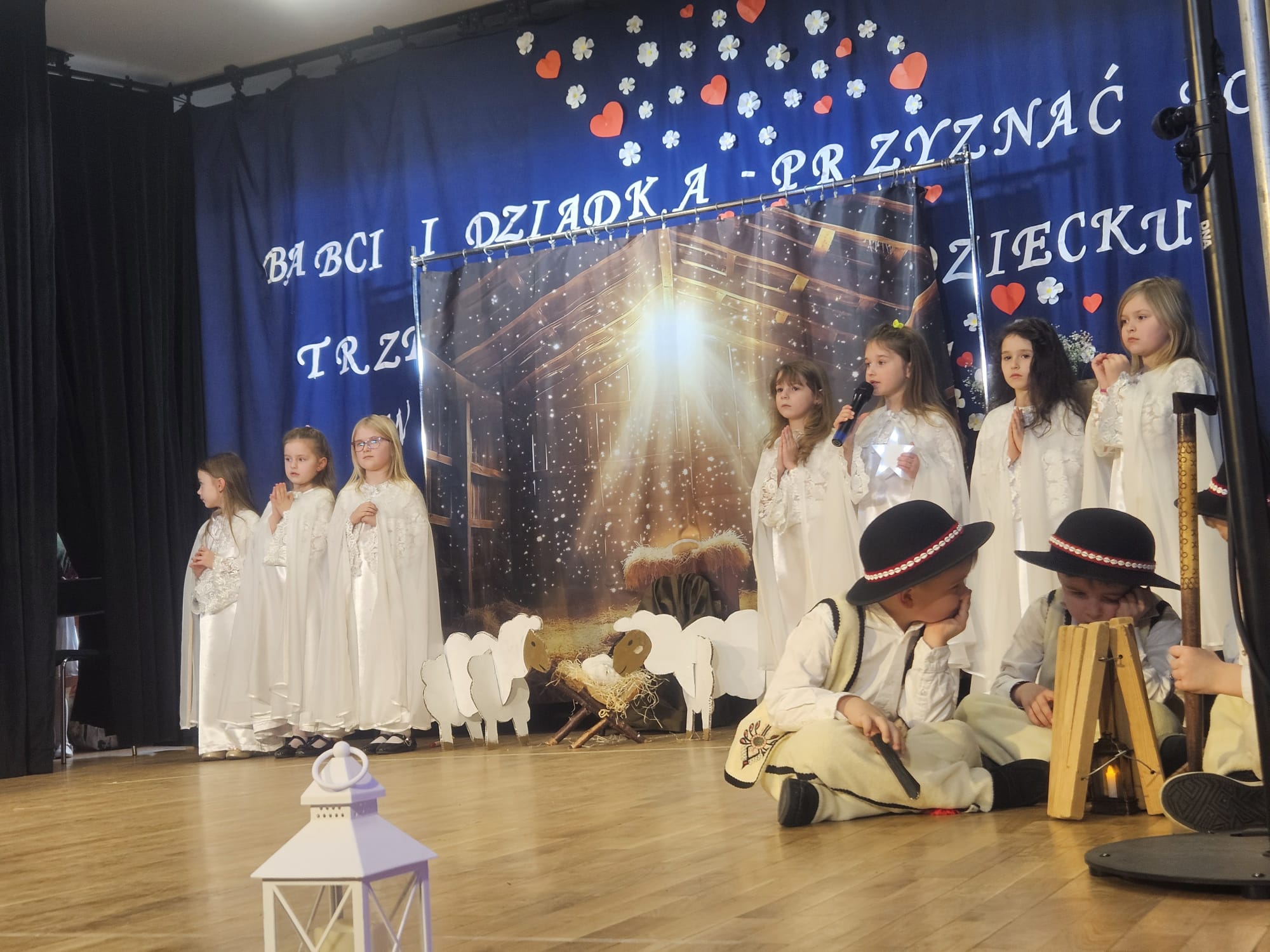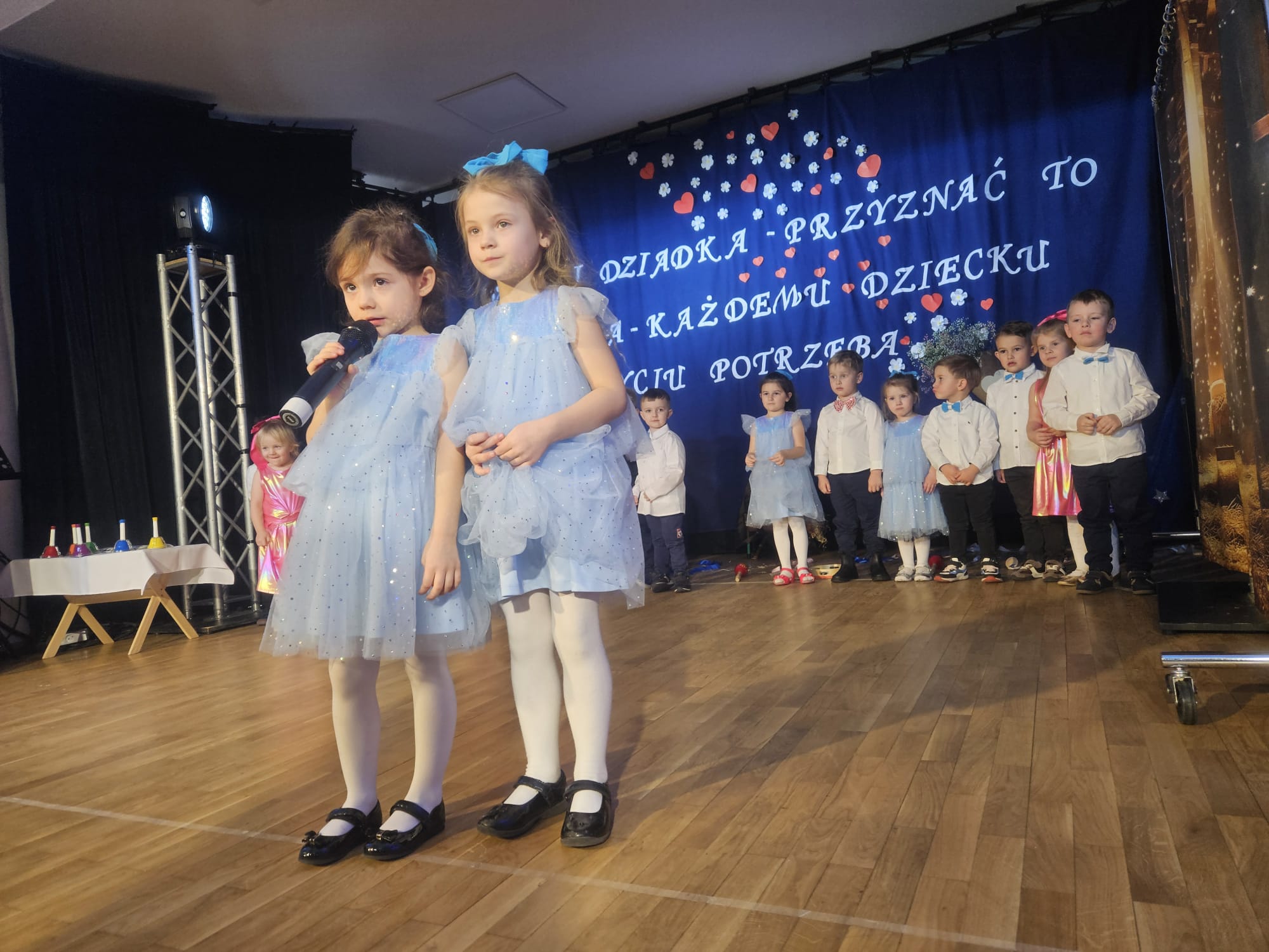 Na samym początku wszystkich licznie przybyłych gości przywitała Pani Dyrektor Ewa Paruch. W pierwszej kolejności wystąpiła grupa Słoneczek. Przedszkolaki zachwyciły publiczność pięknym występem pełnym radości i uśmiechu. Dzieci recytowały wzruszające wierszyki, śpiewały wesołe piosenki, a całość dopełniła zabawna scenka, w której babcia marzyła o zostaniu tancerką. W trakcie przedstawienia spotkała dziadka i razem, przy dźwiękach muzyki. Grupa Motylków z kolei zaprezentowała piękne jasełka, wprowadzając wszystkich w wyjątkowy nastrój. Dzieci śpiewały piosenki dedykowane Babciom i Dziadkom, sprawiając im wiele radości i wzruszeń. Swoją obecnością zaszczyciła nas również Pani wicewójt Joanna Pyrz, która wygłosiła przemówienie po występach dzieci. Na sam koniec wszystkie dzieci zebrały się razem na scenie, aby wyśpiewać Babciom i Dziadkom gromkie "Sto lat". Uroczystość uświetnił również występ Pana Krzysztofa Mirowskiego oraz jednej z naszych nauczycielek - Pani Mileny Bodurki.