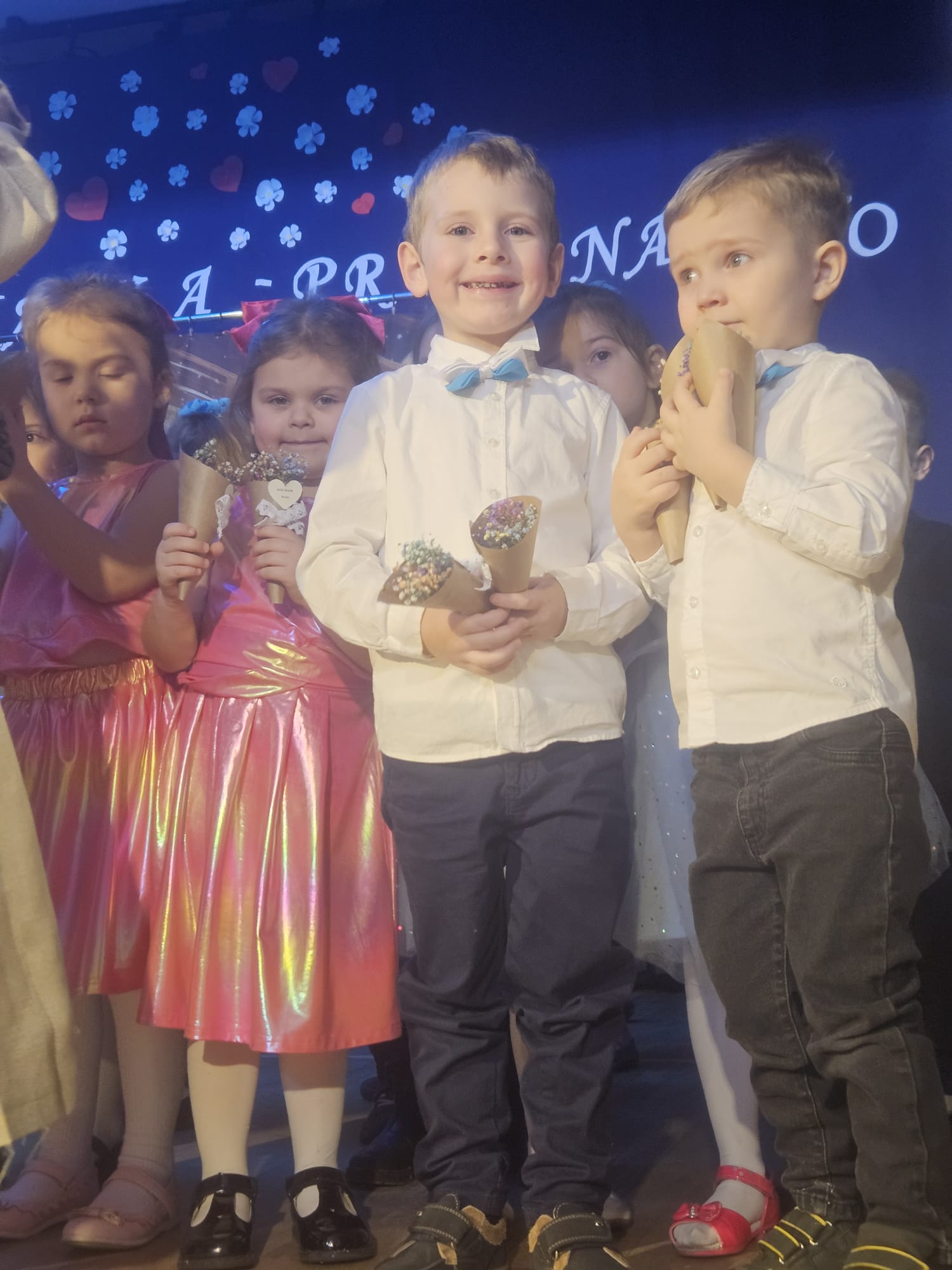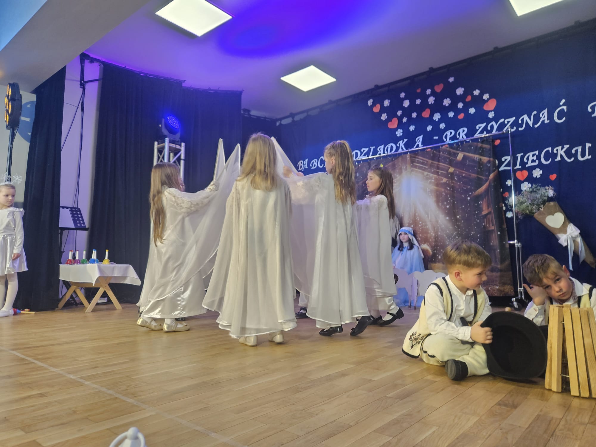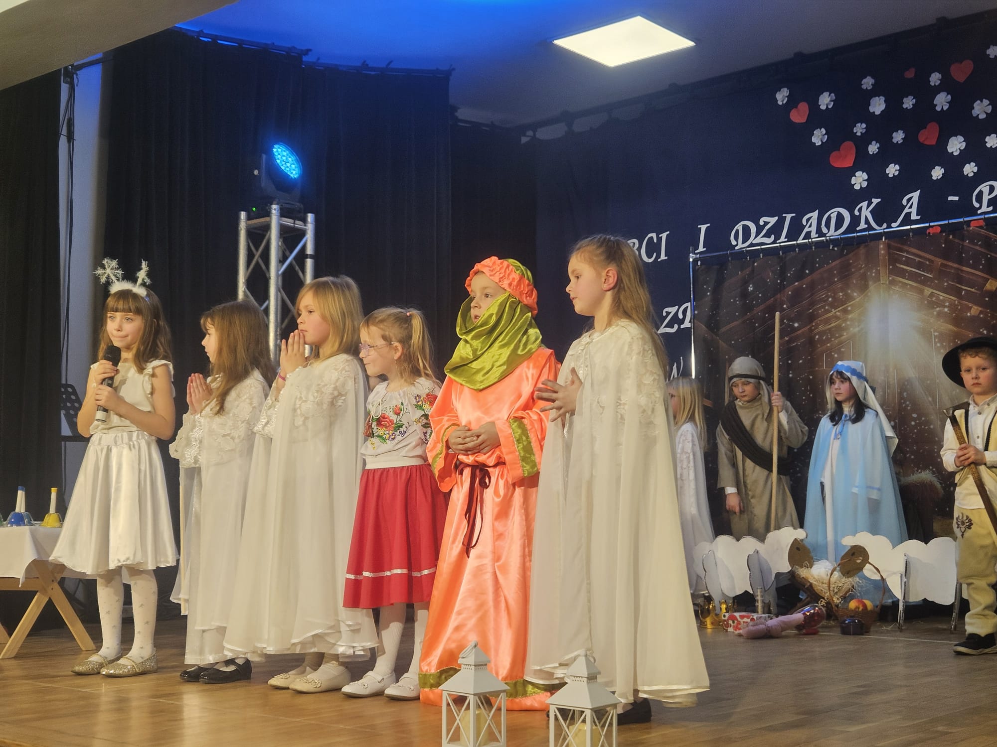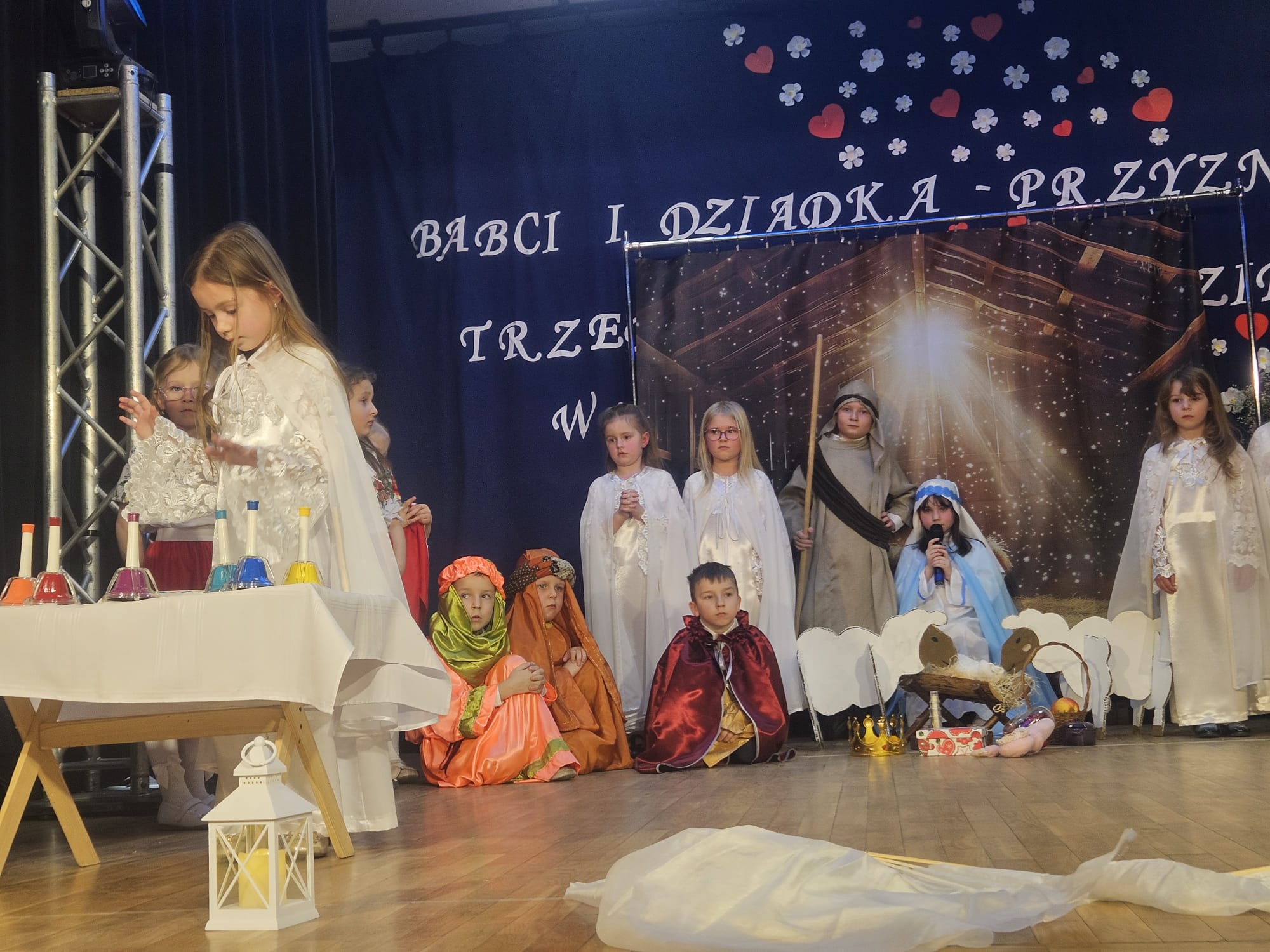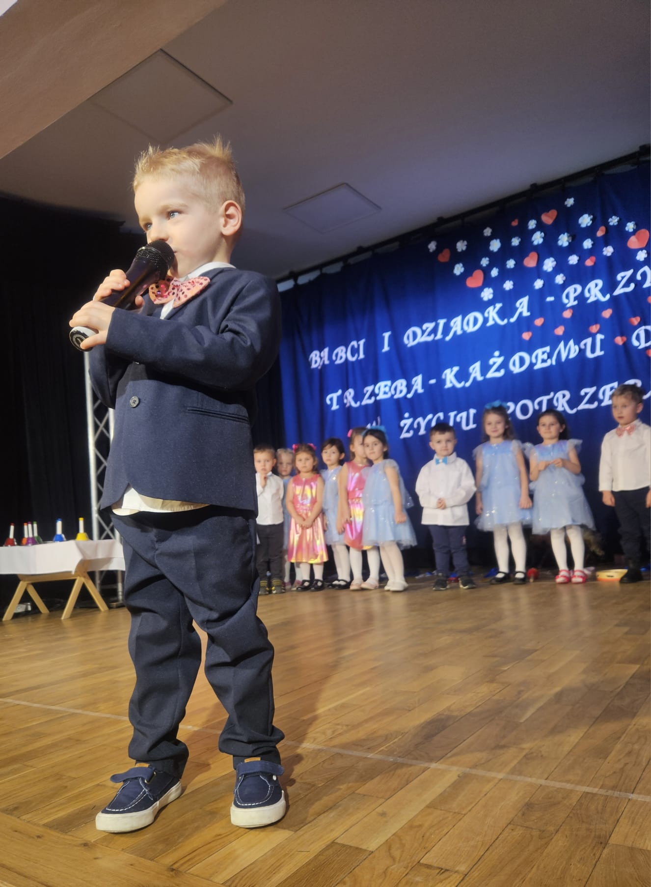 Na samym początku wszystkich licznie przybyłych gości przywitała Pani Dyrektor Ewa Paruch. W pierwszej kolejności wystąpiła grupa Słoneczek. Przedszkolaki zachwyciły publiczność pięknym występem pełnym radości i uśmiechu. Dzieci recytowały wzruszające wierszyki, śpiewały wesołe piosenki, a całość dopełniła zabawna scenka, w której babcia marzyła o zostaniu tancerką. W trakcie przedstawienia spotkała dziadka i razem, przy dźwiękach muzyki. Grupa Motylków z kolei zaprezentowała piękne jasełka, wprowadzając wszystkich w wyjątkowy nastrój. Dzieci śpiewały piosenki dedykowane Babciom i Dziadkom, sprawiając im wiele radości i wzruszeń. Swoją obecnością zaszczyciła nas również Pani wicewójt Joanna Pyrz, która wygłosiła przemówienie po występach dzieci. Na sam koniec wszystkie dzieci zebrały się razem na scenie, aby wyśpiewać Babciom i Dziadkom gromkie "Sto lat". Uroczystość uświetnił również występ Pana Krzysztofa Mirowskiego oraz jednej z naszych nauczycielek - Pani Mileny Bodurki.