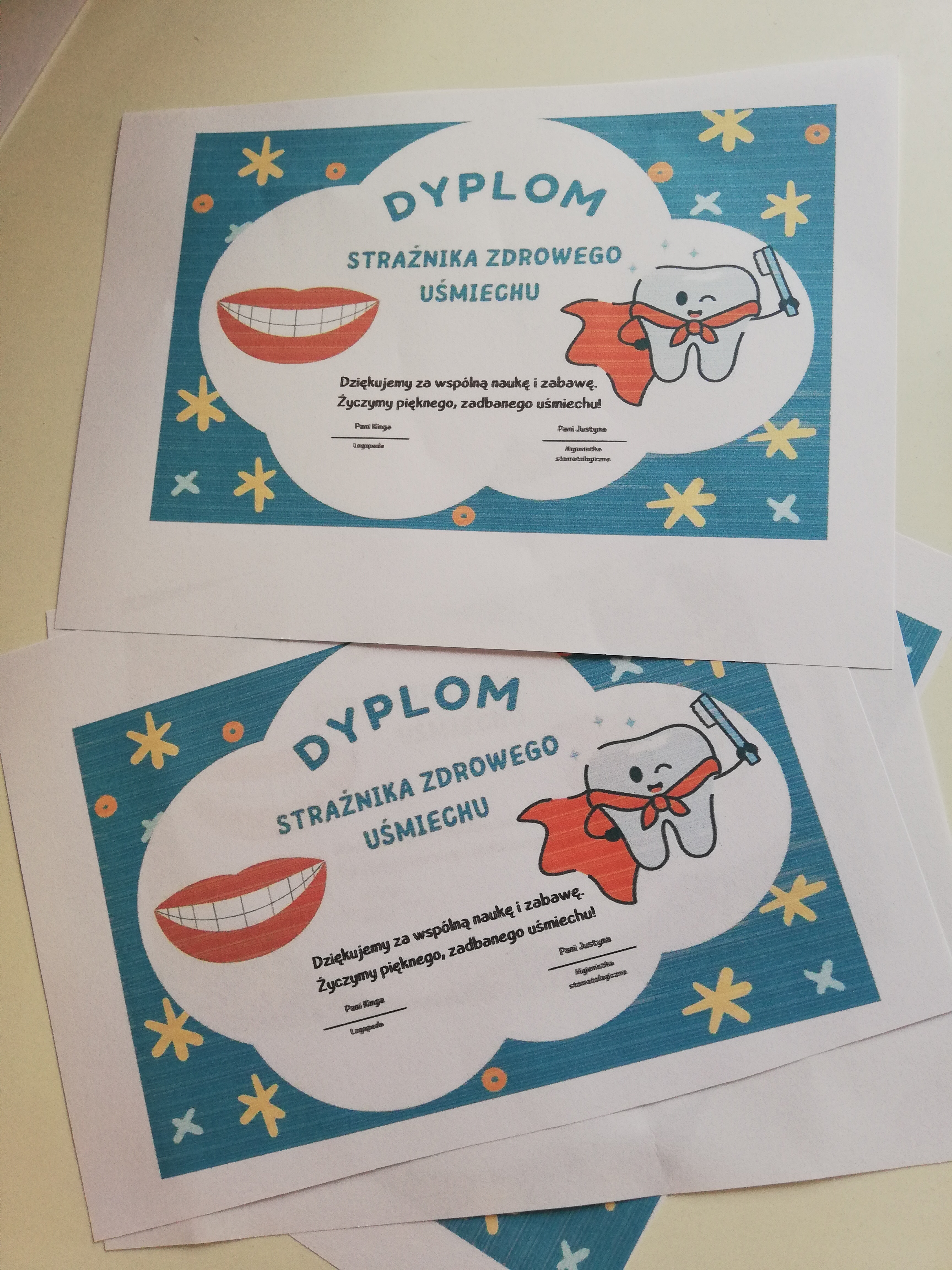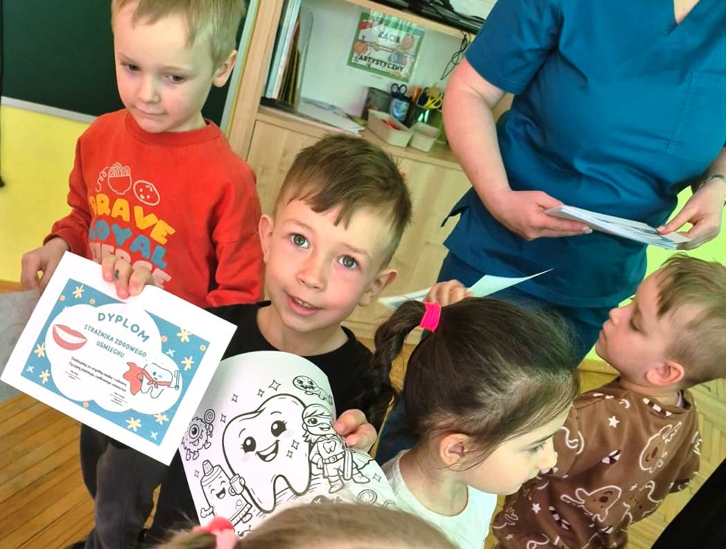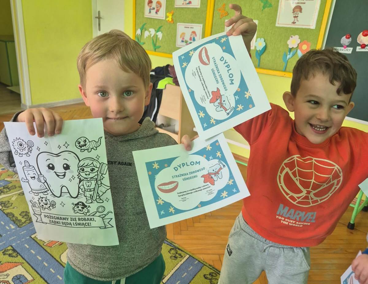 Na zakończenie wszystkie dzieci otrzymały dyplomy „Strażnika Zdrowego Uśmiechu”, a także drobne upominki: naklejki („Dzielny pacjent” oraz „Pastusiowa Odznaka Zdrowego Uśmiechu”) i kolorowanki. W najmłodszej grupie „Iskierek” do domów trafiły również materiały edukacyjne dla rodziców, zawierające praktyczne wskazówki dotyczące dbania o zdrowie jamy ustnej dzieci.