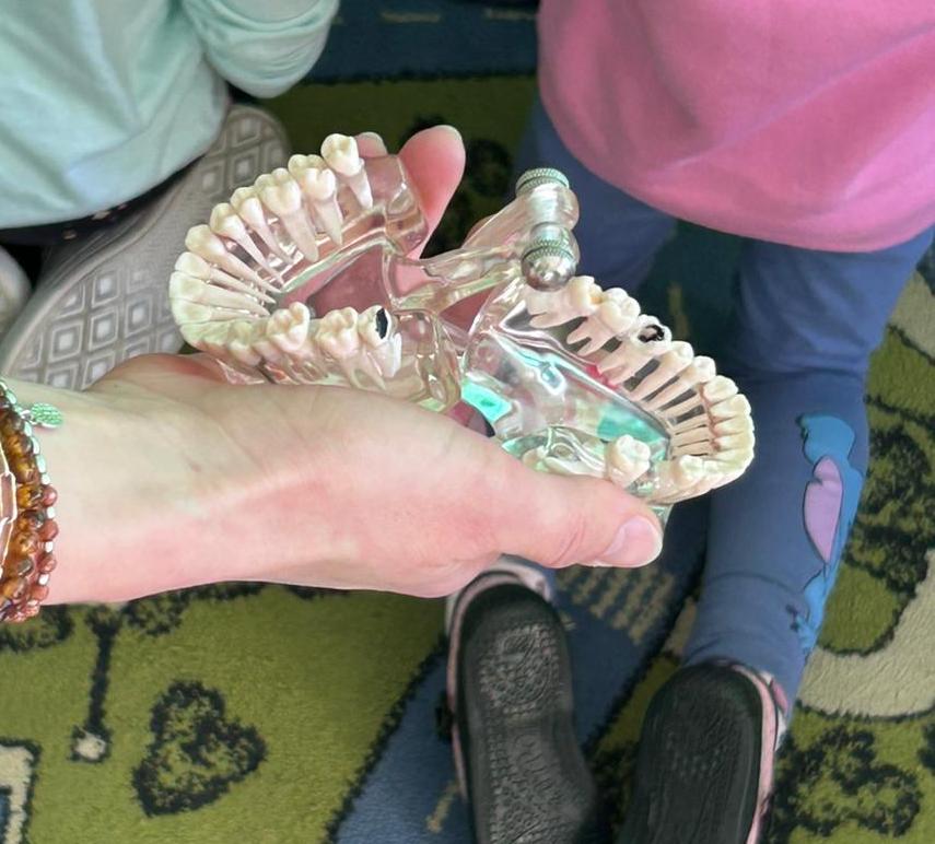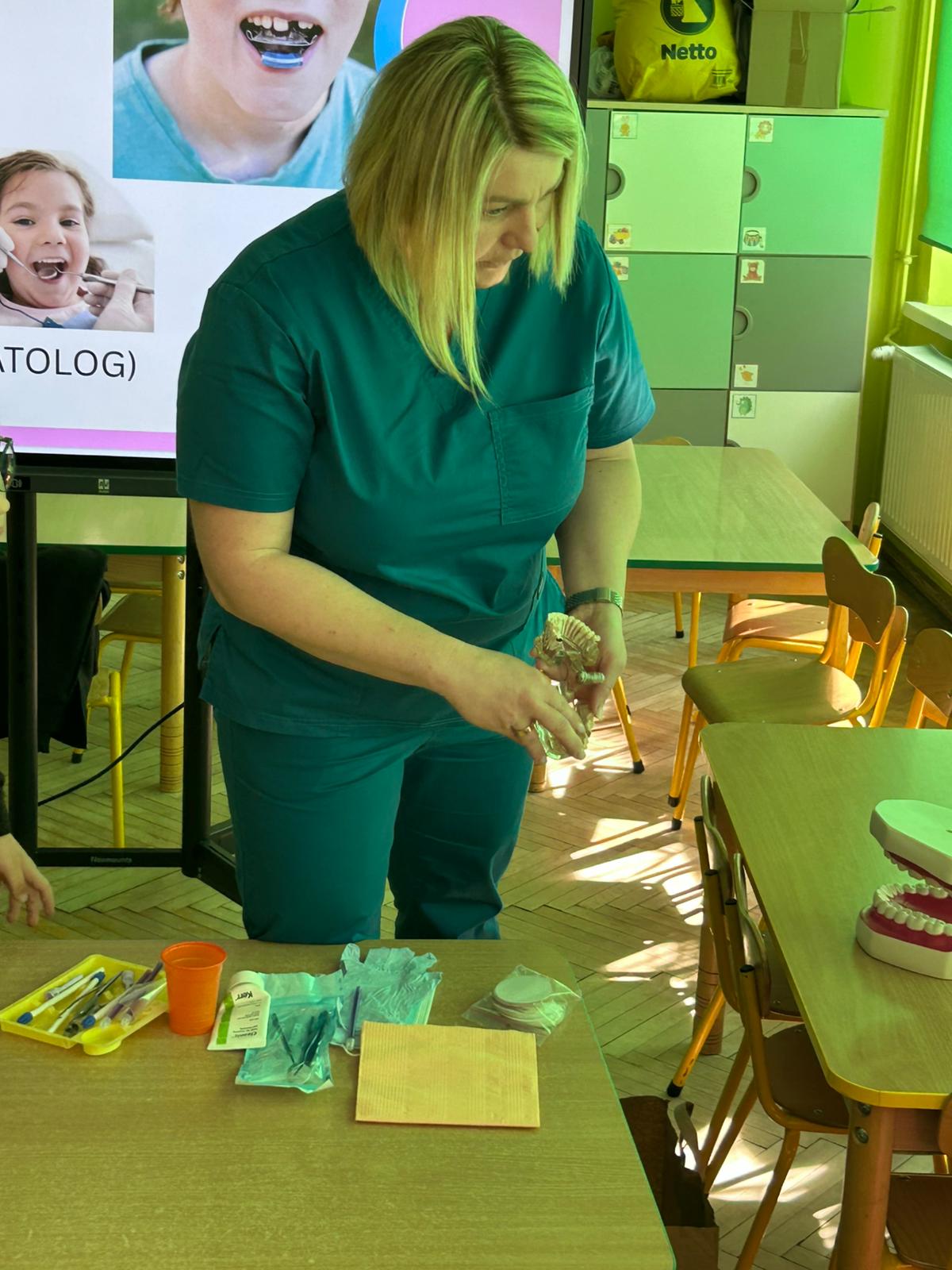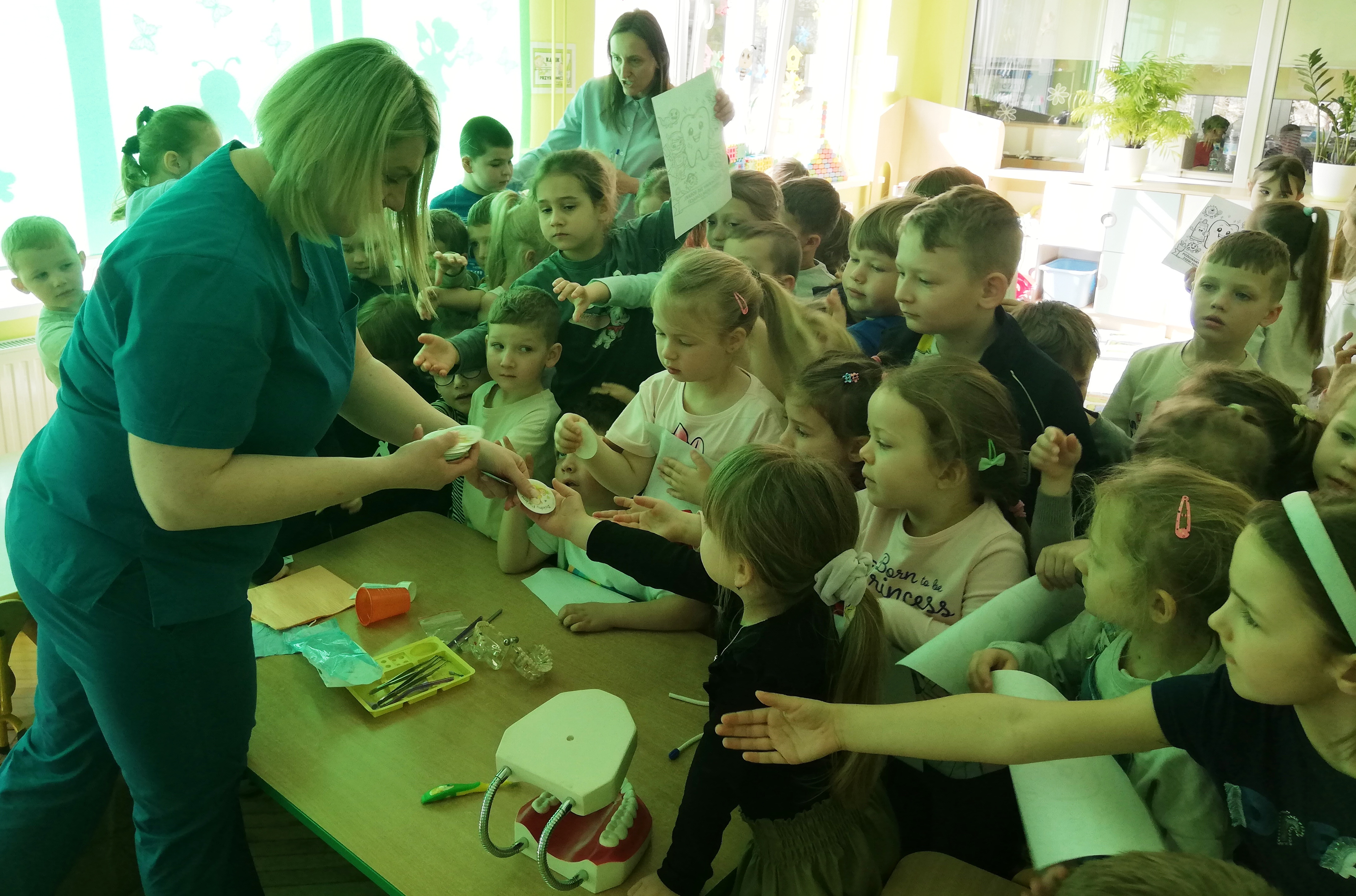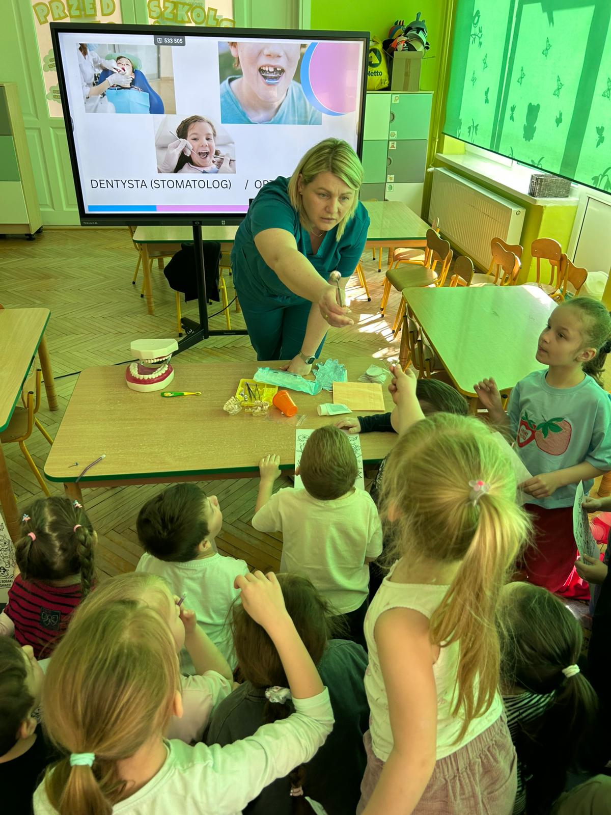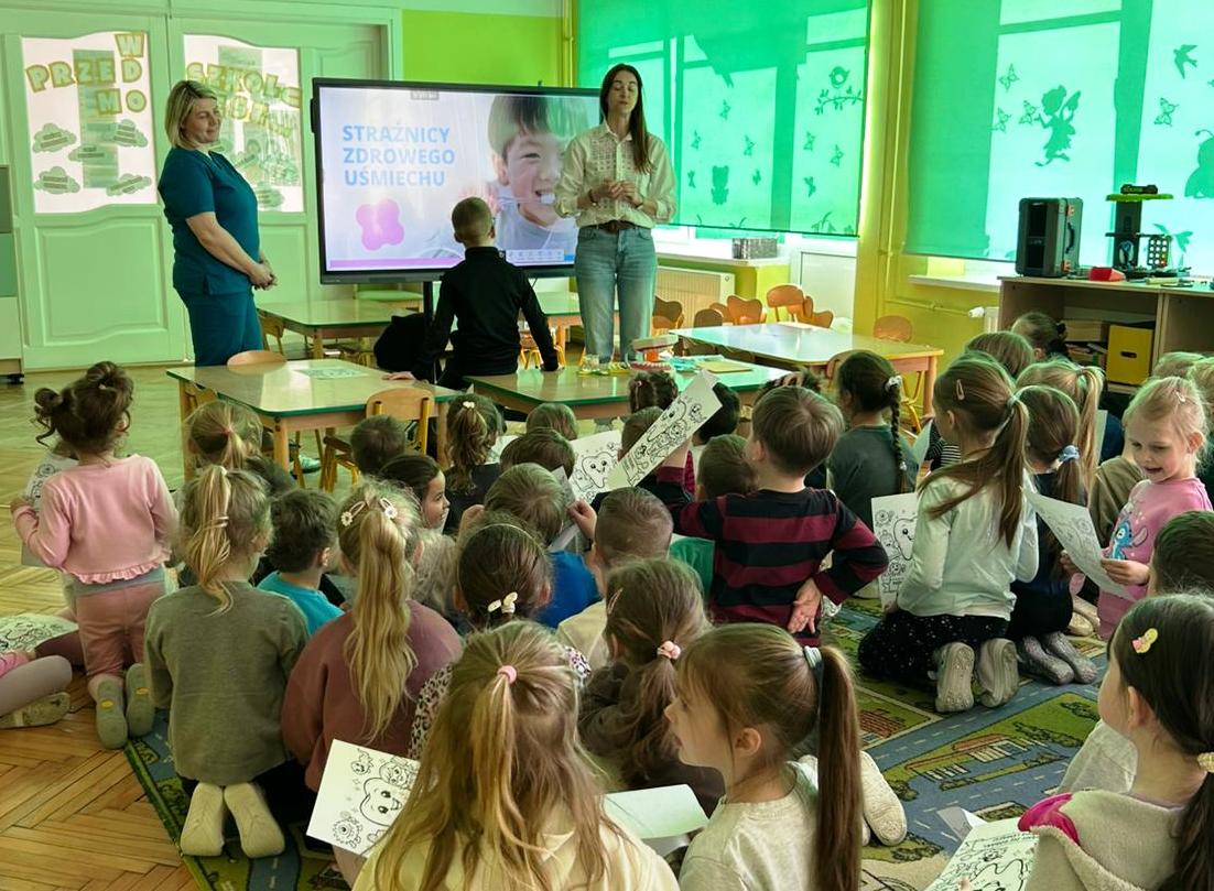 Do współpracy zaproszona została higienistka stomatologiczna, która w ciekawy i przystępny sposób przybliżyła dzieciom zasady profilaktyki stomatologicznej. Opowiedziała o swojej pracy, a także o zawodzie stomatologa i ortodonty. Dzieci mogły zobaczyć elementy wyposażenia gabinetu dentystycznego oraz dowiedzieć się, jak wygląda wizyta kontrolna. Spotkanie miało również na celu oswojenie najmłodszych z wizytą u dentysty i zachęcenie do regularnych kontroli wraz z rodzicami. Pani Justyna pokazała także dzieciom jak prawidłowo myć zęby, by nie uszkadzać delikatnych dziąseł.