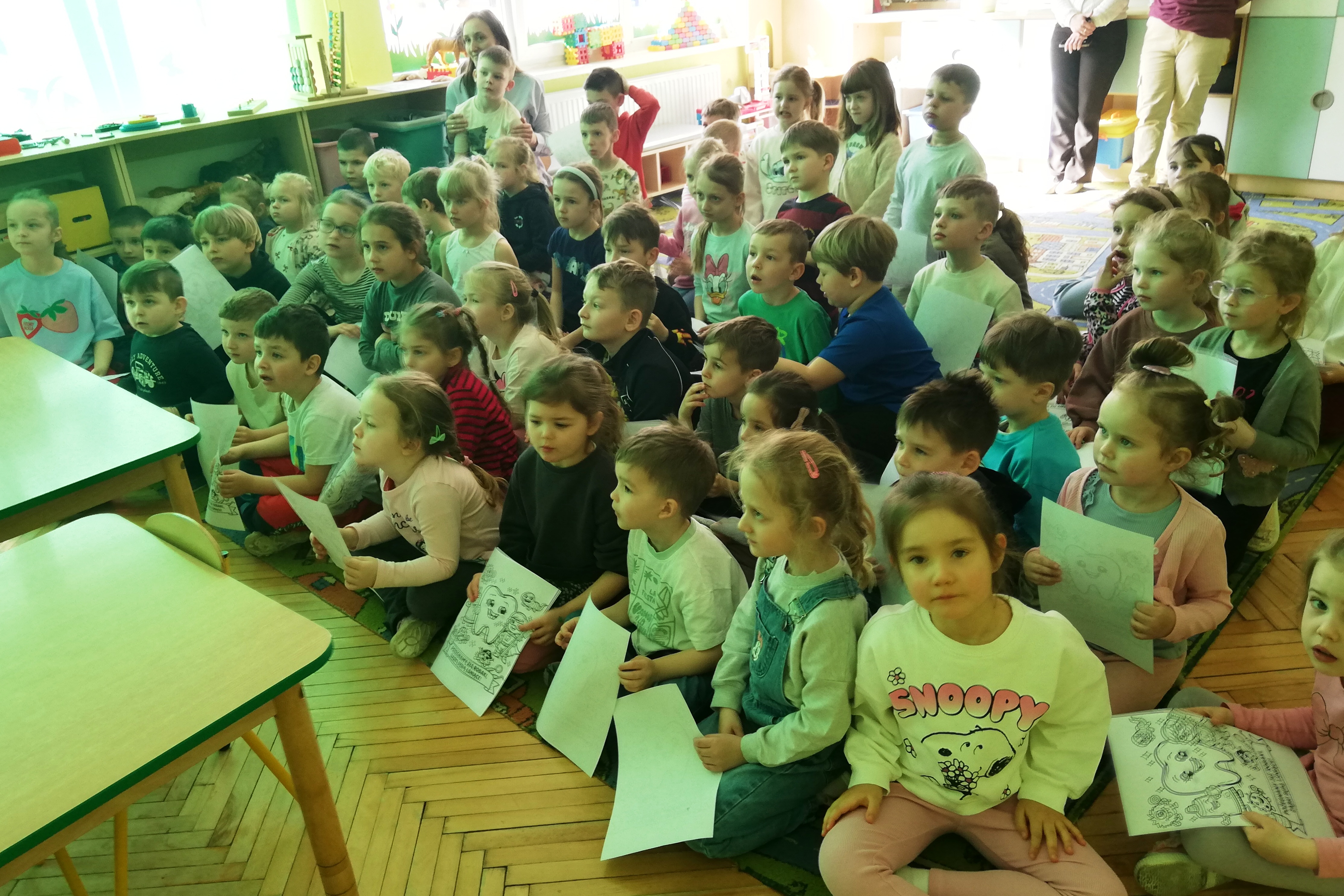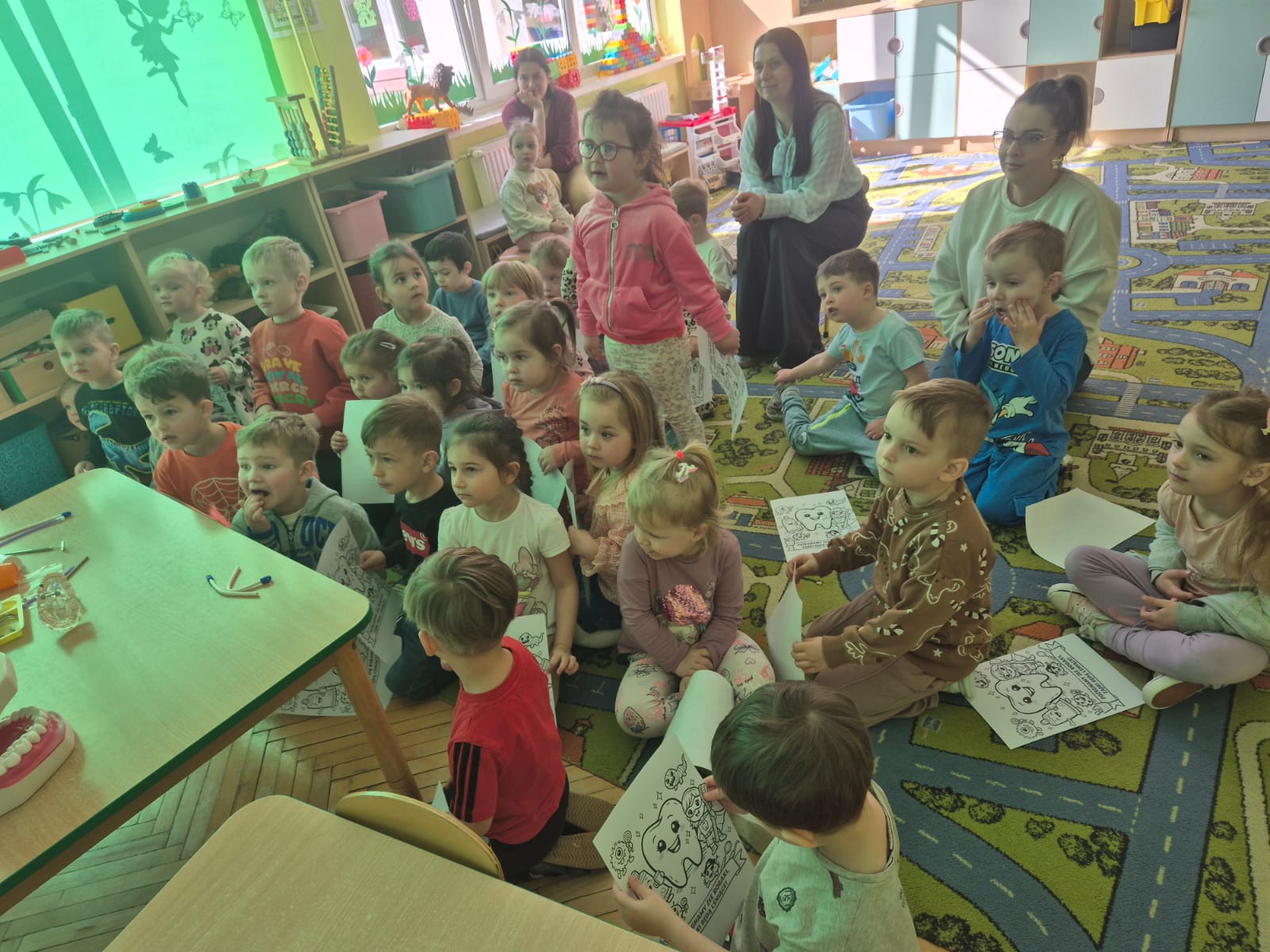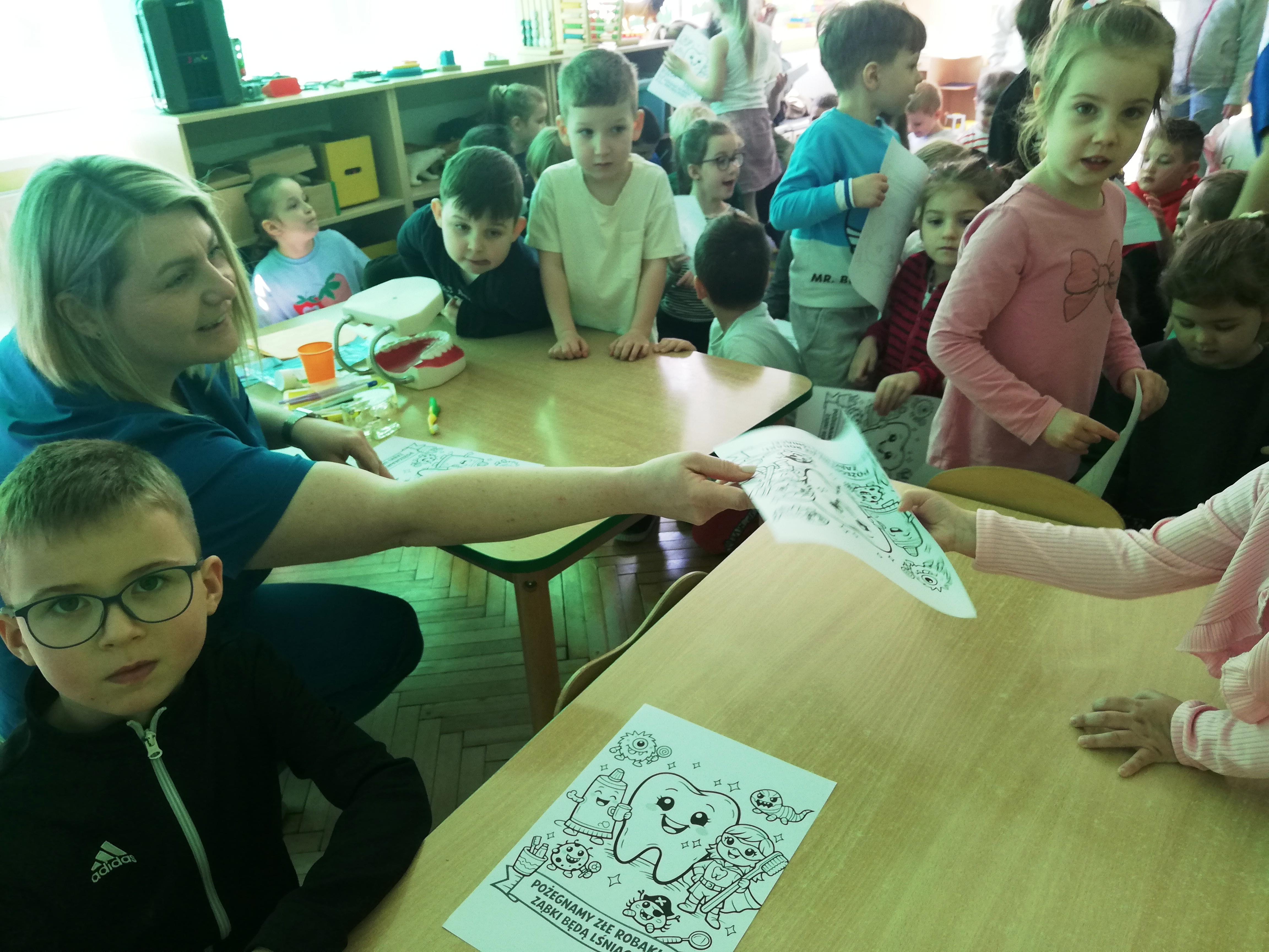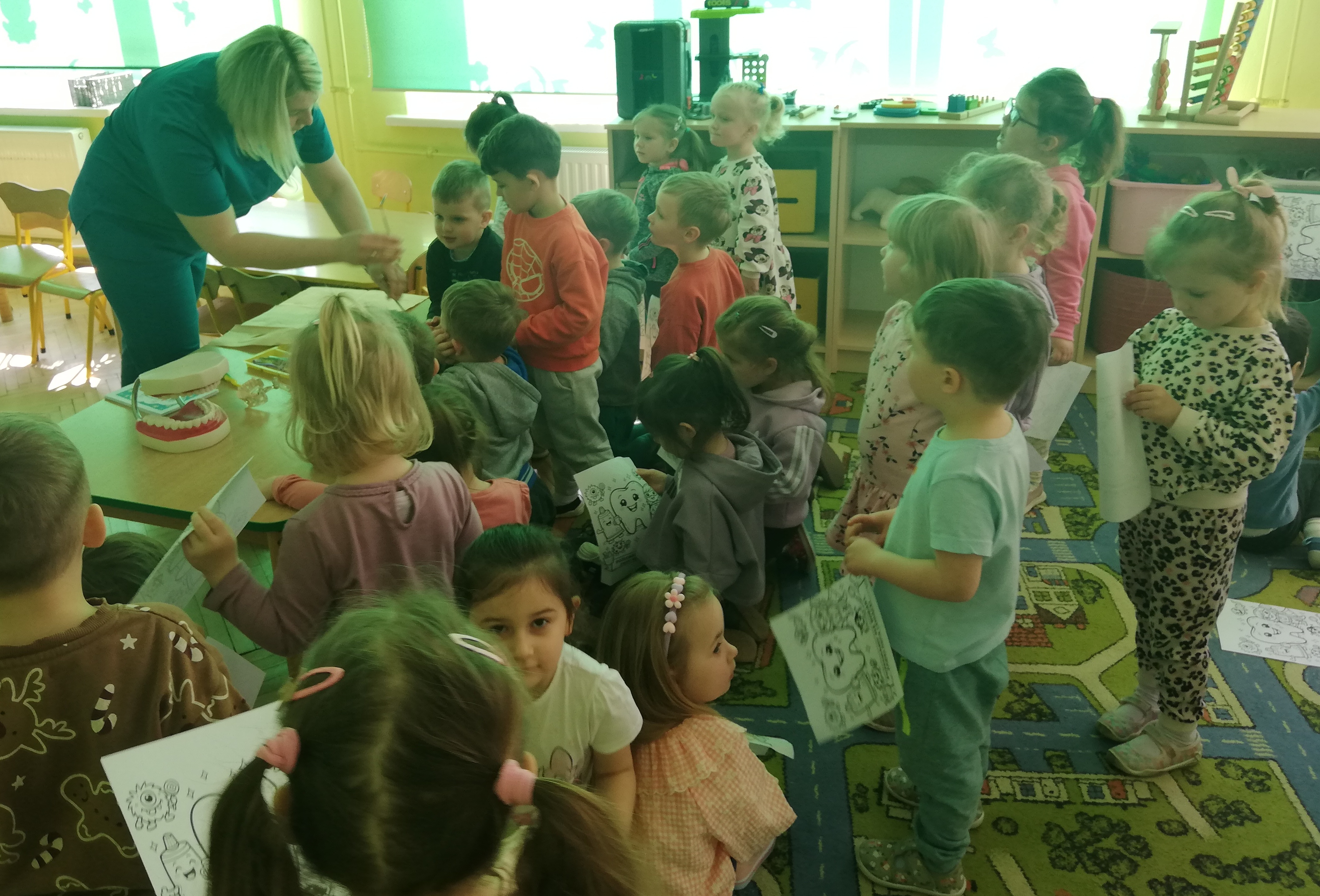 Do współpracy zaproszona została higienistka stomatologiczna, która w ciekawy i przystępny sposób przybliżyła dzieciom zasady profilaktyki stomatologicznej. Opowiedziała o swojej pracy, a także o zawodzie stomatologa i ortodonty. Dzieci mogły zobaczyć elementy wyposażenia gabinetu dentystycznego oraz dowiedzieć się, jak wygląda wizyta kontrolna. Spotkanie miało również na celu oswojenie najmłodszych z wizytą u dentysty i zachęcenie do regularnych kontroli wraz z rodzicami. Pani Justyna pokazała także dzieciom jak prawidłowo myć zęby, by nie uszkadzać delikatnych dziąseł.