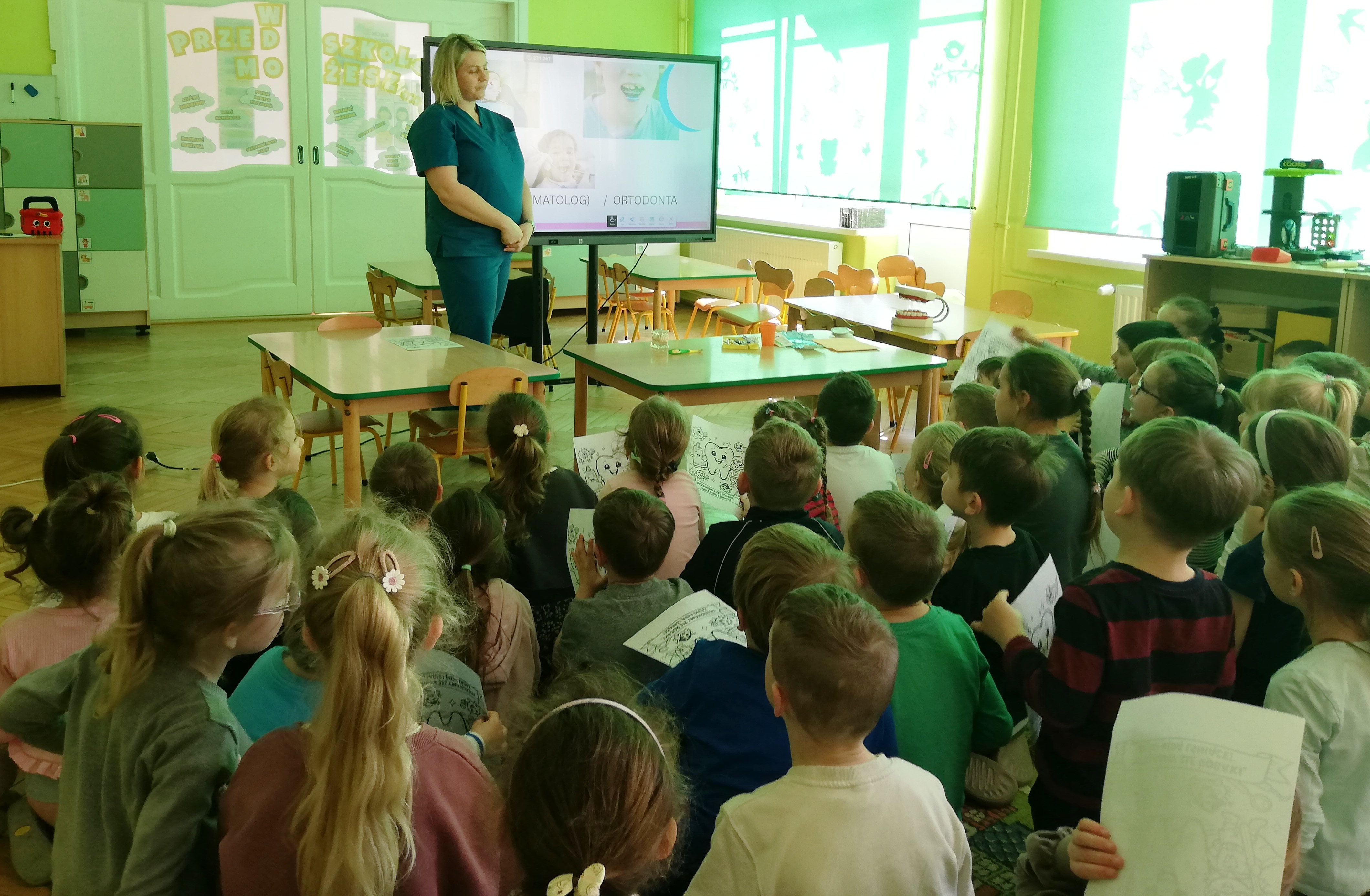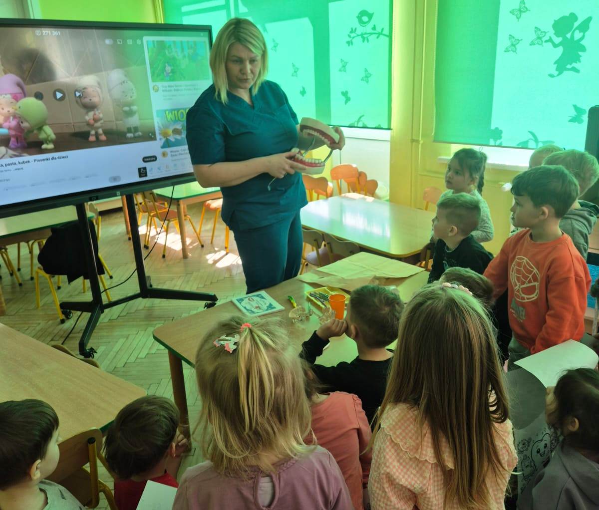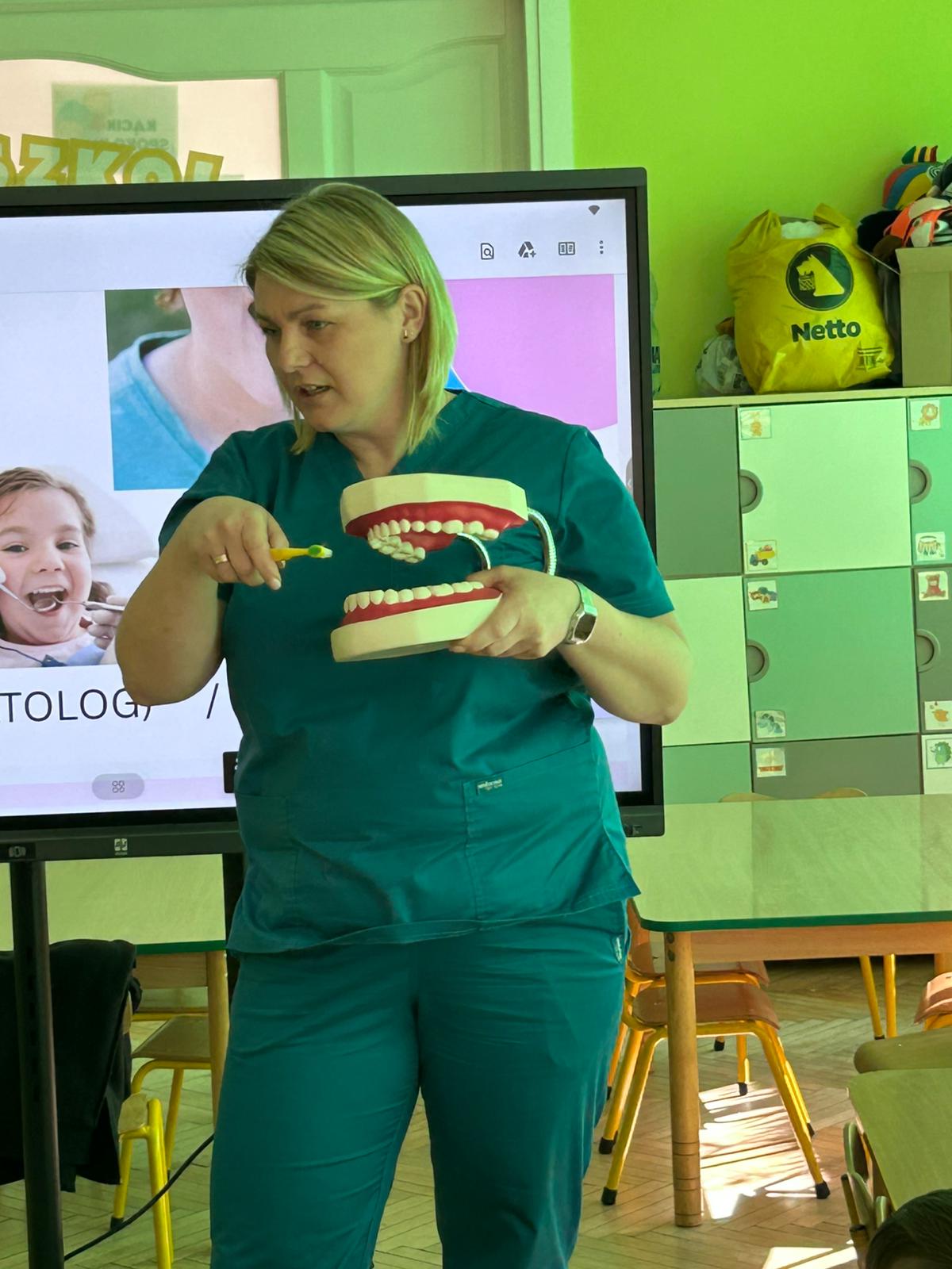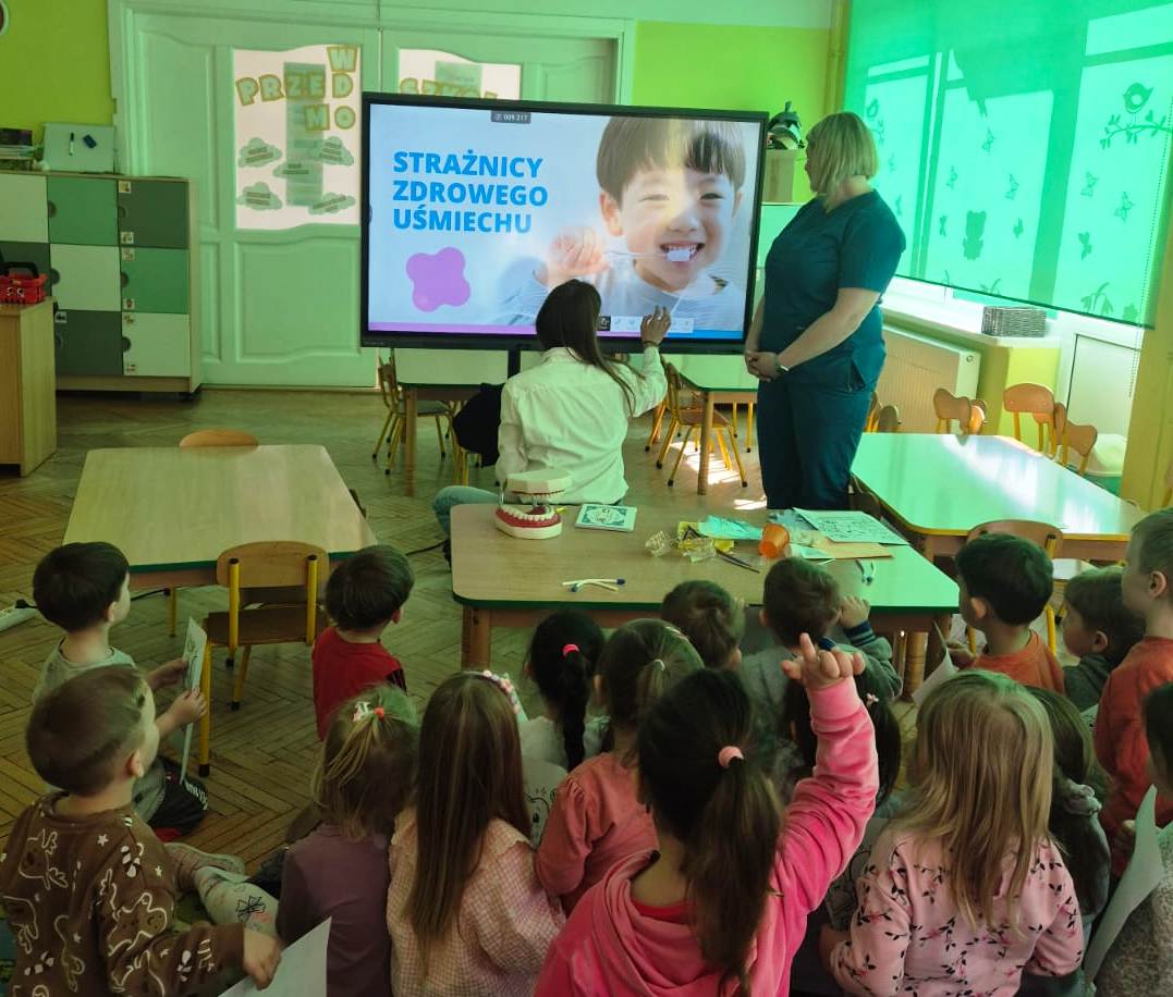 Zajęcia zostały uatrakcyjnione dzięki wykorzystaniu tablicy multimedialnej – dzieci oglądały przygotowaną prezentację, odpowiadały na pytania i zagadki oraz wspólnie śpiewały piosenkę o prawidłowym myciu zębów.