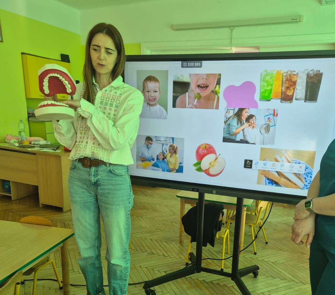 Pani Kinga przypomniała natomiast, jak ważna jest terapia logopedyczna nie tylko dla rozwoju mowy i komunikacji, ale również dla prawidłowego rozwoju narządów artykulacyjnych. Zwróciła uwagę na kluczowe funkcje, takie jak prawidłowe oddychanie, gryzienie, żucie i połykanie, które mają ogromny wpływ na rozwój mowy oraz kształtowanie się zgryzu. Podkreśliła również znaczenie odpowiedniej diety wspierającej zarówno zdrowie zębów, jak i sprawność mięśni aparatu mowy.