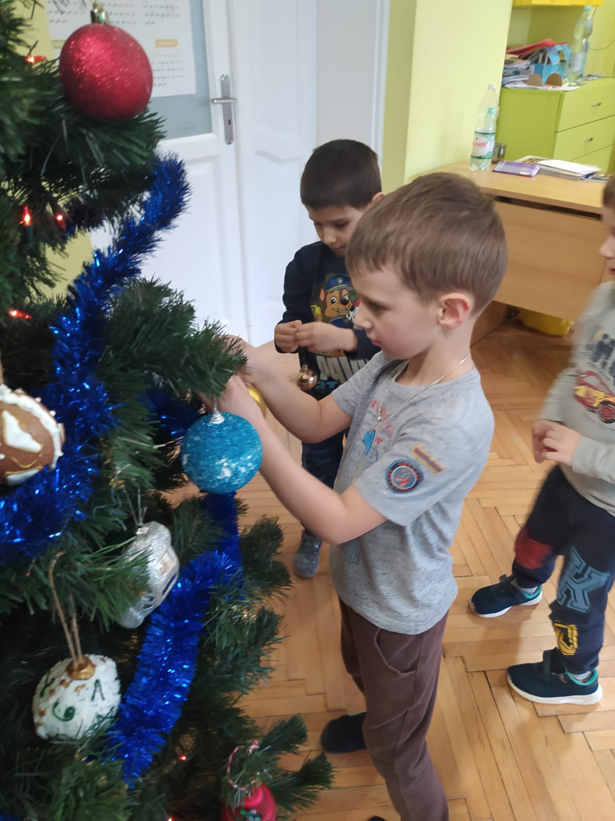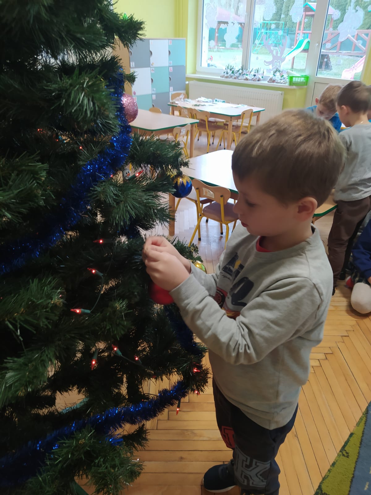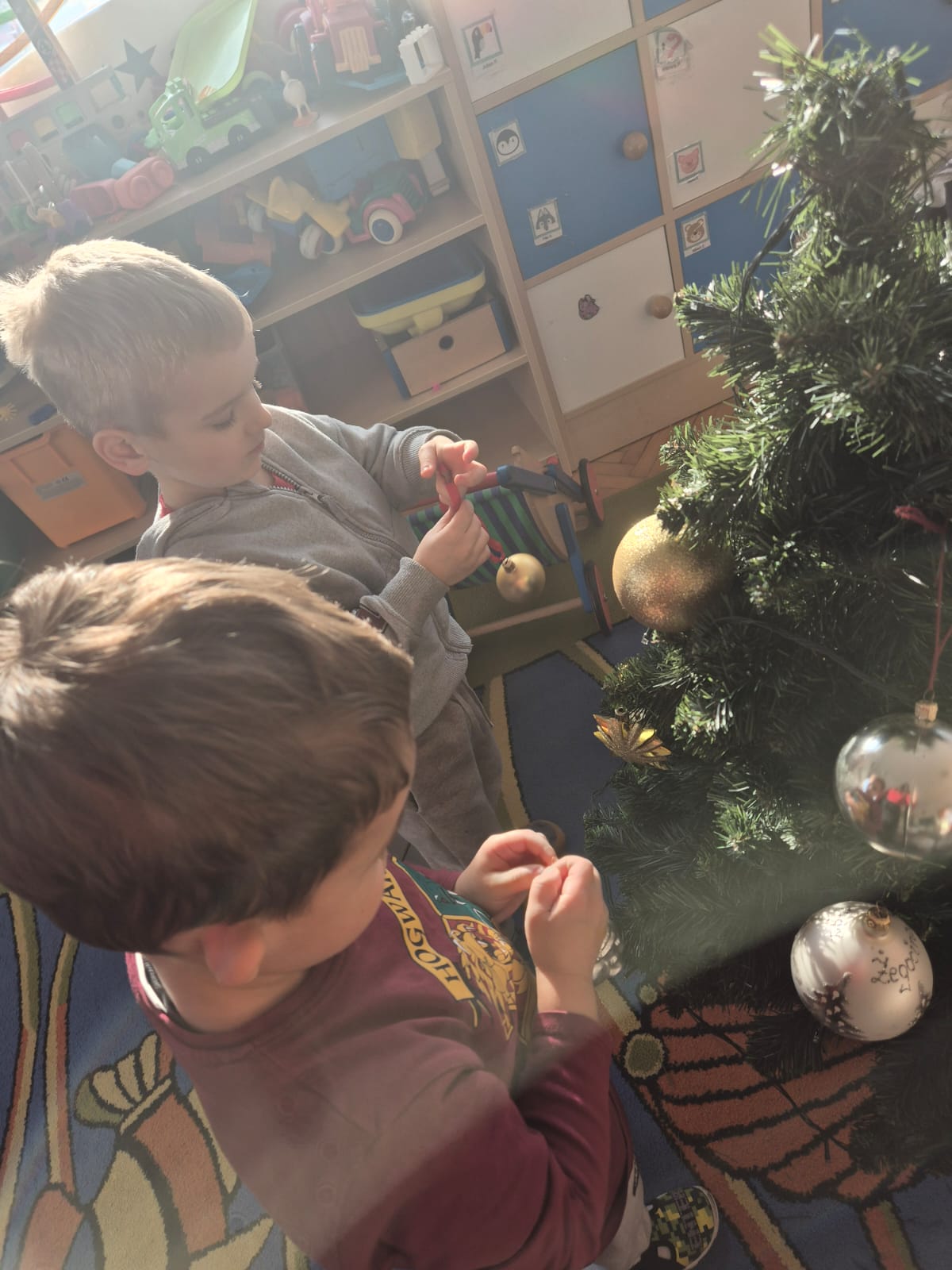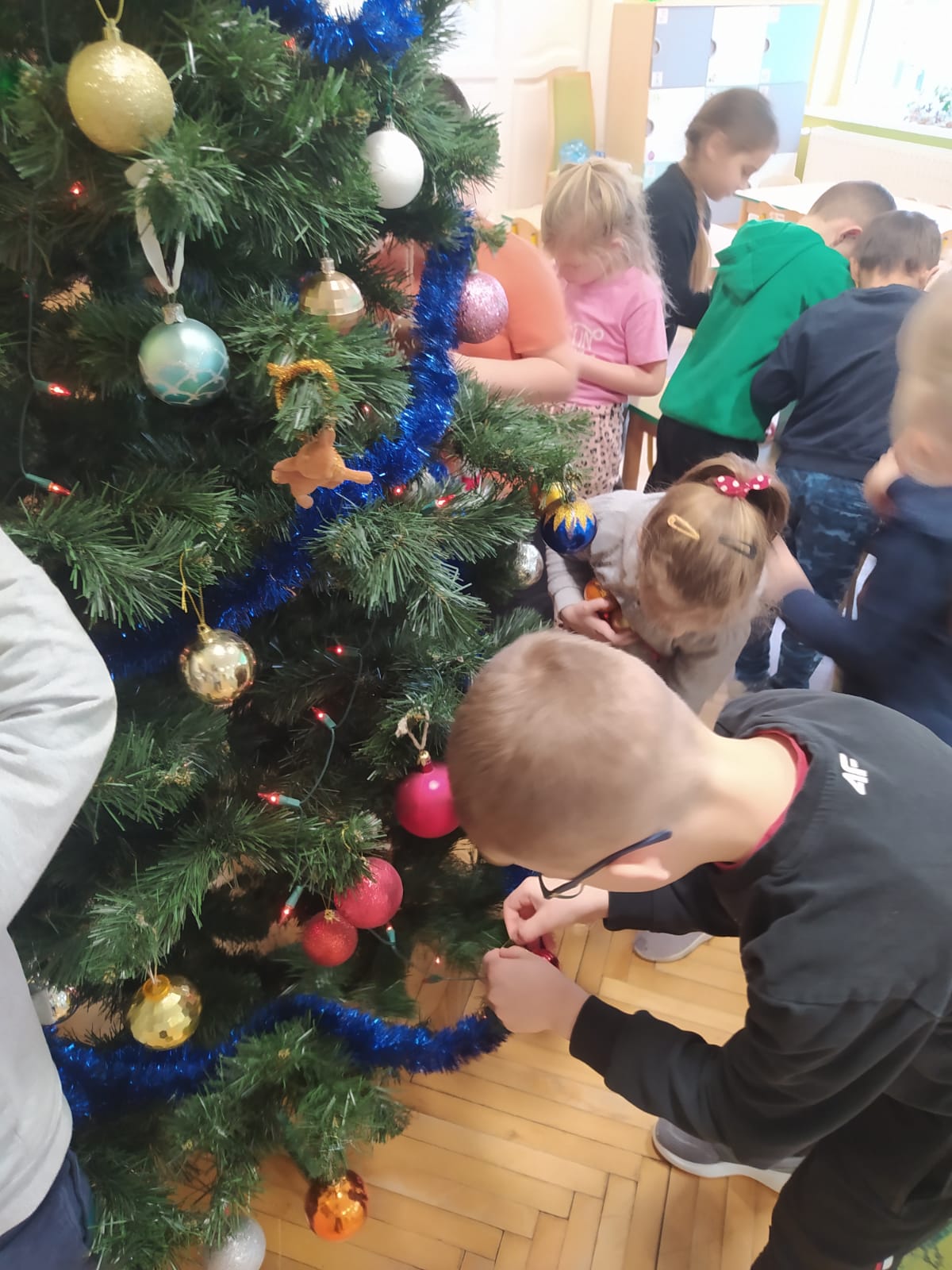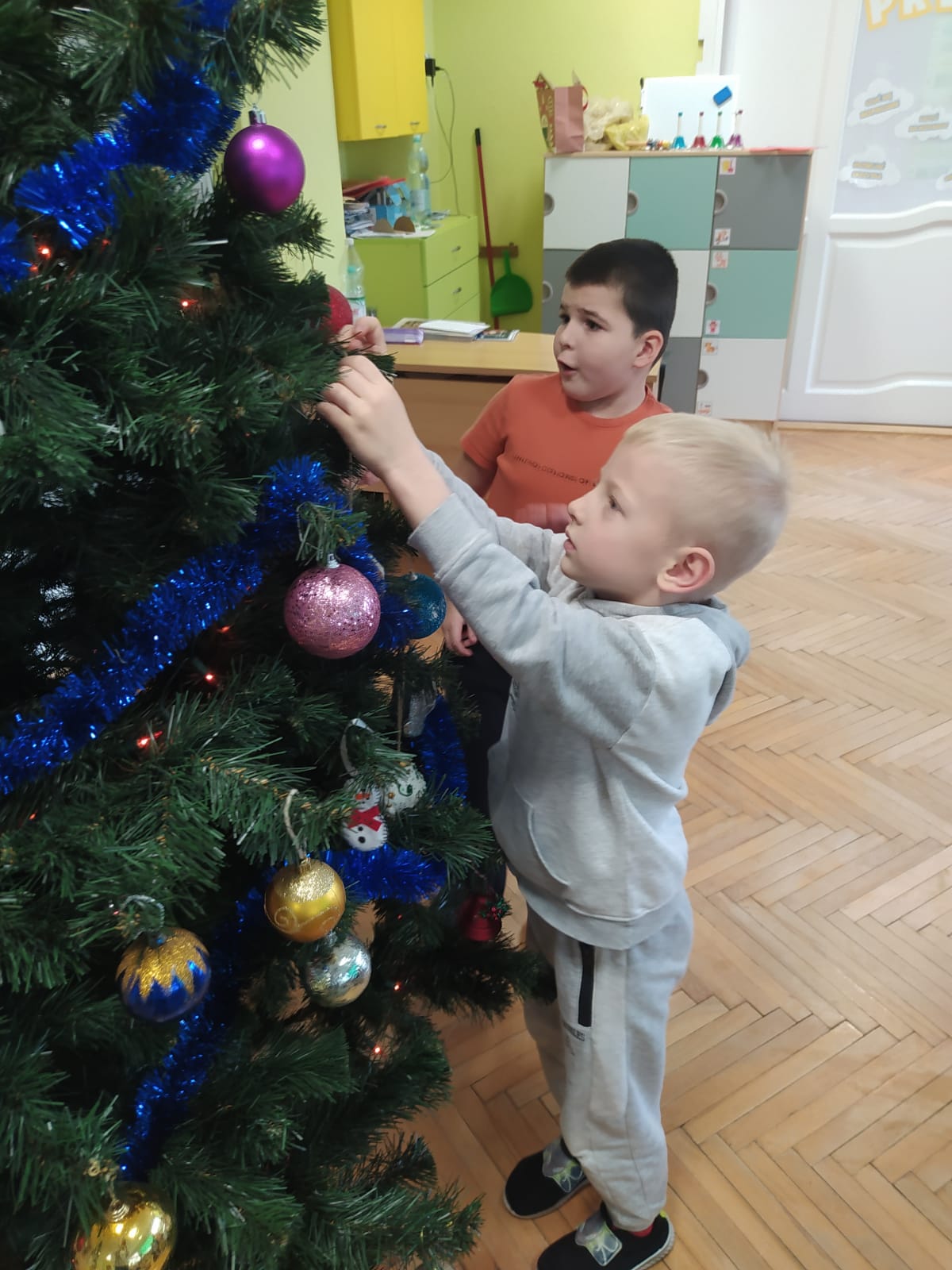 W ramach przygotowań do Świąt Bożego Narodzenia dzieci z przedszkola wzięły udział w uroczystym ubieraniu choinek w swoich salach. Przedszkolaki z dużym zaangażowaniem i radością zawieszały kolorowe bombki, łańcuchy oraz własnoręcznie wykonane ozdoby. Podczas wspólnej pracy dzieci uczyły się współdziałania, dzielenia ozdobami oraz pielęgnowania tradycji świątecznych. Ubieraniu choinki towarzyszyły rozmowy o symbolice świąt oraz śpiewanie kolęd. Przystrojone choinki wprowadziły w salach radosną, świąteczną atmosferę i pomogły dzieciom poczuć wyjątkowy klimat nadchodzącego Bożego Narodzenia.