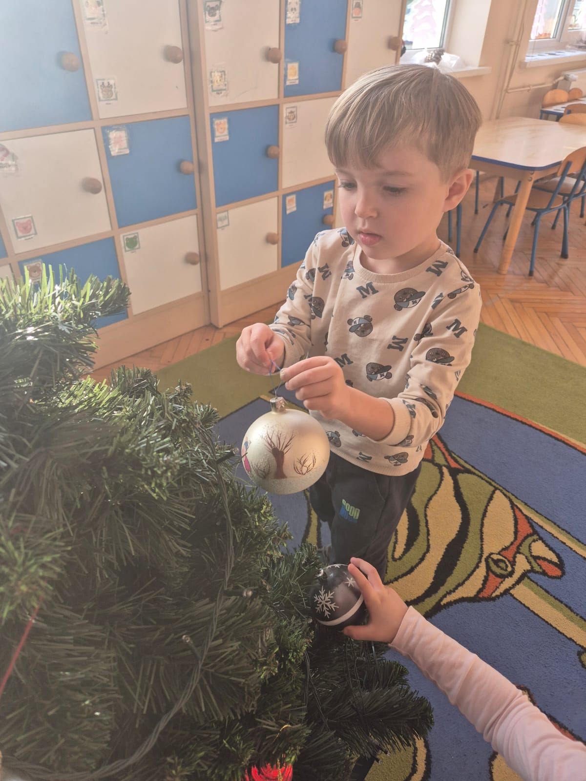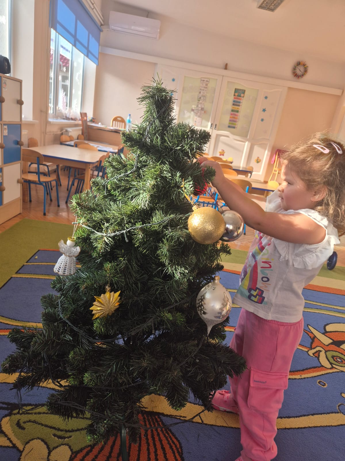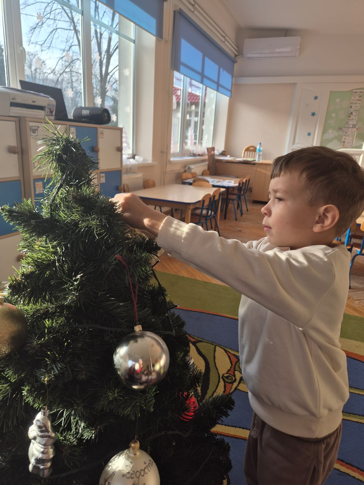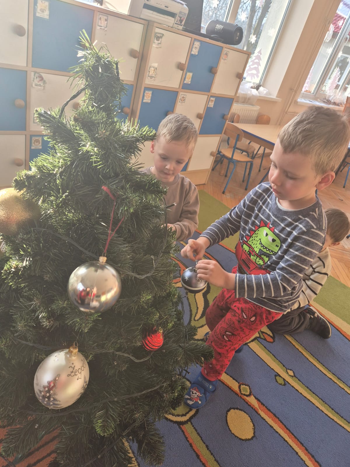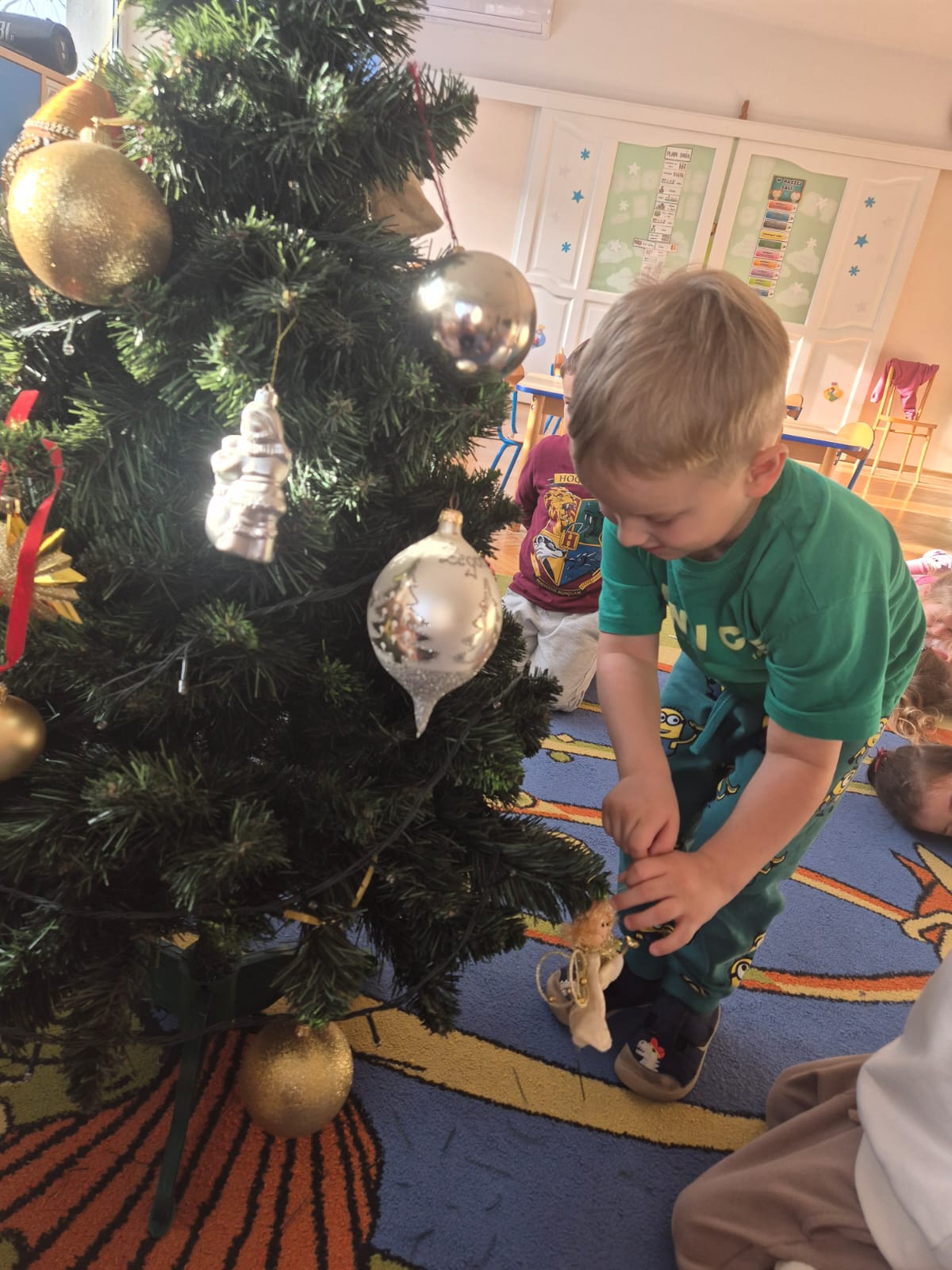 W ramach przygotowań do Świąt Bożego Narodzenia dzieci z przedszkola wzięły udział w uroczystym ubieraniu choinek w swoich salach. Przedszkolaki z dużym zaangażowaniem i radością zawieszały kolorowe bombki, łańcuchy oraz własnoręcznie wykonane ozdoby. Podczas wspólnej pracy dzieci uczyły się współdziałania, dzielenia ozdobami oraz pielęgnowania tradycji świątecznych. Ubieraniu choinki towarzyszyły rozmowy o symbolice świąt oraz śpiewanie kolęd. Przystrojone choinki wprowadziły w salach radosną, świąteczną atmosferę i pomogły dzieciom poczuć wyjątkowy klimat nadchodzącego Bożego Narodzenia.