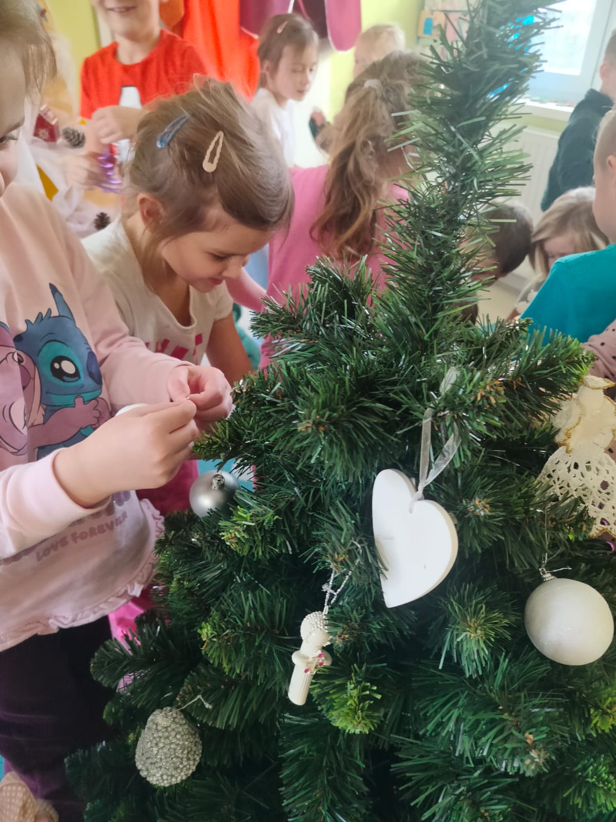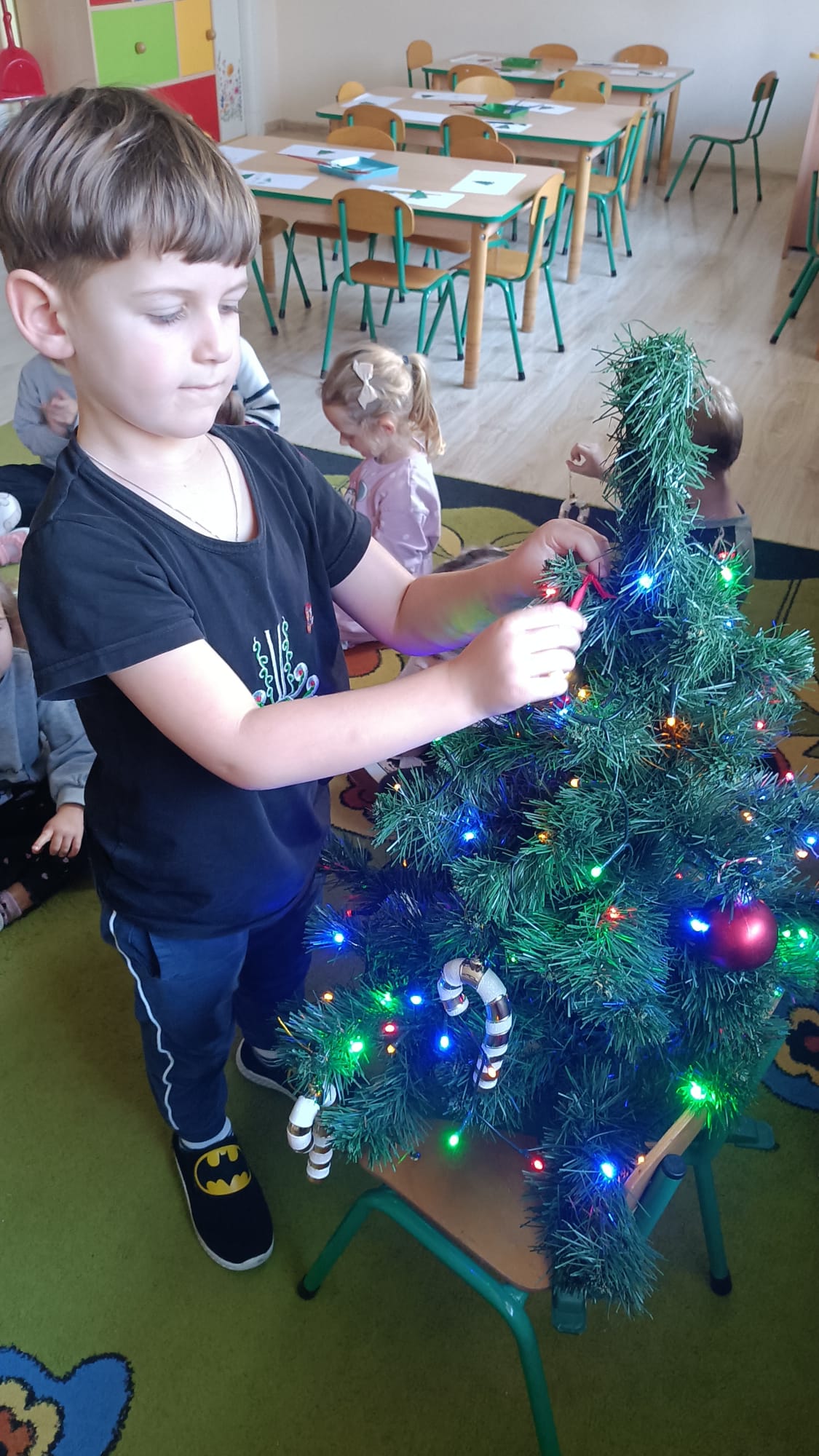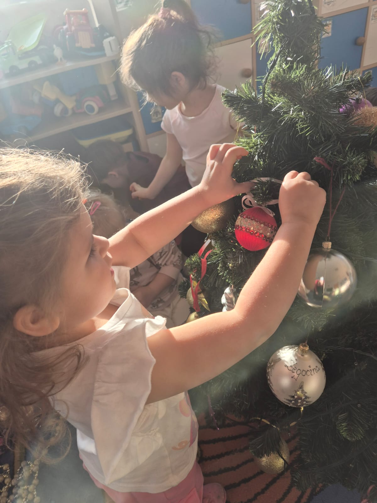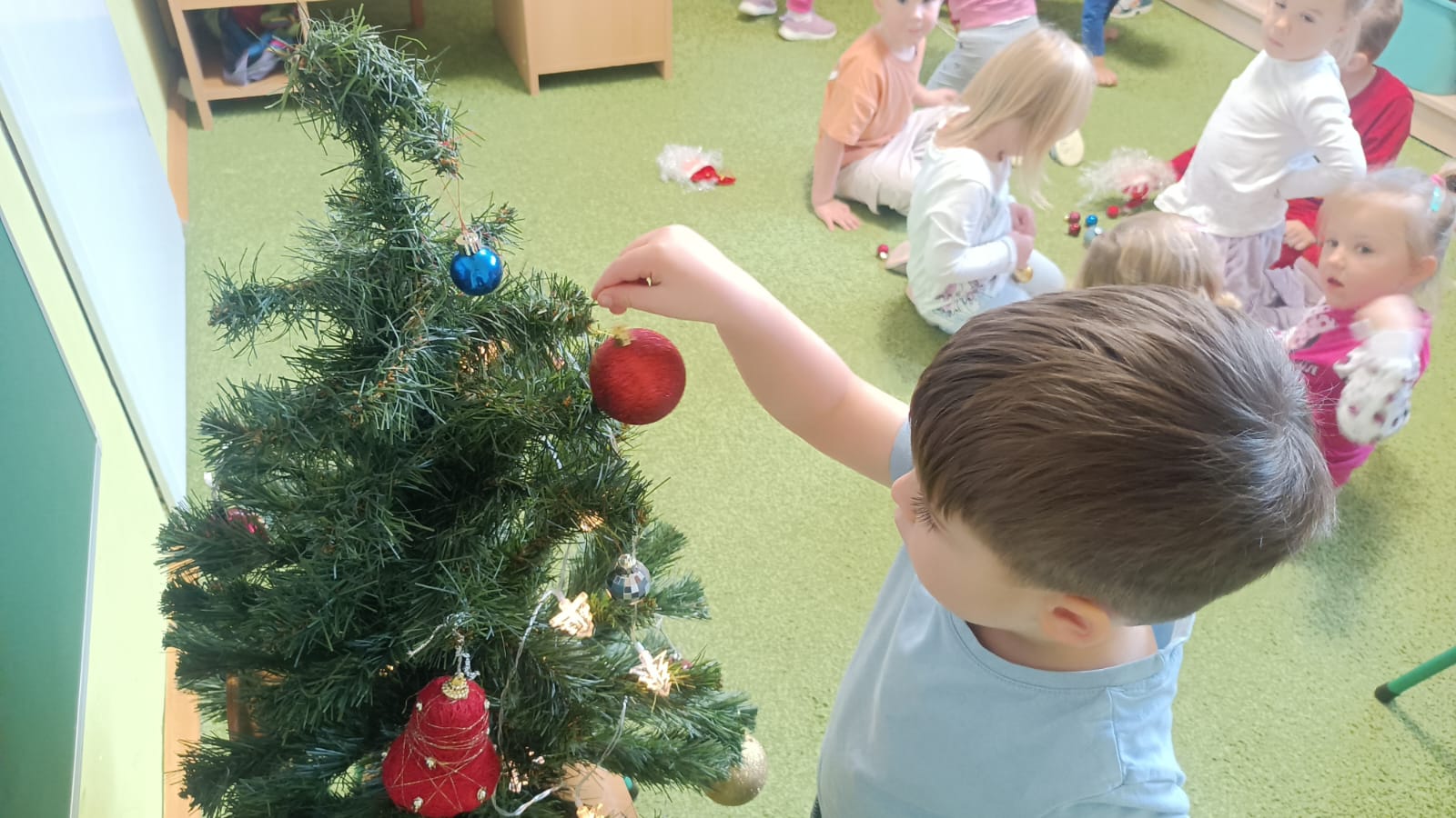 W ramach przygotowań do Świąt Bożego Narodzenia dzieci z przedszkola wzięły udział w uroczystym ubieraniu choinek w swoich salach. Przedszkolaki z dużym zaangażowaniem i radością zawieszały kolorowe bombki, łańcuchy oraz własnoręcznie wykonane ozdoby. Podczas wspólnej pracy dzieci uczyły się współdziałania, dzielenia ozdobami oraz pielęgnowania tradycji świątecznych. Ubieraniu choinki towarzyszyły rozmowy o symbolice świąt oraz śpiewanie kolęd. Przystrojone choinki wprowadziły w salach radosną, świąteczną atmosferę i pomogły dzieciom poczuć wyjątkowy klimat nadchodzącego Bożego Narodzenia.