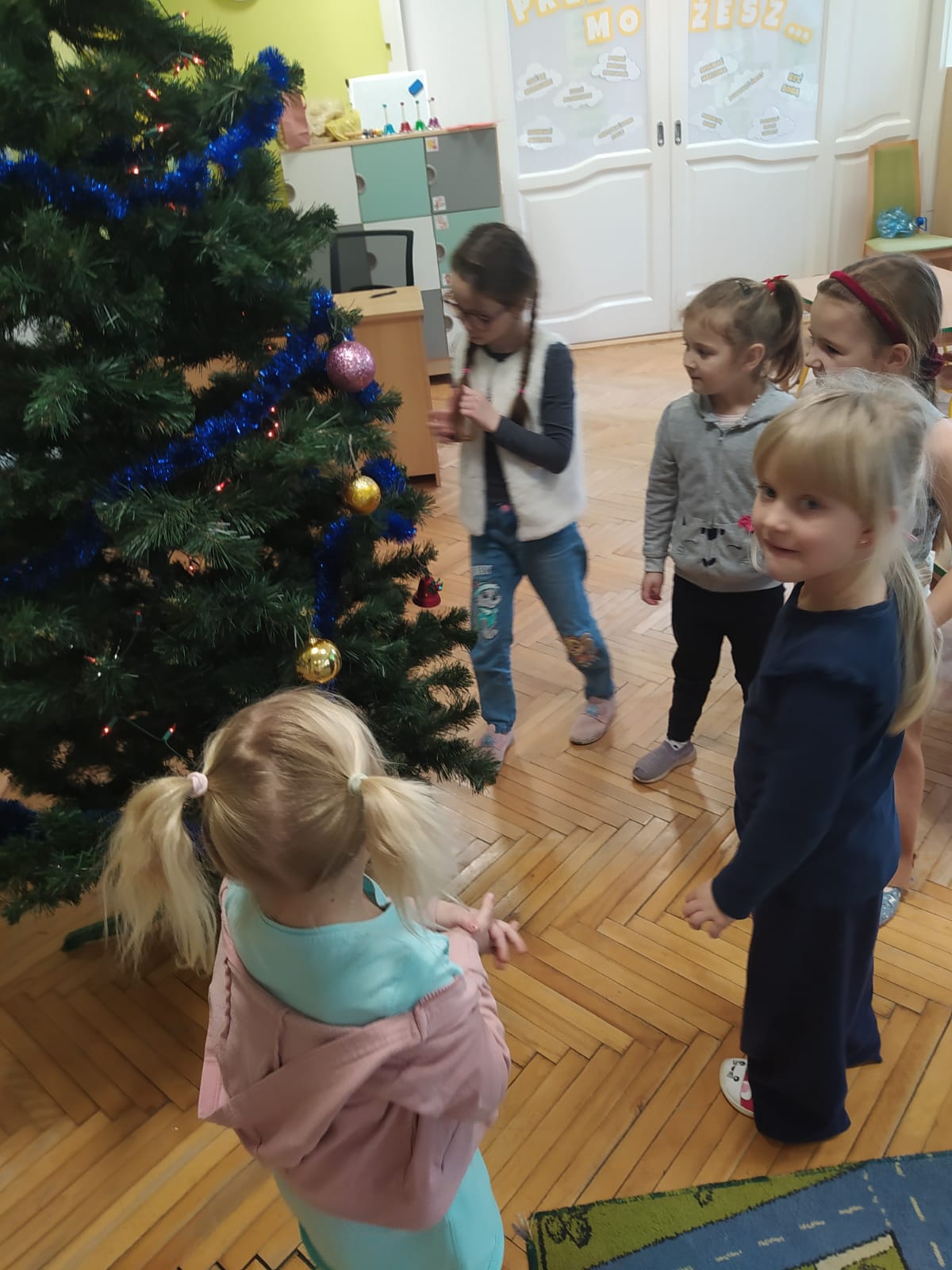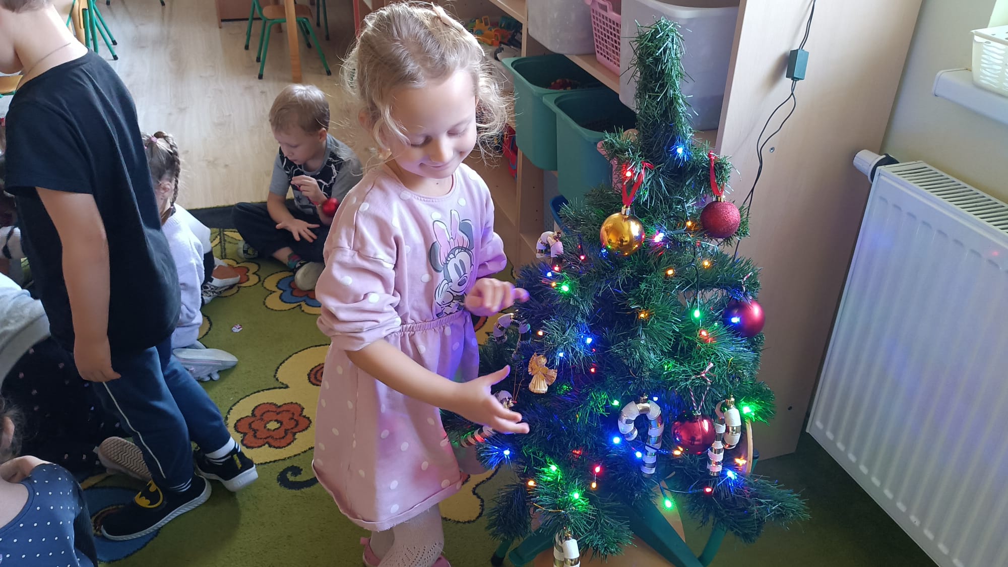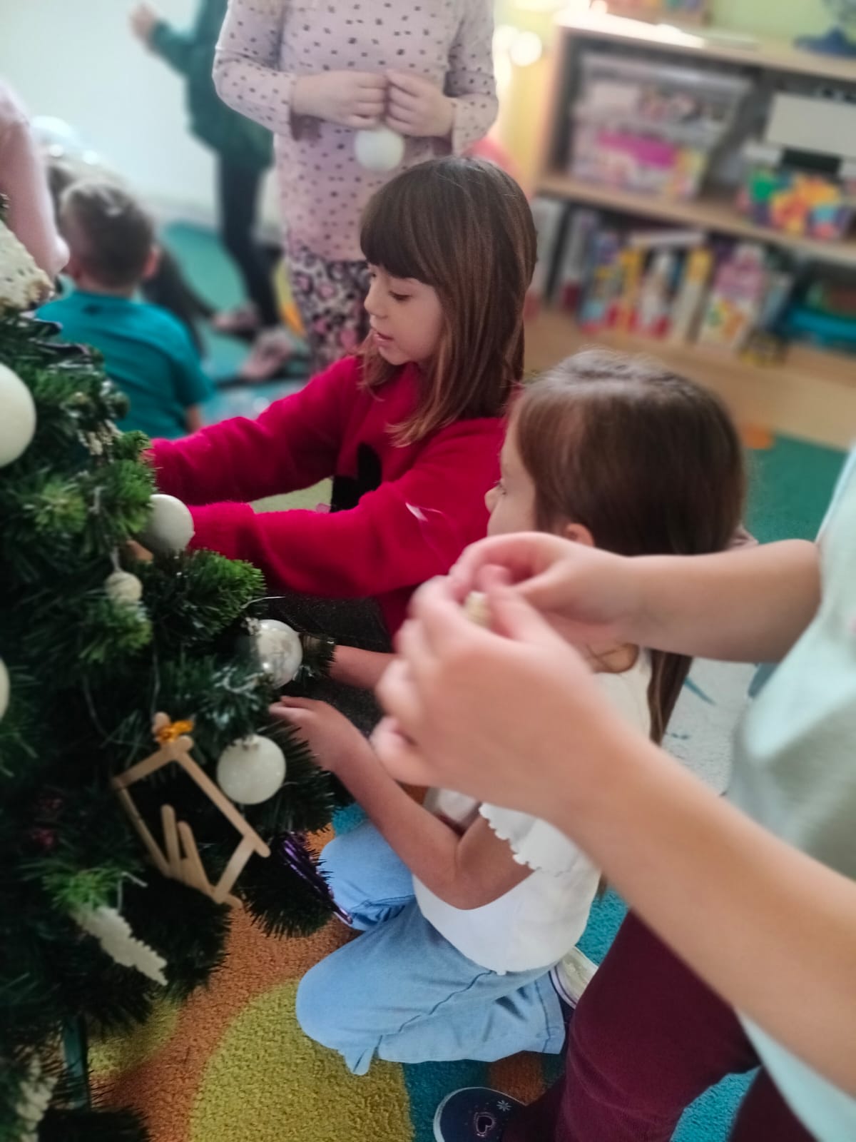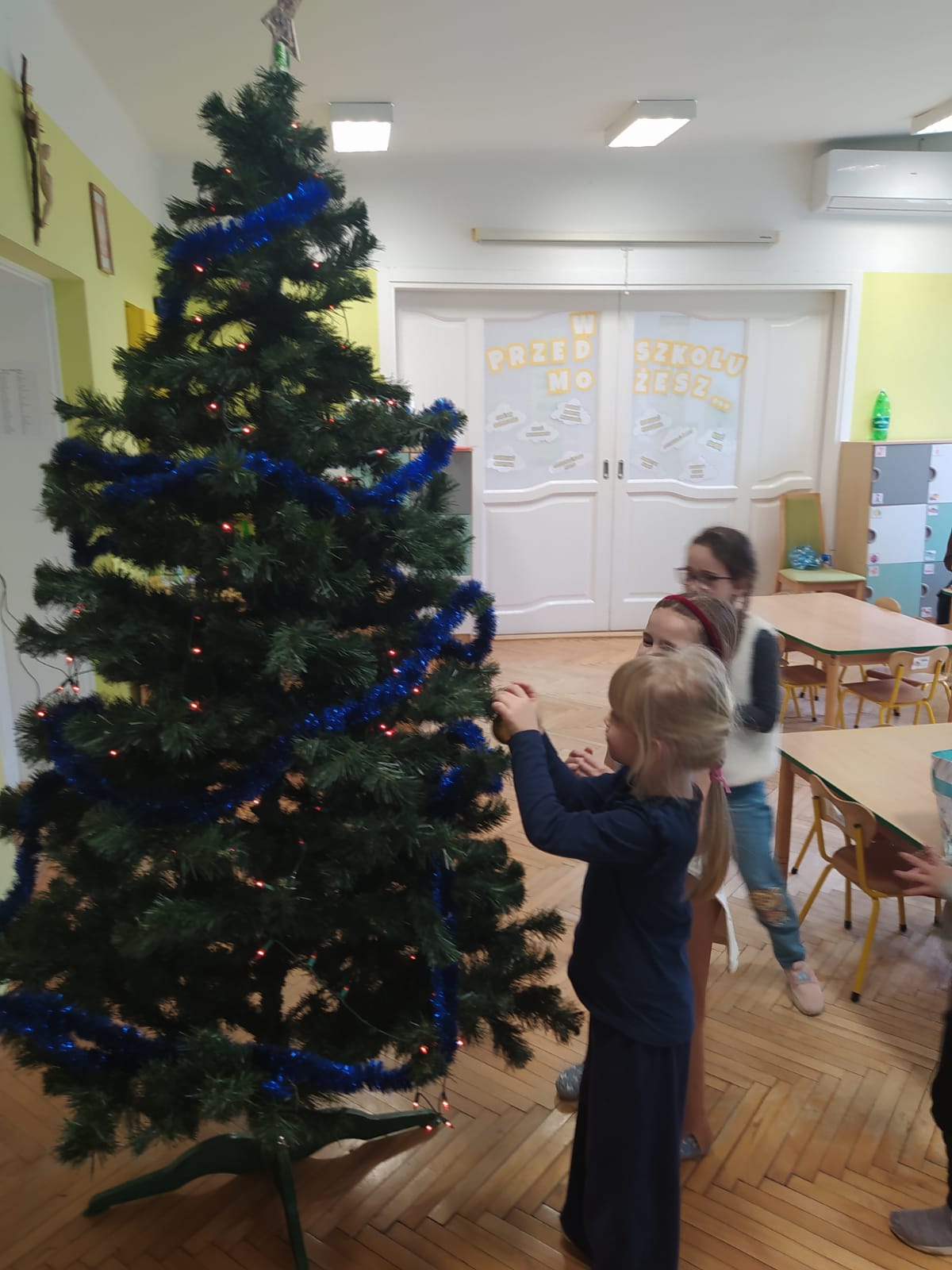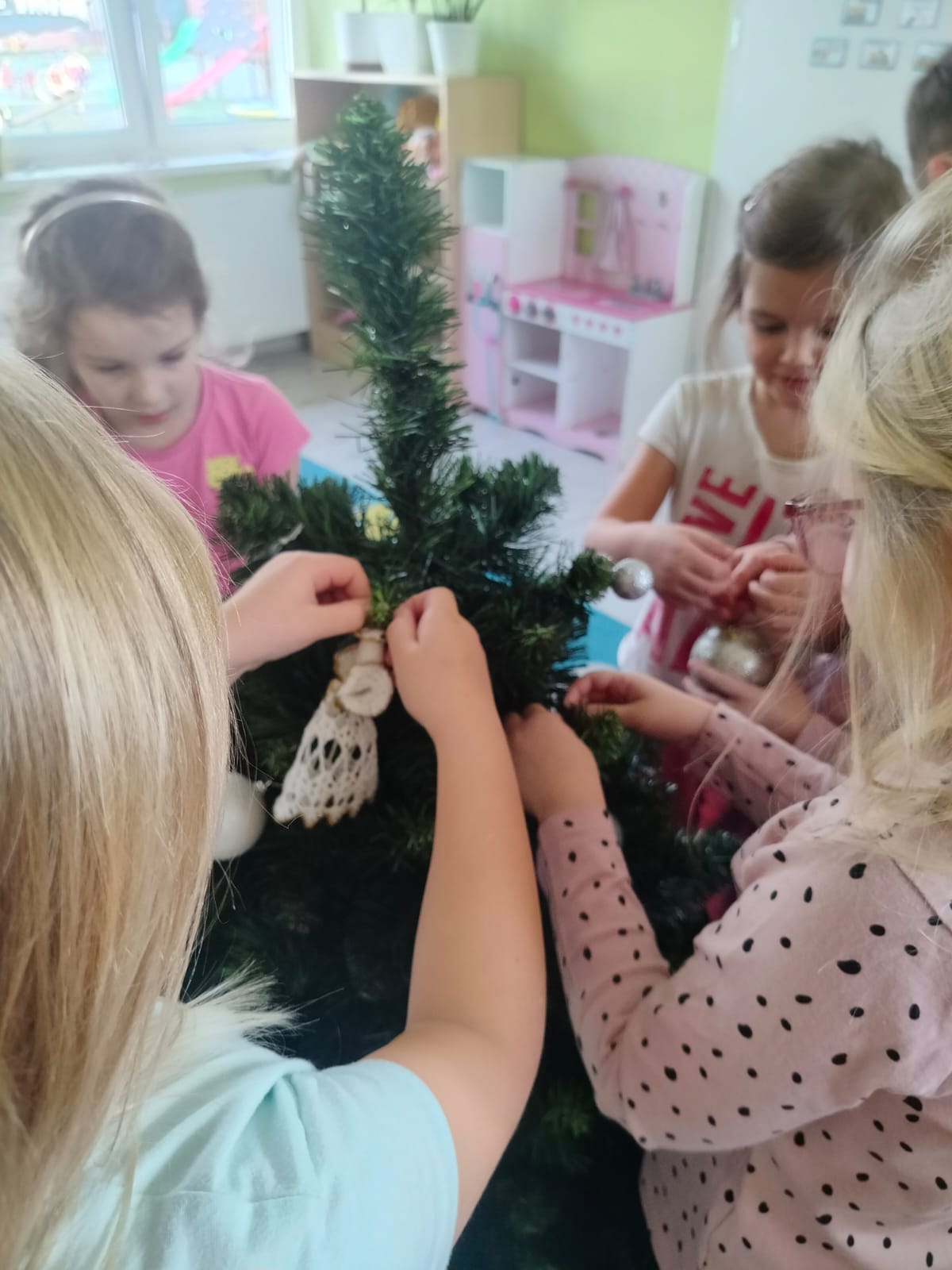 W ramach przygotowań do Świąt Bożego Narodzenia dzieci z przedszkola wzięły udział w uroczystym ubieraniu choinek w swoich salach. Przedszkolaki z dużym zaangażowaniem i radością zawieszały kolorowe bombki, łańcuchy oraz własnoręcznie wykonane ozdoby. Podczas wspólnej pracy dzieci uczyły się współdziałania, dzielenia ozdobami oraz pielęgnowania tradycji świątecznych. Ubieraniu choinki towarzyszyły rozmowy o symbolice świąt oraz śpiewanie kolęd. Przystrojone choinki wprowadziły w salach radosną, świąteczną atmosferę i pomogły dzieciom poczuć wyjątkowy klimat nadchodzącego Bożego Narodzenia.