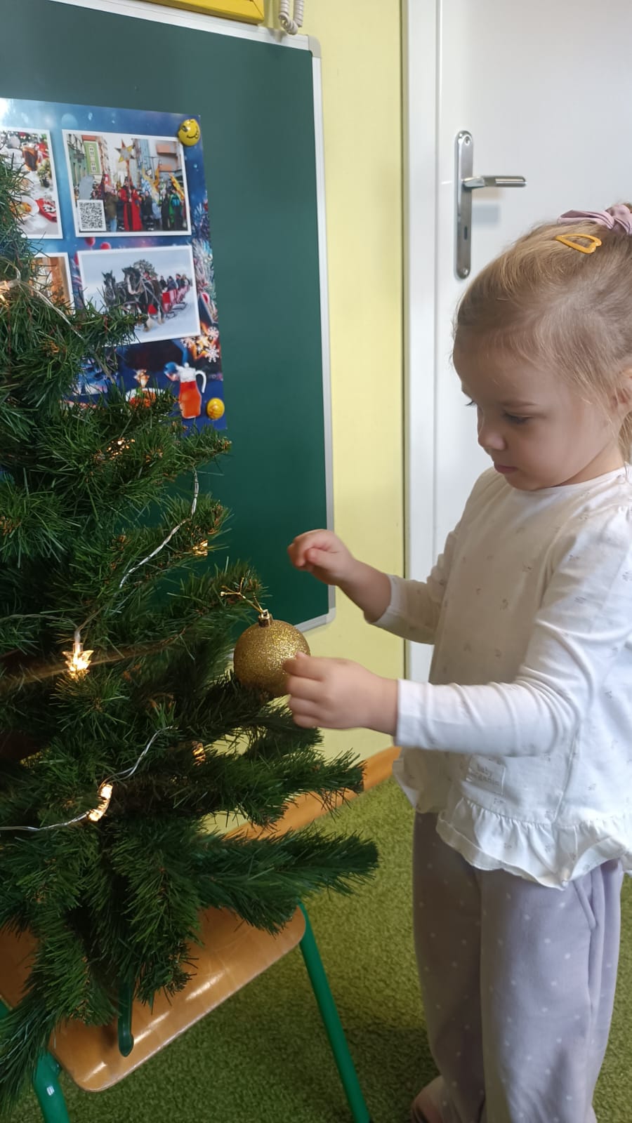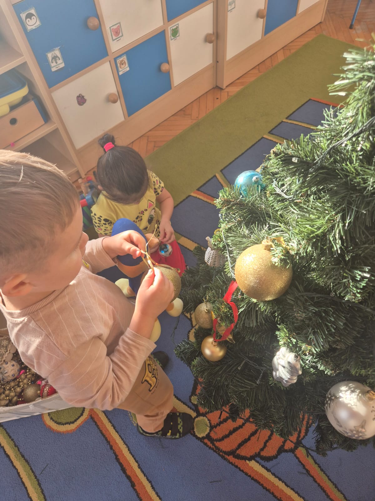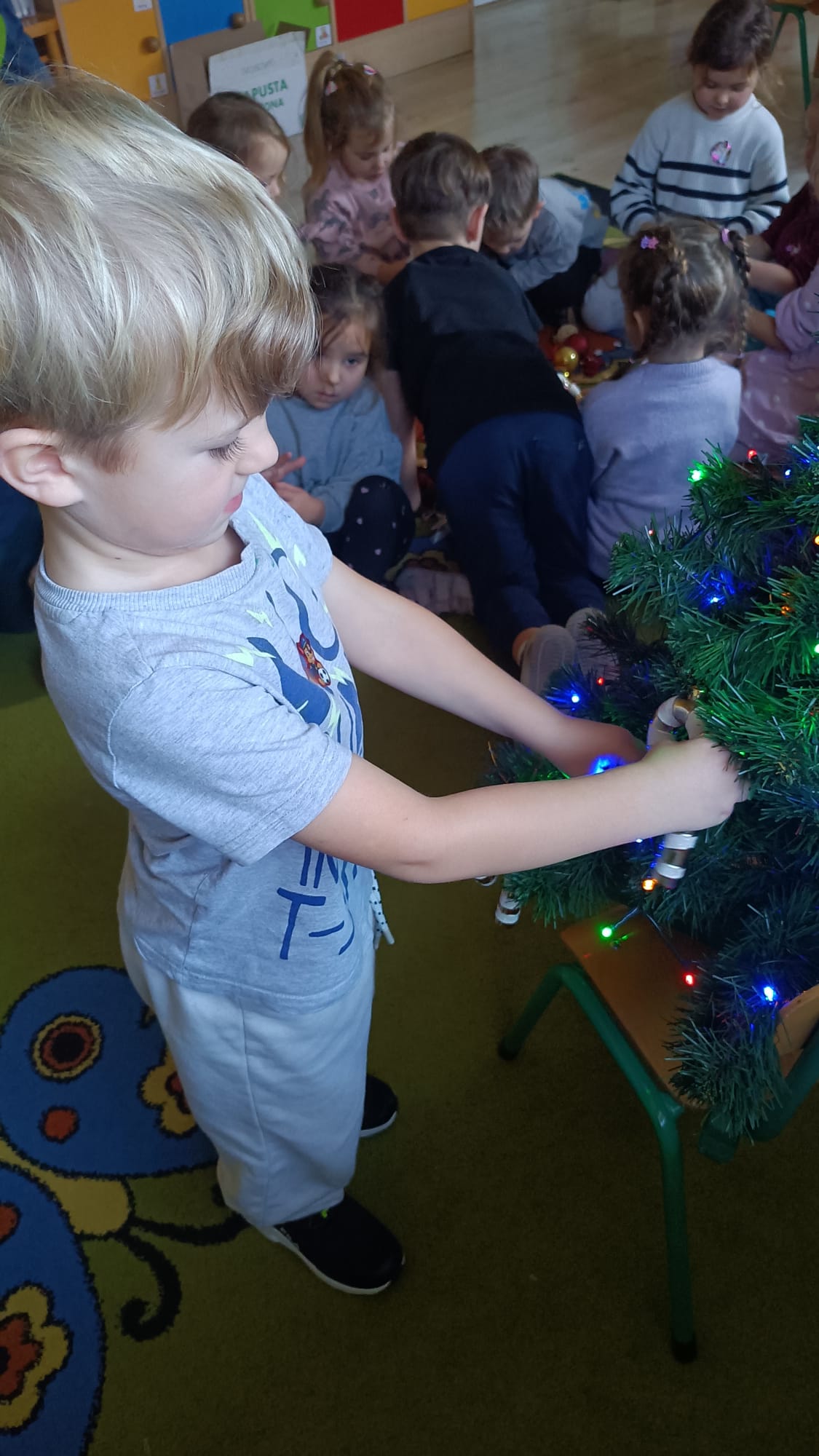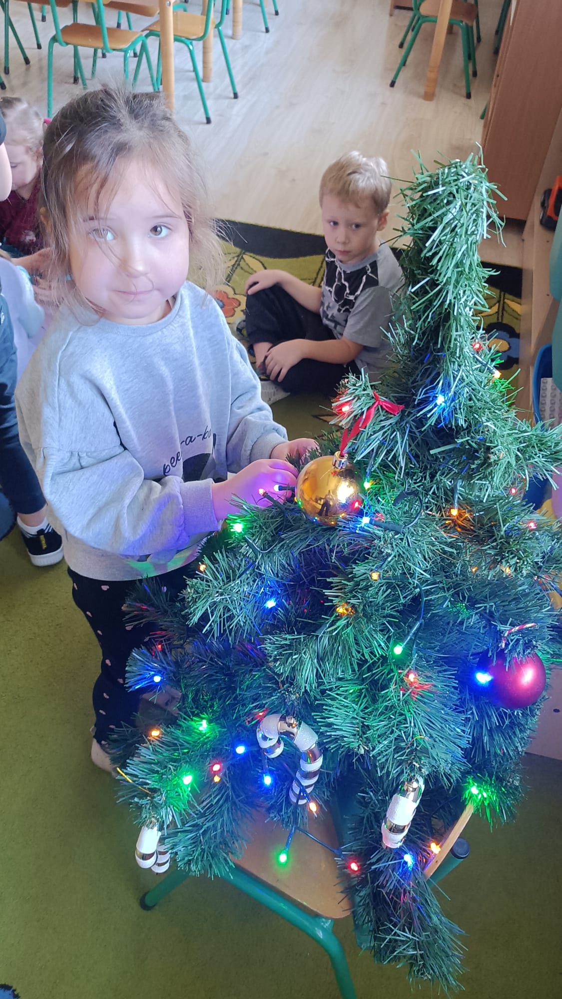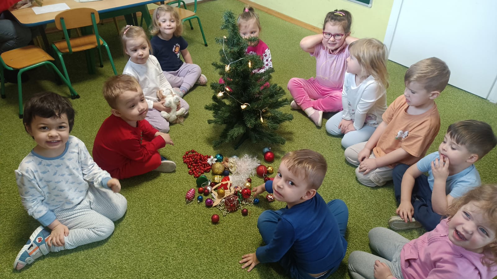 W ramach przygotowań do Świąt Bożego Narodzenia dzieci z przedszkola wzięły udział w uroczystym ubieraniu choinek w swoich salach. Przedszkolaki z dużym zaangażowaniem i radością zawieszały kolorowe bombki, łańcuchy oraz własnoręcznie wykonane ozdoby. Podczas wspólnej pracy dzieci uczyły się współdziałania, dzielenia ozdobami oraz pielęgnowania tradycji świątecznych. Ubieraniu choinki towarzyszyły rozmowy o symbolice świąt oraz śpiewanie kolęd. Przystrojone choinki wprowadziły w salach radosną, świąteczną atmosferę i pomogły dzieciom poczuć wyjątkowy klimat nadchodzącego Bożego Narodzenia.