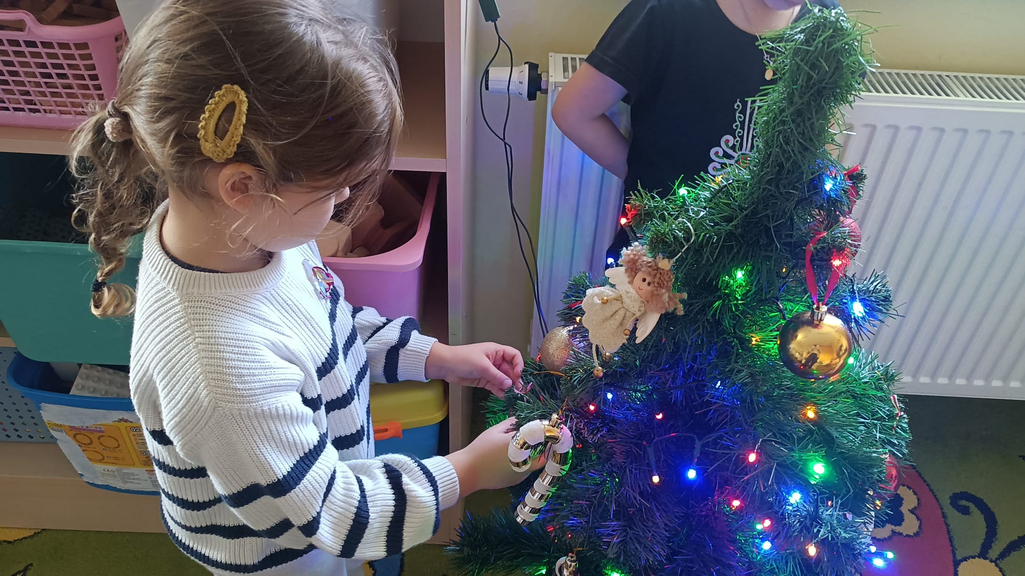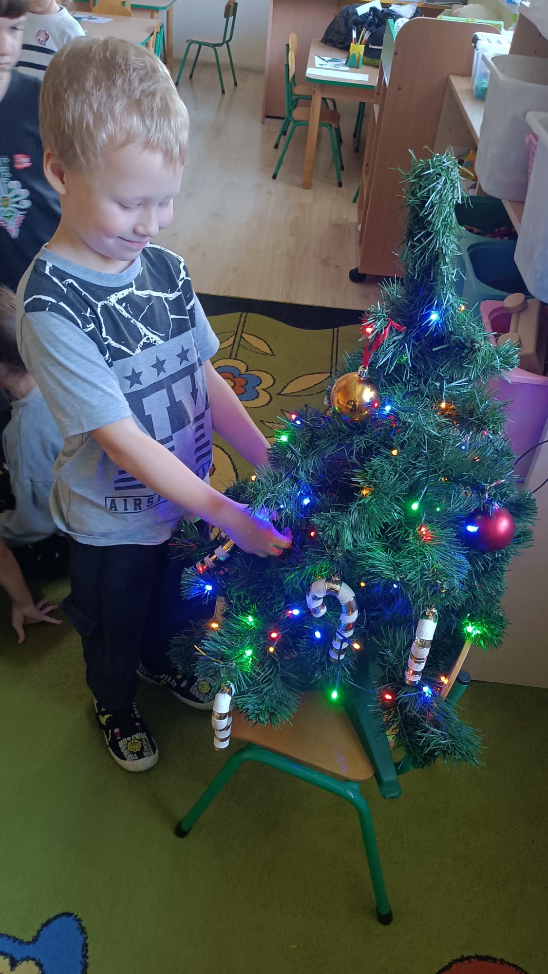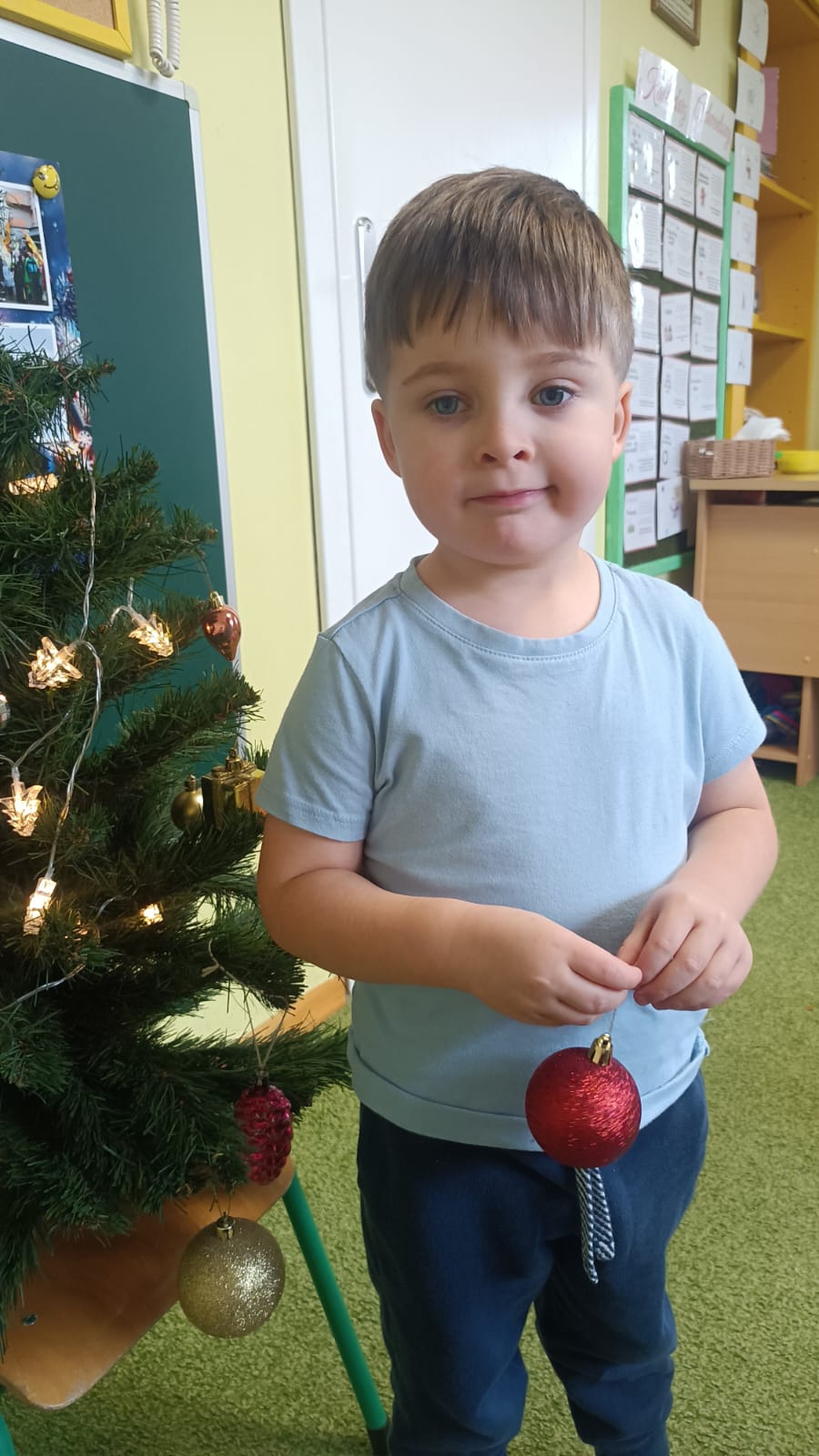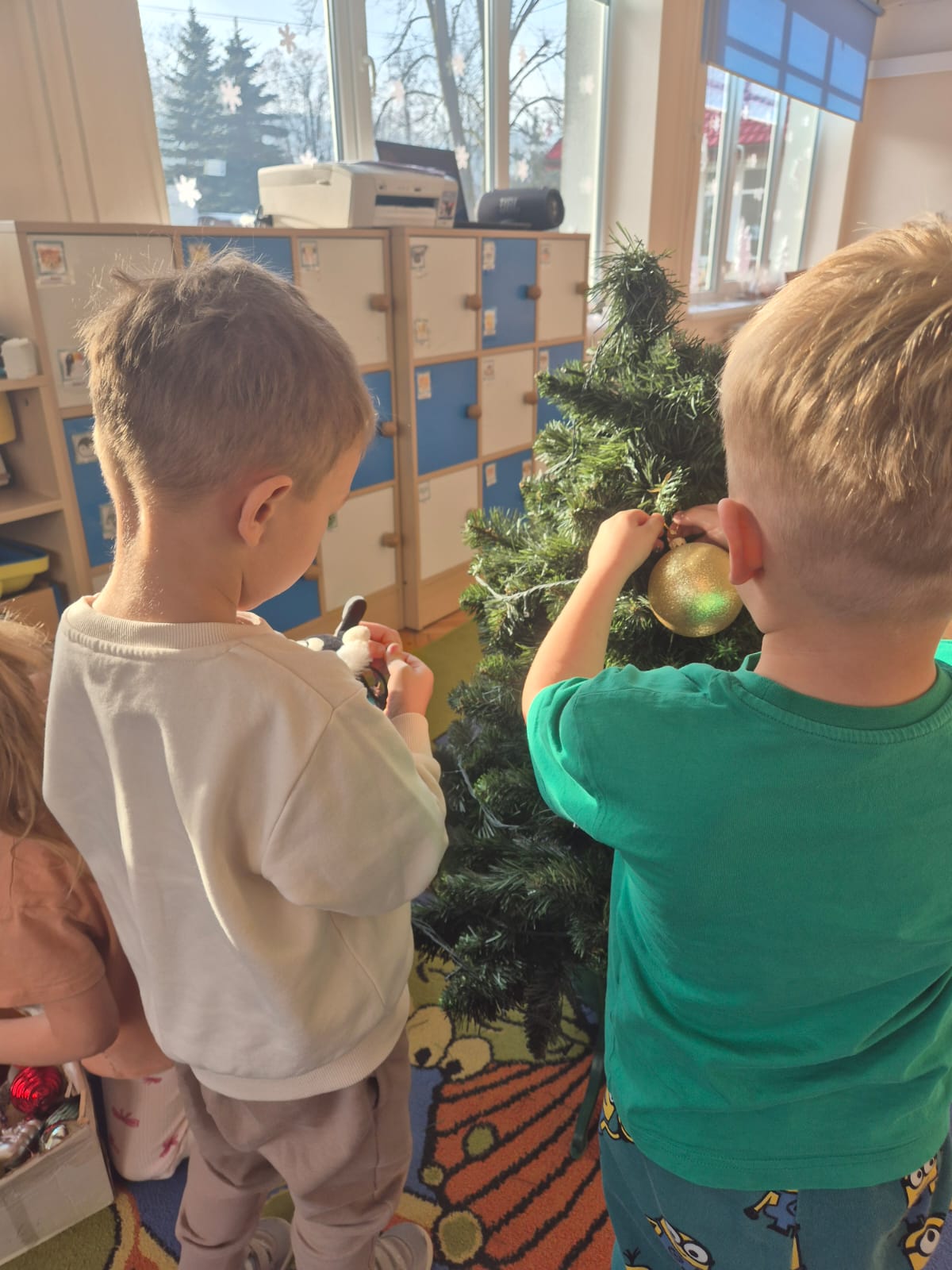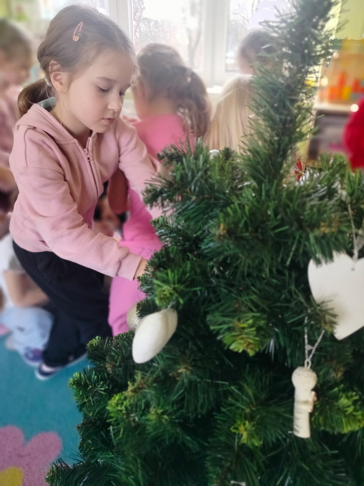 W ramach przygotowań do Świąt Bożego Narodzenia dzieci z przedszkola wzięły udział w uroczystym ubieraniu choinek w swoich salach. Przedszkolaki z dużym zaangażowaniem i radością zawieszały kolorowe bombki, łańcuchy oraz własnoręcznie wykonane ozdoby. Podczas wspólnej pracy dzieci uczyły się współdziałania, dzielenia ozdobami oraz pielęgnowania tradycji świątecznych. Ubieraniu choinki towarzyszyły rozmowy o symbolice świąt oraz śpiewanie kolęd. Przystrojone choinki wprowadziły w salach radosną, świąteczną atmosferę i pomogły dzieciom poczuć wyjątkowy klimat nadchodzącego Bożego Narodzenia.