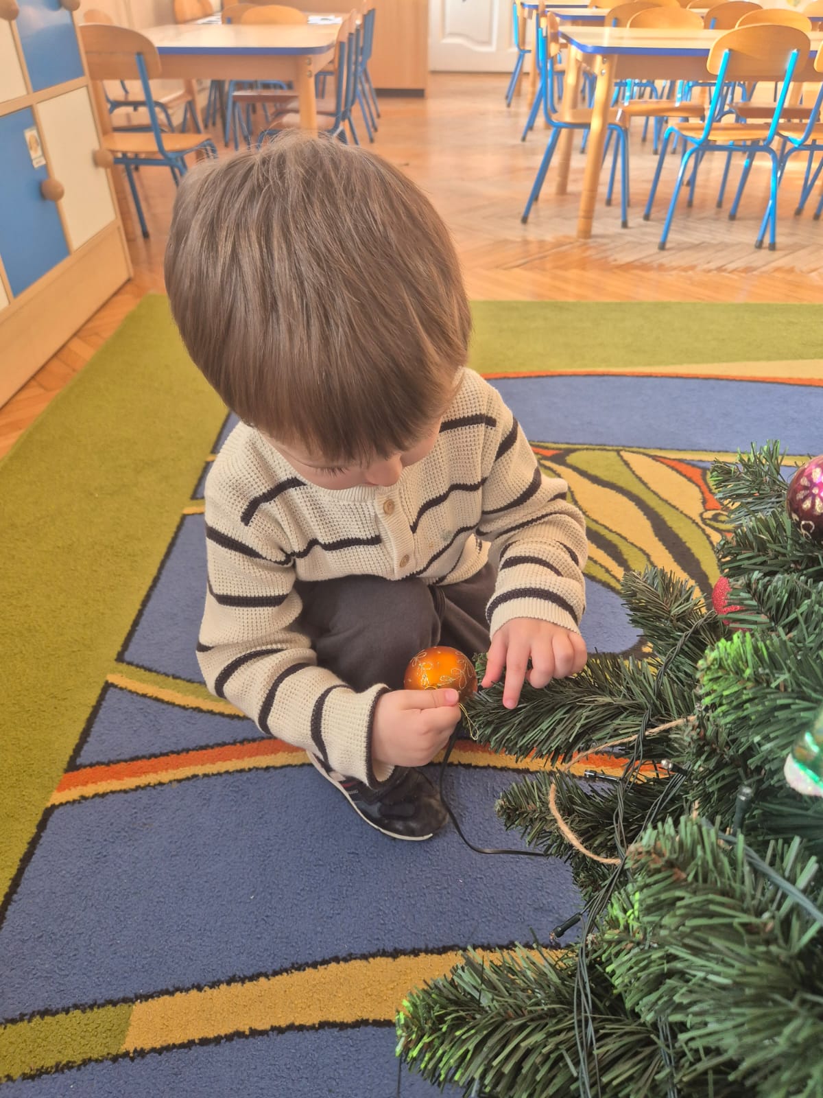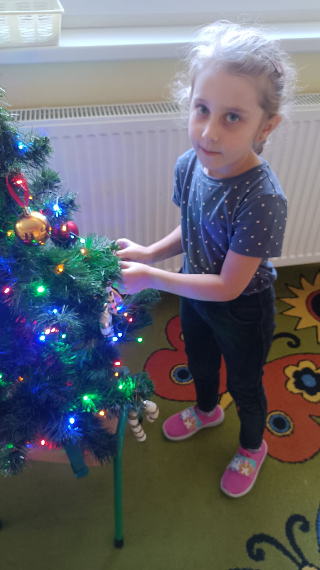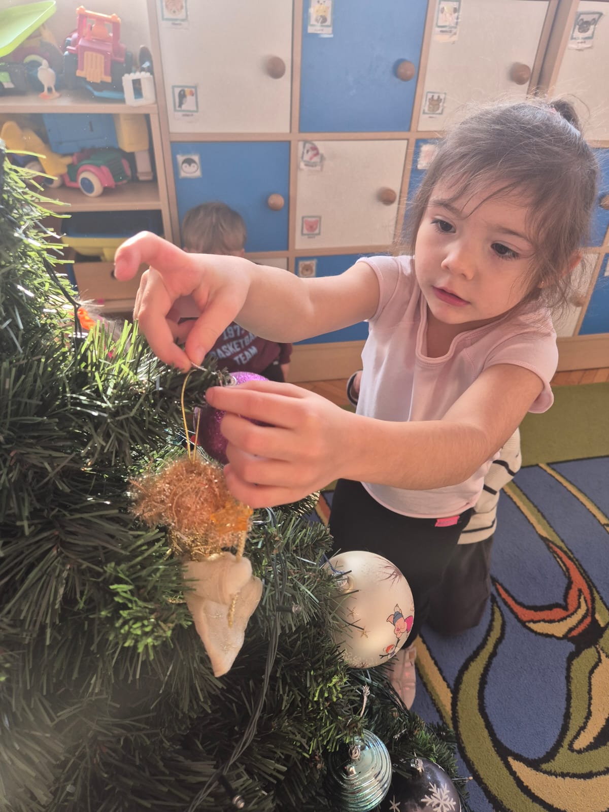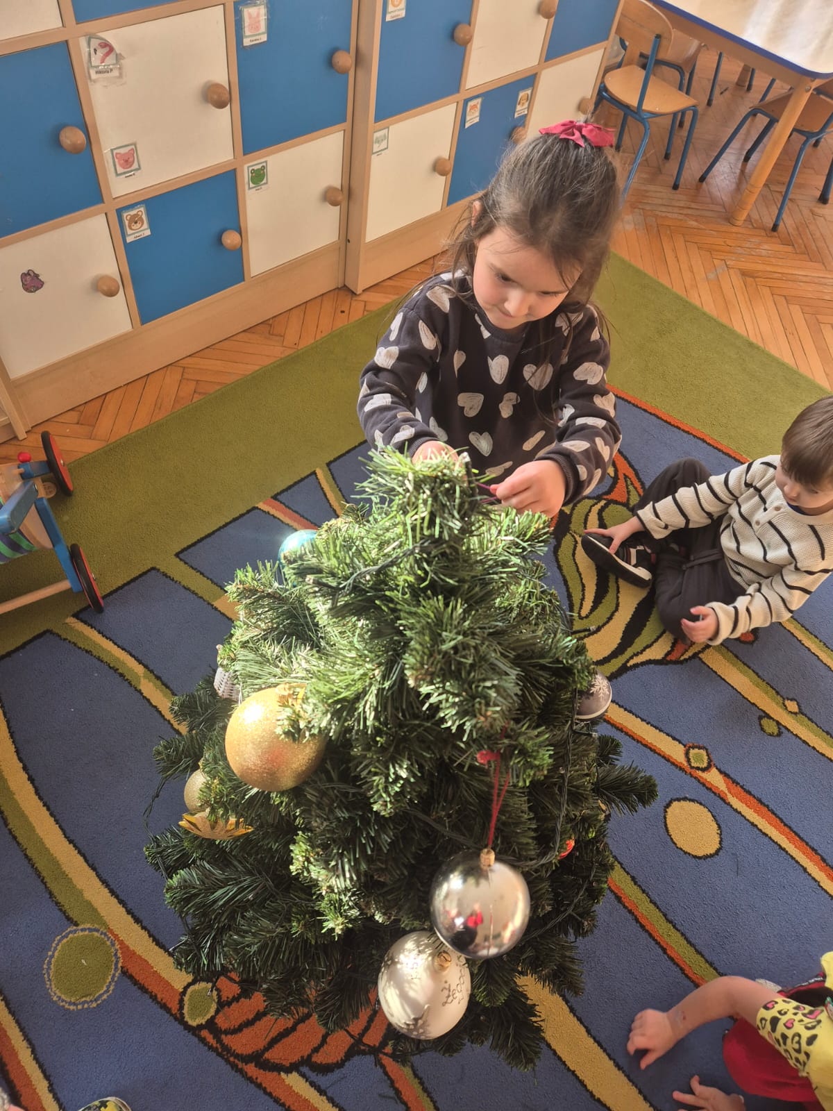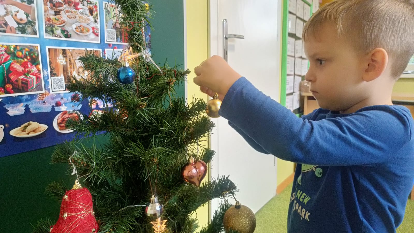 W ramach przygotowań do Świąt Bożego Narodzenia dzieci z przedszkola wzięły udział w uroczystym ubieraniu choinek w swoich salach. Przedszkolaki z dużym zaangażowaniem i radością zawieszały kolorowe bombki, łańcuchy oraz własnoręcznie wykonane ozdoby. Podczas wspólnej pracy dzieci uczyły się współdziałania, dzielenia ozdobami oraz pielęgnowania tradycji świątecznych. Ubieraniu choinki towarzyszyły rozmowy o symbolice świąt oraz śpiewanie kolęd. Przystrojone choinki wprowadziły w salach radosną, świąteczną atmosferę i pomogły dzieciom poczuć wyjątkowy klimat nadchodzącego Bożego Narodzenia.