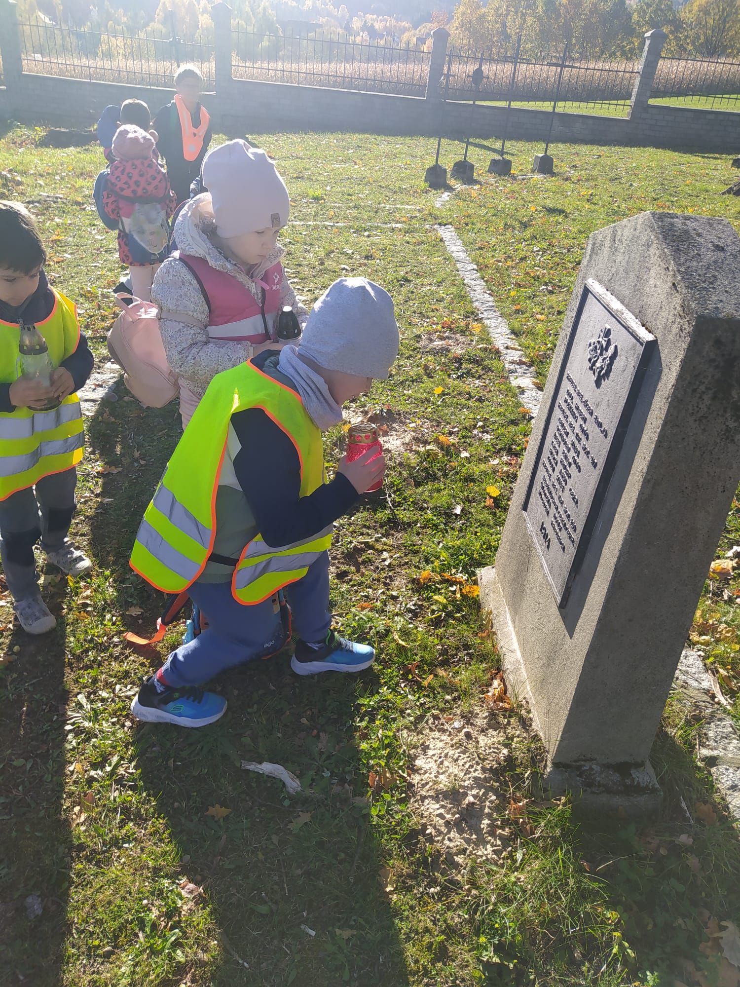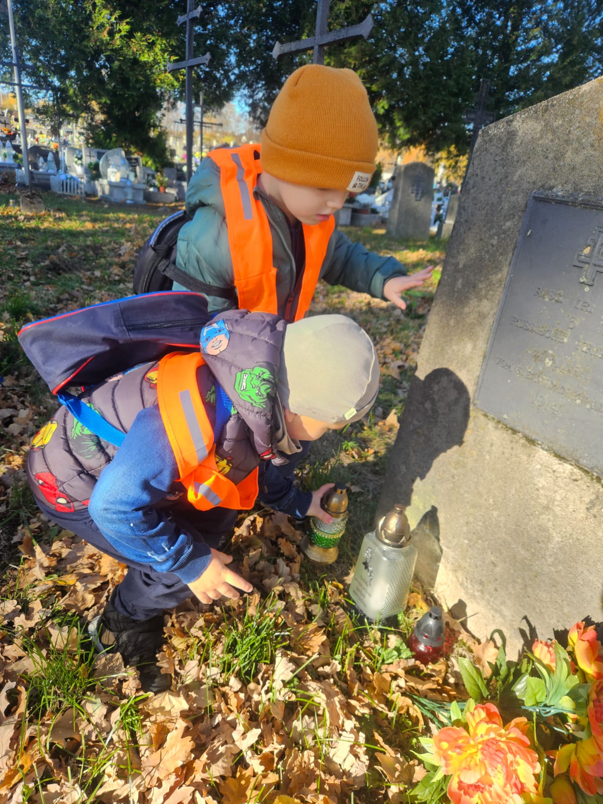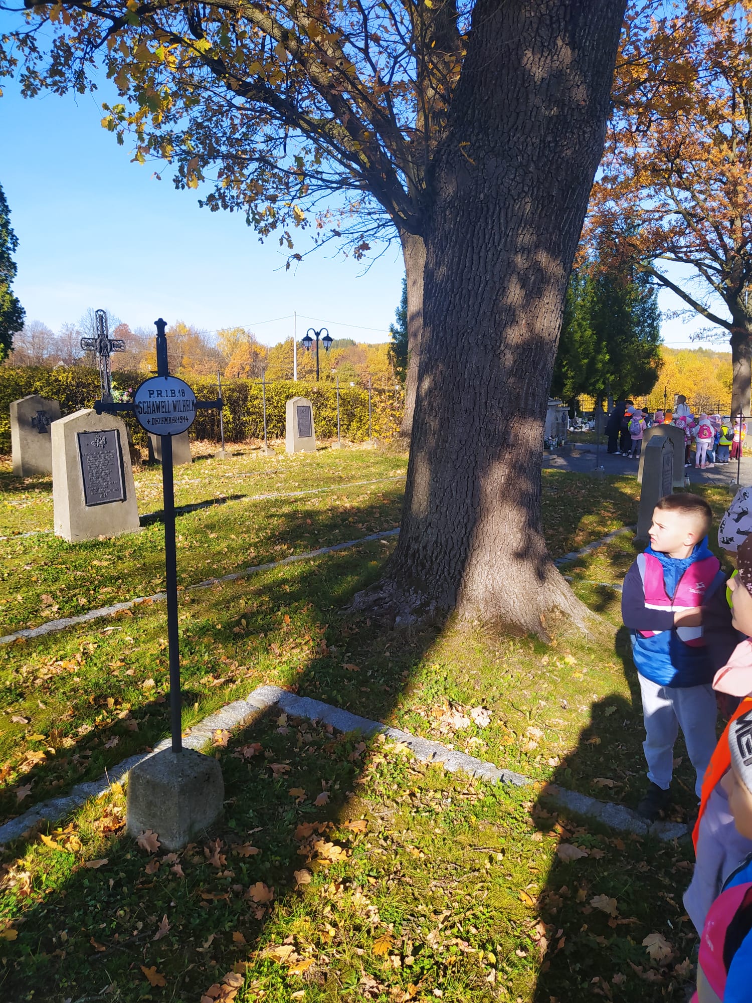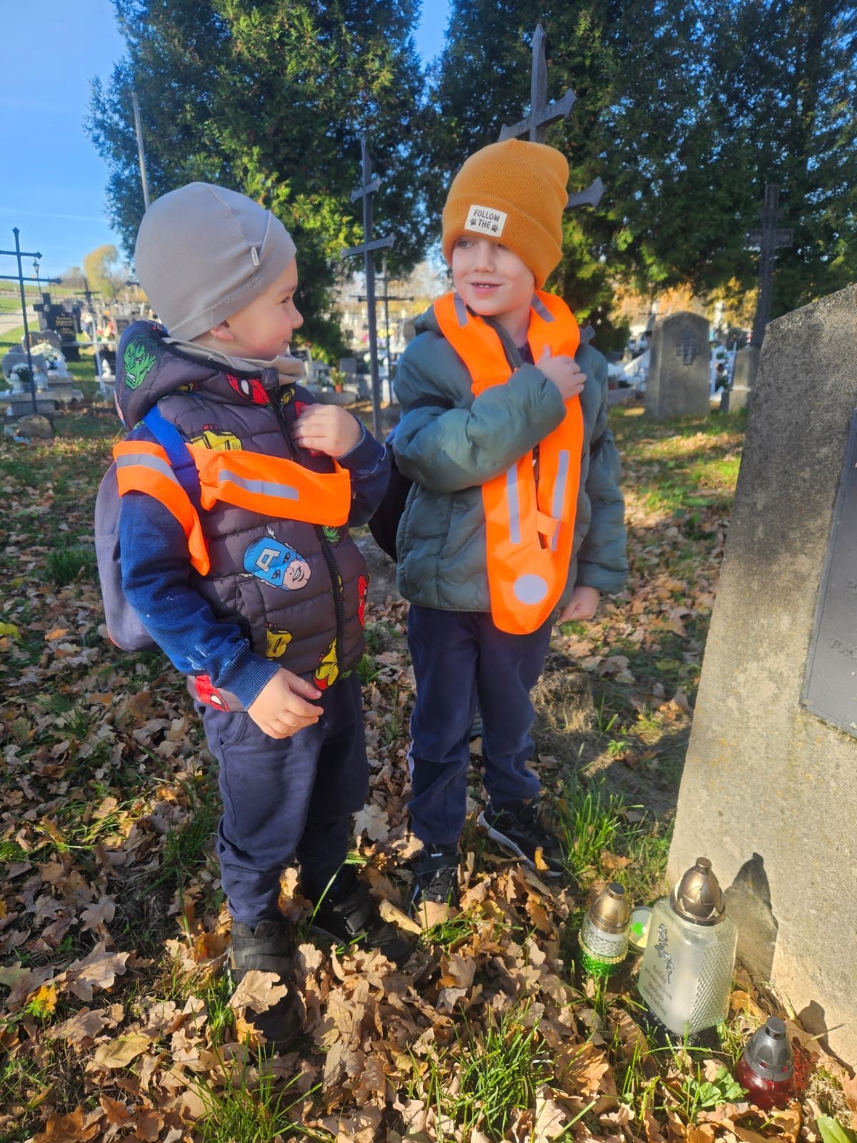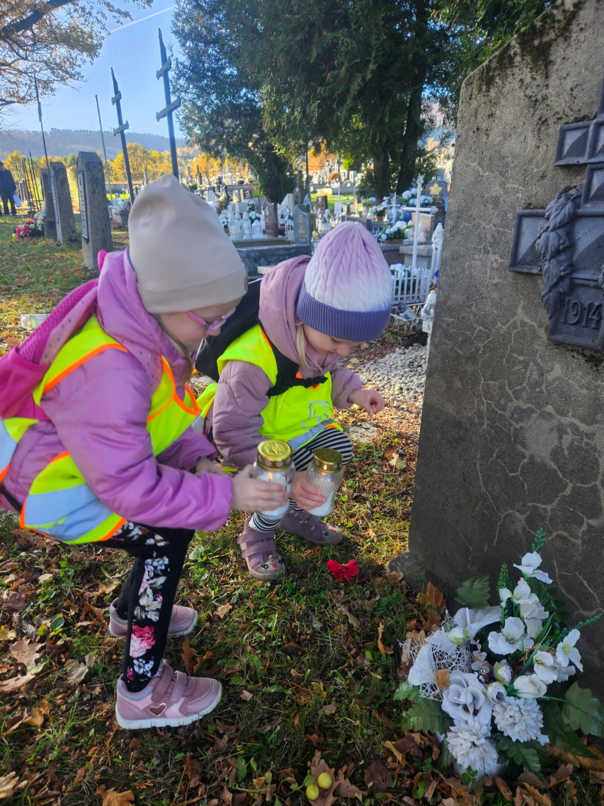 W piątek, 31 października, dzieci z grup „Motylki” i „Promyczki” udały się na pobliski cmentarz, aby uczcić pamięć zmarłych żołnierzy, którzy polegli podczas I i II wojny światowej. Podczas wizyty rozmawialiśmy z dziećmi o znaczeniu tego miejsca, o tym, dlaczego co roku wspominamy tych, którzy oddali życie za naszą Ojczyznę i jak wiele im zawdzięczamy.