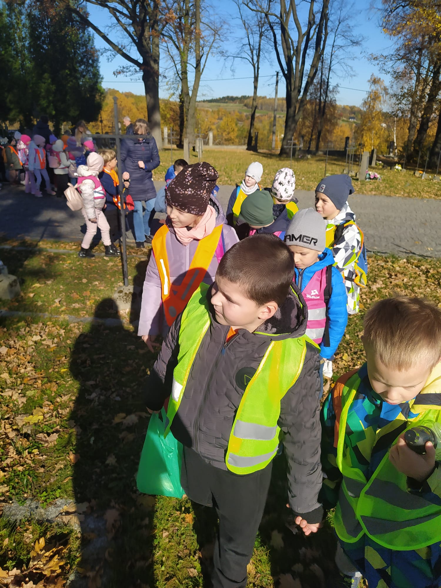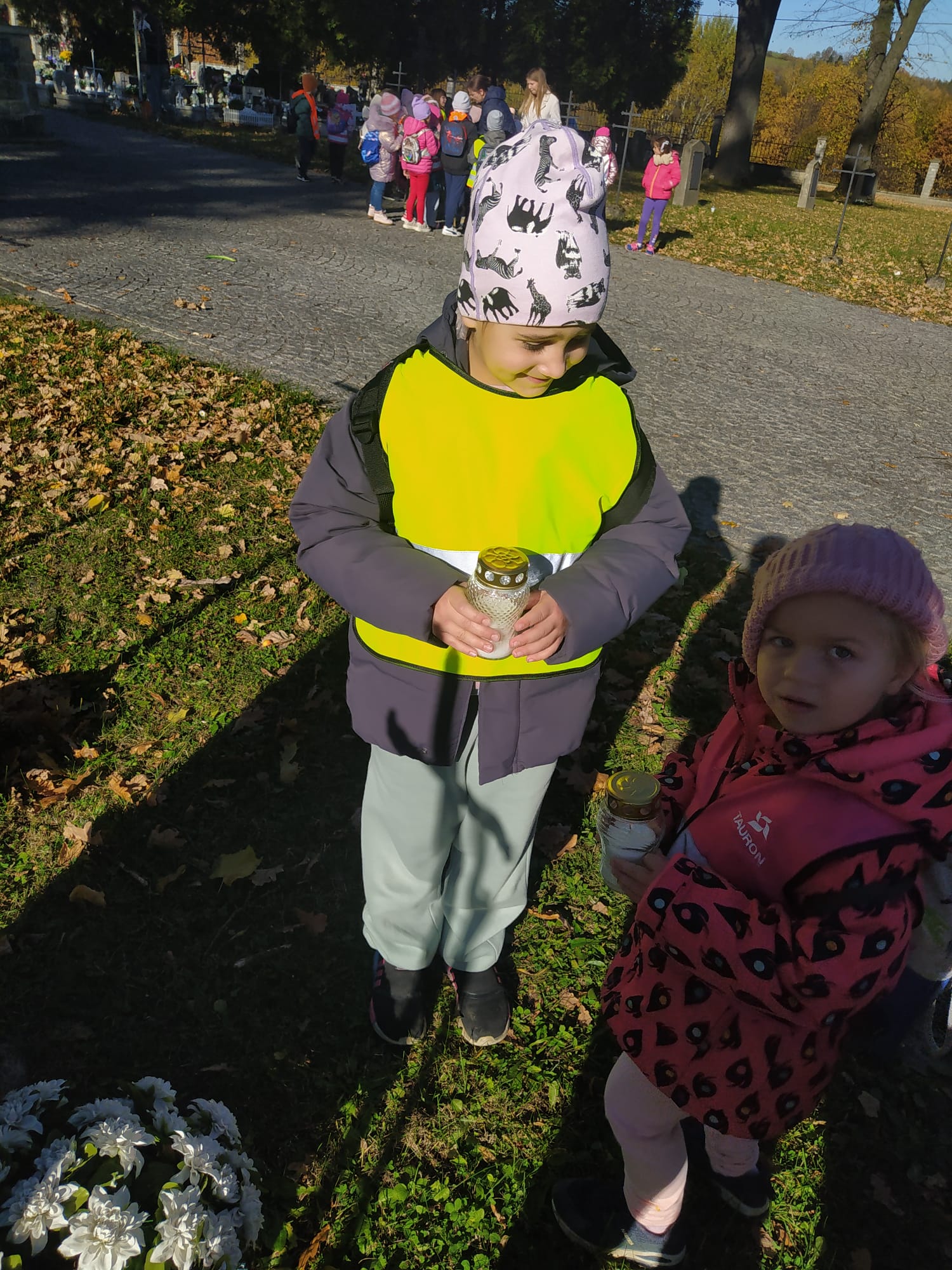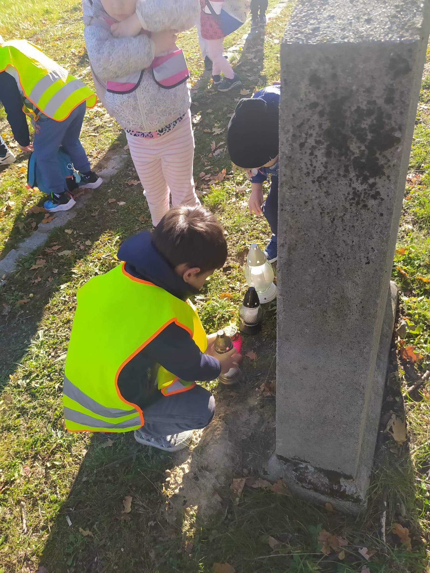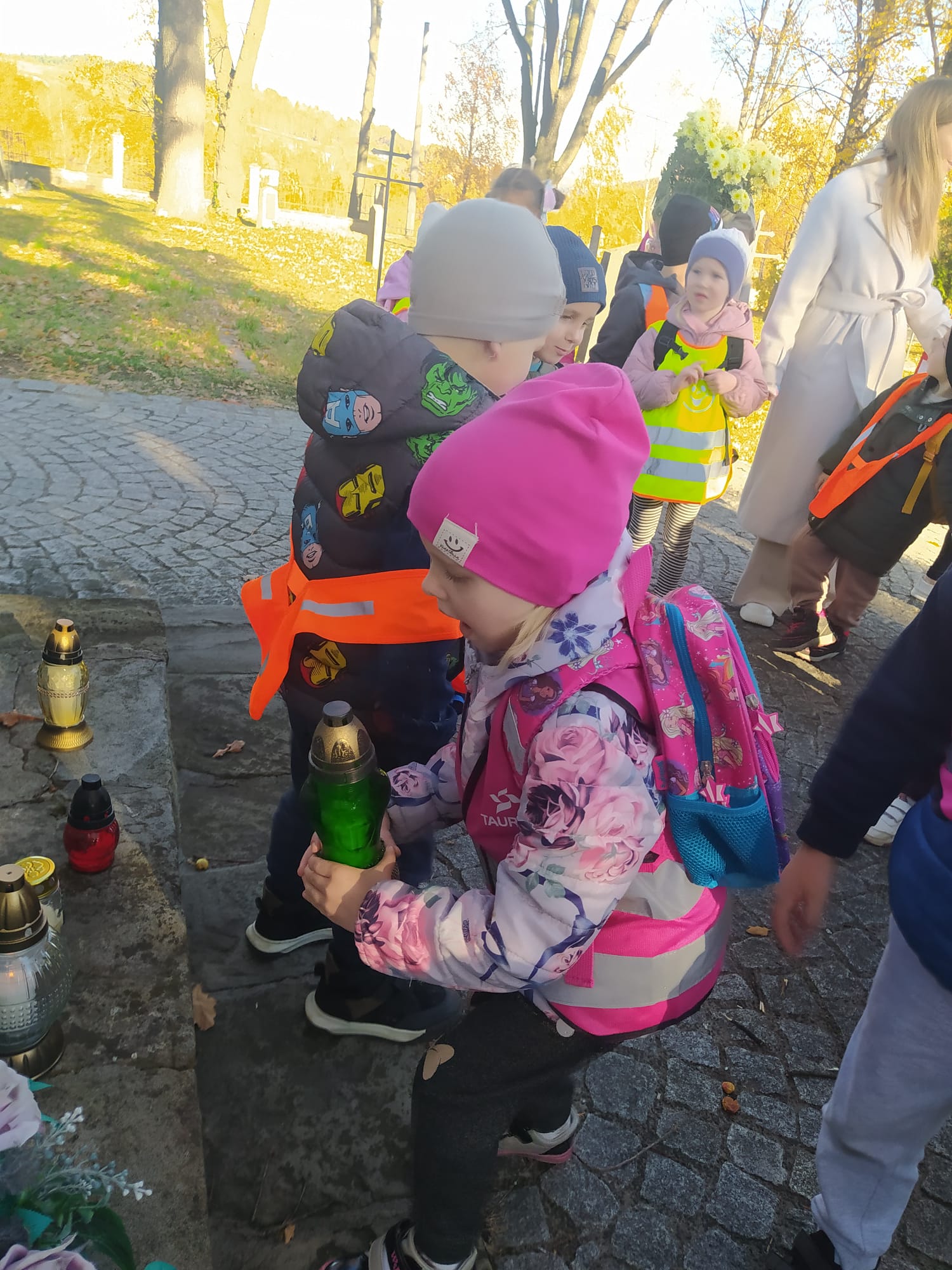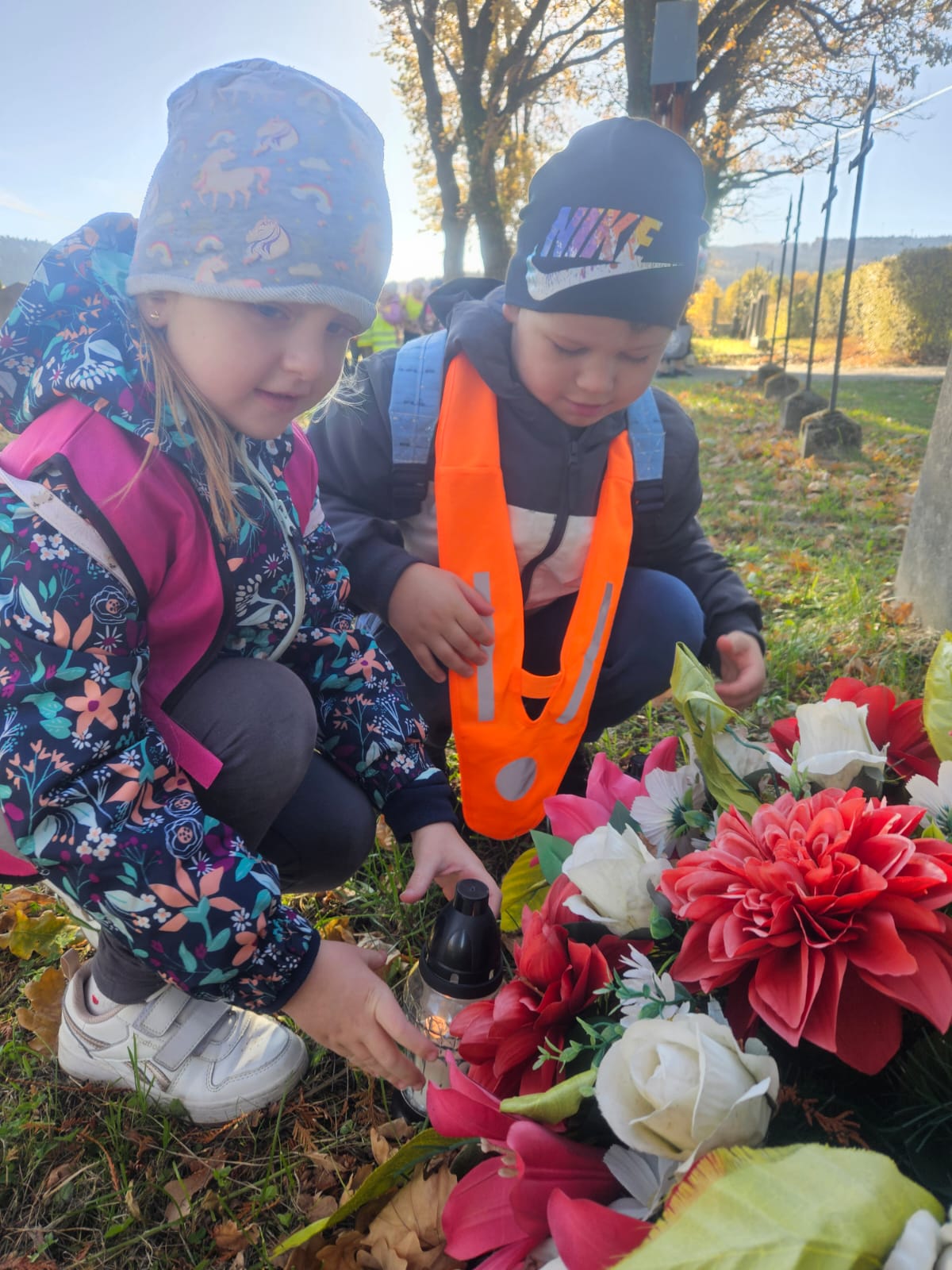 W piątek, 31 października, dzieci z grup „Motylki” i „Promyczki” udały się na pobliski cmentarz, aby uczcić pamięć zmarłych żołnierzy, którzy polegli podczas I i II wojny światowej. Podczas wizyty rozmawialiśmy z dziećmi o znaczeniu tego miejsca, o tym, dlaczego co roku wspominamy tych, którzy oddali życie za naszą Ojczyznę i jak wiele im zawdzięczamy.
