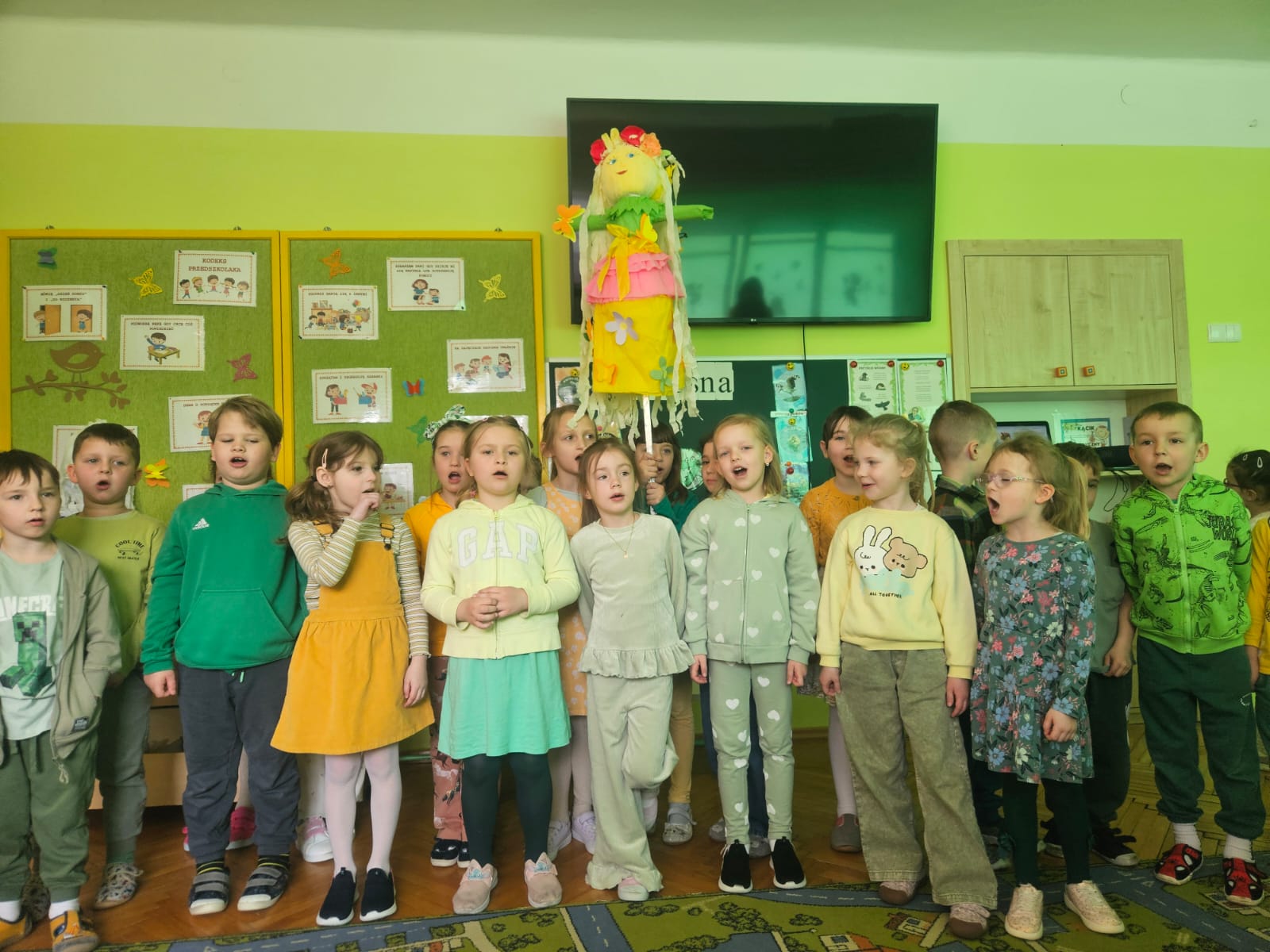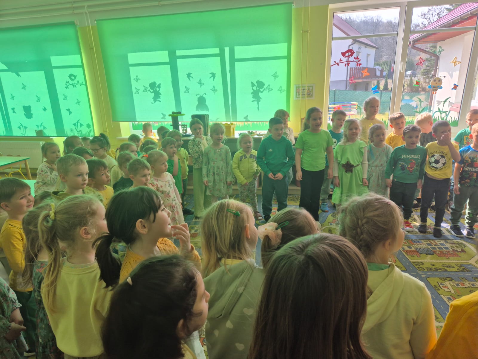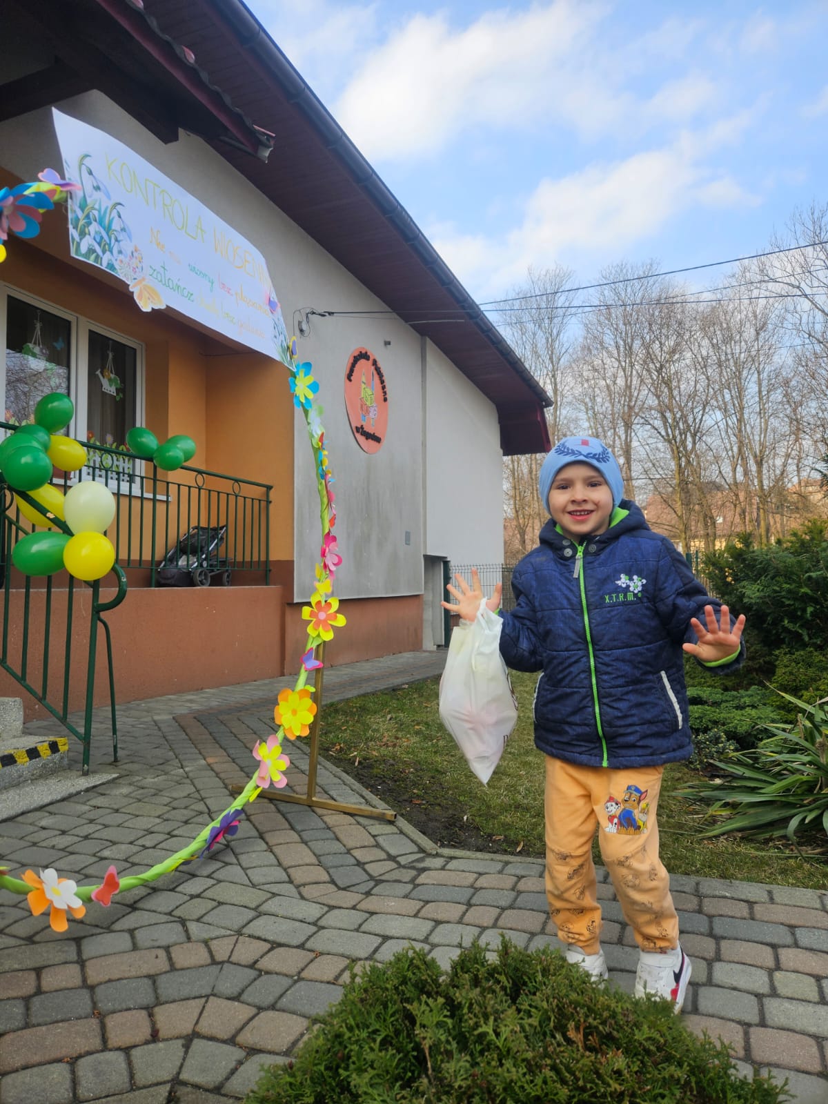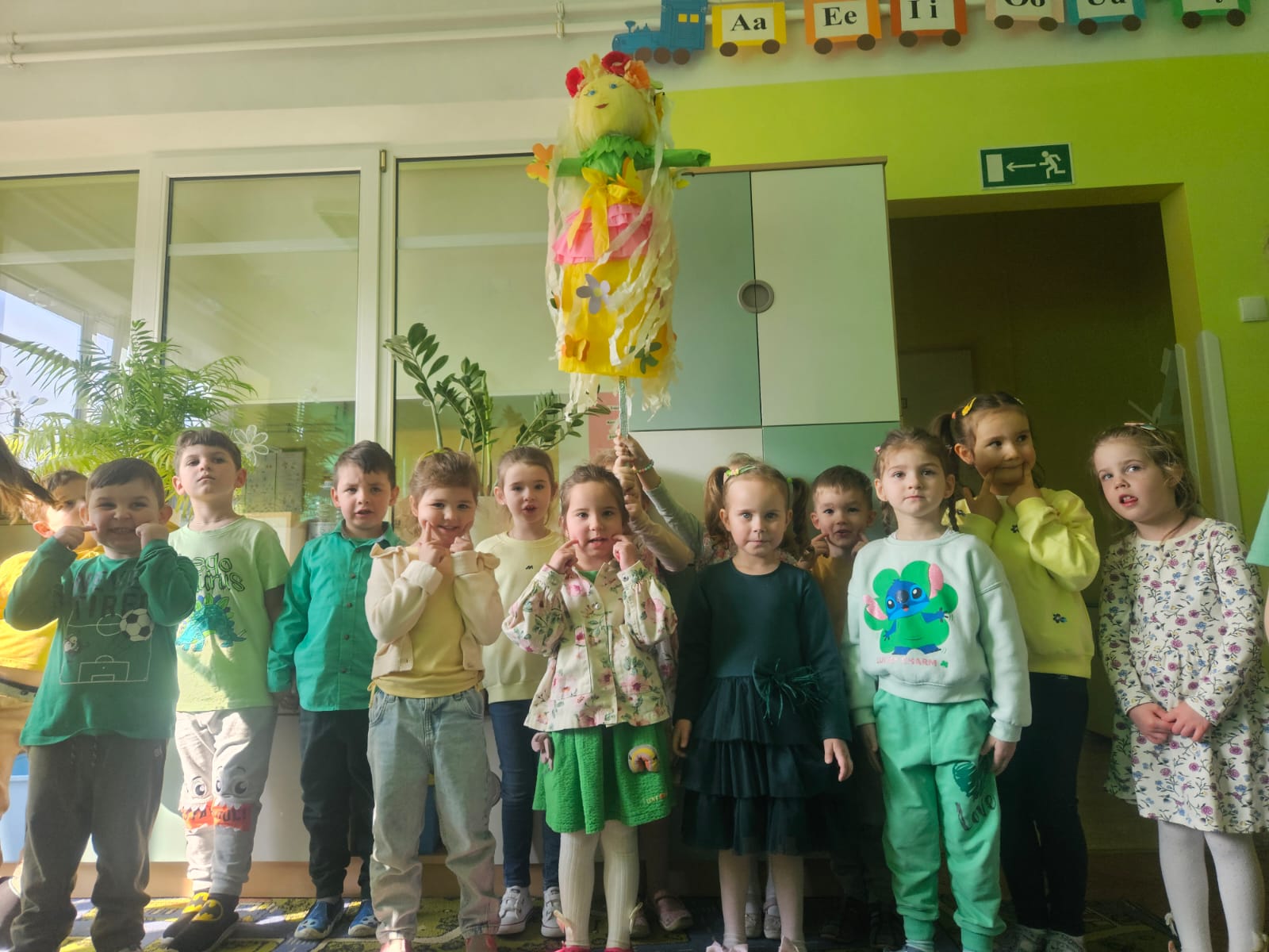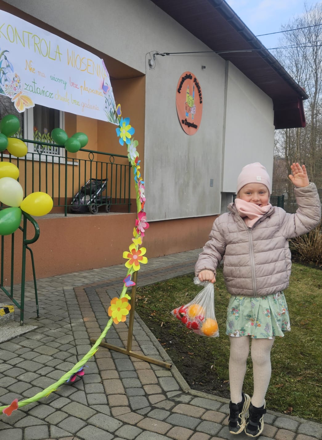 Dziś radośnie powitaliśmy długo wyczekiwaną wiosnę! Już od samego rana na dzieci czekało wyjątkowe zadanie. Przed wejściem do przedszkola, wspólnie z rodzicami, musiały wykonać polecenie: „Kontrola wiosenna – nie ma wiosny bez pląsania, zatańcz chwilę bez gadania!”. Wszyscy spisali się znakomicie i z uśmiechem rozpoczęli dzień. Następnie każda grupa zaprezentowała się, śpiewając wiosenną piosenkę oraz recytując wierszyk o wiośnie. Było kolorowo, radośnie i bardzo muzycznie! Kolejną atrakcją było wspólne przygotowanie pysznego, wiosennego soczku, który wszystkim bardzo smakował. Po nim wybraliśmy się na spacer z Marzanną oraz Panią Zimą, którą symbolicznie pożegnaliśmy, robiąc miejsce dla nowej pory roku. Nawet nasze posiłki – śniadanie, obiad i podwieczorek – miały dziś wiosenne kolory: zielony i żółty, tak jak ubrania, w które wszyscy byliśmy ubrani. Na zakończenie dnia każde dziecko otrzymało od Pani Wiosny słodki upominek – czekoladę z wiosennym wierszykiem i kwiatuszkiem. To był dzień pełen radości, zabawy i prawdziwie wiosennej atmosfery!