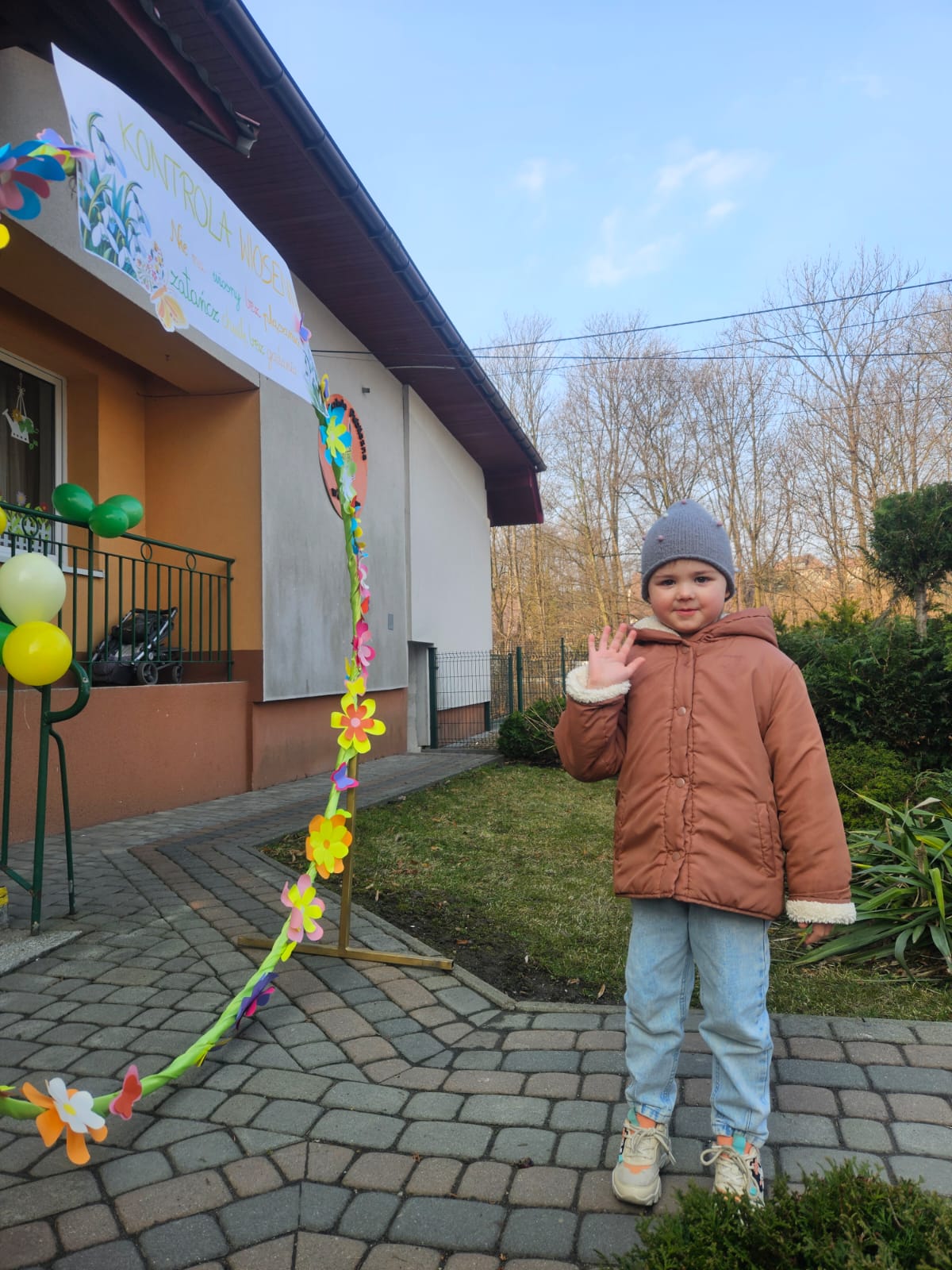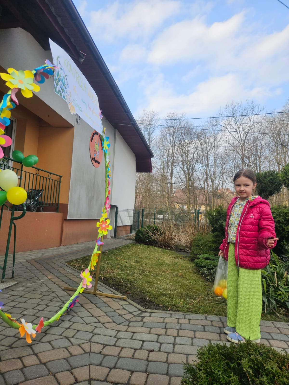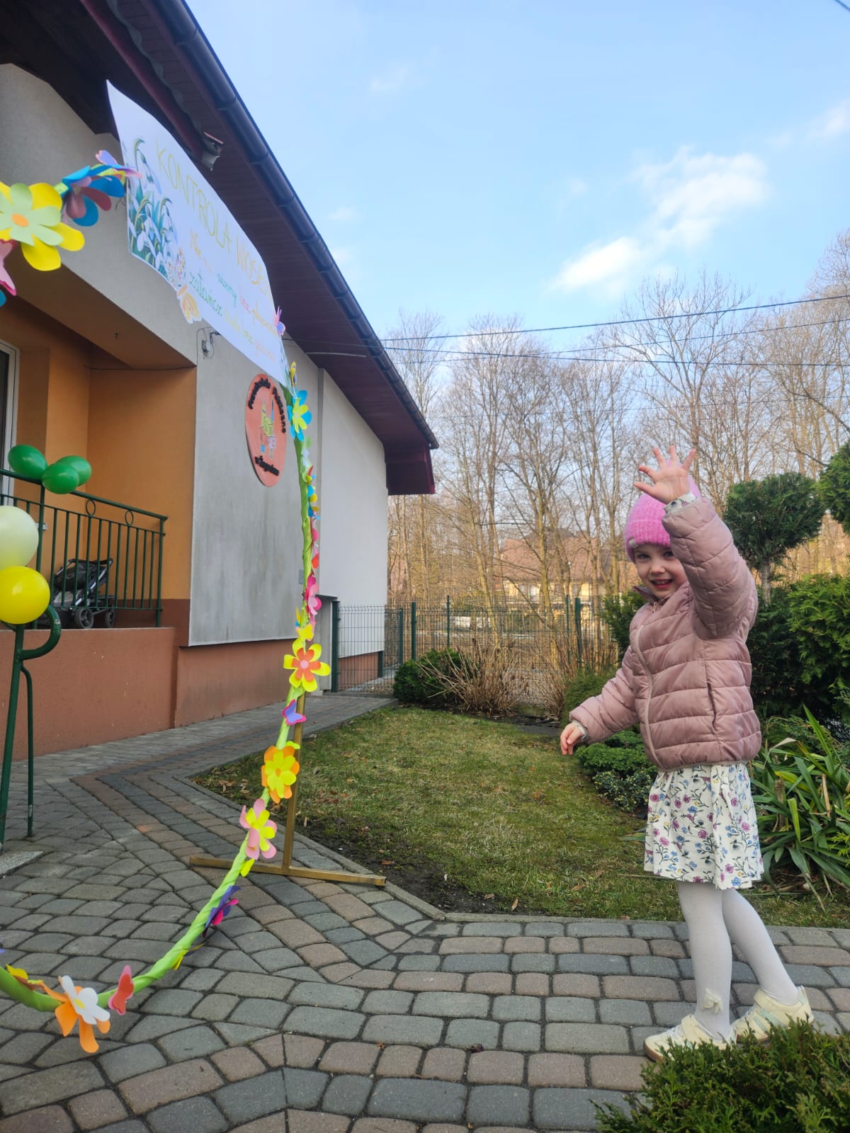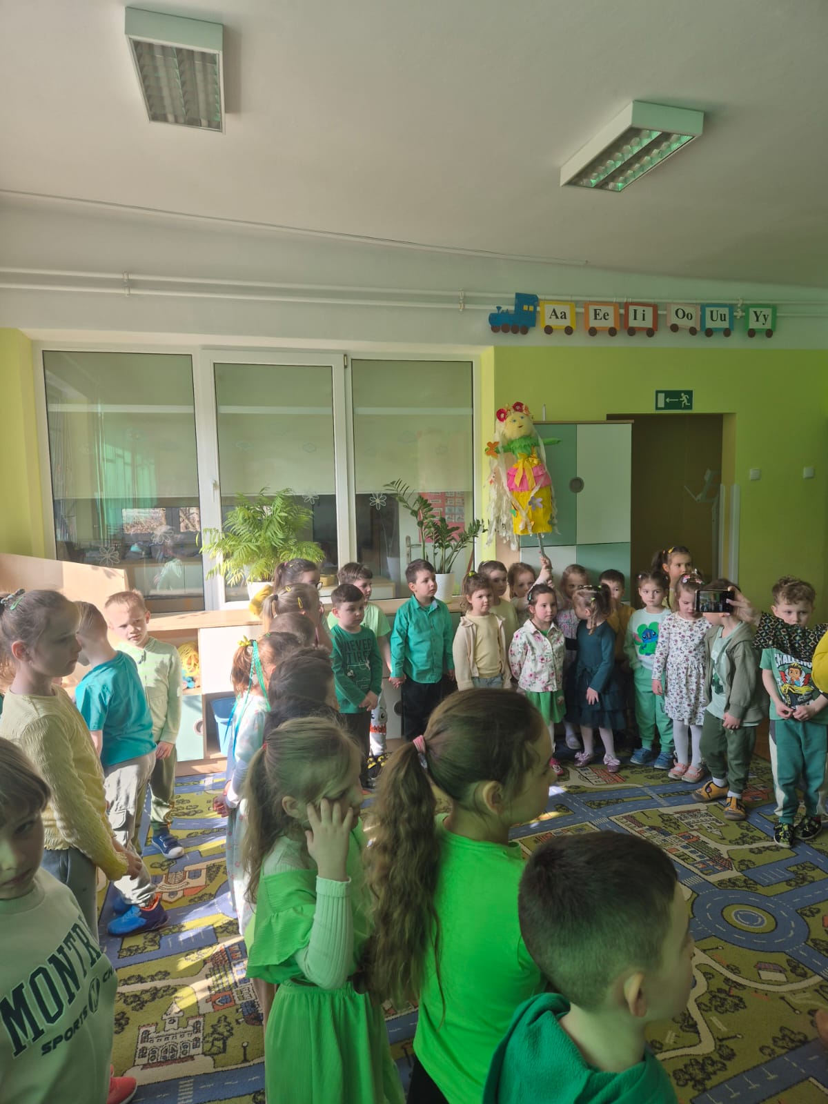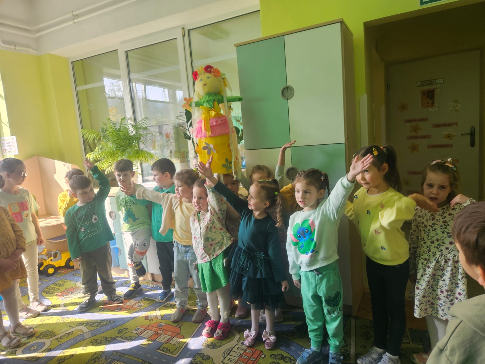 Dziś radośnie powitaliśmy długo wyczekiwaną wiosnę! Już od samego rana na dzieci czekało wyjątkowe zadanie. Przed wejściem do przedszkola, wspólnie z rodzicami, musiały wykonać polecenie: „Kontrola wiosenna – nie ma wiosny bez pląsania, zatańcz chwilę bez gadania!”. Wszyscy spisali się znakomicie i z uśmiechem rozpoczęli dzień. Następnie każda grupa zaprezentowała się, śpiewając wiosenną piosenkę oraz recytując wierszyk o wiośnie. Było kolorowo, radośnie i bardzo muzycznie! Kolejną atrakcją było wspólne przygotowanie pysznego, wiosennego soczku, który wszystkim bardzo smakował. Po nim wybraliśmy się na spacer z Marzanną oraz Panią Zimą, którą symbolicznie pożegnaliśmy, robiąc miejsce dla nowej pory roku. Nawet nasze posiłki – śniadanie, obiad i podwieczorek – miały dziś wiosenne kolory: zielony i żółty, tak jak ubrania, w które wszyscy byliśmy ubrani. Na zakończenie dnia każde dziecko otrzymało od Pani Wiosny słodki upominek – czekoladę z wiosennym wierszykiem i kwiatuszkiem. To był dzień pełen radości, zabawy i prawdziwie wiosennej atmosfery!