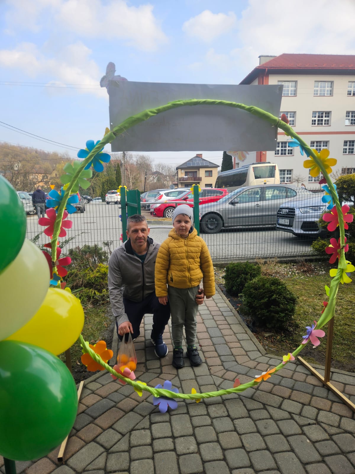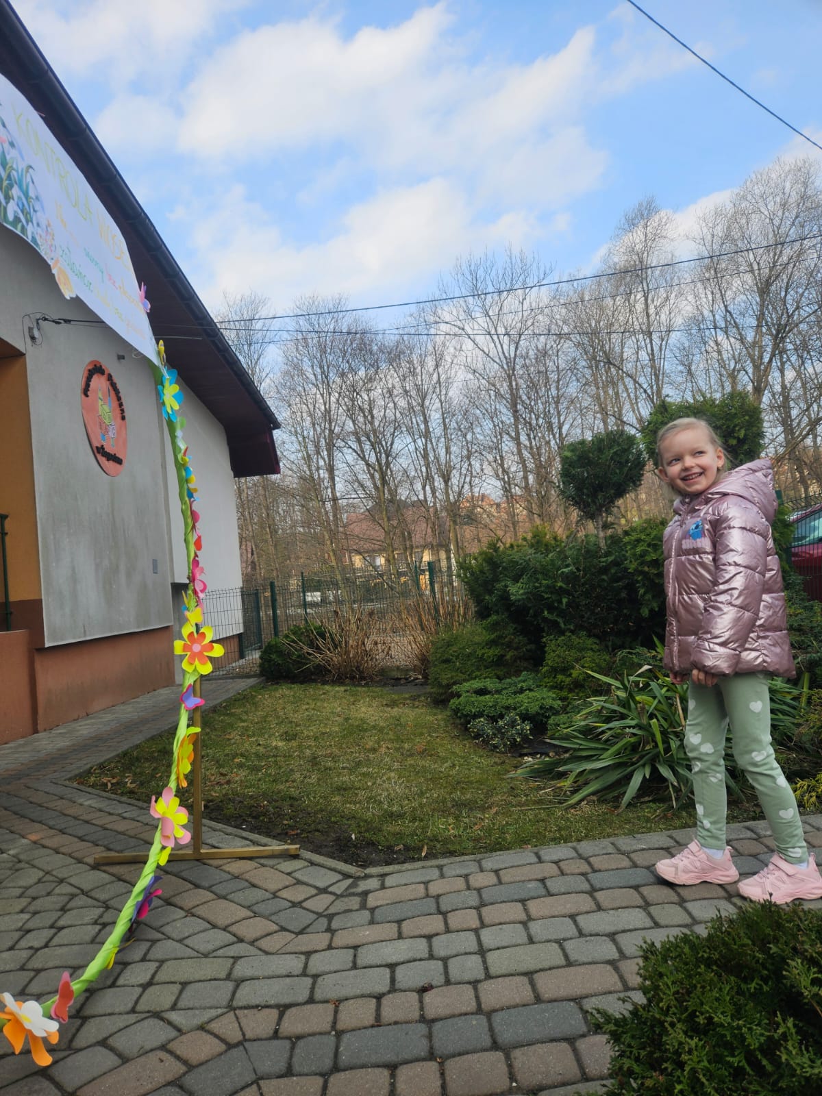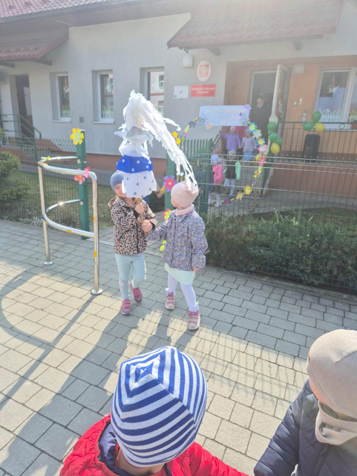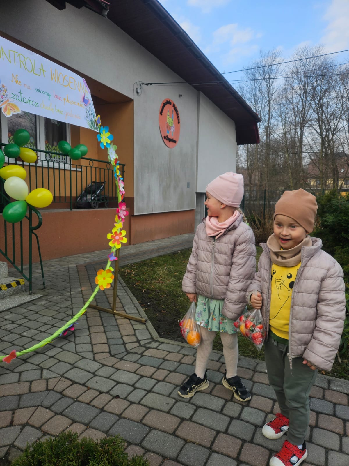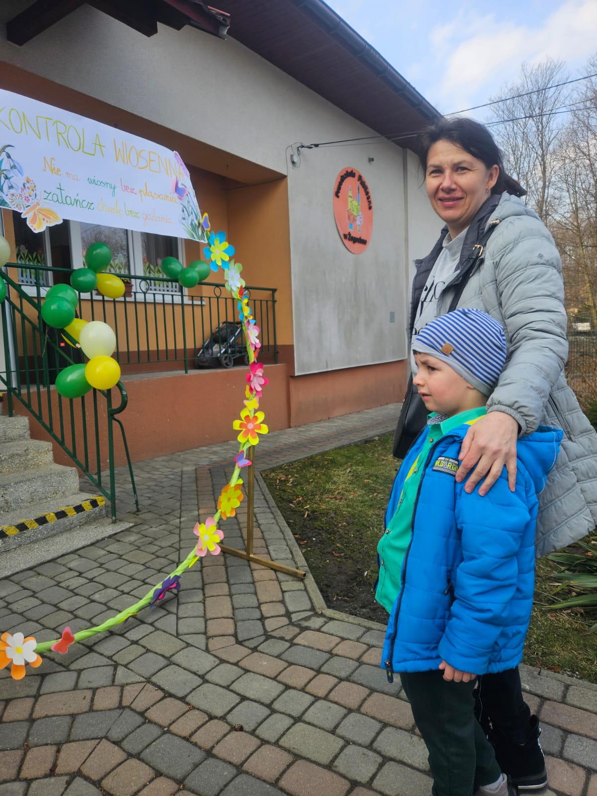 Dziś radośnie powitaliśmy długo wyczekiwaną wiosnę! Już od samego rana na dzieci czekało wyjątkowe zadanie. Przed wejściem do przedszkola, wspólnie z rodzicami, musiały wykonać polecenie: „Kontrola wiosenna – nie ma wiosny bez pląsania, zatańcz chwilę bez gadania!”. Wszyscy spisali się znakomicie i z uśmiechem rozpoczęli dzień. Następnie każda grupa zaprezentowała się, śpiewając wiosenną piosenkę oraz recytując wierszyk o wiośnie. Było kolorowo, radośnie i bardzo muzycznie! Kolejną atrakcją było wspólne przygotowanie pysznego, wiosennego soczku, który wszystkim bardzo smakował. Po nim wybraliśmy się na spacer z Marzanną oraz Panią Zimą, którą symbolicznie pożegnaliśmy, robiąc miejsce dla nowej pory roku. Nawet nasze posiłki – śniadanie, obiad i podwieczorek – miały dziś wiosenne kolory: zielony i żółty, tak jak ubrania, w które wszyscy byliśmy ubrani. Na zakończenie dnia każde dziecko otrzymało od Pani Wiosny słodki upominek – czekoladę z wiosennym wierszykiem i kwiatuszkiem. To był dzień pełen radości, zabawy i prawdziwie wiosennej atmosfery!