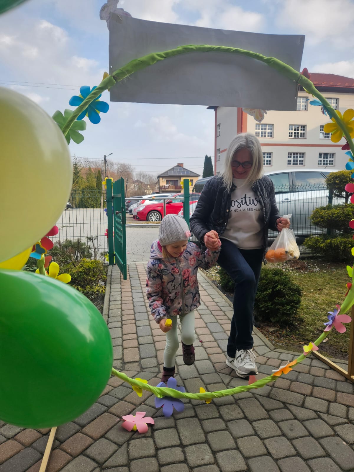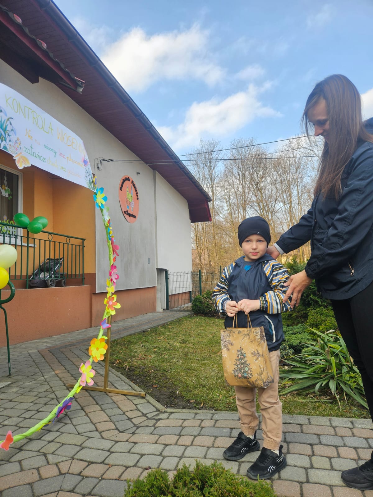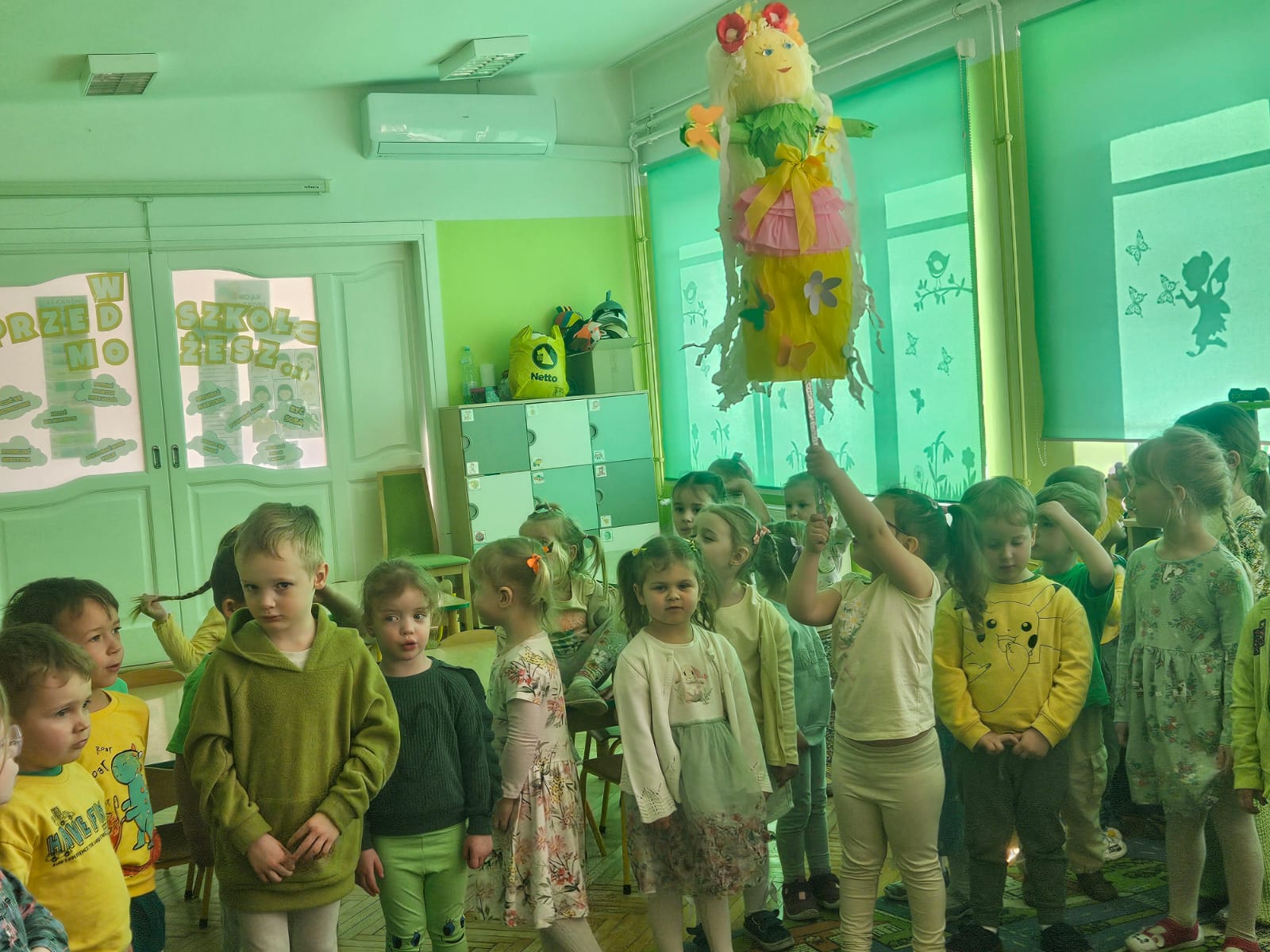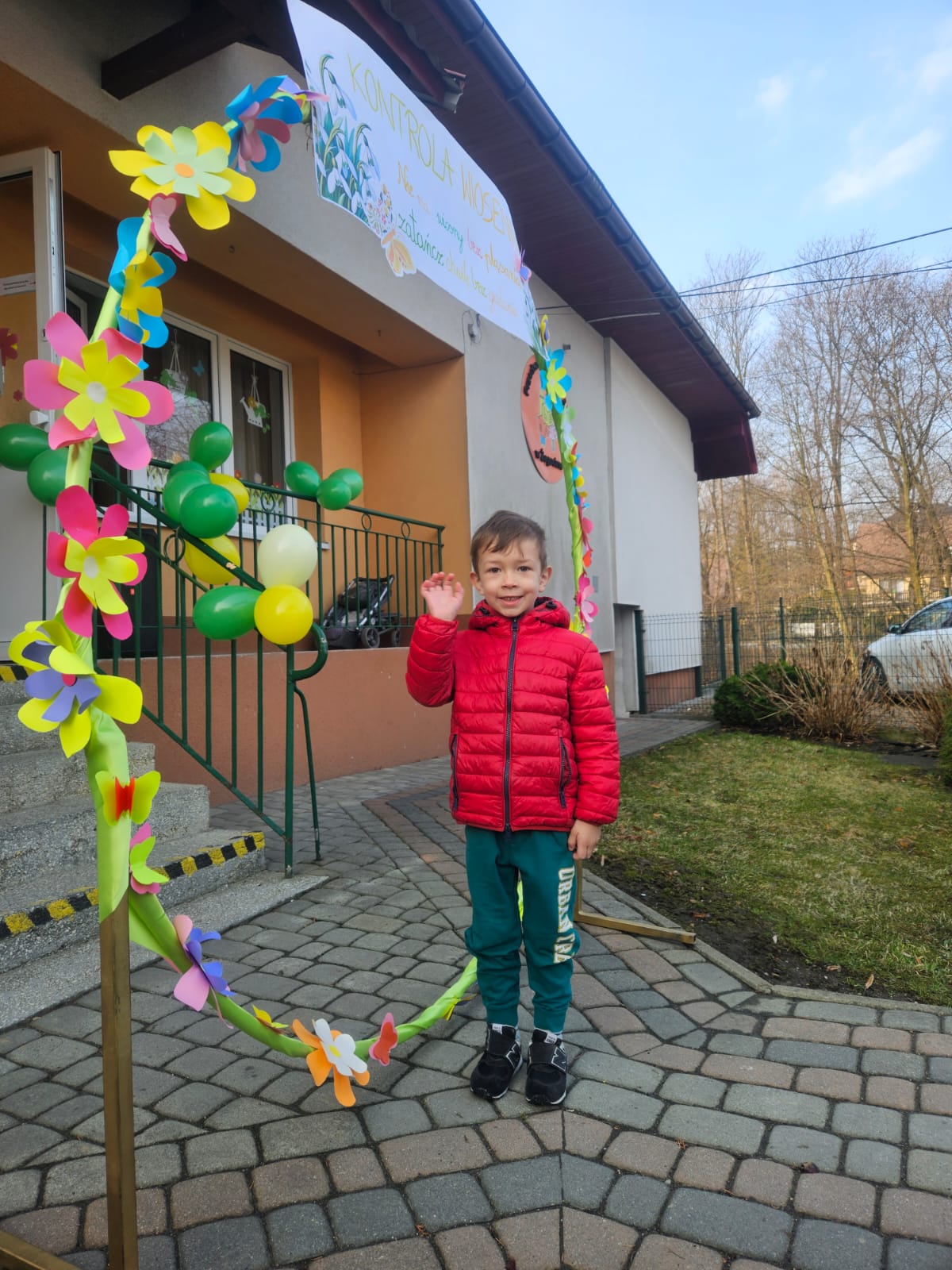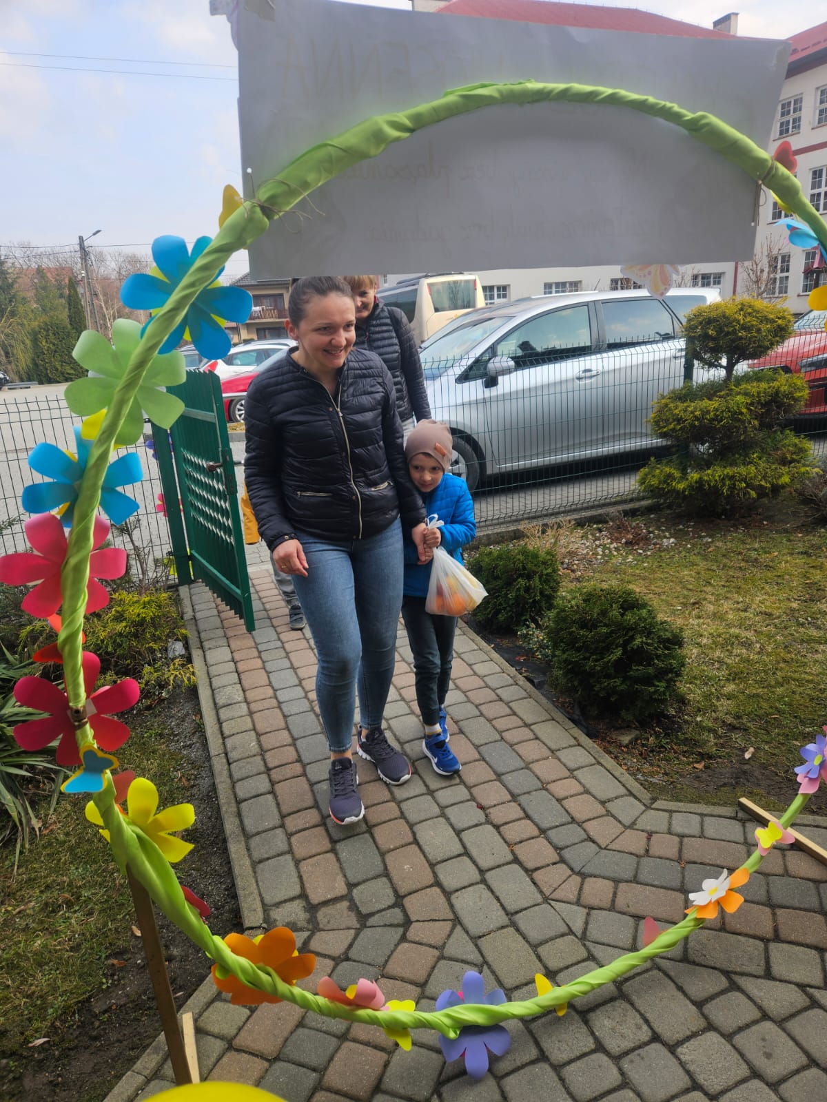 Dziś radośnie powitaliśmy długo wyczekiwaną wiosnę! Już od samego rana na dzieci czekało wyjątkowe zadanie. Przed wejściem do przedszkola, wspólnie z rodzicami, musiały wykonać polecenie: „Kontrola wiosenna – nie ma wiosny bez pląsania, zatańcz chwilę bez gadania!”. Wszyscy spisali się znakomicie i z uśmiechem rozpoczęli dzień. Następnie każda grupa zaprezentowała się, śpiewając wiosenną piosenkę oraz recytując wierszyk o wiośnie. Było kolorowo, radośnie i bardzo muzycznie! Kolejną atrakcją było wspólne przygotowanie pysznego, wiosennego soczku, który wszystkim bardzo smakował. Po nim wybraliśmy się na spacer z Marzanną oraz Panią Zimą, którą symbolicznie pożegnaliśmy, robiąc miejsce dla nowej pory roku. Nawet nasze posiłki – śniadanie, obiad i podwieczorek – miały dziś wiosenne kolory: zielony i żółty, tak jak ubrania, w które wszyscy byliśmy ubrani. Na zakończenie dnia każde dziecko otrzymało od Pani Wiosny słodki upominek – czekoladę z wiosennym wierszykiem i kwiatuszkiem. To był dzień pełen radości, zabawy i prawdziwie wiosennej atmosfery!