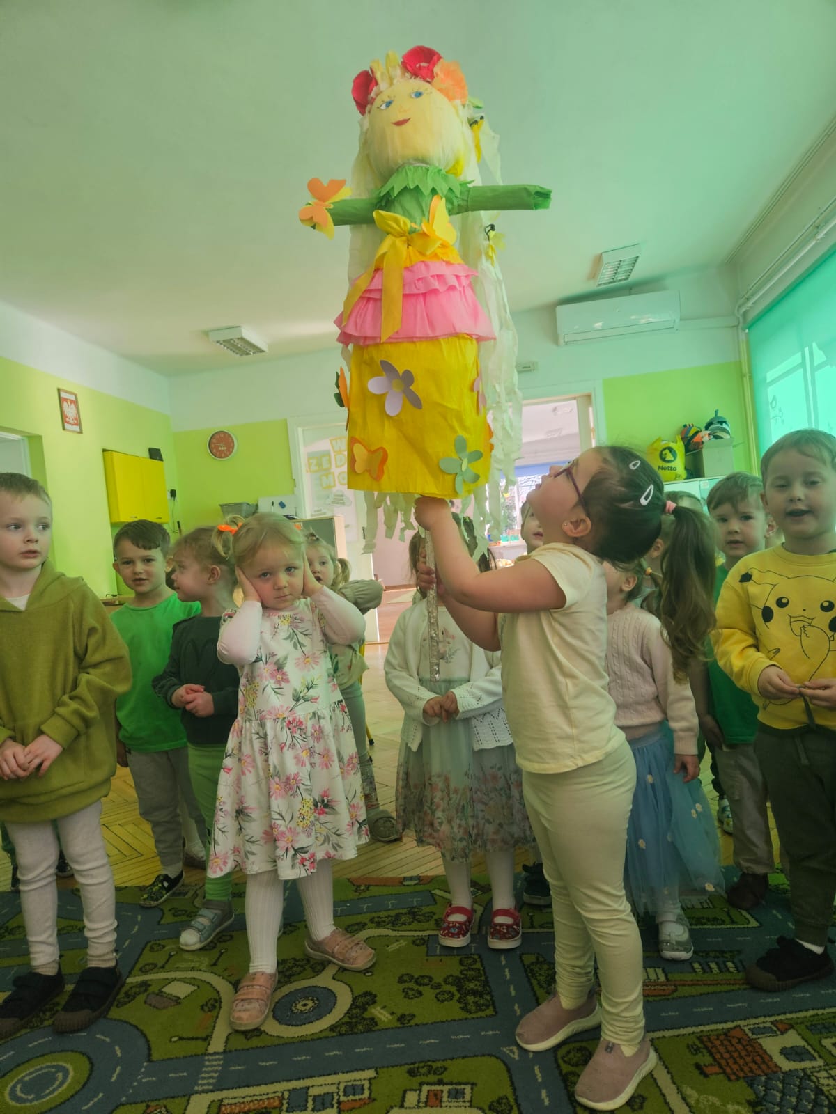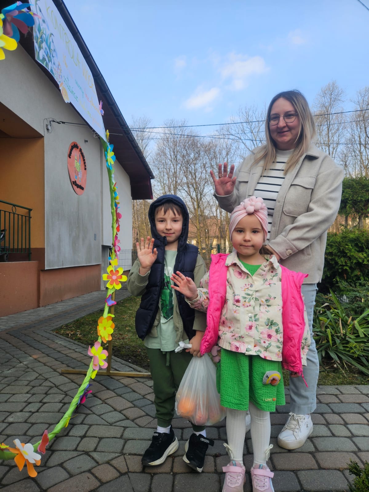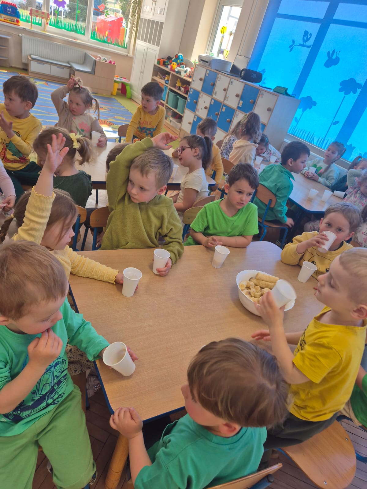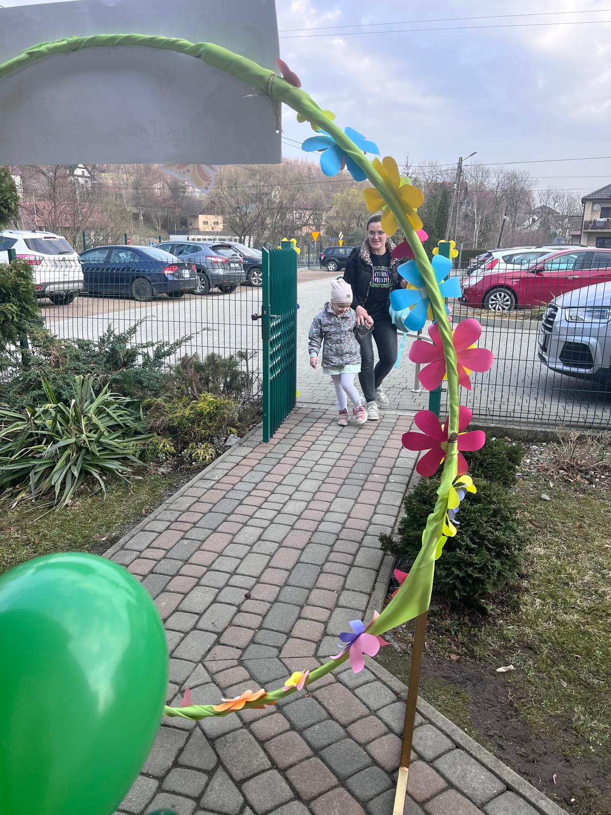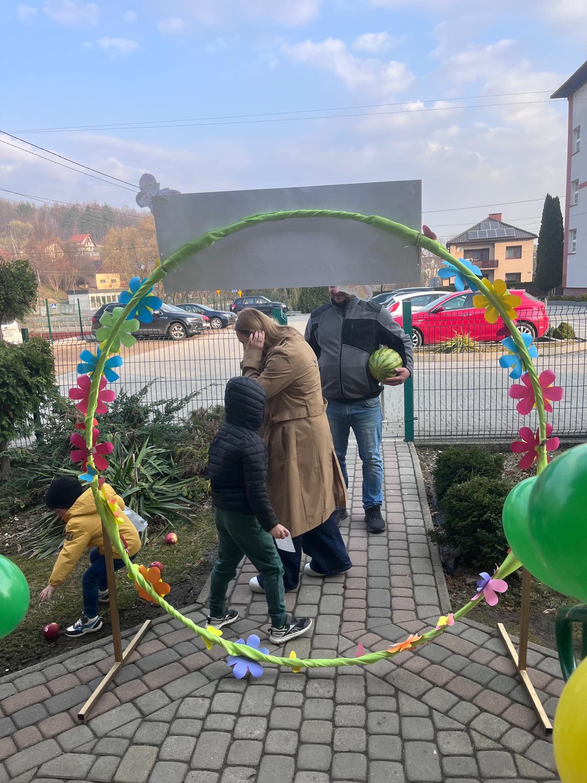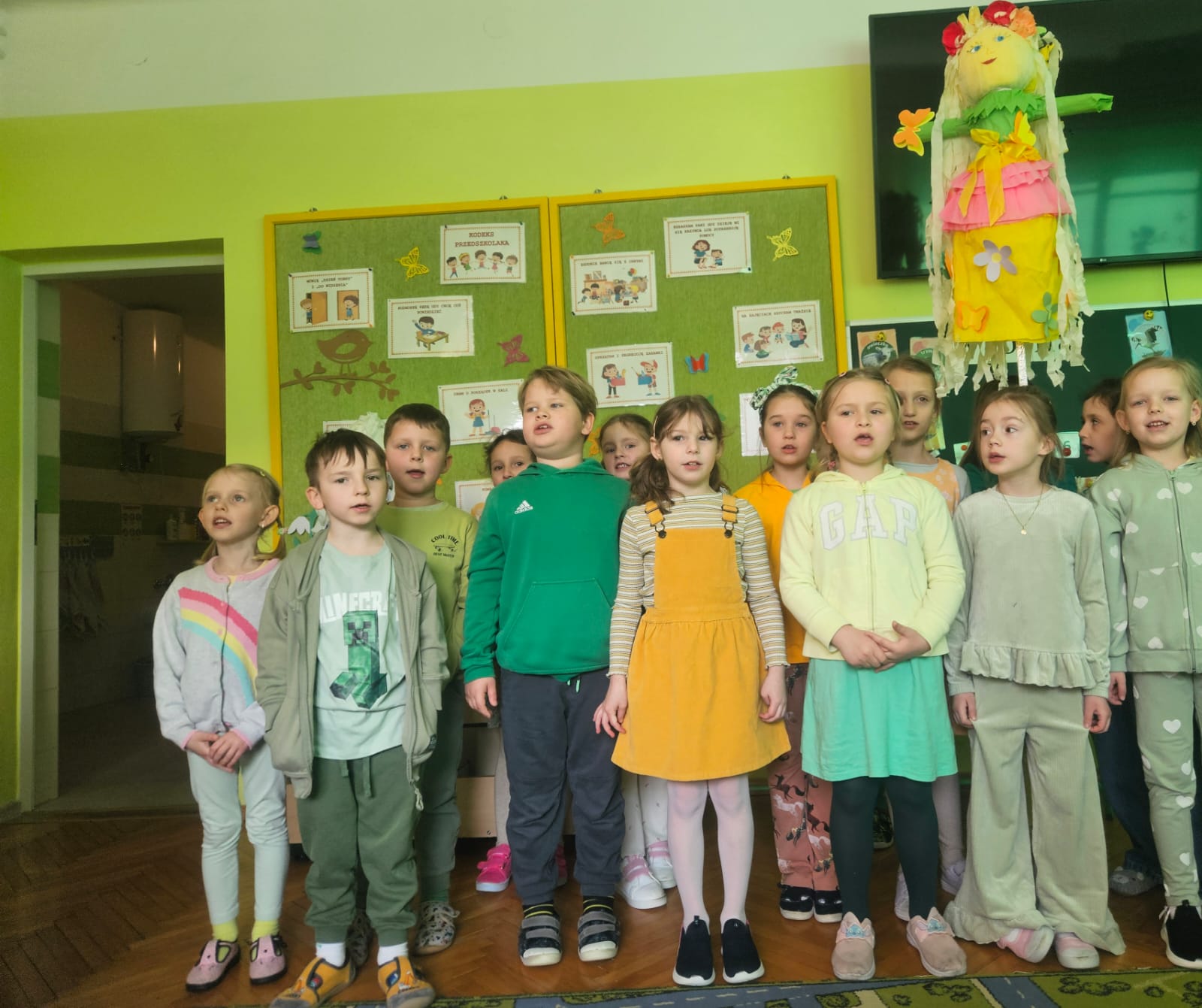 Dziś radośnie powitaliśmy długo wyczekiwaną wiosnę! Już od samego rana na dzieci czekało wyjątkowe zadanie. Przed wejściem do przedszkola, wspólnie z rodzicami, musiały wykonać polecenie: „Kontrola wiosenna – nie ma wiosny bez pląsania, zatańcz chwilę bez gadania!”. Wszyscy spisali się znakomicie i z uśmiechem rozpoczęli dzień. Następnie każda grupa zaprezentowała się, śpiewając wiosenną piosenkę oraz recytując wierszyk o wiośnie. Było kolorowo, radośnie i bardzo muzycznie! Kolejną atrakcją było wspólne przygotowanie pysznego, wiosennego soczku, który wszystkim bardzo smakował. Po nim wybraliśmy się na spacer z Marzanną oraz Panią Zimą, którą symbolicznie pożegnaliśmy, robiąc miejsce dla nowej pory roku. Nawet nasze posiłki – śniadanie, obiad i podwieczorek – miały dziś wiosenne kolory: zielony i żółty, tak jak ubrania, w które wszyscy byliśmy ubrani. Na zakończenie dnia każde dziecko otrzymało od Pani Wiosny słodki upominek – czekoladę z wiosennym wierszykiem i kwiatuszkiem. To był dzień pełen radości, zabawy i prawdziwie wiosennej atmosfery!