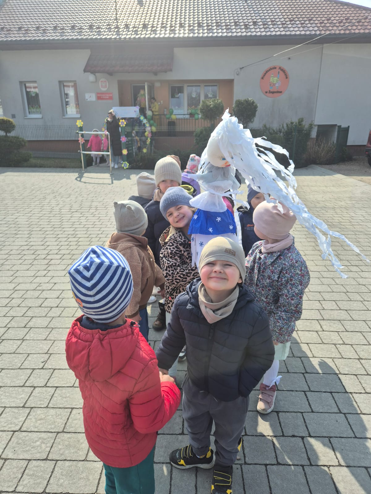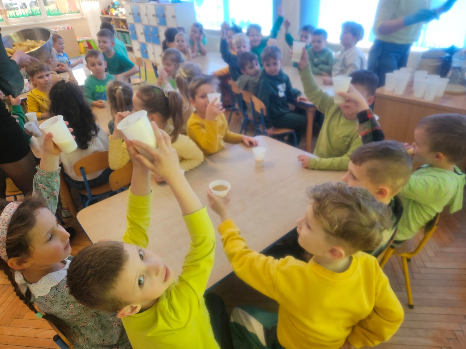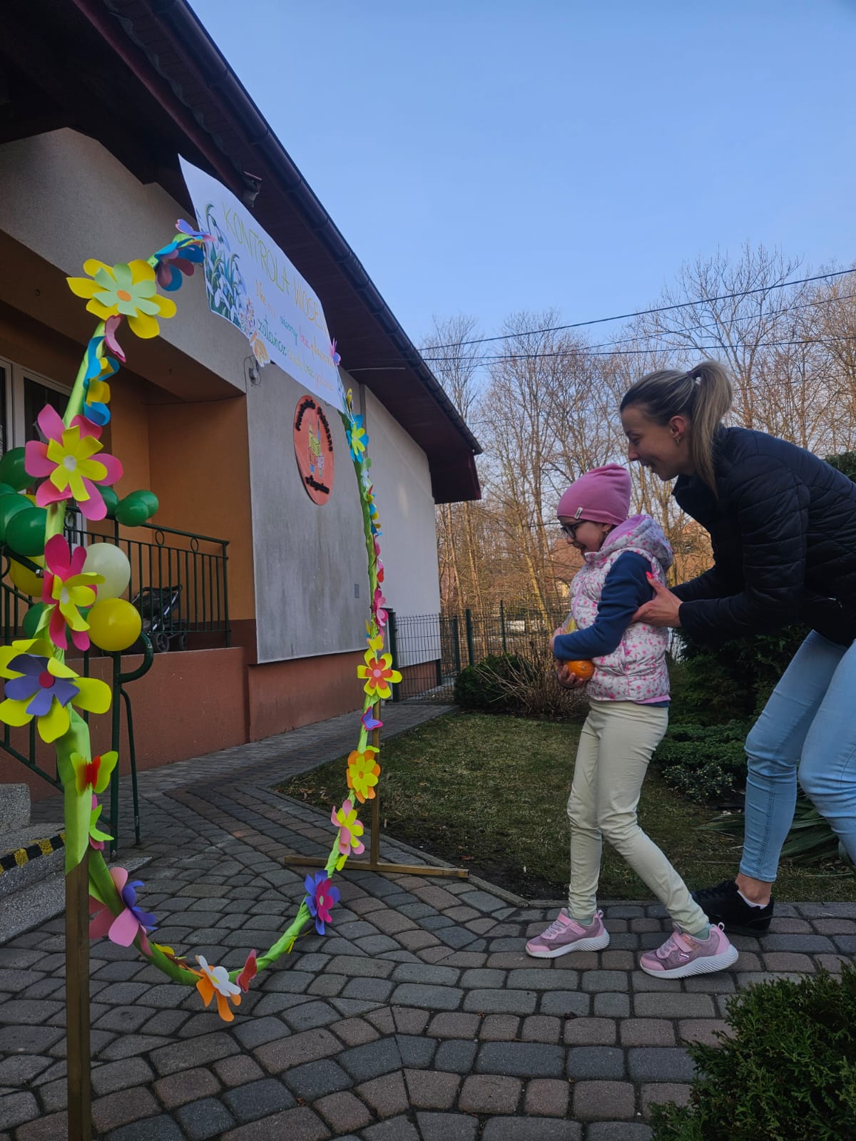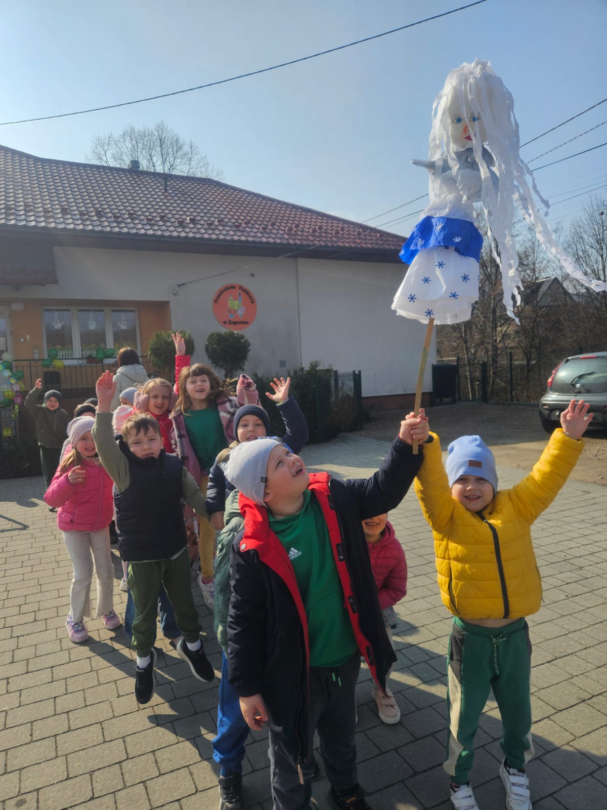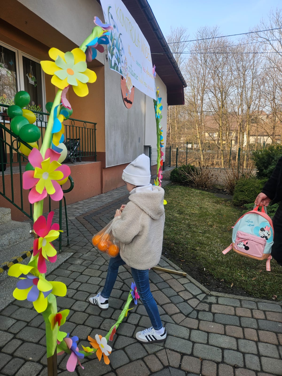 Dziś radośnie powitaliśmy długo wyczekiwaną wiosnę! Już od samego rana na dzieci czekało wyjątkowe zadanie. Przed wejściem do przedszkola, wspólnie z rodzicami, musiały wykonać polecenie: „Kontrola wiosenna – nie ma wiosny bez pląsania, zatańcz chwilę bez gadania!”. Wszyscy spisali się znakomicie i z uśmiechem rozpoczęli dzień. Następnie każda grupa zaprezentowała się, śpiewając wiosenną piosenkę oraz recytując wierszyk o wiośnie. Było kolorowo, radośnie i bardzo muzycznie! Kolejną atrakcją było wspólne przygotowanie pysznego, wiosennego soczku, który wszystkim bardzo smakował. Po nim wybraliśmy się na spacer z Marzanną oraz Panią Zimą, którą symbolicznie pożegnaliśmy, robiąc miejsce dla nowej pory roku. Nawet nasze posiłki – śniadanie, obiad i podwieczorek – miały dziś wiosenne kolory: zielony i żółty, tak jak ubrania, w które wszyscy byliśmy ubrani. Na zakończenie dnia każde dziecko otrzymało od Pani Wiosny słodki upominek – czekoladę z wiosennym wierszykiem i kwiatuszkiem. To był dzień pełen radości, zabawy i prawdziwie wiosennej atmosfery!