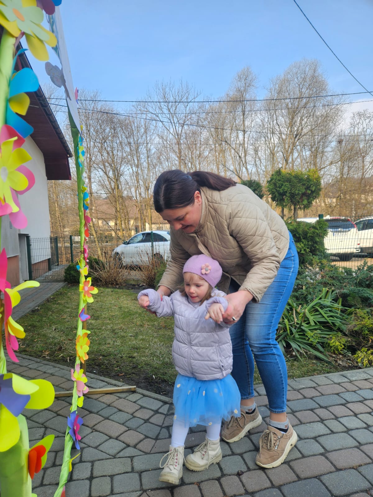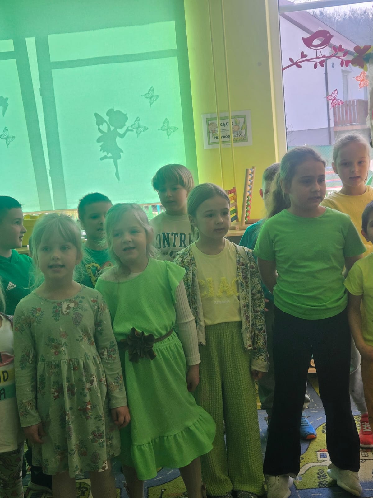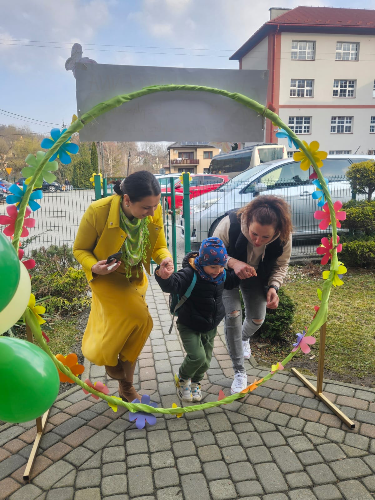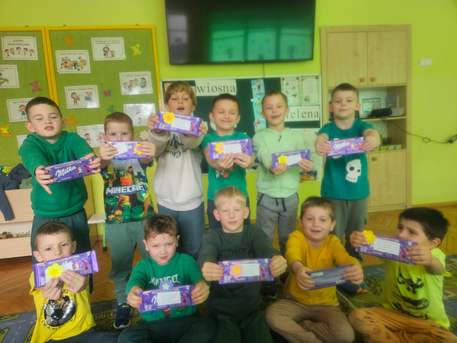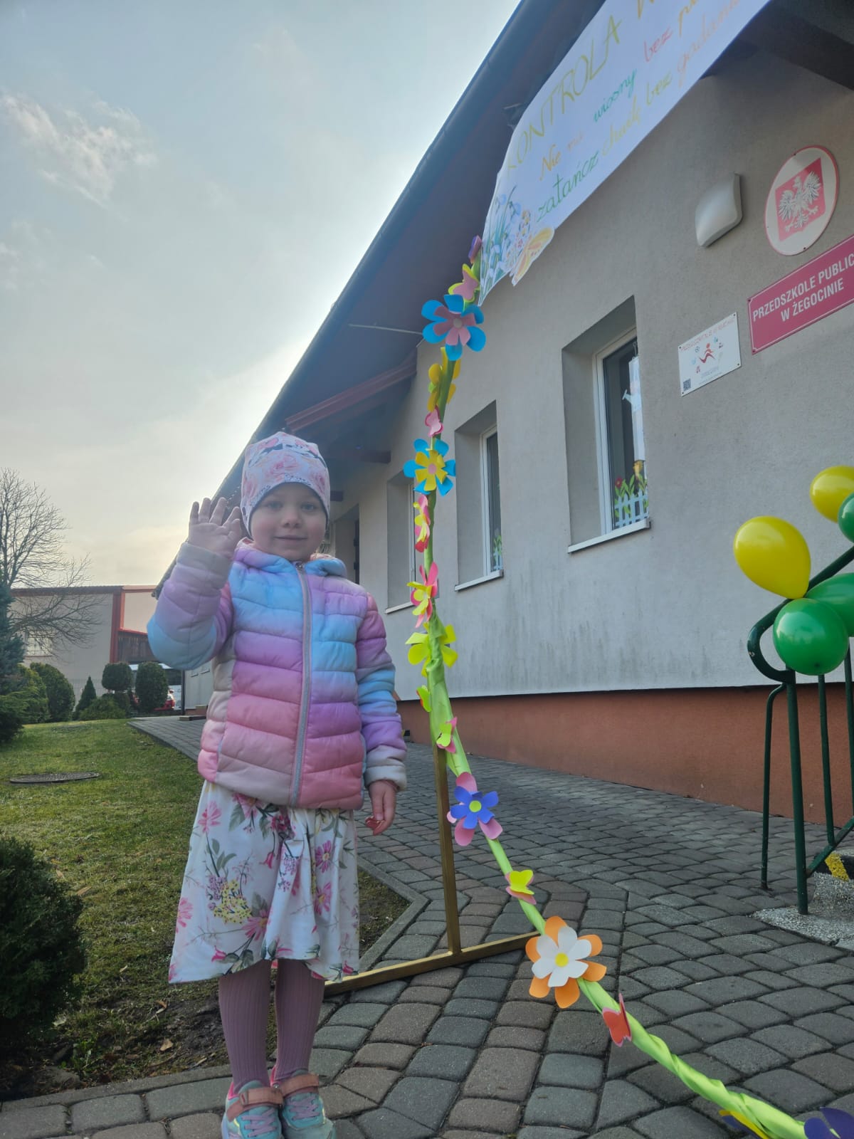 Dziś radośnie powitaliśmy długo wyczekiwaną wiosnę! Już od samego rana na dzieci czekało wyjątkowe zadanie. Przed wejściem do przedszkola, wspólnie z rodzicami, musiały wykonać polecenie: „Kontrola wiosenna – nie ma wiosny bez pląsania, zatańcz chwilę bez gadania!”. Wszyscy spisali się znakomicie i z uśmiechem rozpoczęli dzień. Następnie każda grupa zaprezentowała się, śpiewając wiosenną piosenkę oraz recytując wierszyk o wiośnie. Było kolorowo, radośnie i bardzo muzycznie! Kolejną atrakcją było wspólne przygotowanie pysznego, wiosennego soczku, który wszystkim bardzo smakował. Po nim wybraliśmy się na spacer z Marzanną oraz Panią Zimą, którą symbolicznie pożegnaliśmy, robiąc miejsce dla nowej pory roku. Nawet nasze posiłki – śniadanie, obiad i podwieczorek – miały dziś wiosenne kolory: zielony i żółty, tak jak ubrania, w które wszyscy byliśmy ubrani. Na zakończenie dnia każde dziecko otrzymało od Pani Wiosny słodki upominek – czekoladę z wiosennym wierszykiem i kwiatuszkiem. To był dzień pełen radości, zabawy i prawdziwie wiosennej atmosfery!