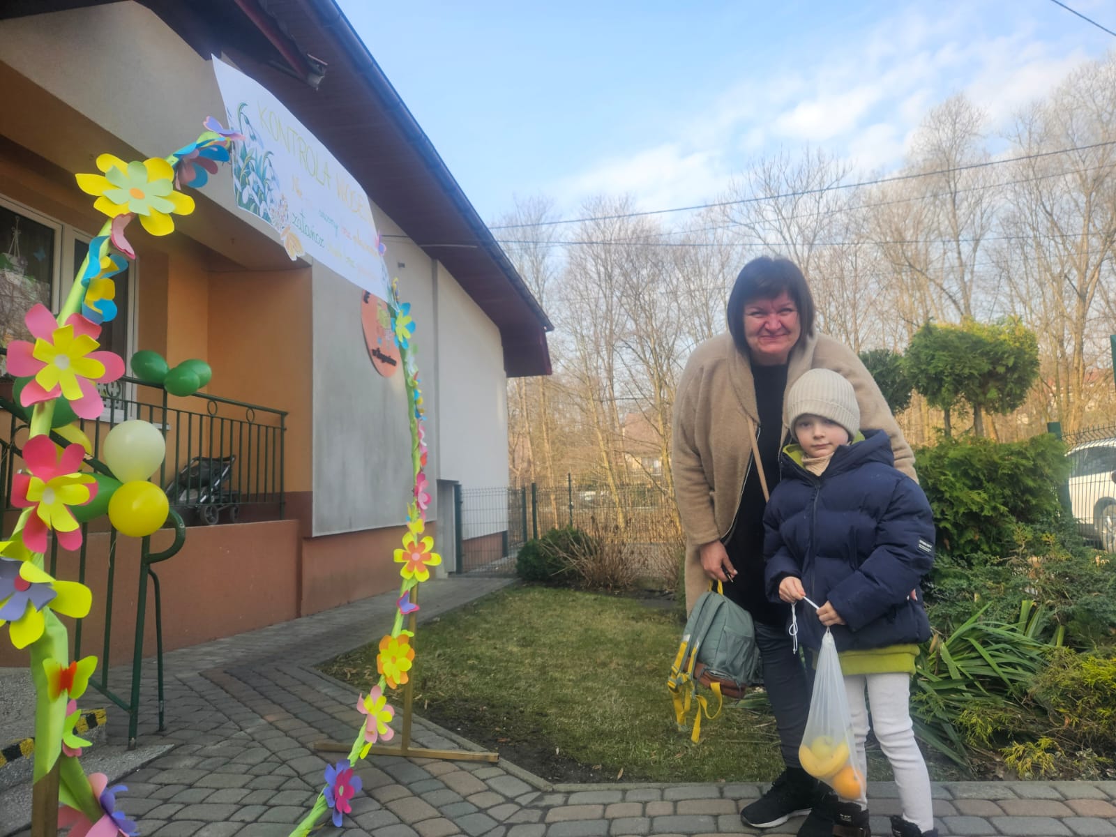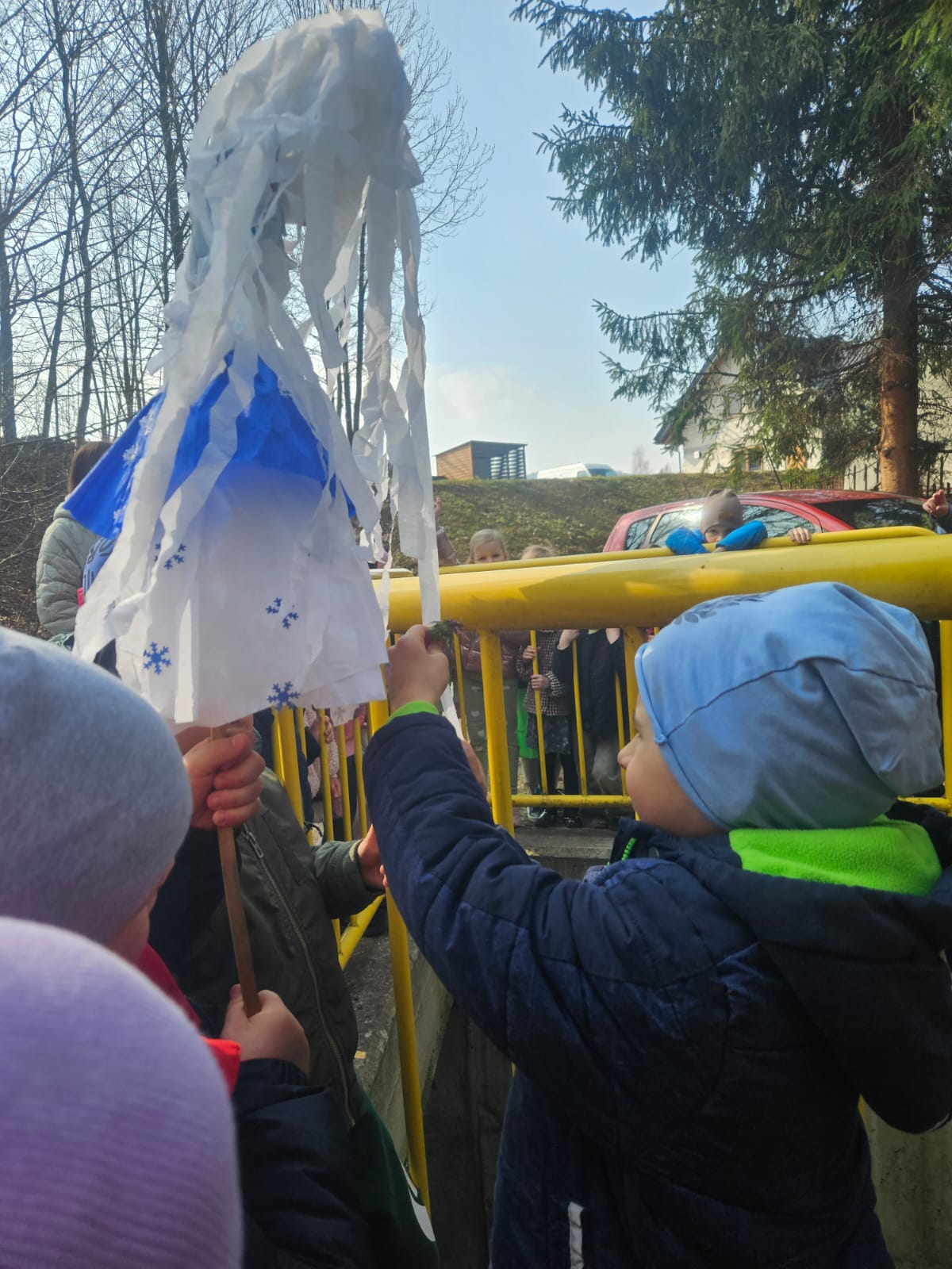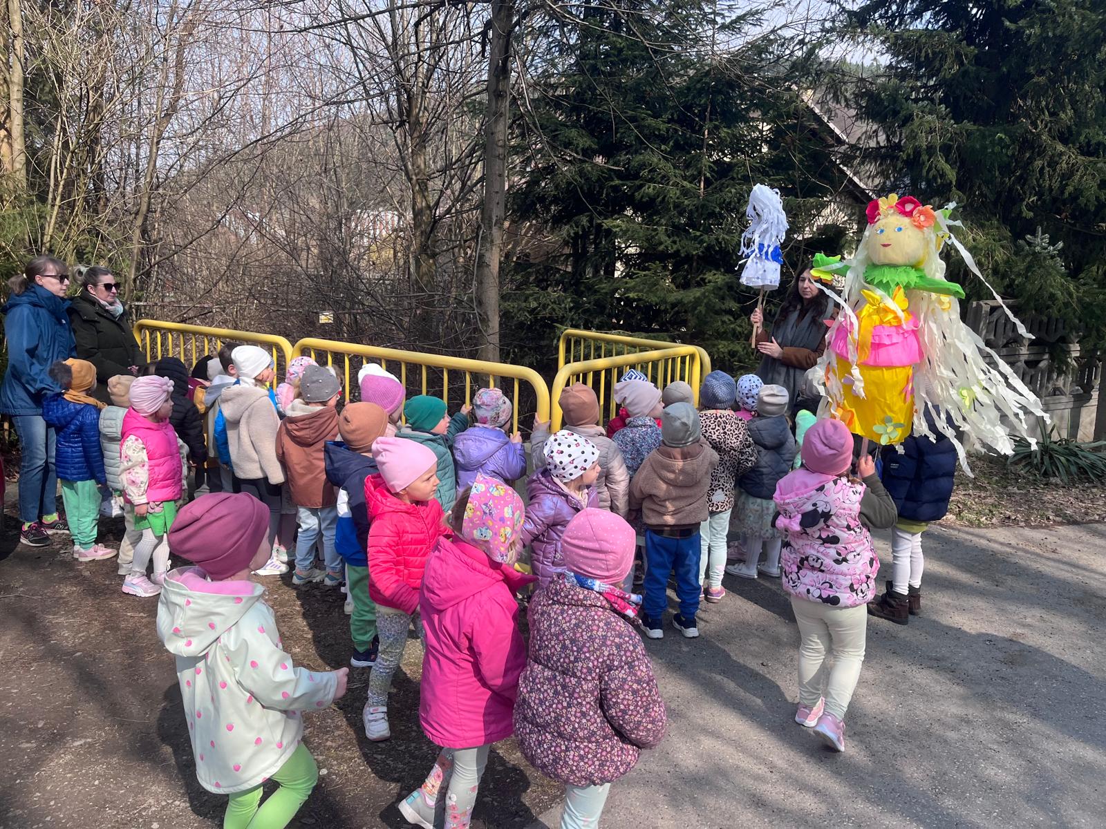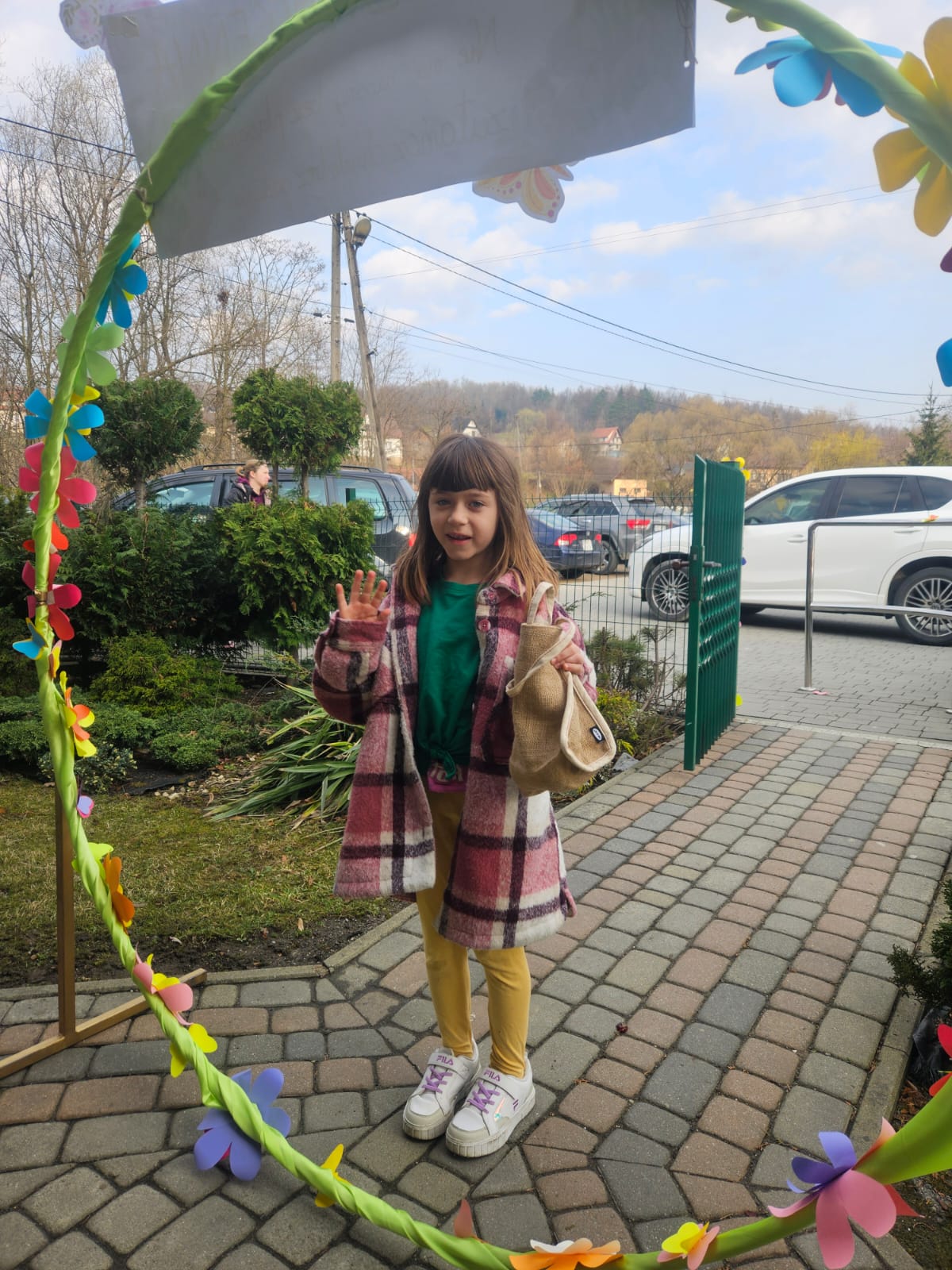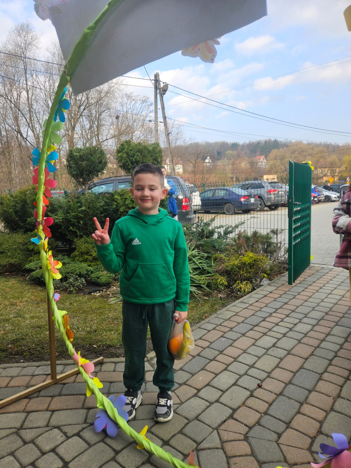 Dziś radośnie powitaliśmy długo wyczekiwaną wiosnę! Już od samego rana na dzieci czekało wyjątkowe zadanie. Przed wejściem do przedszkola, wspólnie z rodzicami, musiały wykonać polecenie: „Kontrola wiosenna – nie ma wiosny bez pląsania, zatańcz chwilę bez gadania!”. Wszyscy spisali się znakomicie i z uśmiechem rozpoczęli dzień. Następnie każda grupa zaprezentowała się, śpiewając wiosenną piosenkę oraz recytując wierszyk o wiośnie. Było kolorowo, radośnie i bardzo muzycznie! Kolejną atrakcją było wspólne przygotowanie pysznego, wiosennego soczku, który wszystkim bardzo smakował. Po nim wybraliśmy się na spacer z Marzanną oraz Panią Zimą, którą symbolicznie pożegnaliśmy, robiąc miejsce dla nowej pory roku. Nawet nasze posiłki – śniadanie, obiad i podwieczorek – miały dziś wiosenne kolory: zielony i żółty, tak jak ubrania, w które wszyscy byliśmy ubrani. Na zakończenie dnia każde dziecko otrzymało od Pani Wiosny słodki upominek – czekoladę z wiosennym wierszykiem i kwiatuszkiem. To był dzień pełen radości, zabawy i prawdziwie wiosennej atmosfery!