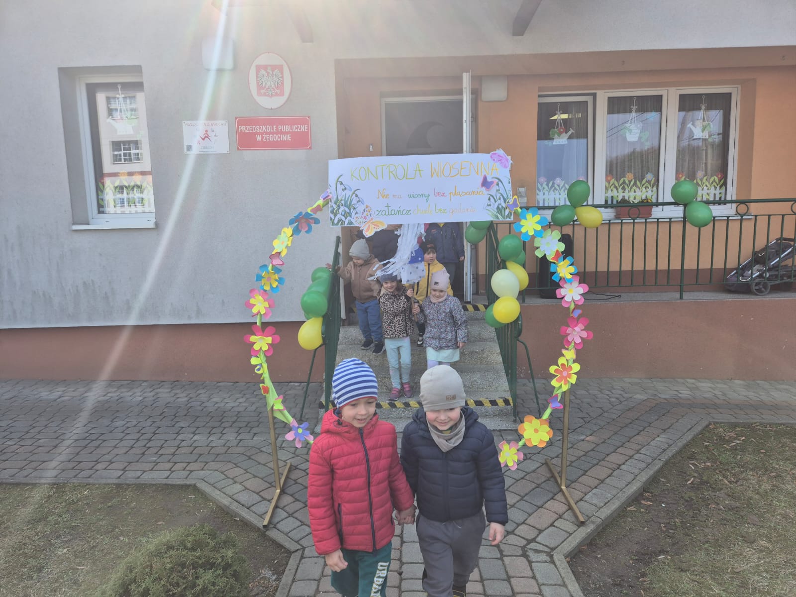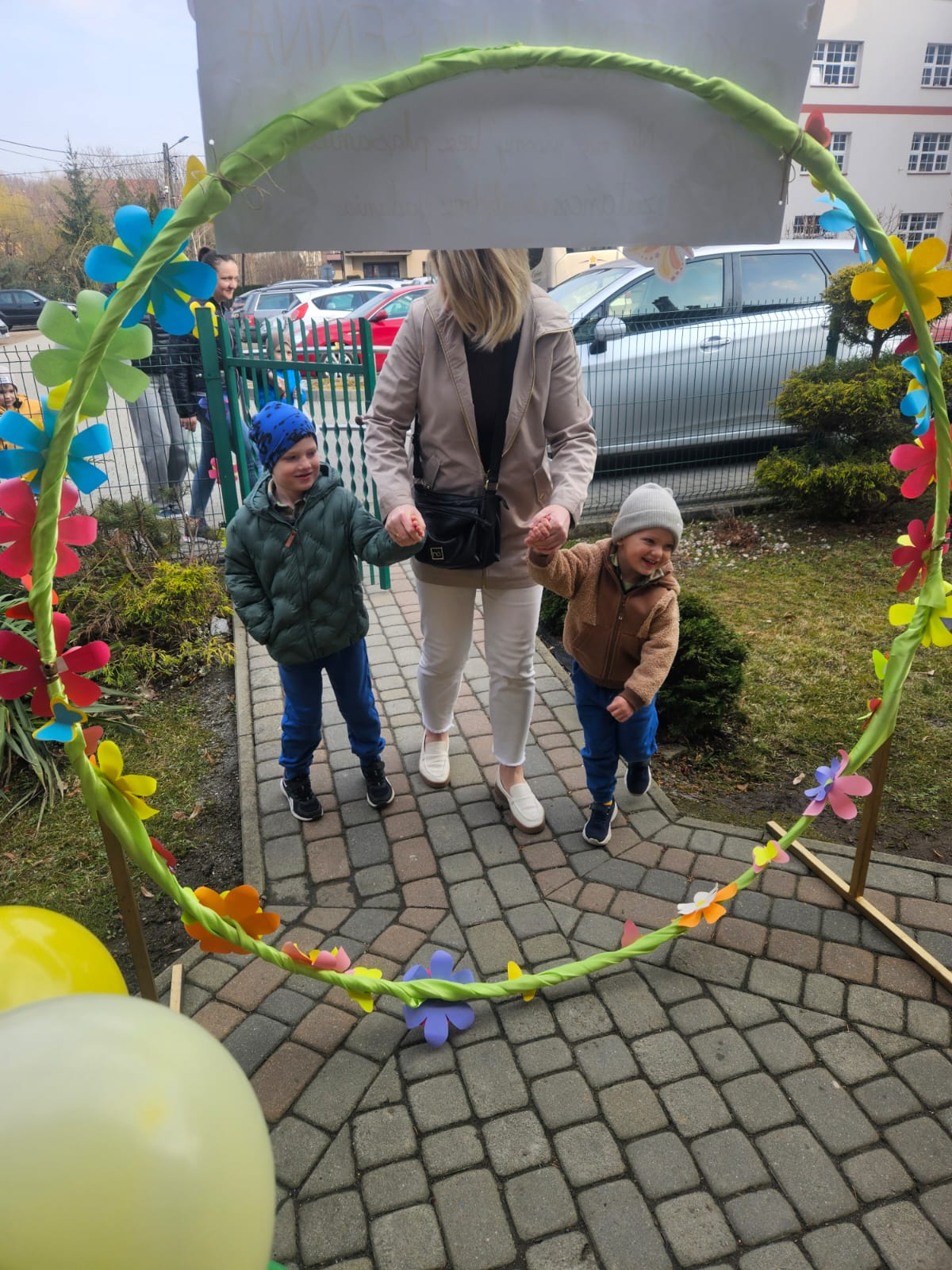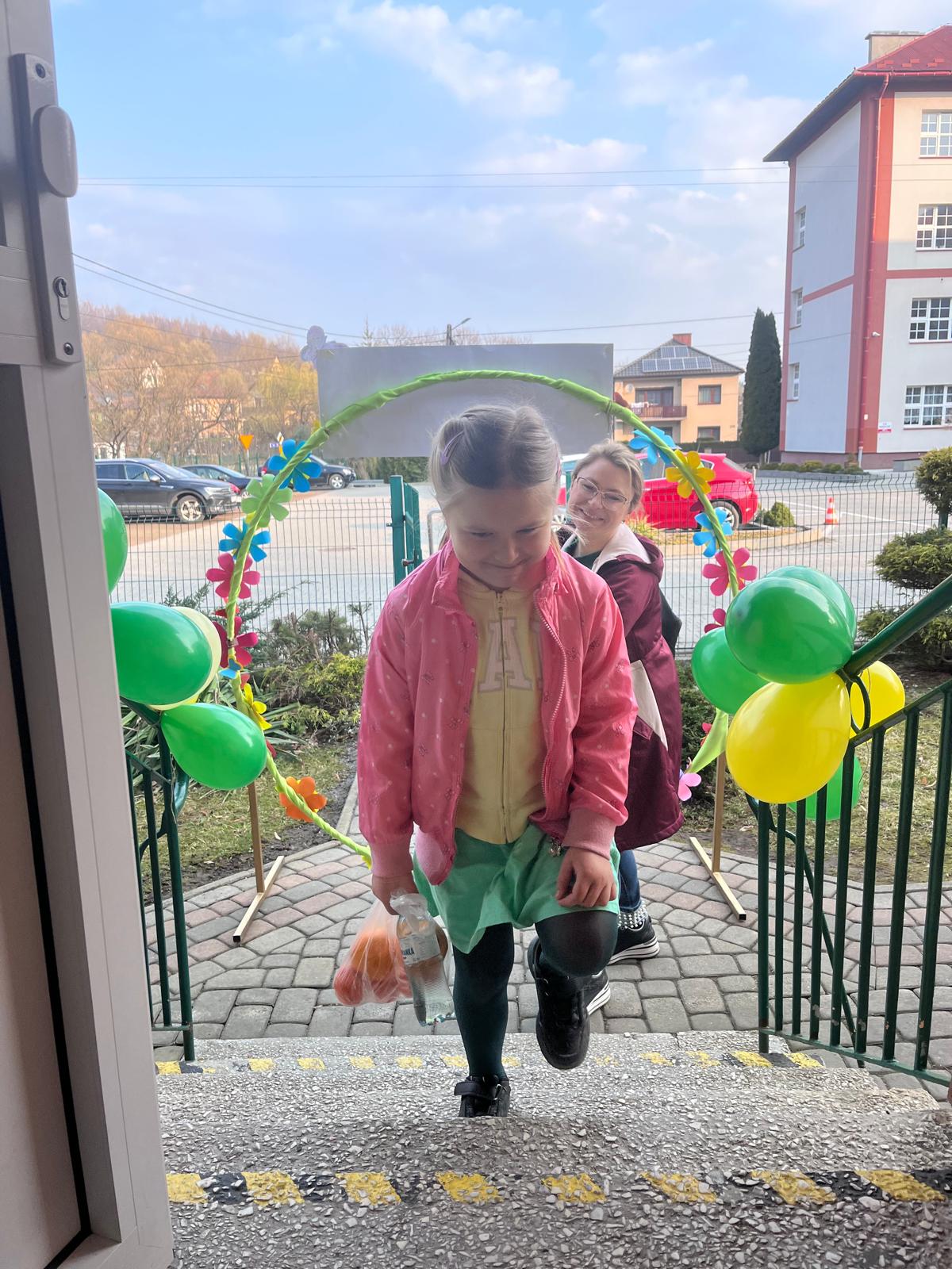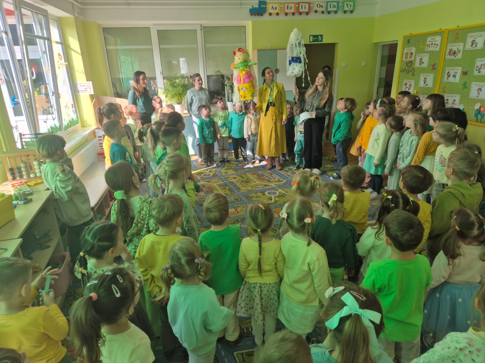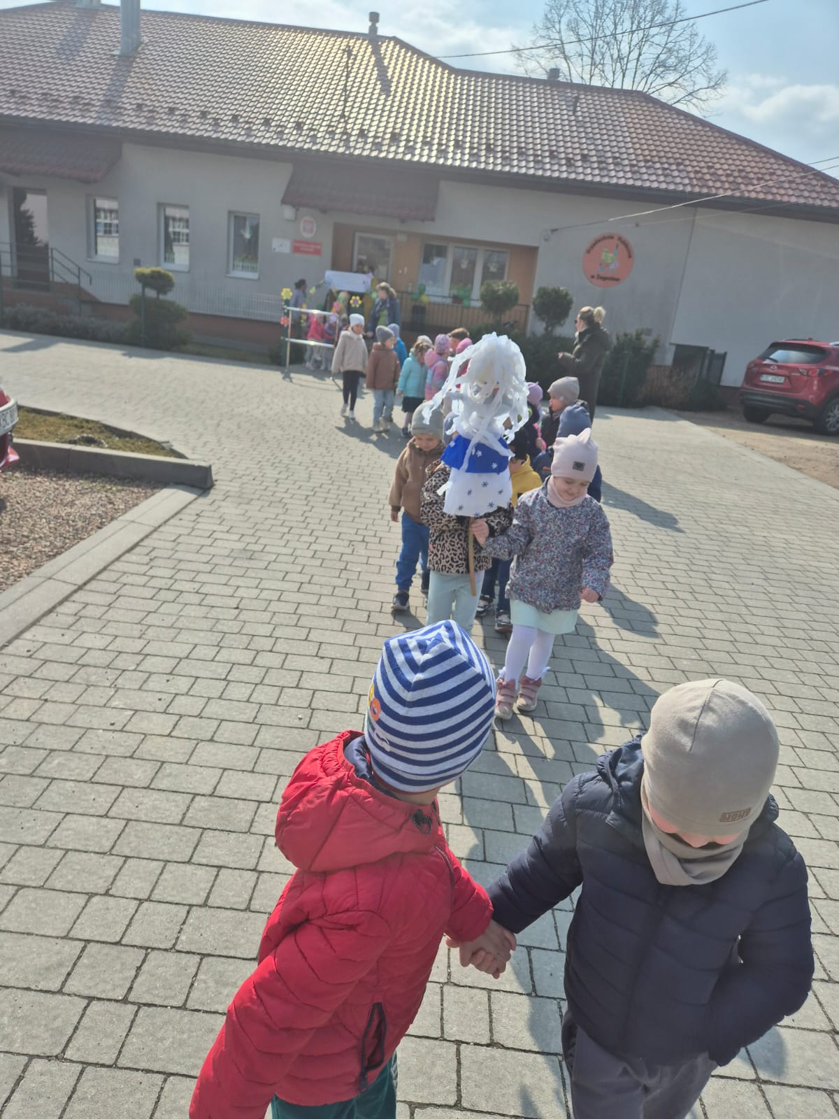 Dziś radośnie powitaliśmy długo wyczekiwaną wiosnę! Już od samego rana na dzieci czekało wyjątkowe zadanie. Przed wejściem do przedszkola, wspólnie z rodzicami, musiały wykonać polecenie: „Kontrola wiosenna – nie ma wiosny bez pląsania, zatańcz chwilę bez gadania!”. Wszyscy spisali się znakomicie i z uśmiechem rozpoczęli dzień. Następnie każda grupa zaprezentowała się, śpiewając wiosenną piosenkę oraz recytując wierszyk o wiośnie. Było kolorowo, radośnie i bardzo muzycznie! Kolejną atrakcją było wspólne przygotowanie pysznego, wiosennego soczku, który wszystkim bardzo smakował. Po nim wybraliśmy się na spacer z Marzanną oraz Panią Zimą, którą symbolicznie pożegnaliśmy, robiąc miejsce dla nowej pory roku. Nawet nasze posiłki – śniadanie, obiad i podwieczorek – miały dziś wiosenne kolory: zielony i żółty, tak jak ubrania, w które wszyscy byliśmy ubrani. Na zakończenie dnia każde dziecko otrzymało od Pani Wiosny słodki upominek – czekoladę z wiosennym wierszykiem i kwiatuszkiem. To był dzień pełen radości, zabawy i prawdziwie wiosennej atmosfery!
