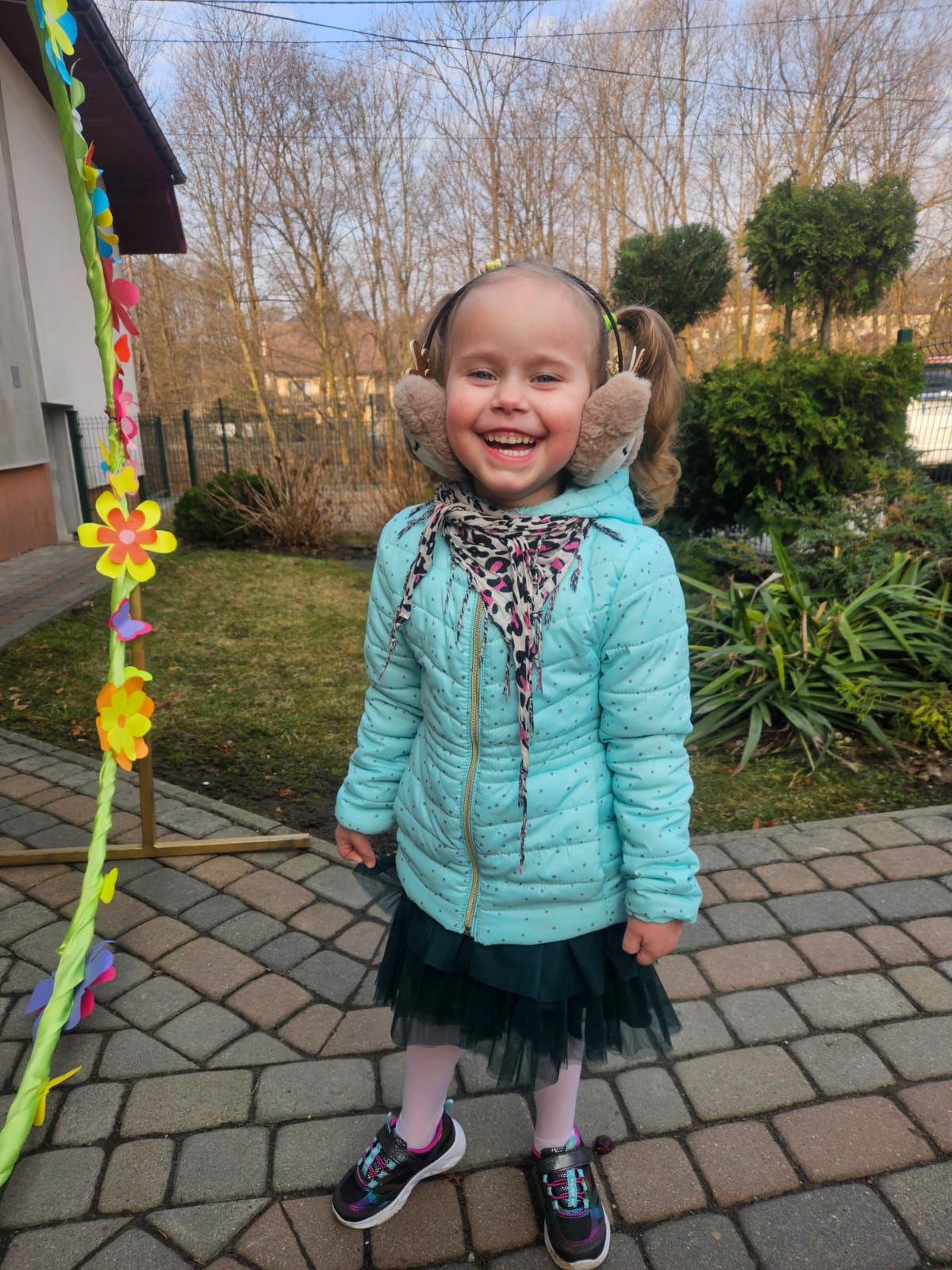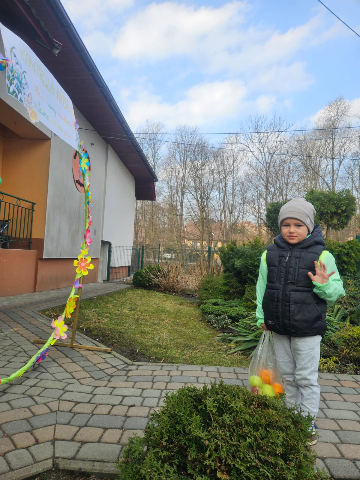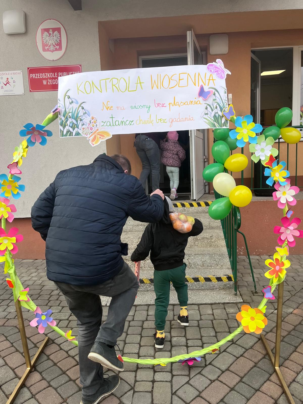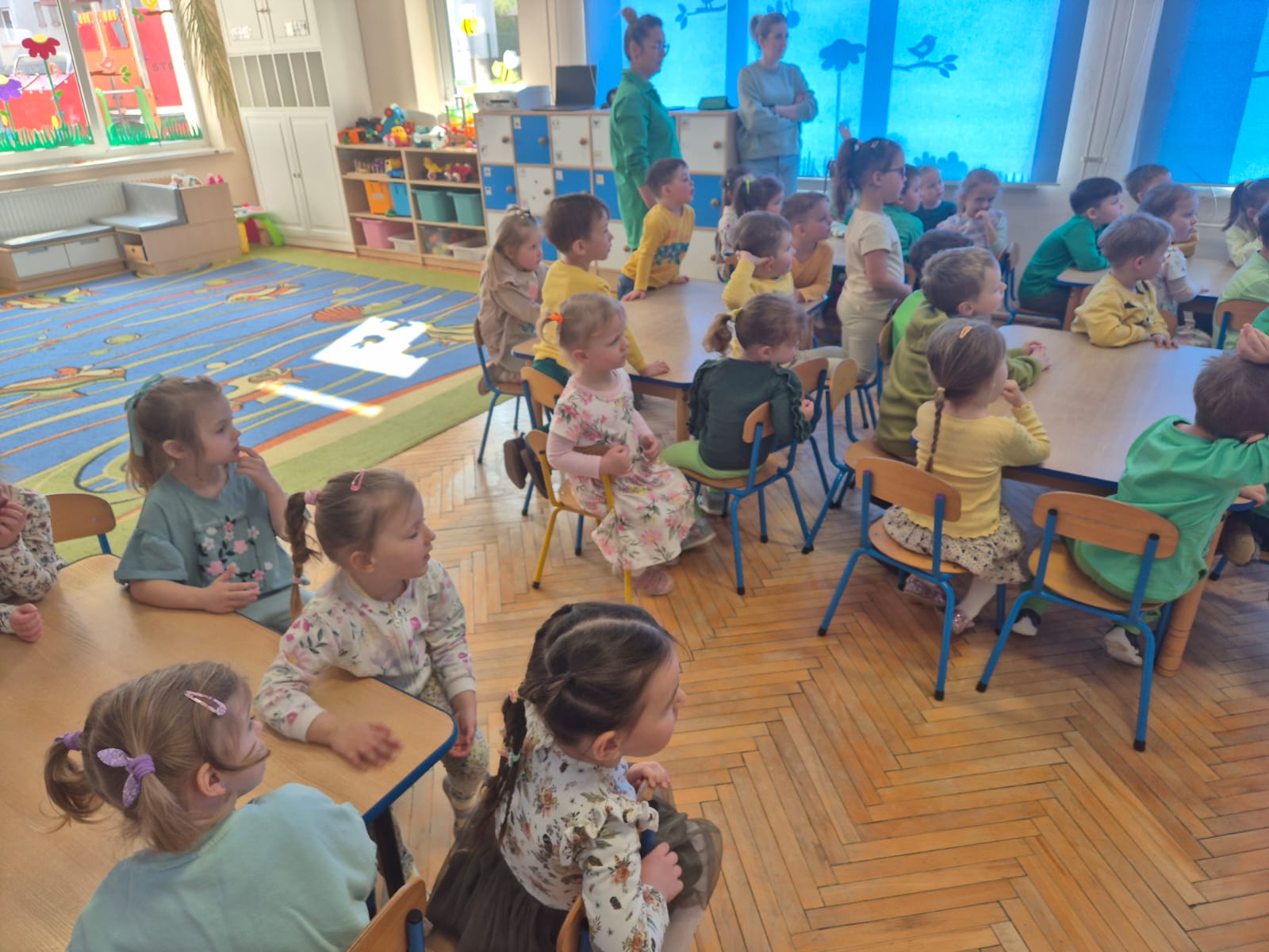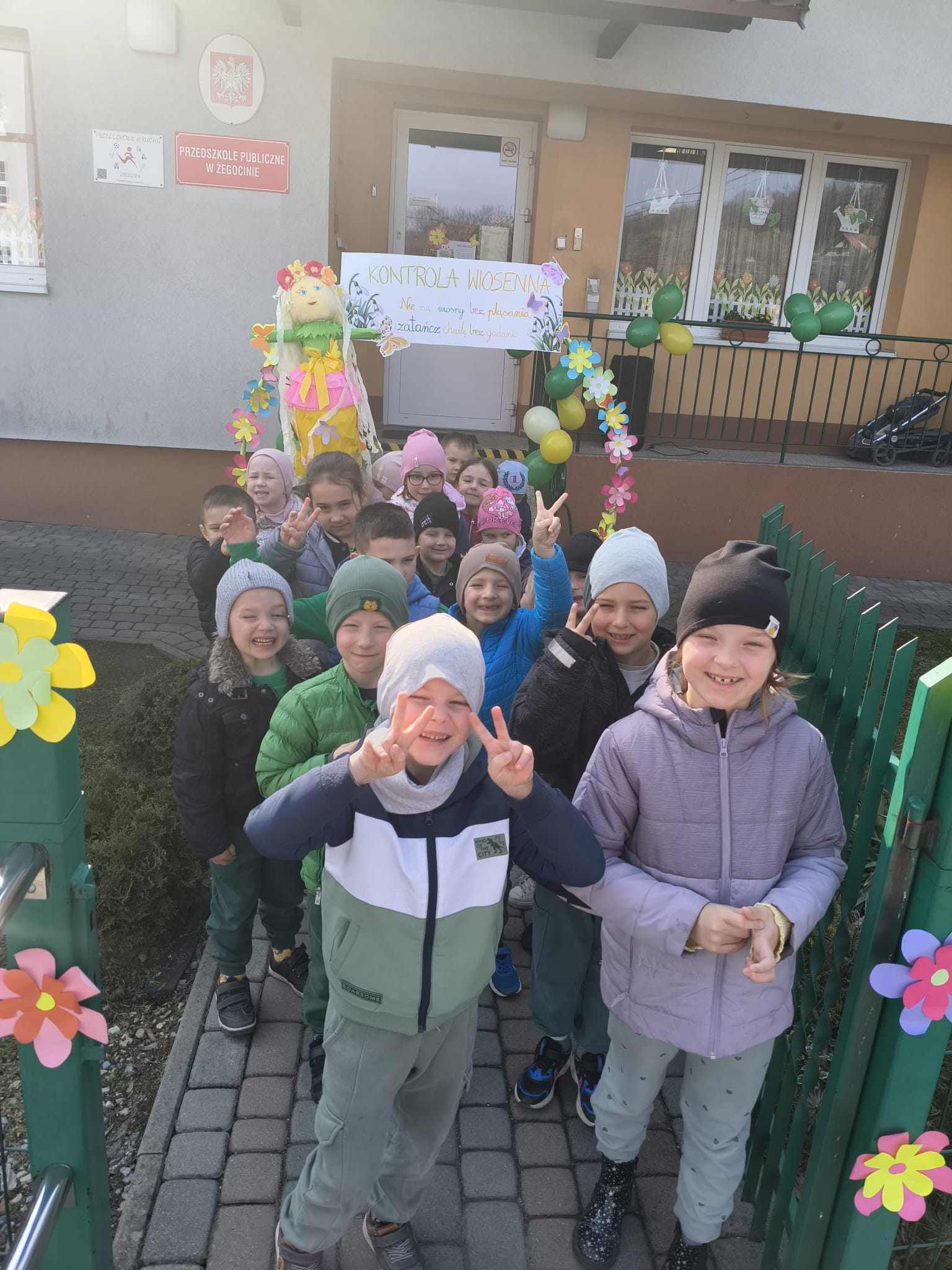 Dziś radośnie powitaliśmy długo wyczekiwaną wiosnę! Już od samego rana na dzieci czekało wyjątkowe zadanie. Przed wejściem do przedszkola, wspólnie z rodzicami, musiały wykonać polecenie: „Kontrola wiosenna – nie ma wiosny bez pląsania, zatańcz chwilę bez gadania!”. Wszyscy spisali się znakomicie i z uśmiechem rozpoczęli dzień. Następnie każda grupa zaprezentowała się, śpiewając wiosenną piosenkę oraz recytując wierszyk o wiośnie. Było kolorowo, radośnie i bardzo muzycznie! Kolejną atrakcją było wspólne przygotowanie pysznego, wiosennego soczku, który wszystkim bardzo smakował. Po nim wybraliśmy się na spacer z Marzanną oraz Panią Zimą, którą symbolicznie pożegnaliśmy, robiąc miejsce dla nowej pory roku. Nawet nasze posiłki – śniadanie, obiad i podwieczorek – miały dziś wiosenne kolory: zielony i żółty, tak jak ubrania, w które wszyscy byliśmy ubrani. Na zakończenie dnia każde dziecko otrzymało od Pani Wiosny słodki upominek – czekoladę z wiosennym wierszykiem i kwiatuszkiem. To był dzień pełen radości, zabawy i prawdziwie wiosennej atmosfery!