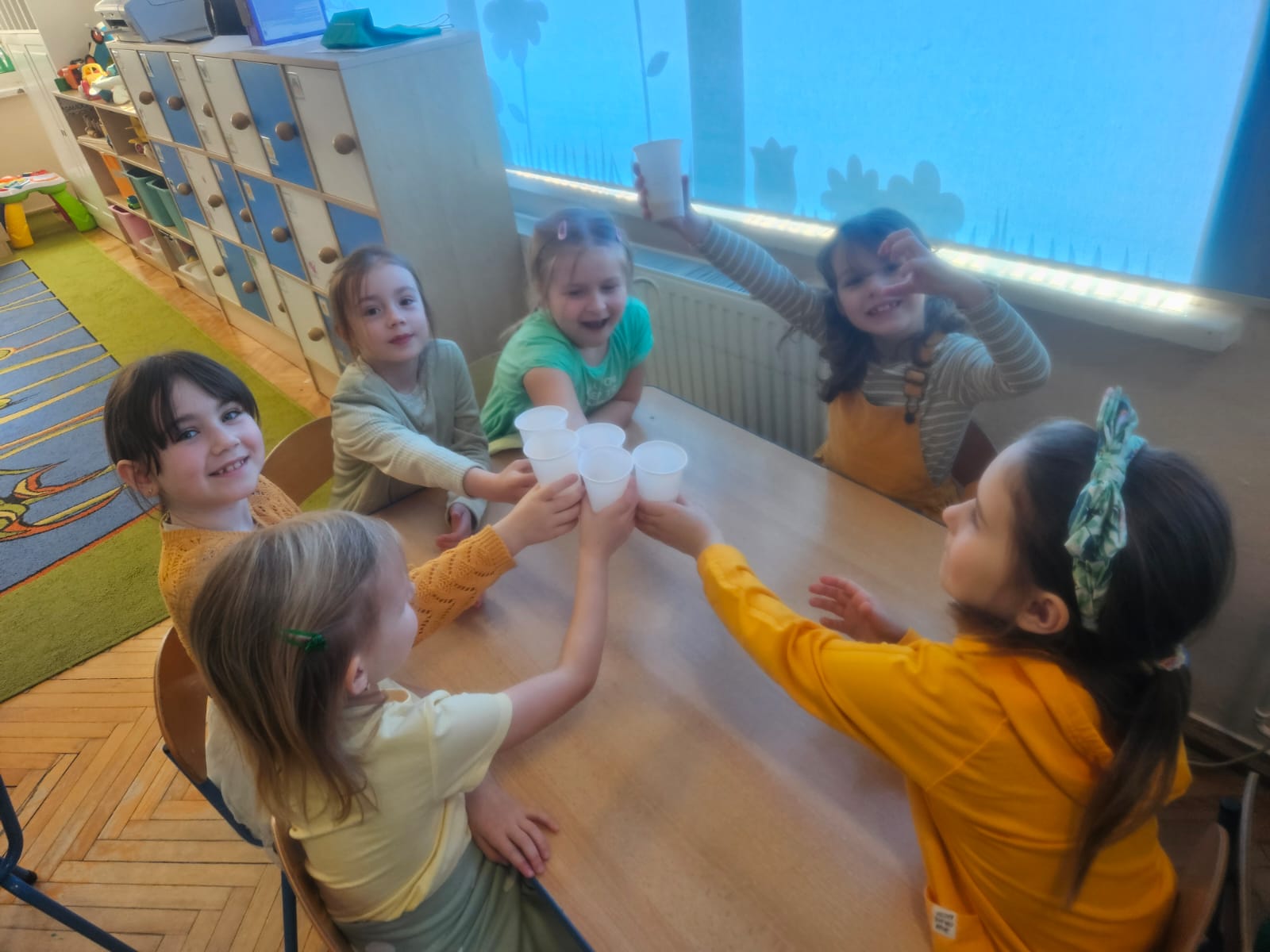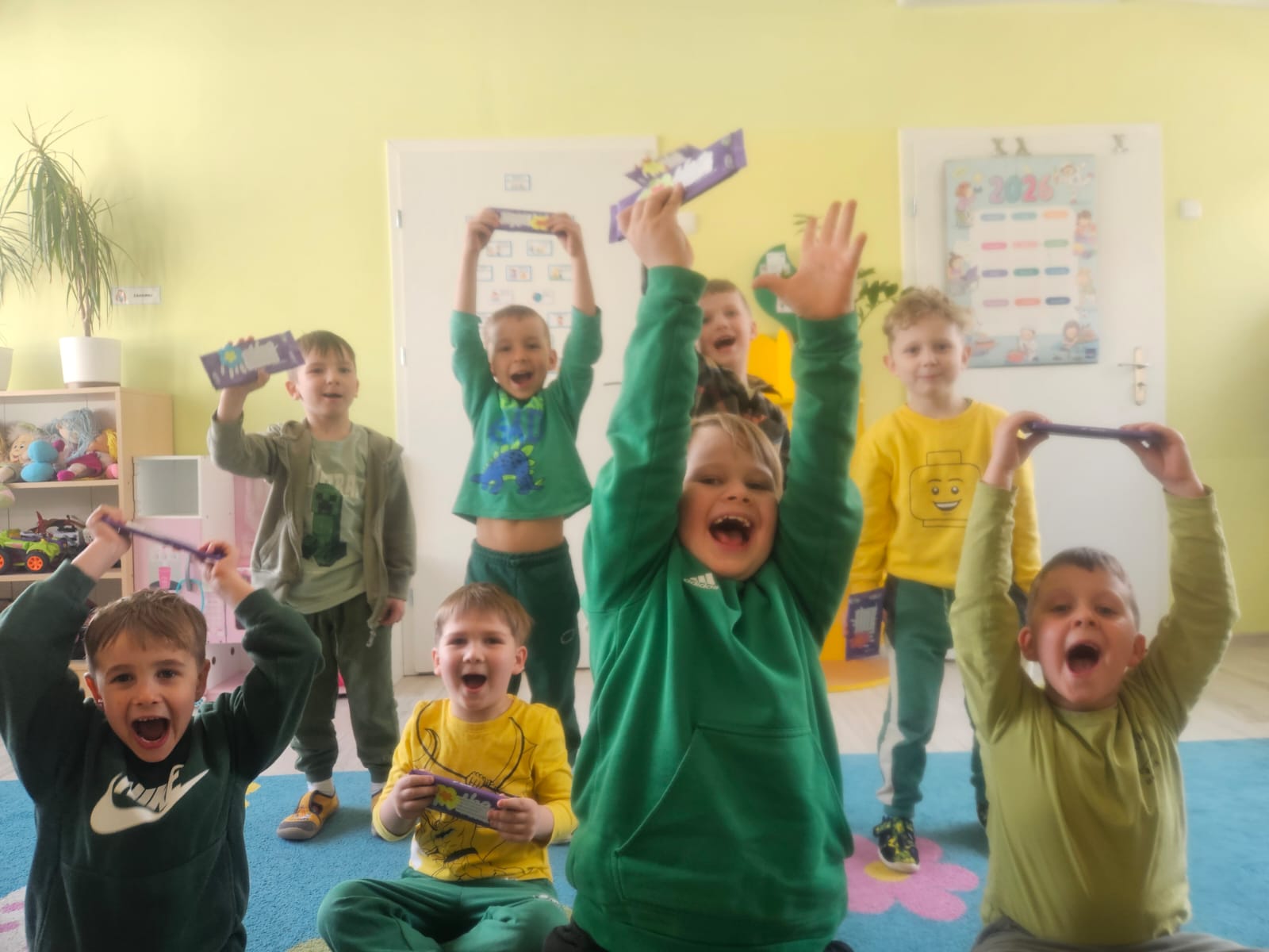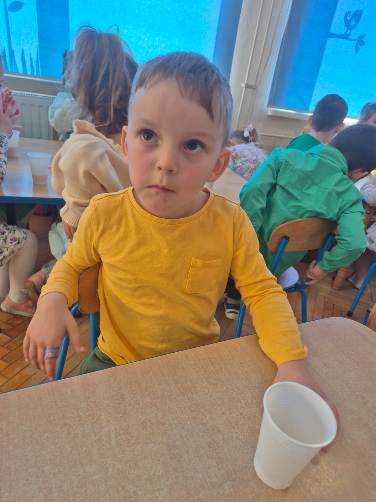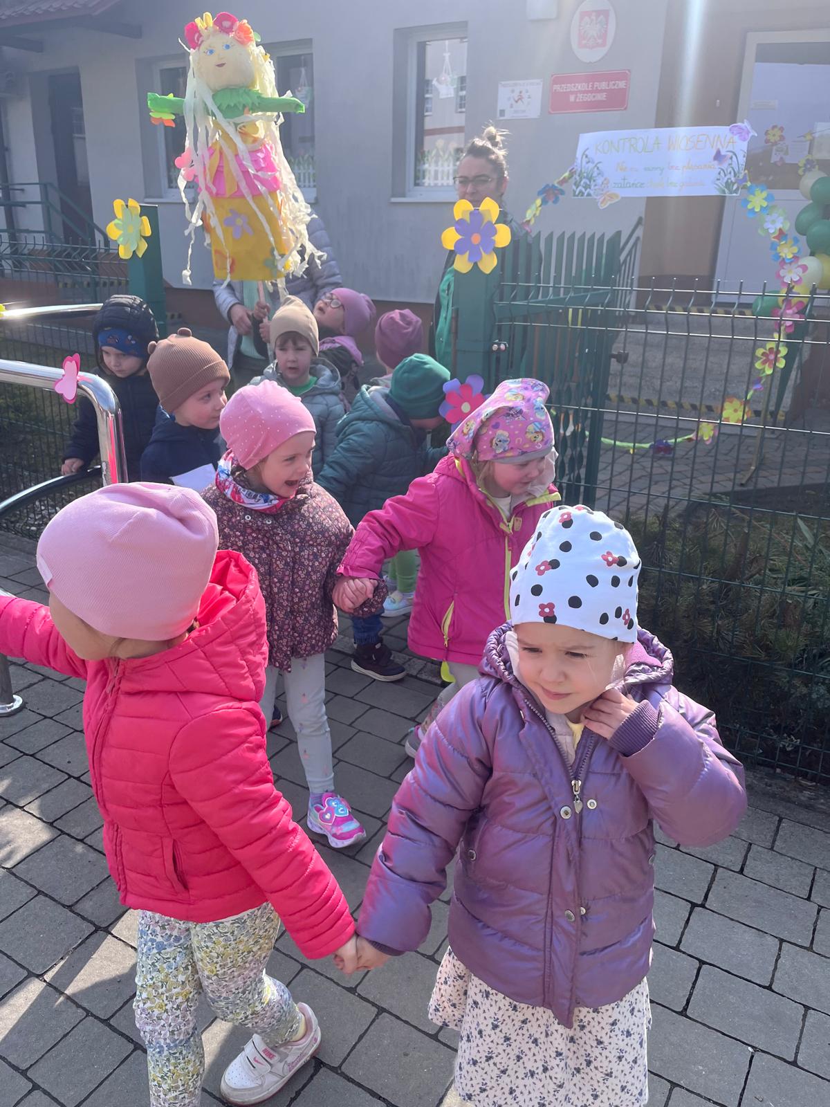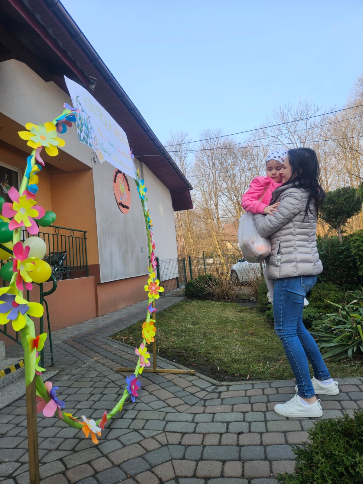 Dziś radośnie powitaliśmy długo wyczekiwaną wiosnę! Już od samego rana na dzieci czekało wyjątkowe zadanie. Przed wejściem do przedszkola, wspólnie z rodzicami, musiały wykonać polecenie: „Kontrola wiosenna – nie ma wiosny bez pląsania, zatańcz chwilę bez gadania!”. Wszyscy spisali się znakomicie i z uśmiechem rozpoczęli dzień. Następnie każda grupa zaprezentowała się, śpiewając wiosenną piosenkę oraz recytując wierszyk o wiośnie. Było kolorowo, radośnie i bardzo muzycznie! Kolejną atrakcją było wspólne przygotowanie pysznego, wiosennego soczku, który wszystkim bardzo smakował. Po nim wybraliśmy się na spacer z Marzanną oraz Panią Zimą, którą symbolicznie pożegnaliśmy, robiąc miejsce dla nowej pory roku. Nawet nasze posiłki – śniadanie, obiad i podwieczorek – miały dziś wiosenne kolory: zielony i żółty, tak jak ubrania, w które wszyscy byliśmy ubrani. Na zakończenie dnia każde dziecko otrzymało od Pani Wiosny słodki upominek – czekoladę z wiosennym wierszykiem i kwiatuszkiem. To był dzień pełen radości, zabawy i prawdziwie wiosennej atmosfery!