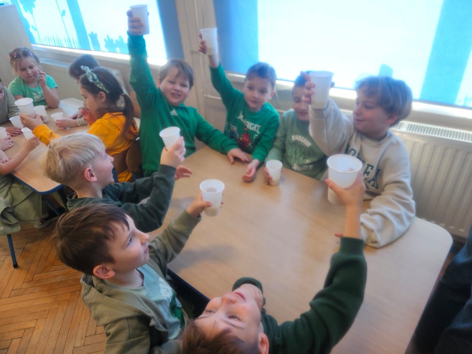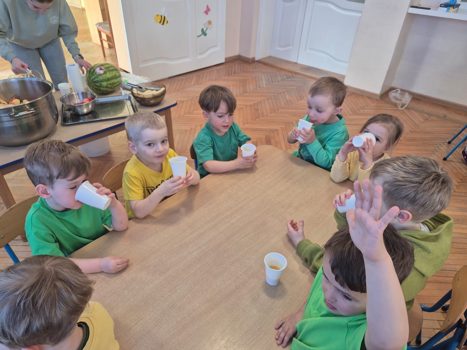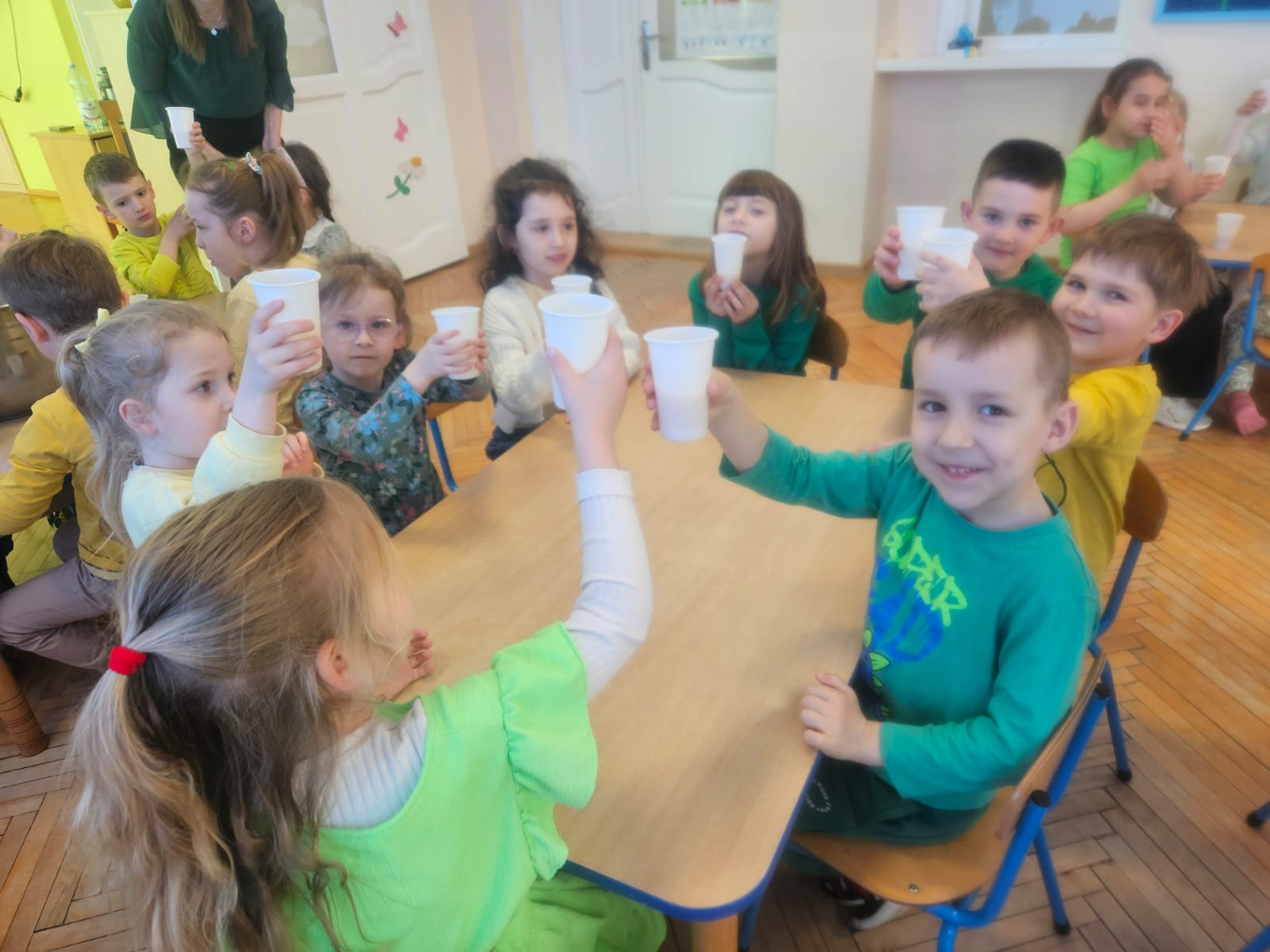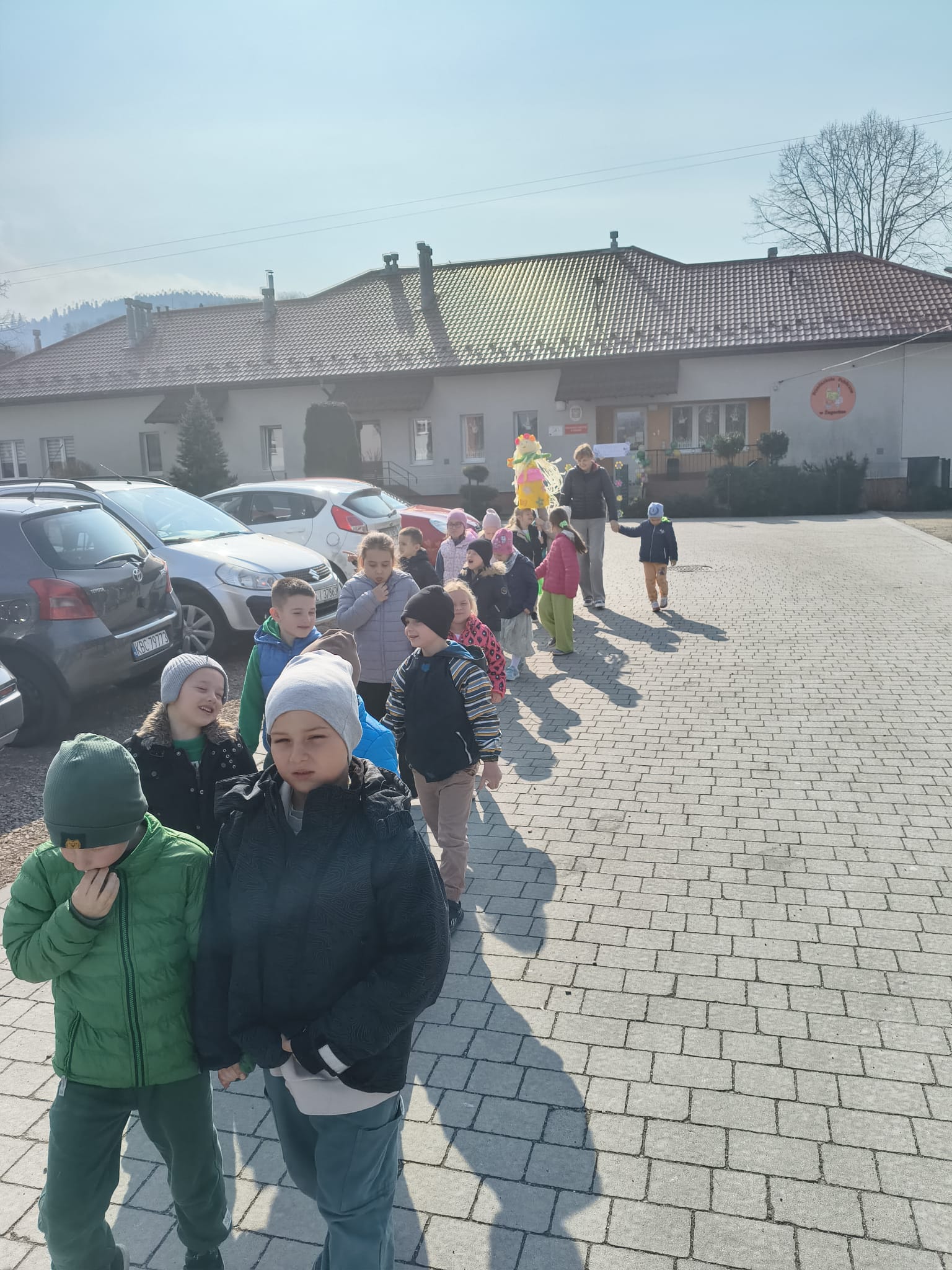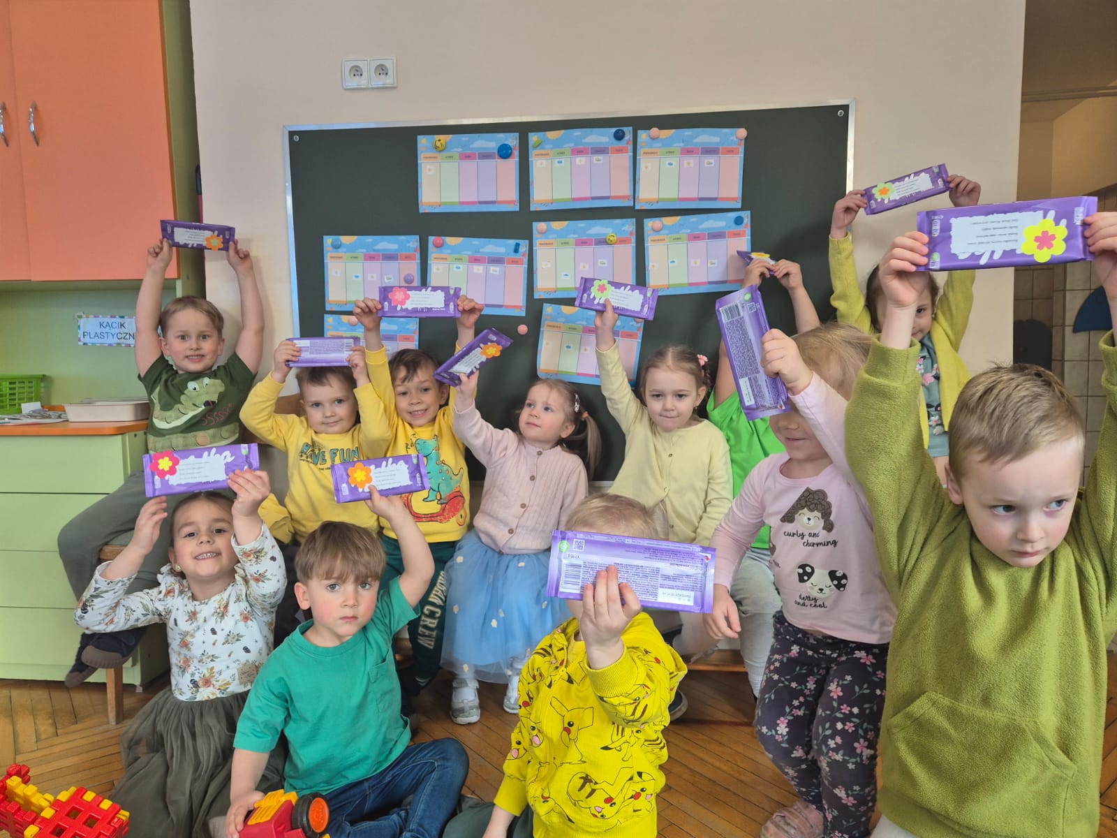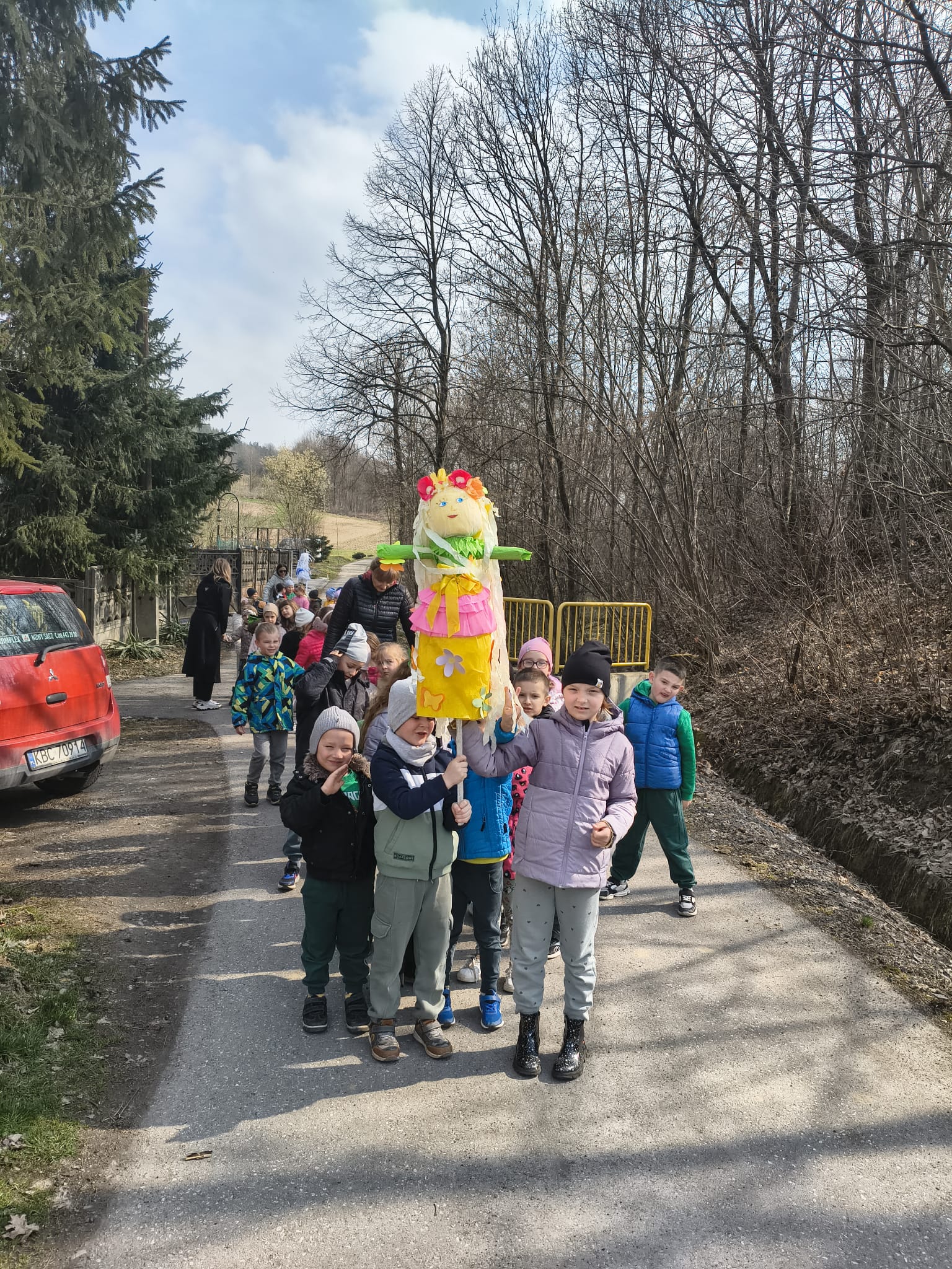 Dziś radośnie powitaliśmy długo wyczekiwaną wiosnę! Już od samego rana na dzieci czekało wyjątkowe zadanie. Przed wejściem do przedszkola, wspólnie z rodzicami, musiały wykonać polecenie: „Kontrola wiosenna – nie ma wiosny bez pląsania, zatańcz chwilę bez gadania!”. Wszyscy spisali się znakomicie i z uśmiechem rozpoczęli dzień. Następnie każda grupa zaprezentowała się, śpiewając wiosenną piosenkę oraz recytując wierszyk o wiośnie. Było kolorowo, radośnie i bardzo muzycznie! Kolejną atrakcją było wspólne przygotowanie pysznego, wiosennego soczku, który wszystkim bardzo smakował. Po nim wybraliśmy się na spacer z Marzanną oraz Panią Zimą, którą symbolicznie pożegnaliśmy, robiąc miejsce dla nowej pory roku. Nawet nasze posiłki – śniadanie, obiad i podwieczorek – miały dziś wiosenne kolory: zielony i żółty, tak jak ubrania, w które wszyscy byliśmy ubrani. Na zakończenie dnia każde dziecko otrzymało od Pani Wiosny słodki upominek – czekoladę z wiosennym wierszykiem i kwiatuszkiem. To był dzień pełen radości, zabawy i prawdziwie wiosennej atmosfery!