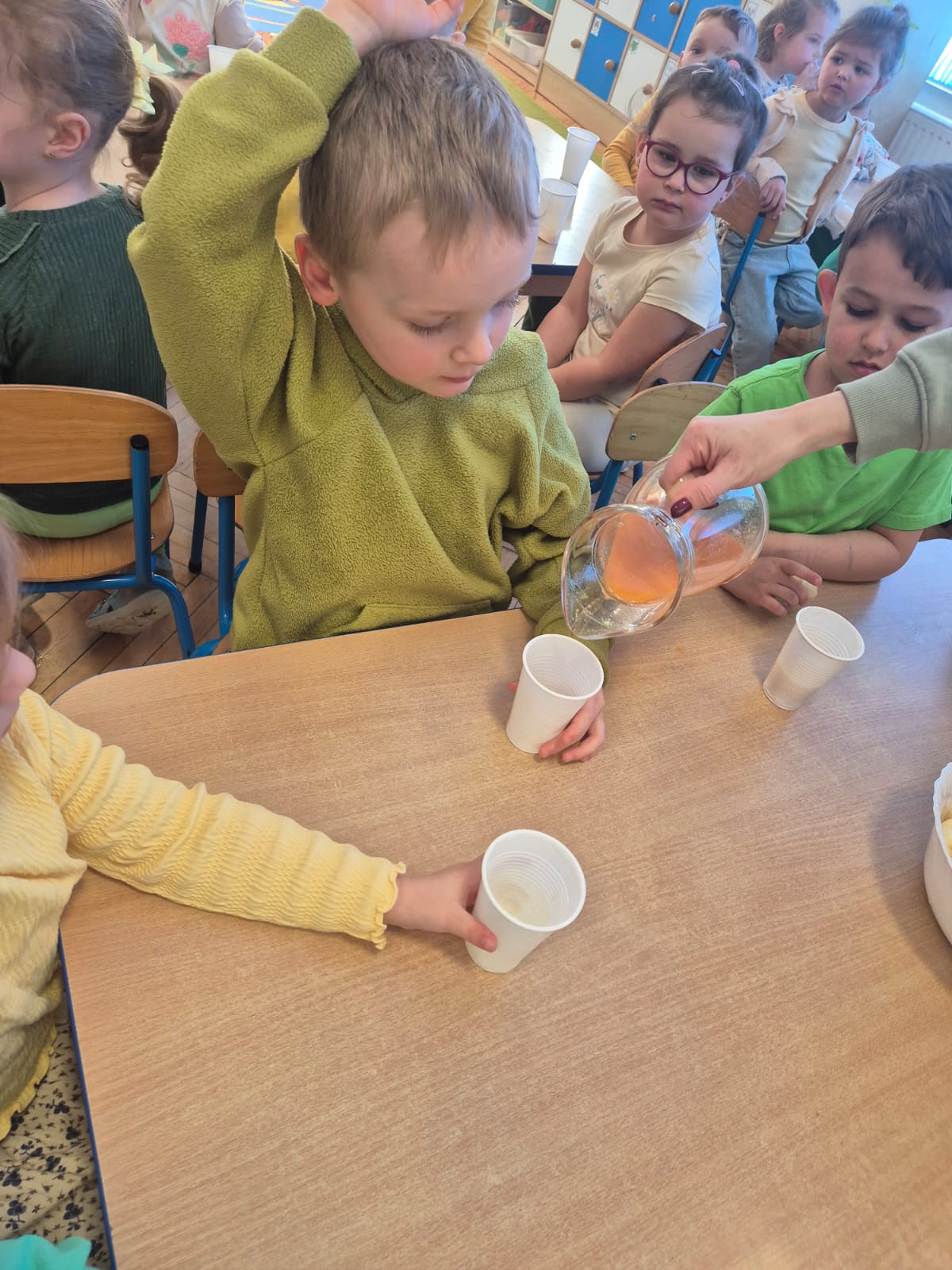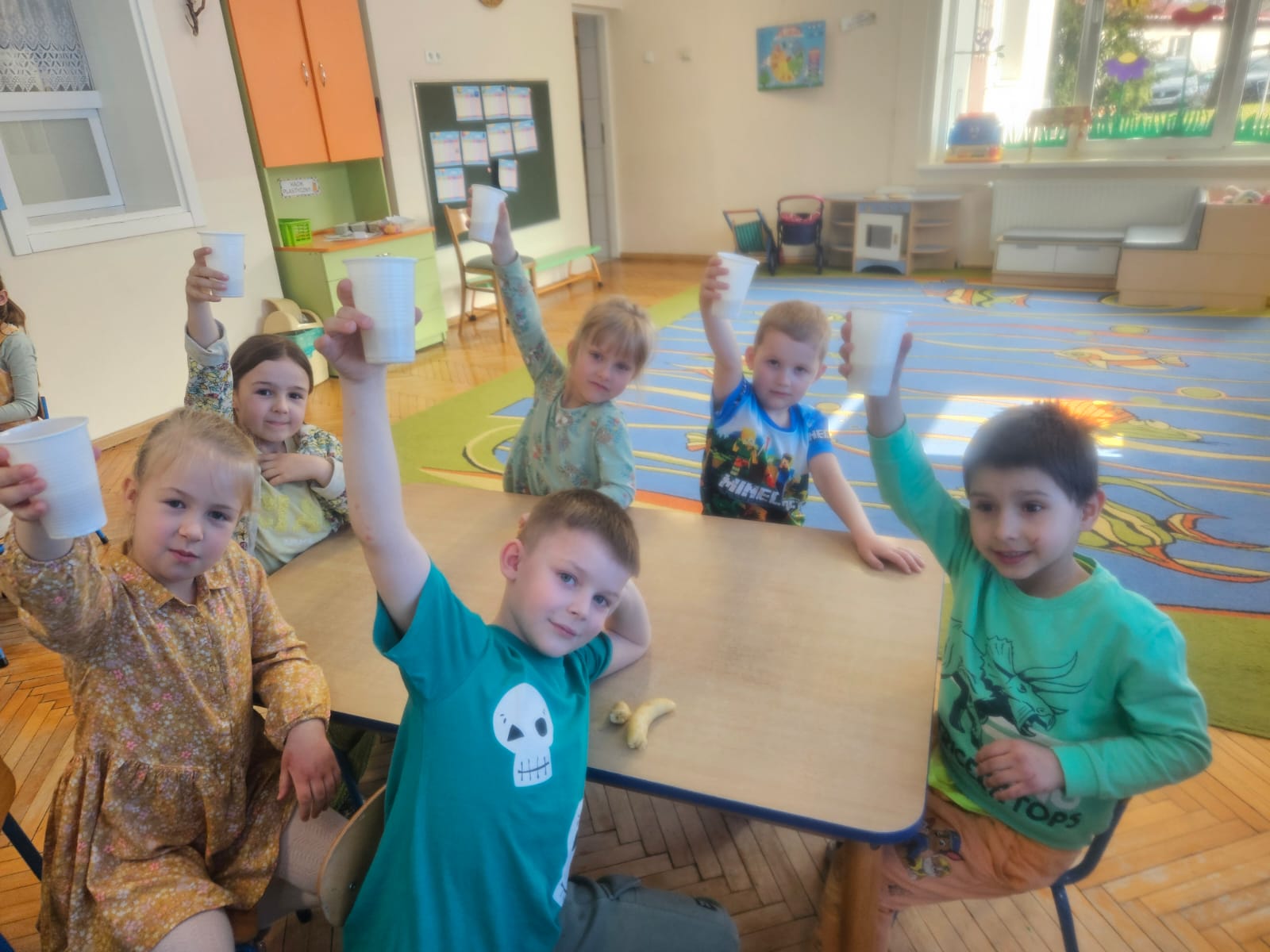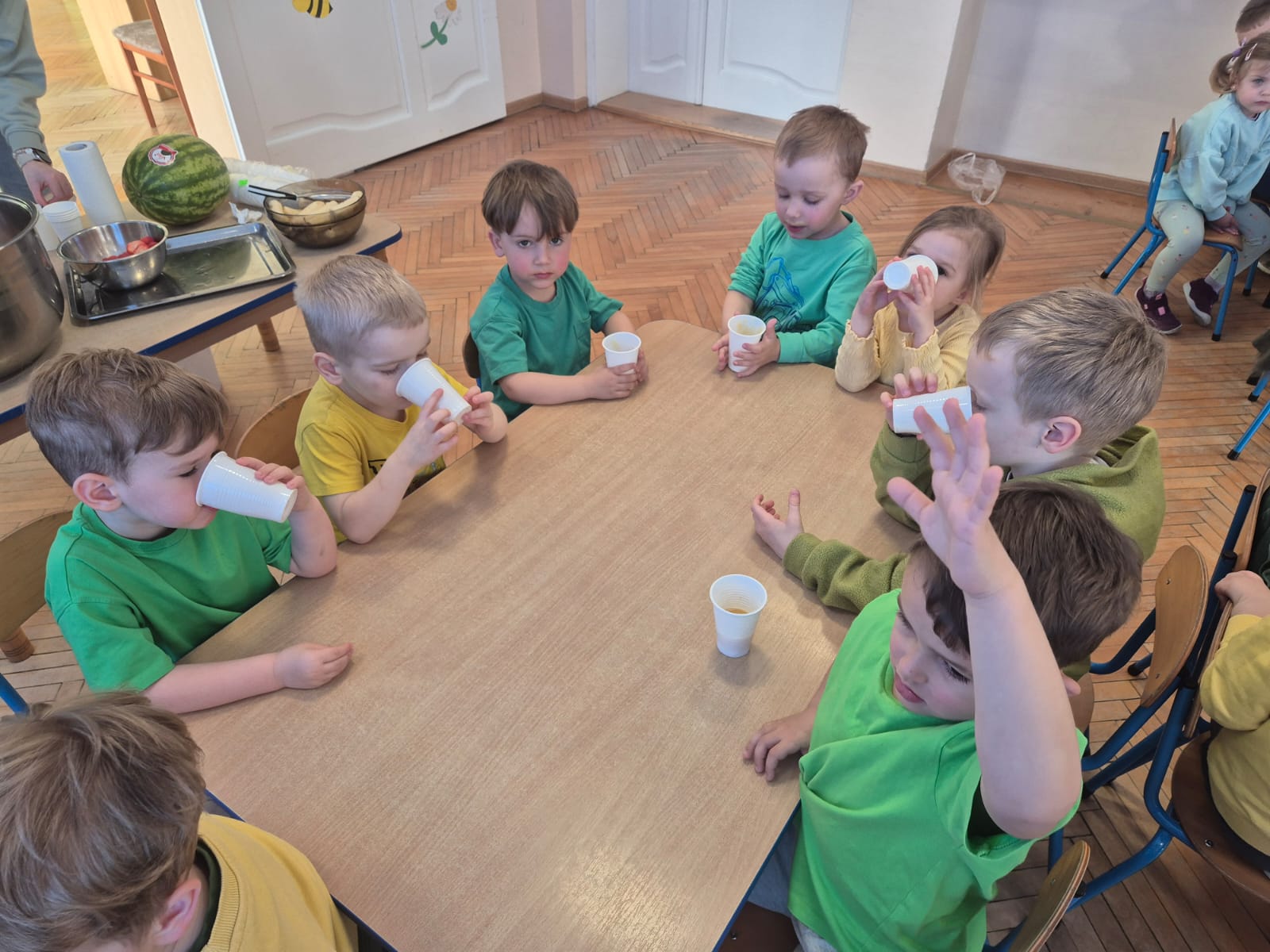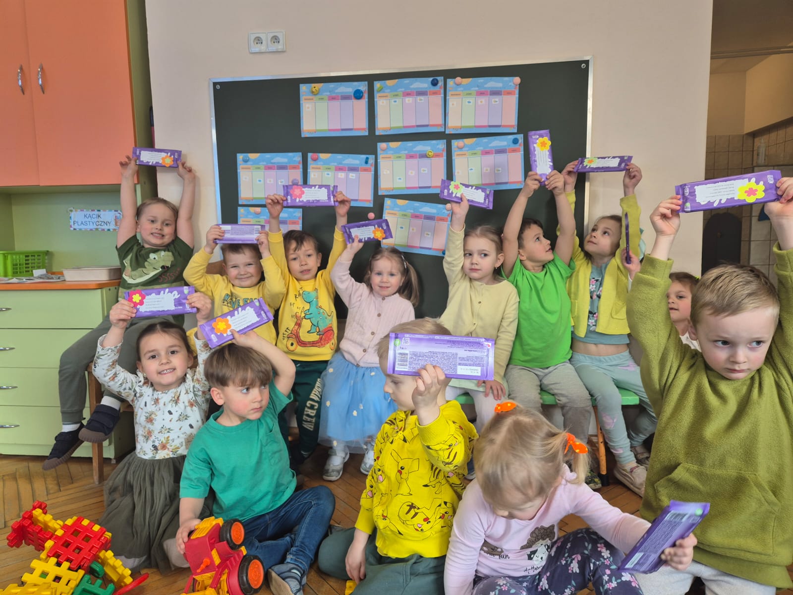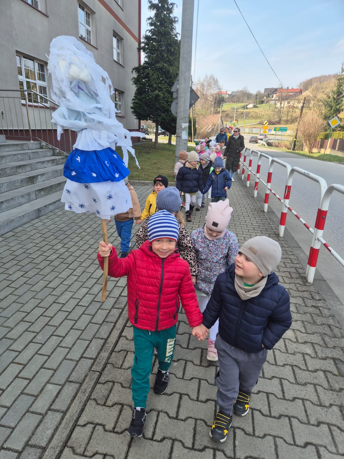 Dziś radośnie powitaliśmy długo wyczekiwaną wiosnę! Już od samego rana na dzieci czekało wyjątkowe zadanie. Przed wejściem do przedszkola, wspólnie z rodzicami, musiały wykonać polecenie: „Kontrola wiosenna – nie ma wiosny bez pląsania, zatańcz chwilę bez gadania!”. Wszyscy spisali się znakomicie i z uśmiechem rozpoczęli dzień. Następnie każda grupa zaprezentowała się, śpiewając wiosenną piosenkę oraz recytując wierszyk o wiośnie. Było kolorowo, radośnie i bardzo muzycznie! Kolejną atrakcją było wspólne przygotowanie pysznego, wiosennego soczku, który wszystkim bardzo smakował. Po nim wybraliśmy się na spacer z Marzanną oraz Panią Zimą, którą symbolicznie pożegnaliśmy, robiąc miejsce dla nowej pory roku. Nawet nasze posiłki – śniadanie, obiad i podwieczorek – miały dziś wiosenne kolory: zielony i żółty, tak jak ubrania, w które wszyscy byliśmy ubrani. Na zakończenie dnia każde dziecko otrzymało od Pani Wiosny słodki upominek – czekoladę z wiosennym wierszykiem i kwiatuszkiem. To był dzień pełen radości, zabawy i prawdziwie wiosennej atmosfery!