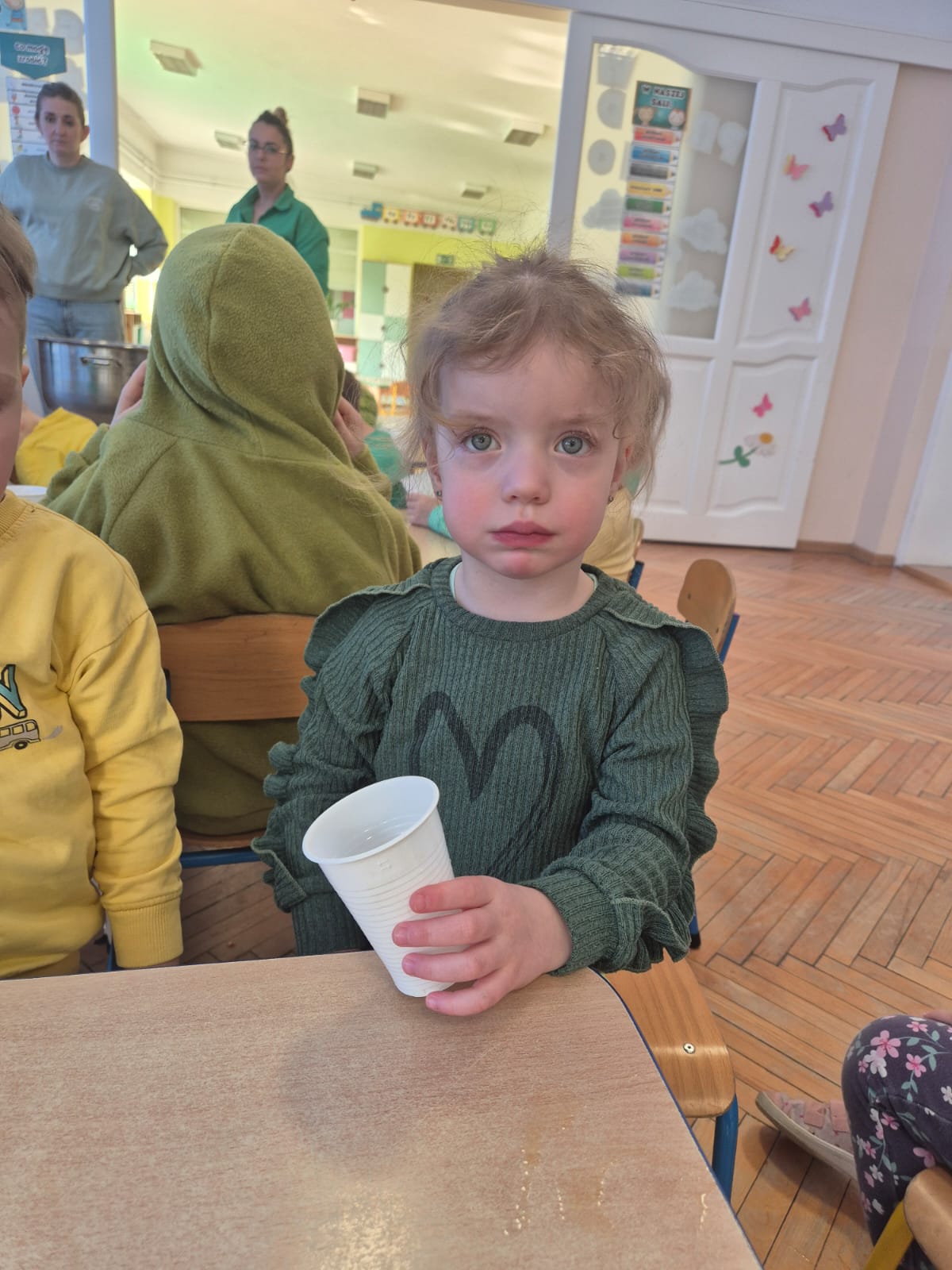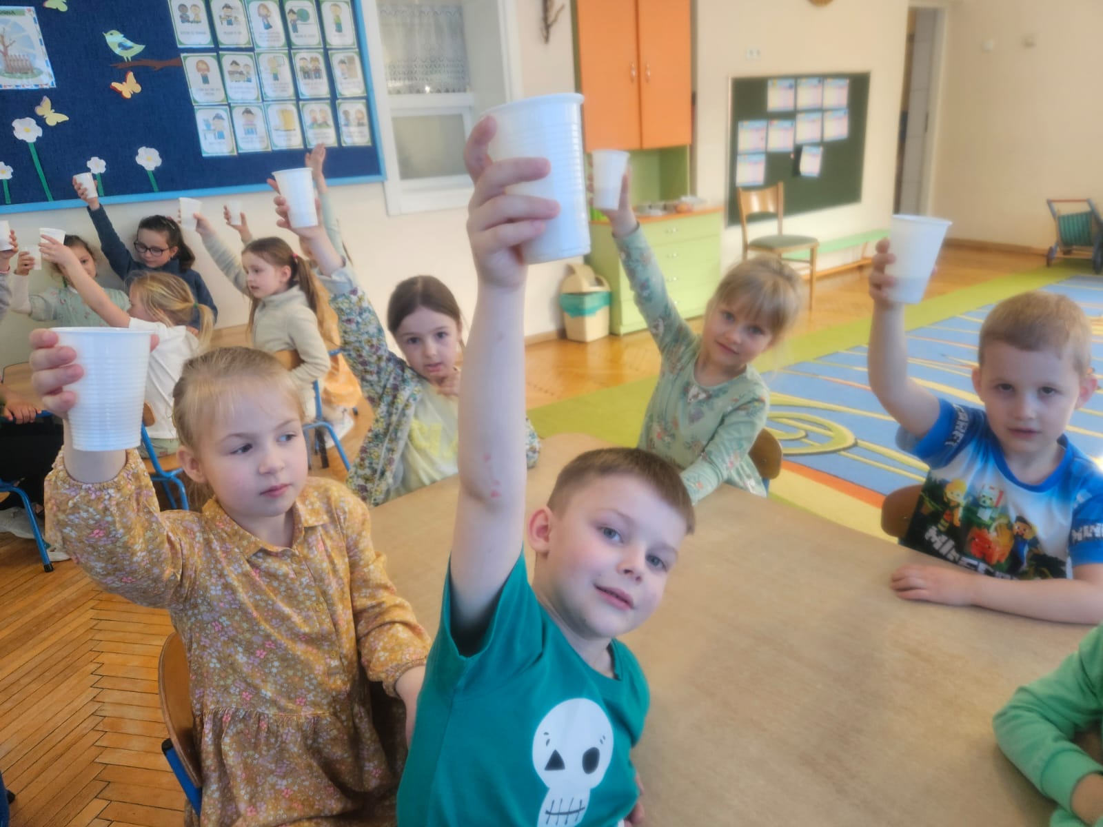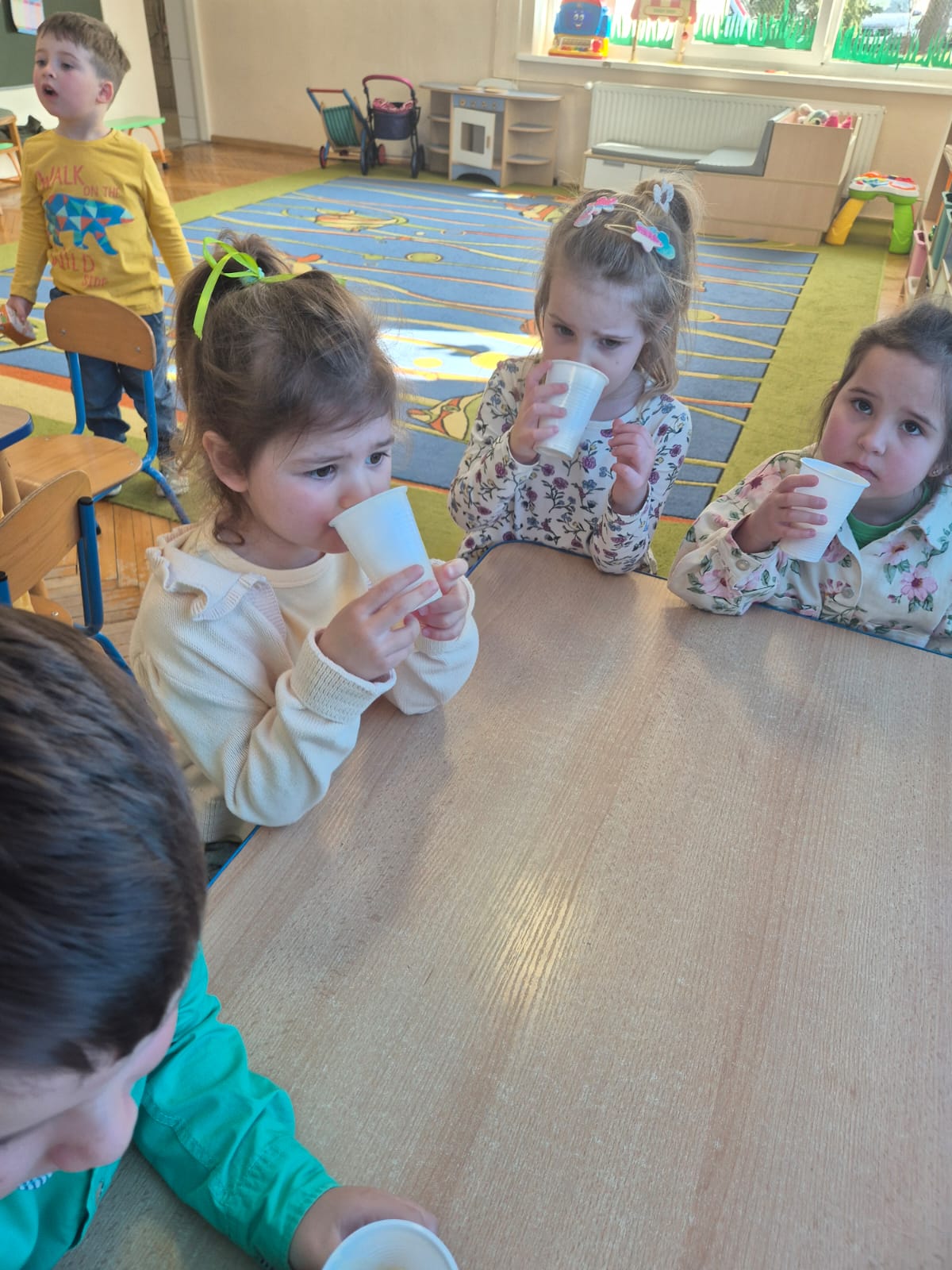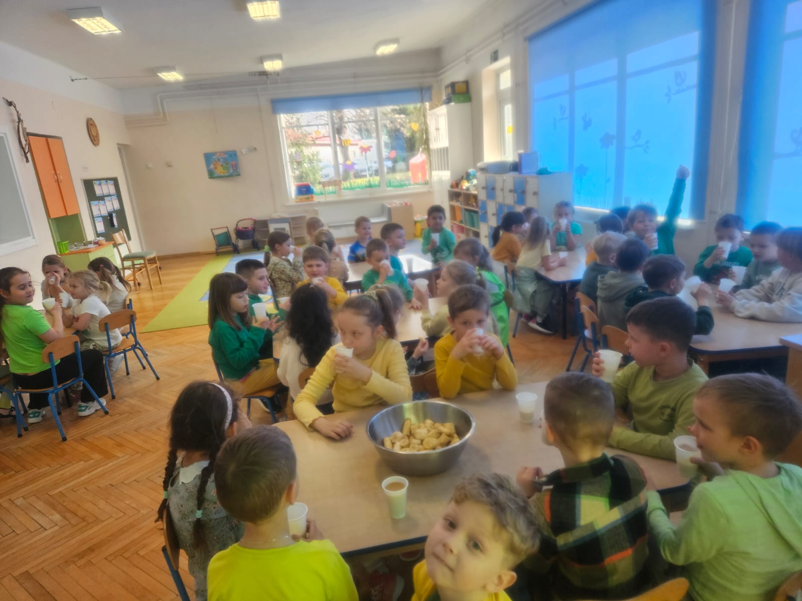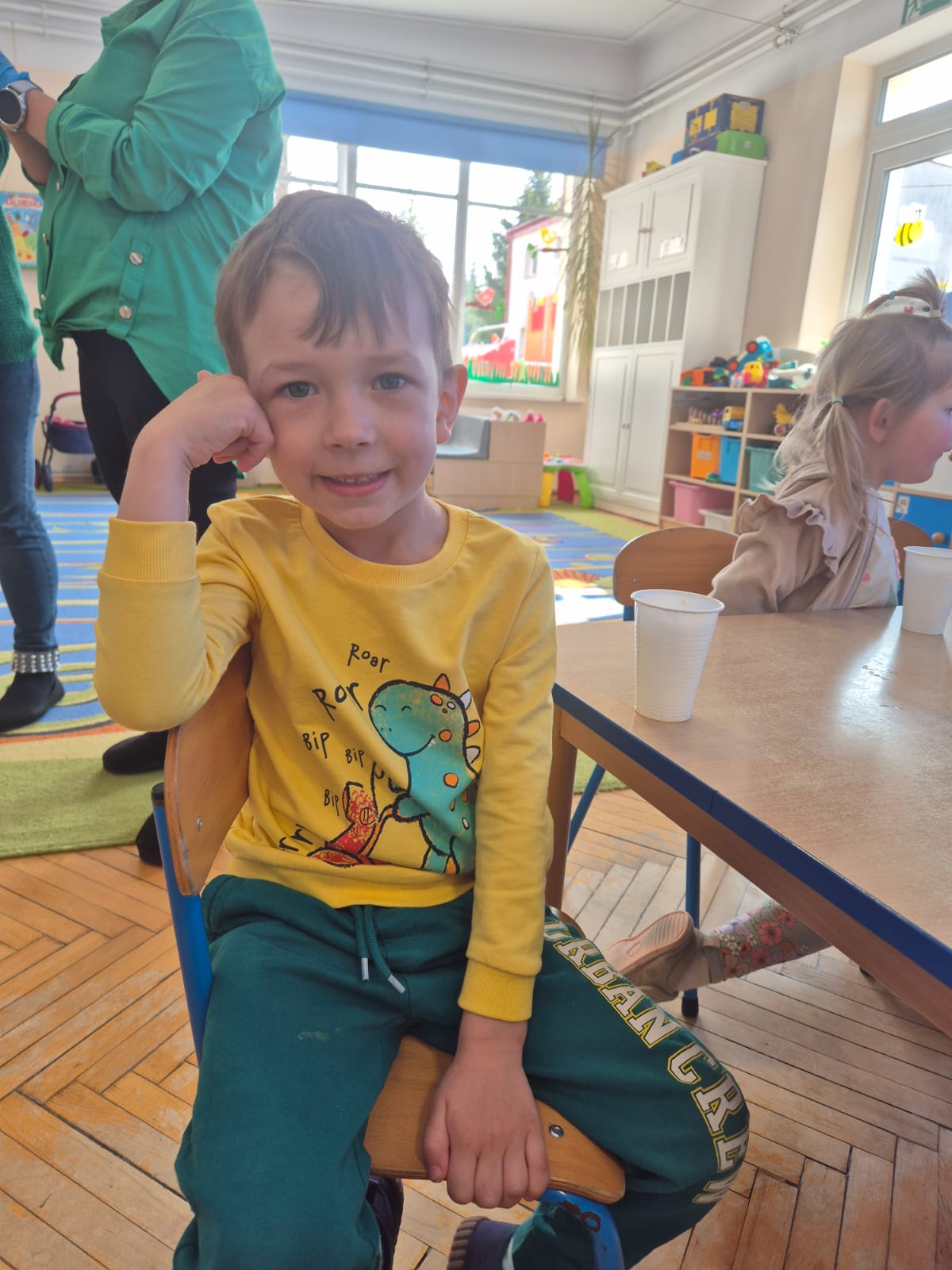 Dziś radośnie powitaliśmy długo wyczekiwaną wiosnę! Już od samego rana na dzieci czekało wyjątkowe zadanie. Przed wejściem do przedszkola, wspólnie z rodzicami, musiały wykonać polecenie: „Kontrola wiosenna – nie ma wiosny bez pląsania, zatańcz chwilę bez gadania!”. Wszyscy spisali się znakomicie i z uśmiechem rozpoczęli dzień. Następnie każda grupa zaprezentowała się, śpiewając wiosenną piosenkę oraz recytując wierszyk o wiośnie. Było kolorowo, radośnie i bardzo muzycznie! Kolejną atrakcją było wspólne przygotowanie pysznego, wiosennego soczku, który wszystkim bardzo smakował. Po nim wybraliśmy się na spacer z Marzanną oraz Panią Zimą, którą symbolicznie pożegnaliśmy, robiąc miejsce dla nowej pory roku. Nawet nasze posiłki – śniadanie, obiad i podwieczorek – miały dziś wiosenne kolory: zielony i żółty, tak jak ubrania, w które wszyscy byliśmy ubrani. Na zakończenie dnia każde dziecko otrzymało od Pani Wiosny słodki upominek – czekoladę z wiosennym wierszykiem i kwiatuszkiem. To był dzień pełen radości, zabawy i prawdziwie wiosennej atmosfery!