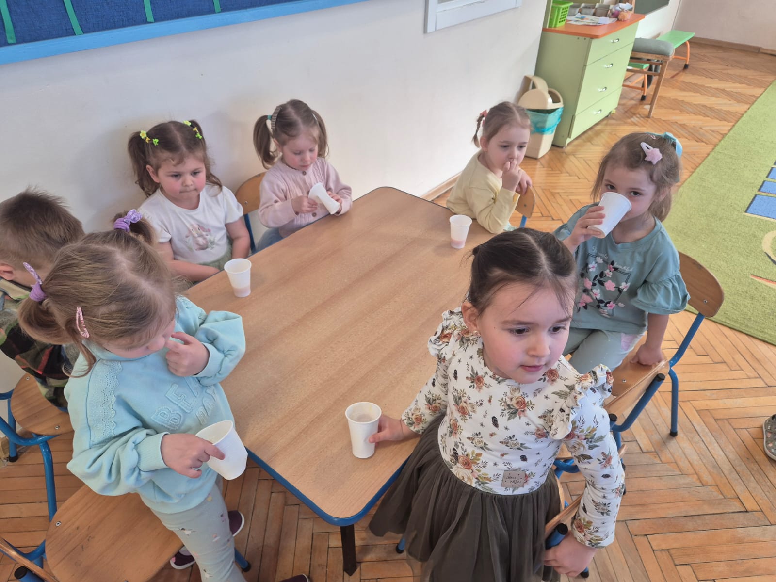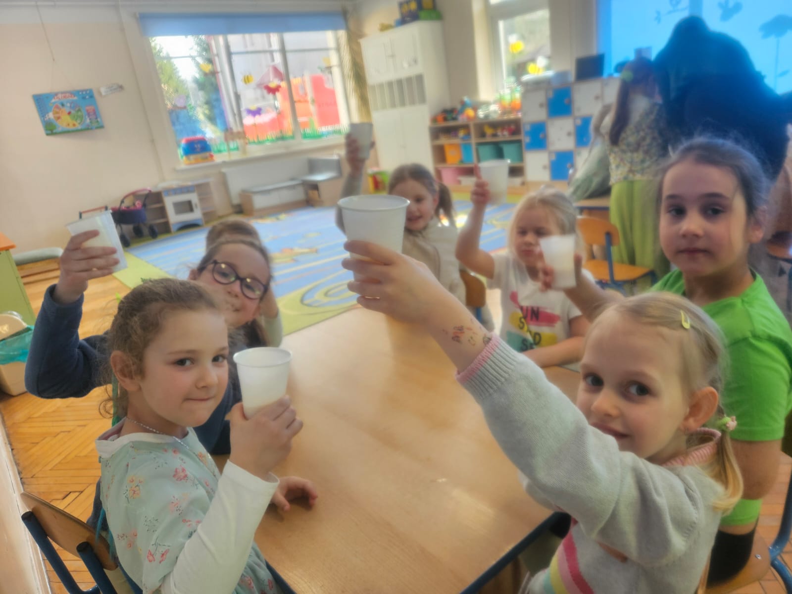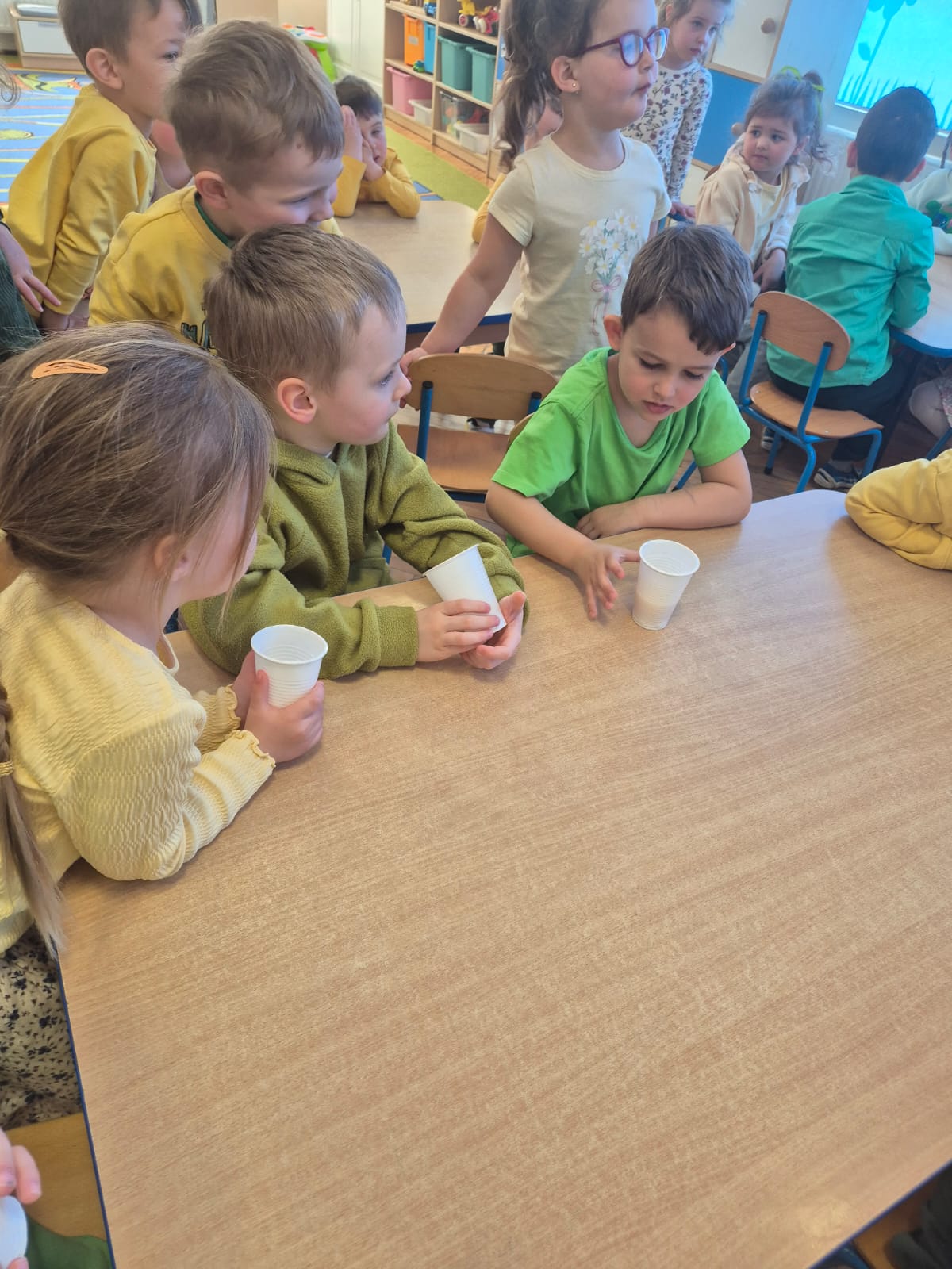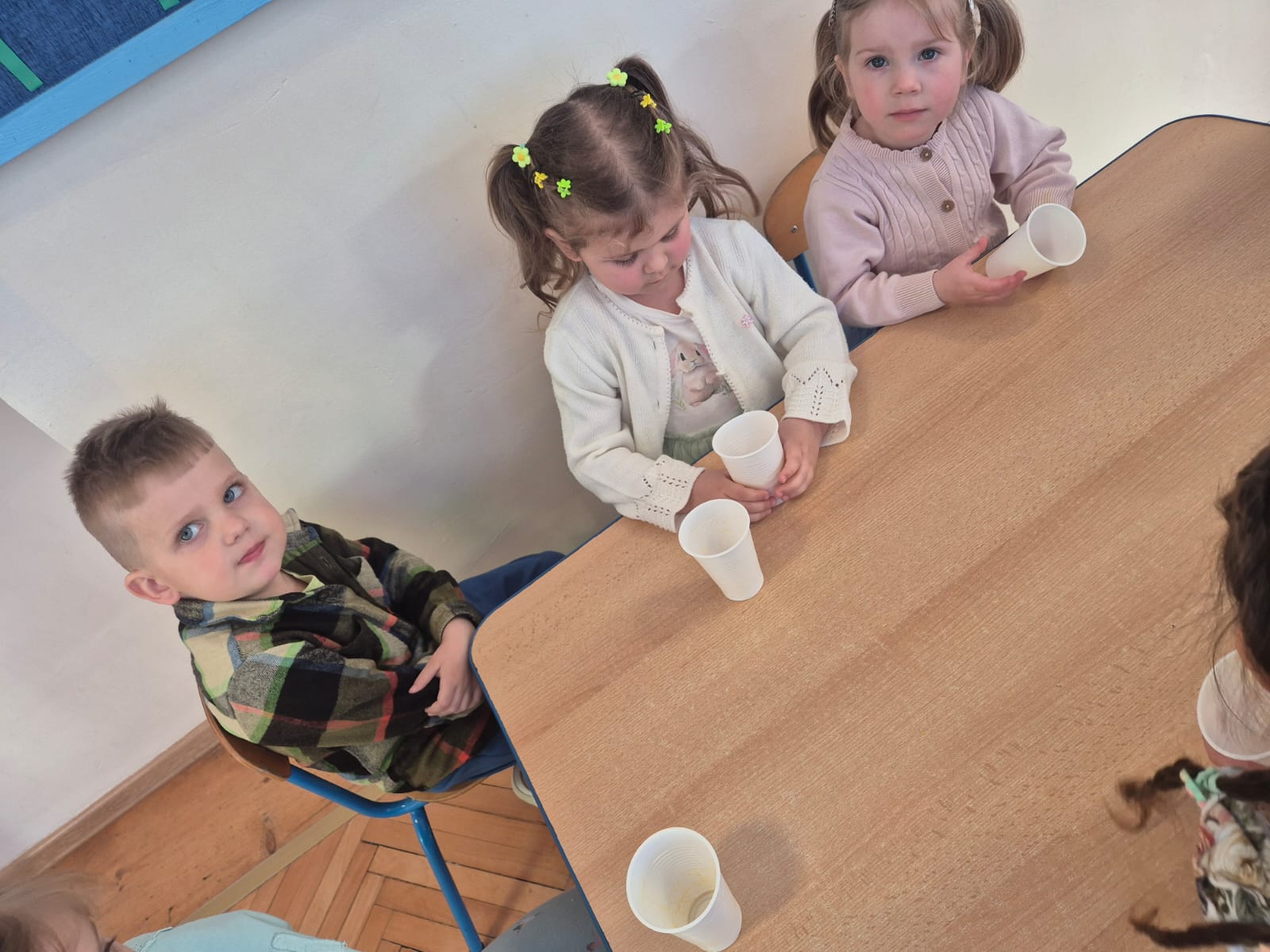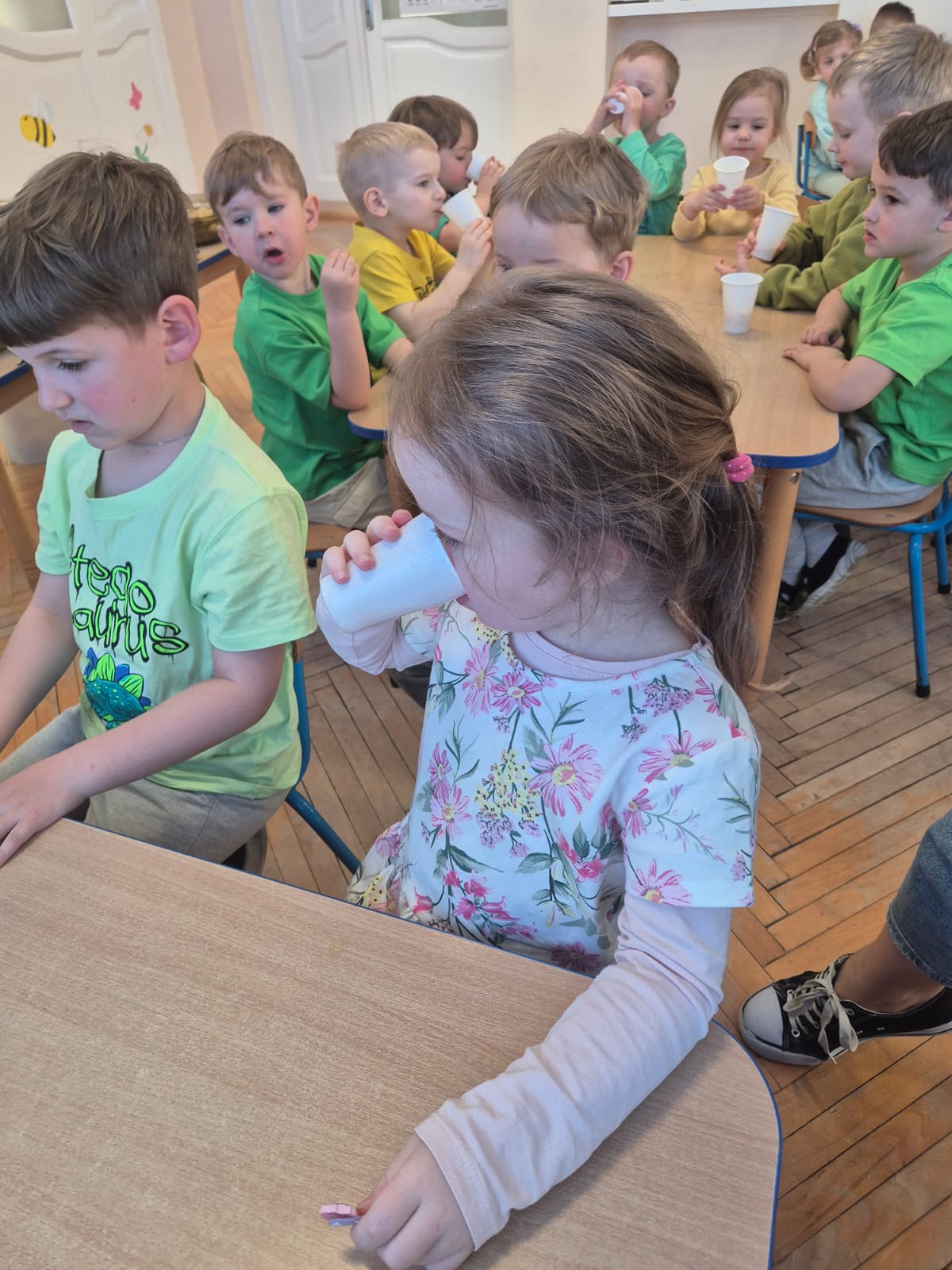 Dziś radośnie powitaliśmy długo wyczekiwaną wiosnę! Już od samego rana na dzieci czekało wyjątkowe zadanie. Przed wejściem do przedszkola, wspólnie z rodzicami, musiały wykonać polecenie: „Kontrola wiosenna – nie ma wiosny bez pląsania, zatańcz chwilę bez gadania!”. Wszyscy spisali się znakomicie i z uśmiechem rozpoczęli dzień. Następnie każda grupa zaprezentowała się, śpiewając wiosenną piosenkę oraz recytując wierszyk o wiośnie. Było kolorowo, radośnie i bardzo muzycznie! Kolejną atrakcją było wspólne przygotowanie pysznego, wiosennego soczku, który wszystkim bardzo smakował. Po nim wybraliśmy się na spacer z Marzanną oraz Panią Zimą, którą symbolicznie pożegnaliśmy, robiąc miejsce dla nowej pory roku. Nawet nasze posiłki – śniadanie, obiad i podwieczorek – miały dziś wiosenne kolory: zielony i żółty, tak jak ubrania, w które wszyscy byliśmy ubrani. Na zakończenie dnia każde dziecko otrzymało od Pani Wiosny słodki upominek – czekoladę z wiosennym wierszykiem i kwiatuszkiem. To był dzień pełen radości, zabawy i prawdziwie wiosennej atmosfery!