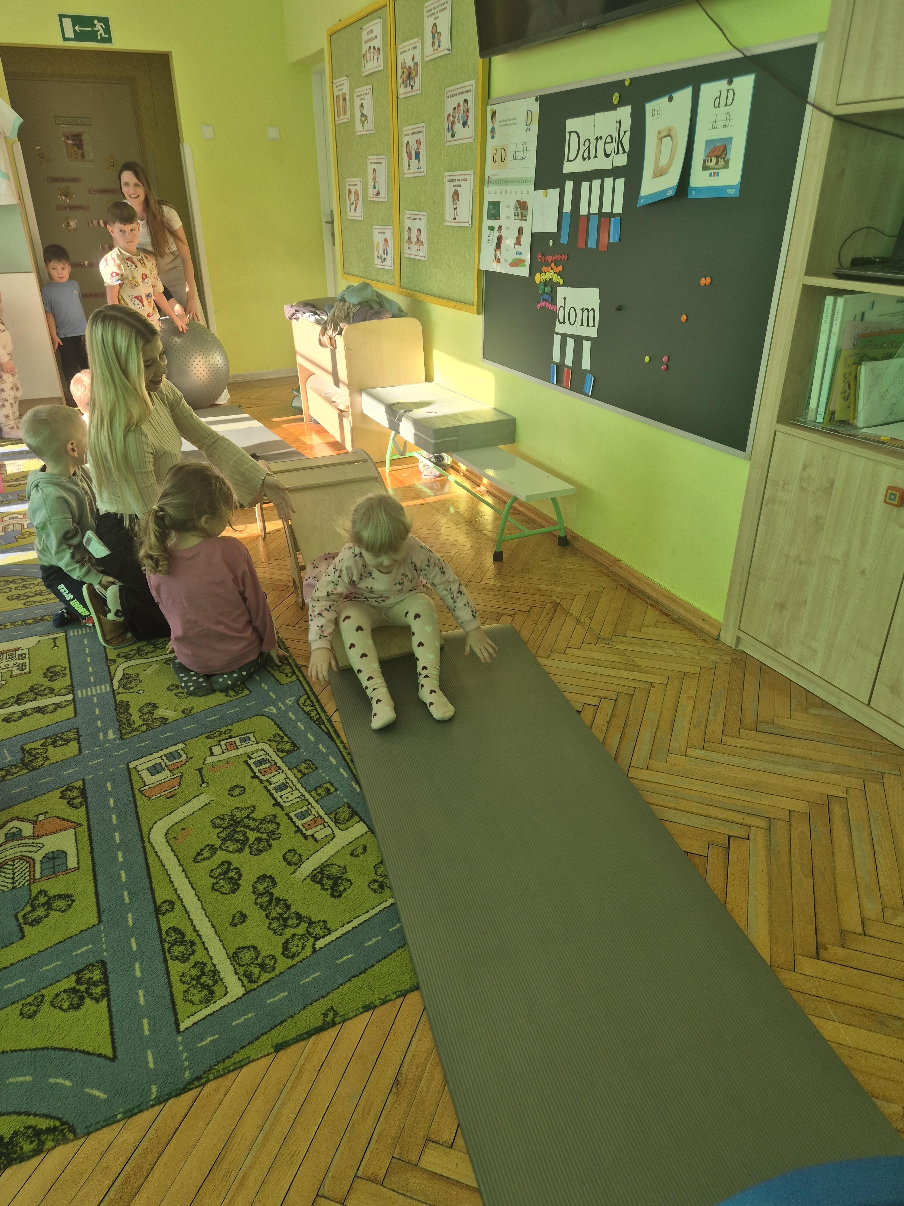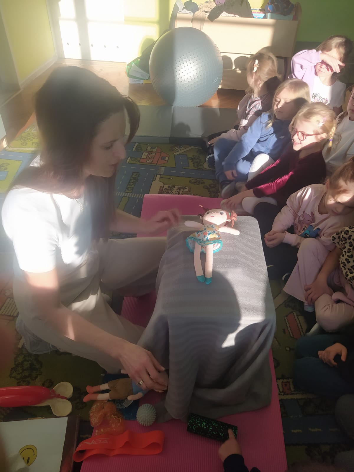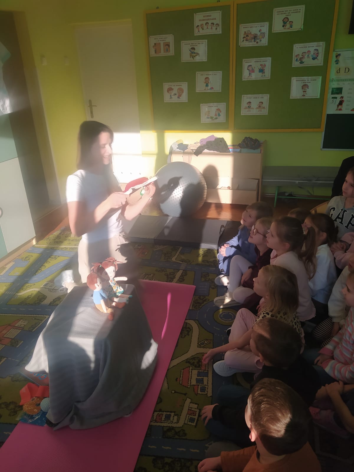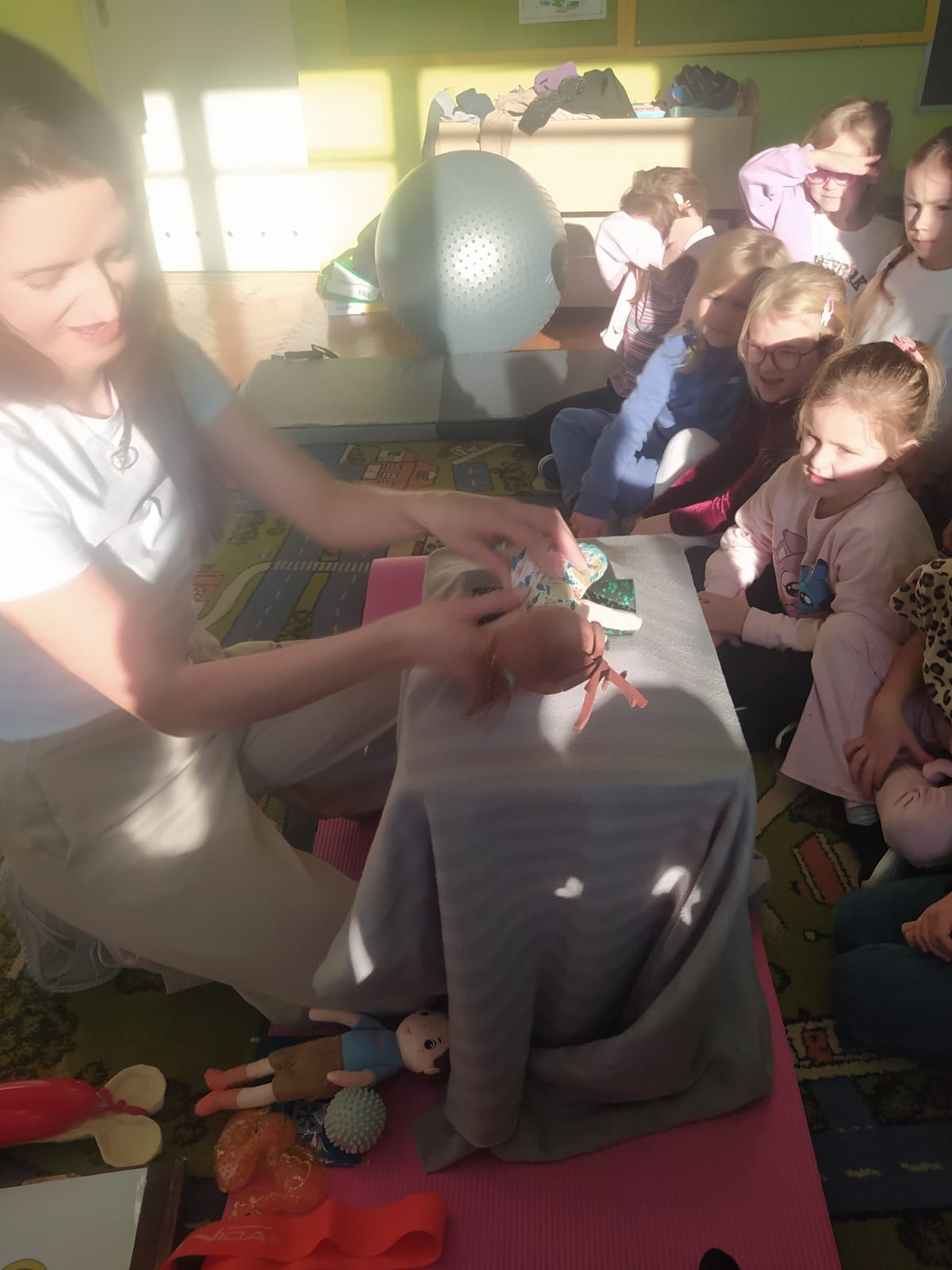 W piątek 28.11 nasze przedszkole odwiedziła mama jednego z naszych przedszkolaków i fizjoterapeutka, Pani Natalia Juszczyk. Pani Natalia w bardzo interesujący sposób przedstawiła dzieciom, na czym polega praca fizjoterapeuty oraz przygotowała świetnie ćwiczenia w formie toru przeszkód, które sprawiły dużo radości przedszkolakom. Na koniec czekała na nas niespodzianka muzyczna, dzięki której wszyscy z uśmiechem na ustach zakończyli spotkanie. Bardzo dziękujemy naszemu Gościowi za fascynującą lekcję przeprowadzoną w przemiłej atmosferze.