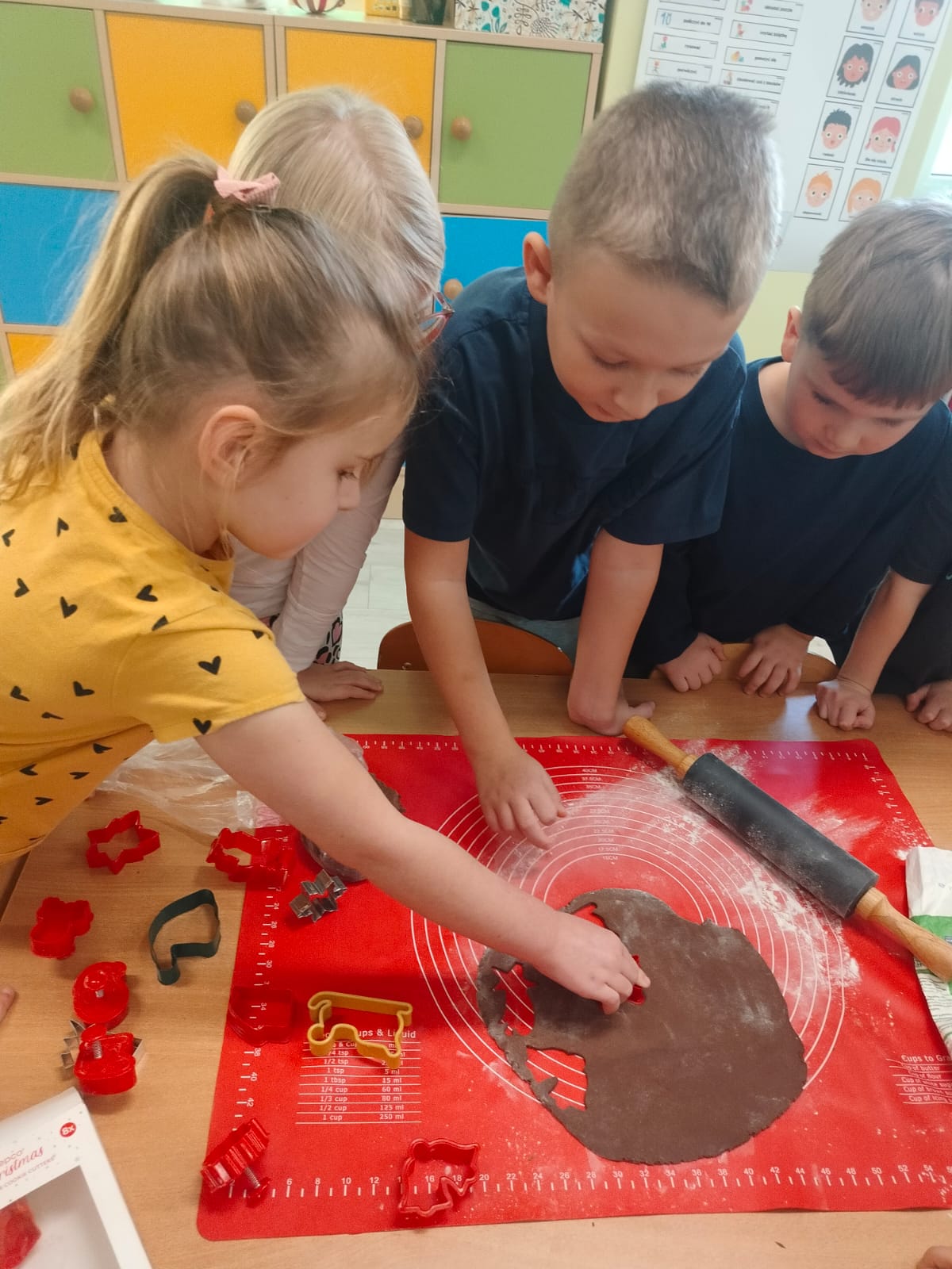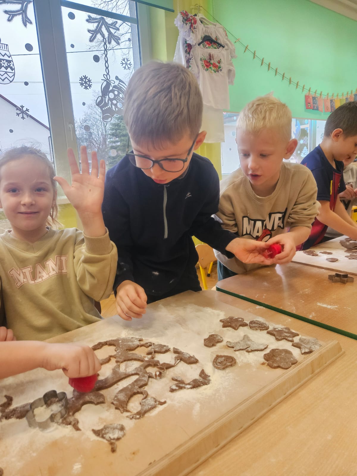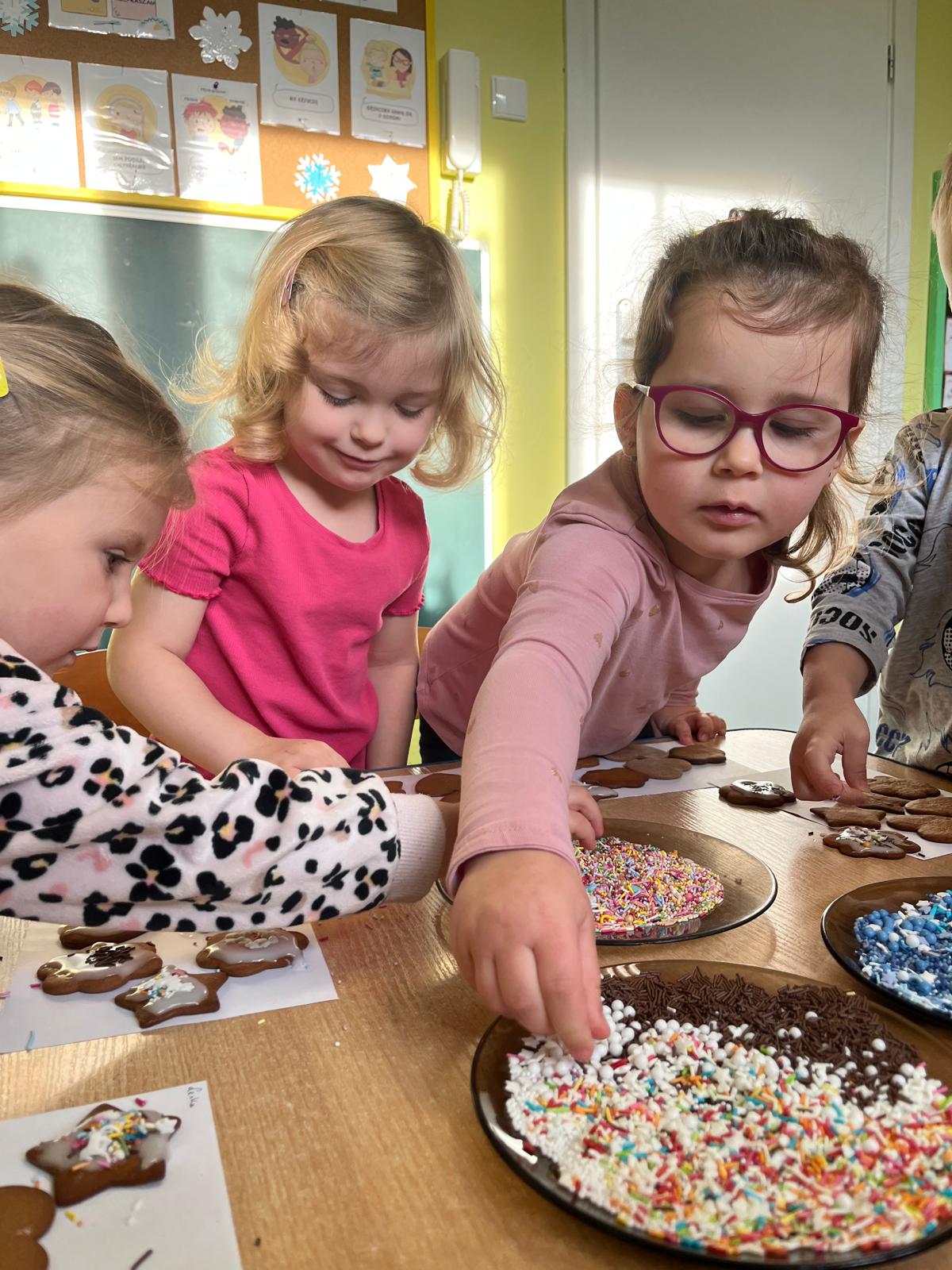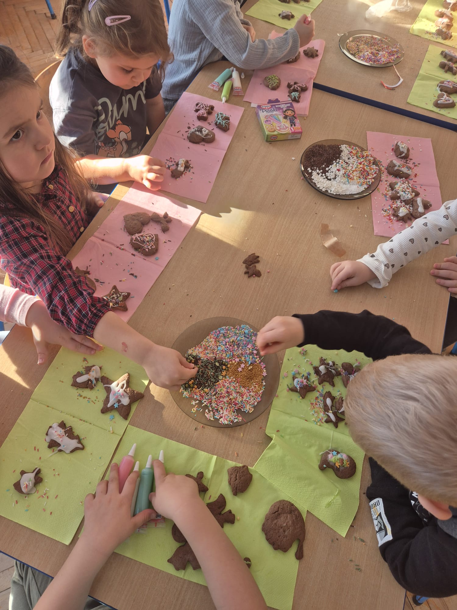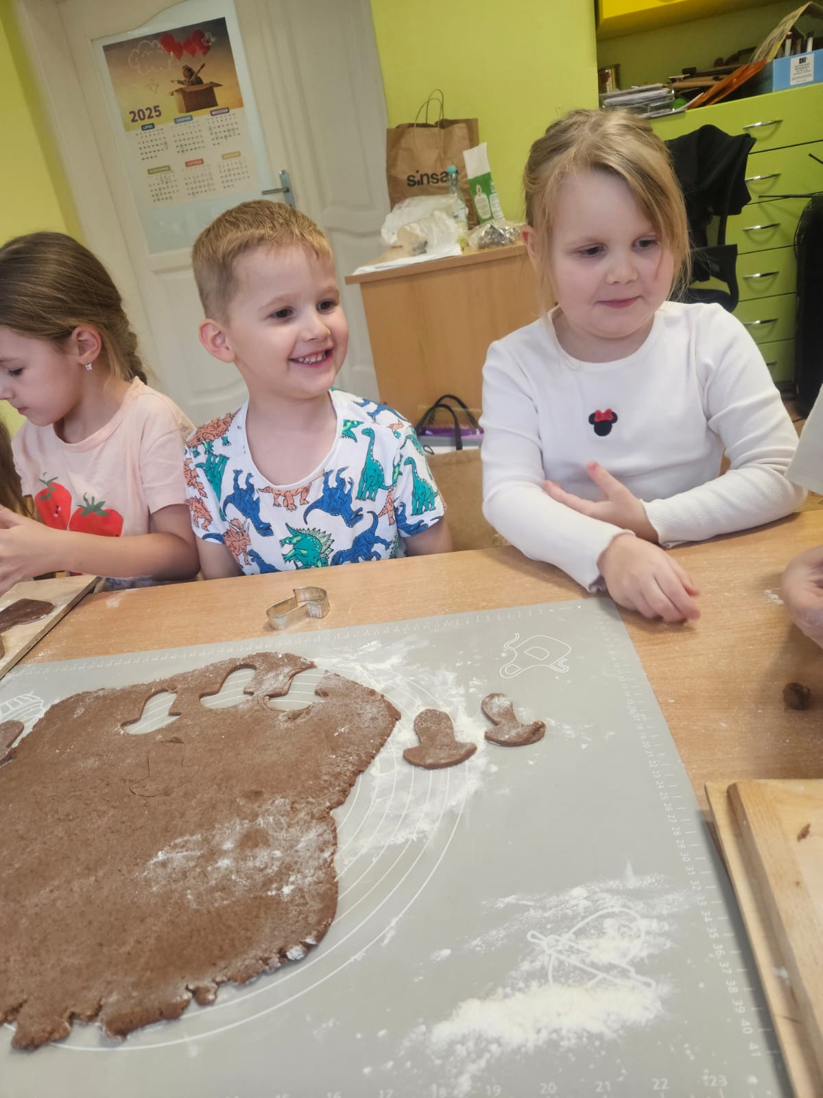 W minionym tygodniu w naszym przedszkolu odbyło się pieczenie pierniczków. Dzieci z poszczególnych grup z ogromnym zaangażowaniem brały udział w przygotowaniach – wałkowały ciasto, wykrawały pierniczki w różnych kształtach oraz ozdabiały je lukrem i kolorowymi posypkami. Zajęcia sprawiły przedszkolakom wiele radości, a jednocześnie były doskonałą okazją do rozwijania sprawności manualnej, samodzielności oraz współpracy w grupie. W całym przedszkolu unosił się przyjemny zapach korzennych przypraw, który wprowadził wszystkich w świąteczny nastrój. Wspólne pieczenie pierniczków było nie tylko świetną zabawą, ale również cennym doświadczeniem edukacyjnym.