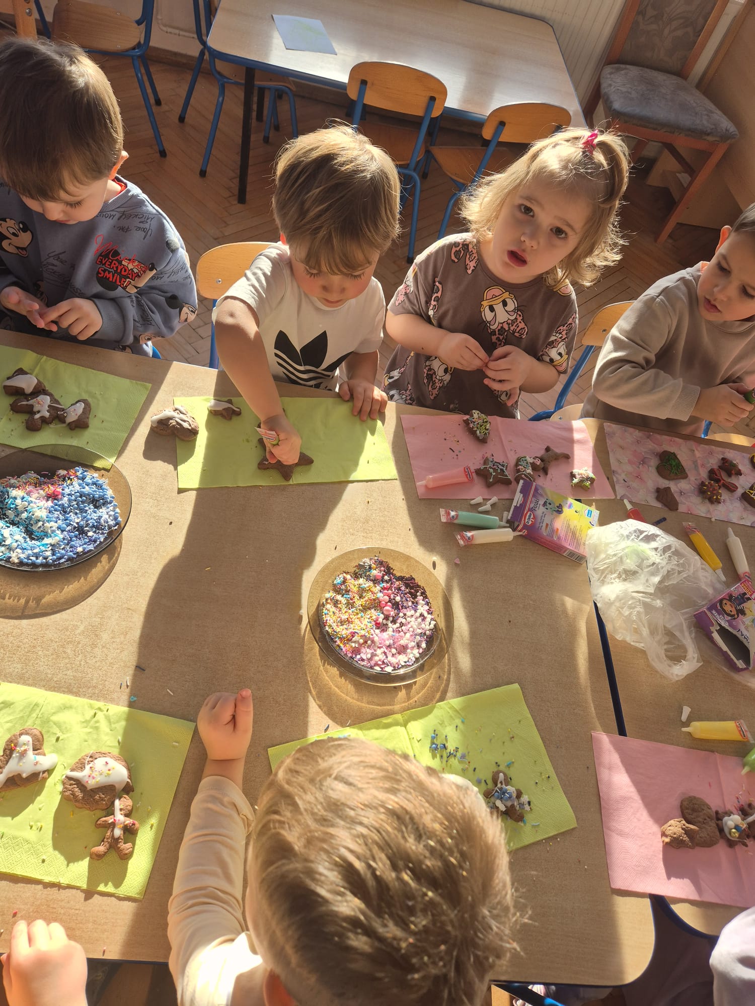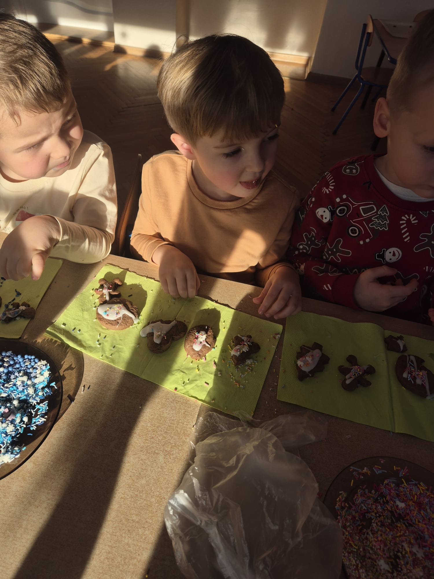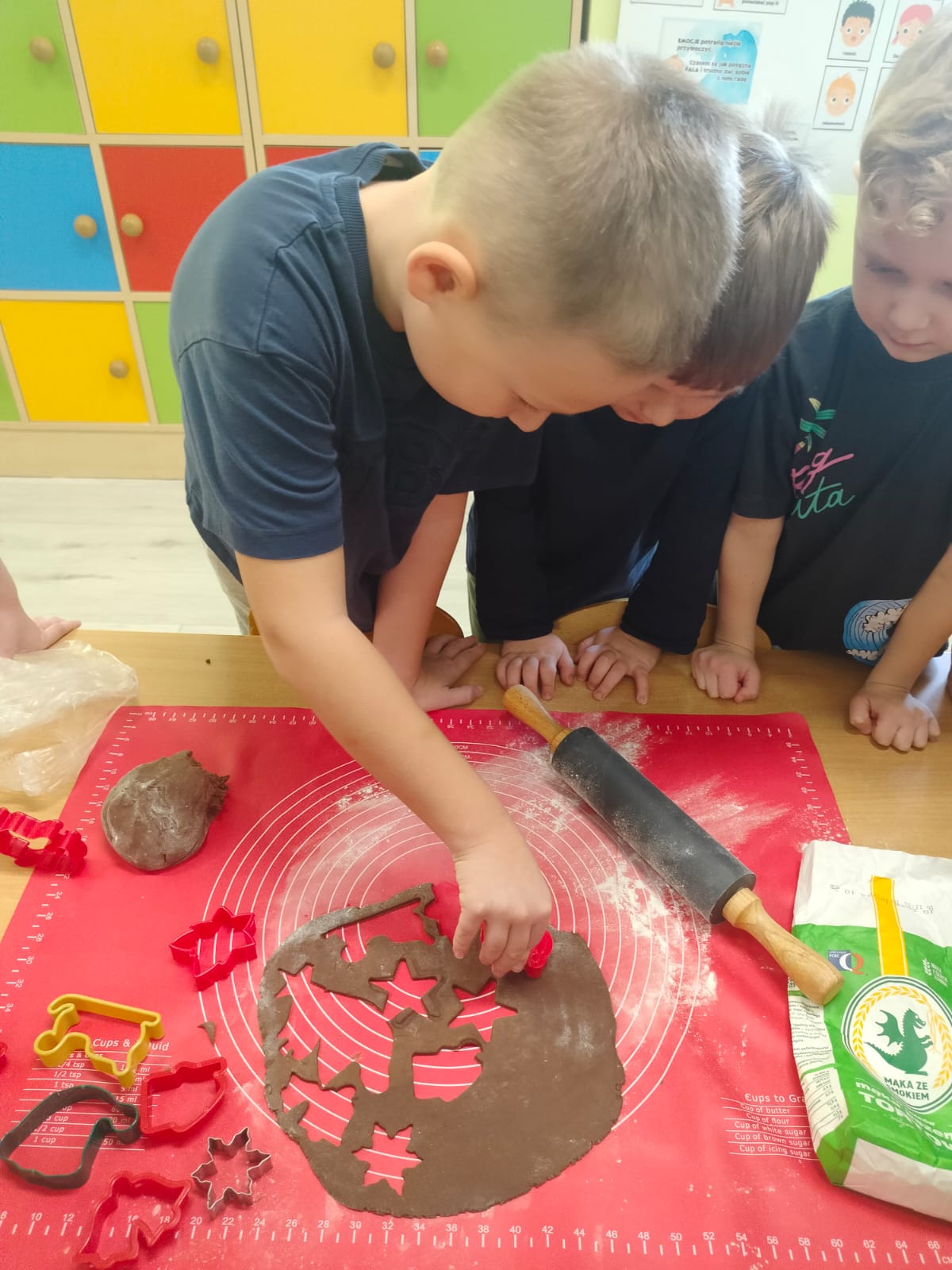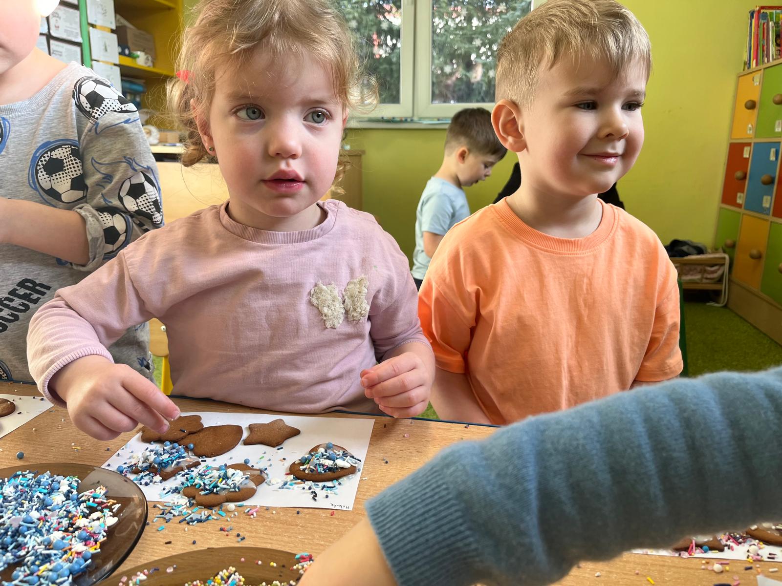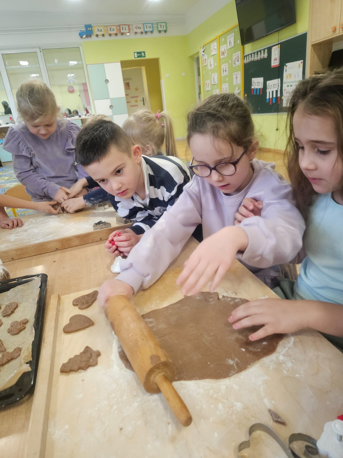 W minionym tygodniu w naszym przedszkolu odbyło się pieczenie pierniczków. Dzieci z poszczególnych grup z ogromnym zaangażowaniem brały udział w przygotowaniach – wałkowały ciasto, wykrawały pierniczki w różnych kształtach oraz ozdabiały je lukrem i kolorowymi posypkami. Zajęcia sprawiły przedszkolakom wiele radości, a jednocześnie były doskonałą okazją do rozwijania sprawności manualnej, samodzielności oraz współpracy w grupie. W całym przedszkolu unosił się przyjemny zapach korzennych przypraw, który wprowadził wszystkich w świąteczny nastrój. Wspólne pieczenie pierniczków było nie tylko świetną zabawą, ale również cennym doświadczeniem edukacyjnym.
