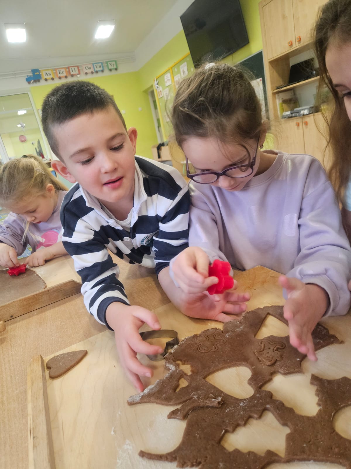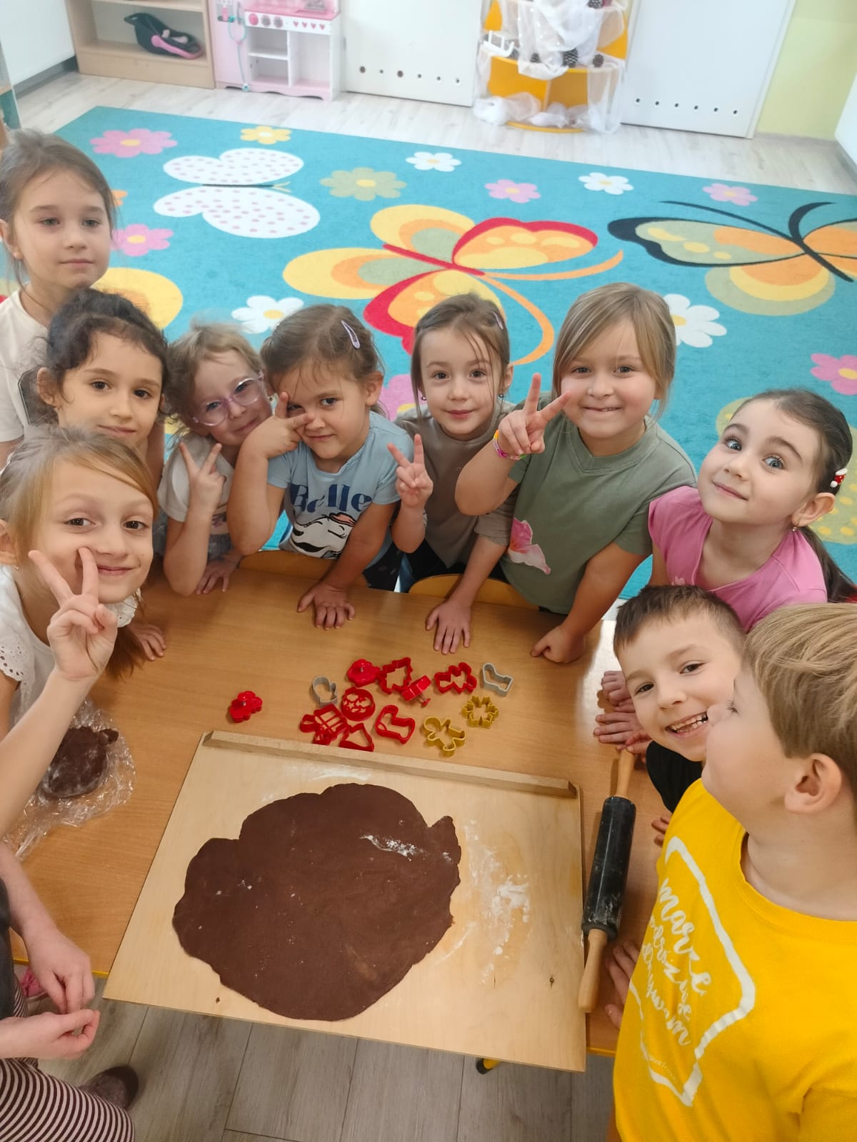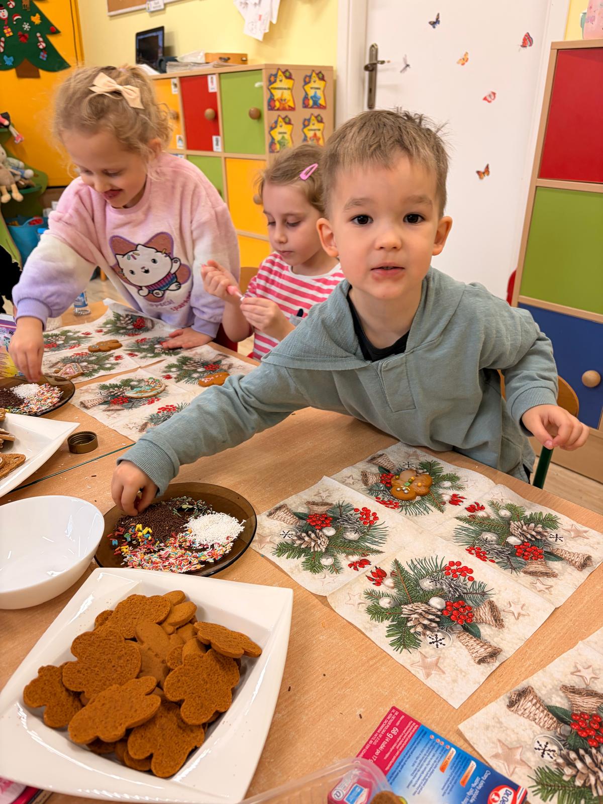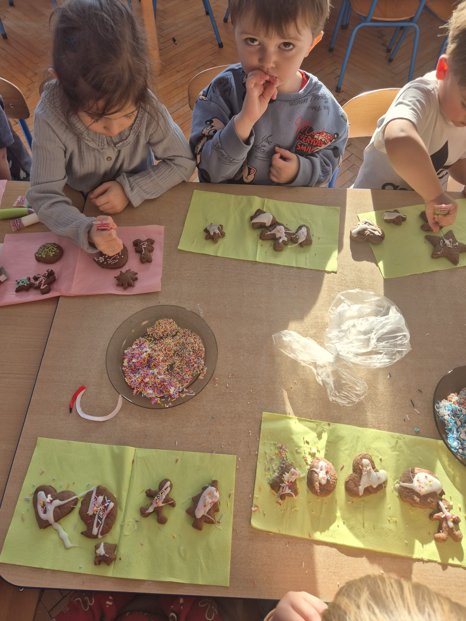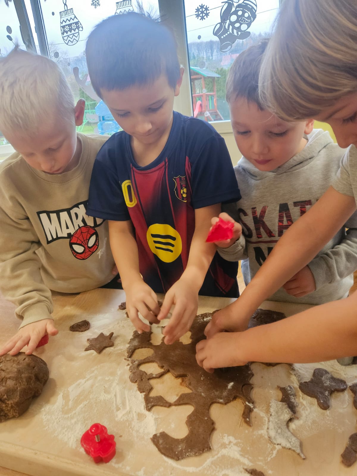 W minionym tygodniu w naszym przedszkolu odbyło się pieczenie pierniczków. Dzieci z poszczególnych grup z ogromnym zaangażowaniem brały udział w przygotowaniach – wałkowały ciasto, wykrawały pierniczki w różnych kształtach oraz ozdabiały je lukrem i kolorowymi posypkami. Zajęcia sprawiły przedszkolakom wiele radości, a jednocześnie były doskonałą okazją do rozwijania sprawności manualnej, samodzielności oraz współpracy w grupie. W całym przedszkolu unosił się przyjemny zapach korzennych przypraw, który wprowadził wszystkich w świąteczny nastrój. Wspólne pieczenie pierniczków było nie tylko świetną zabawą, ale również cennym doświadczeniem edukacyjnym.