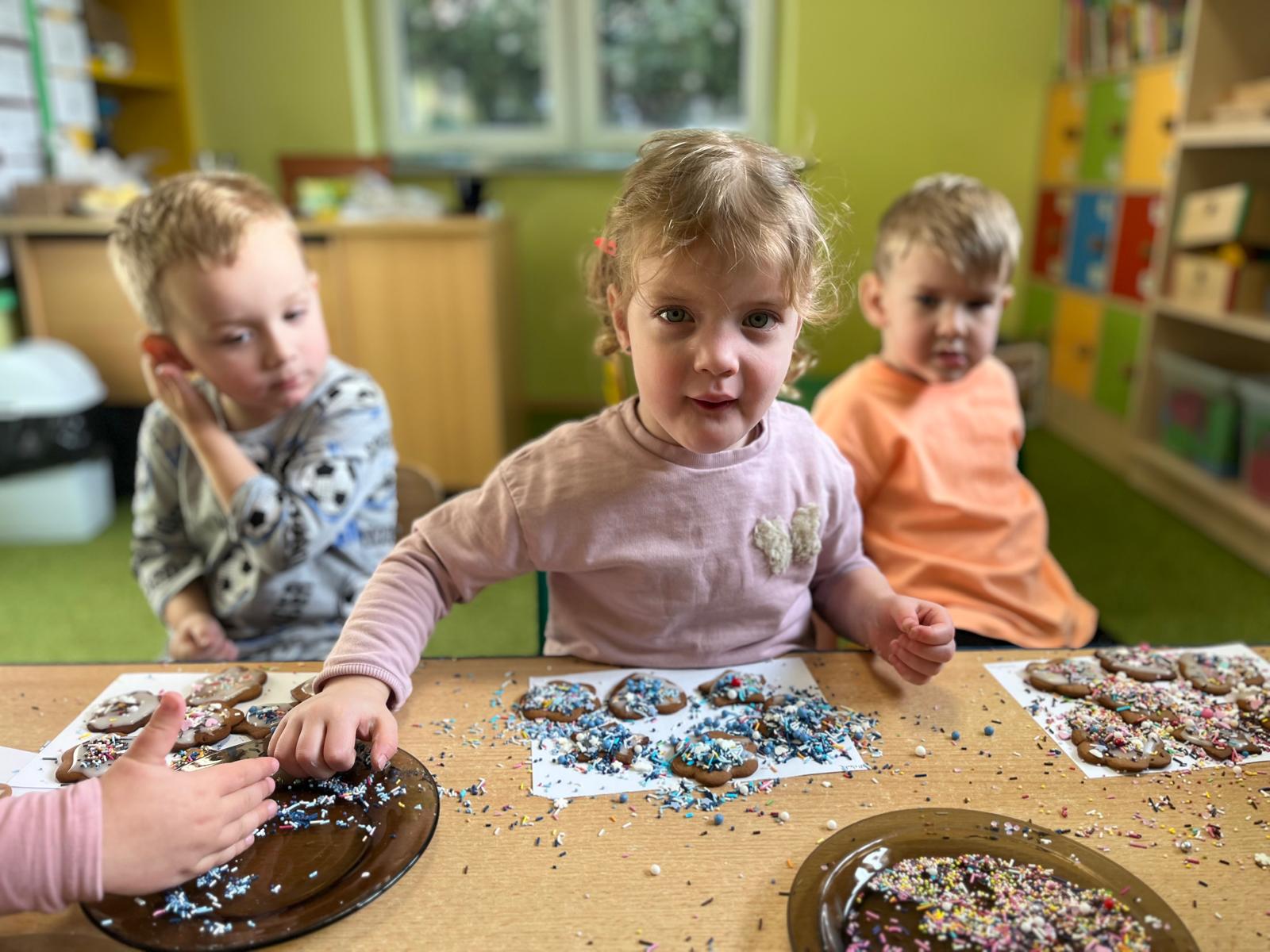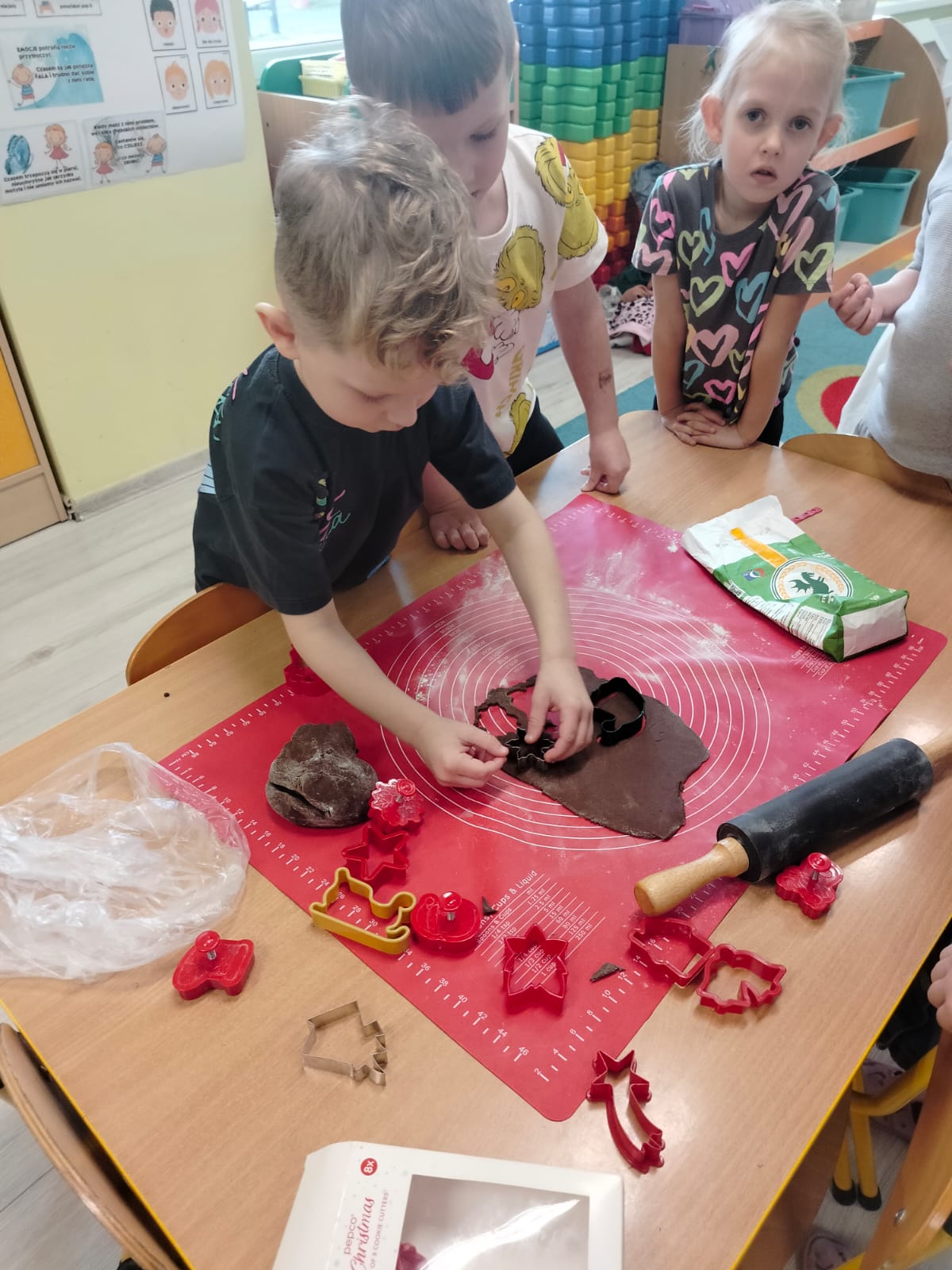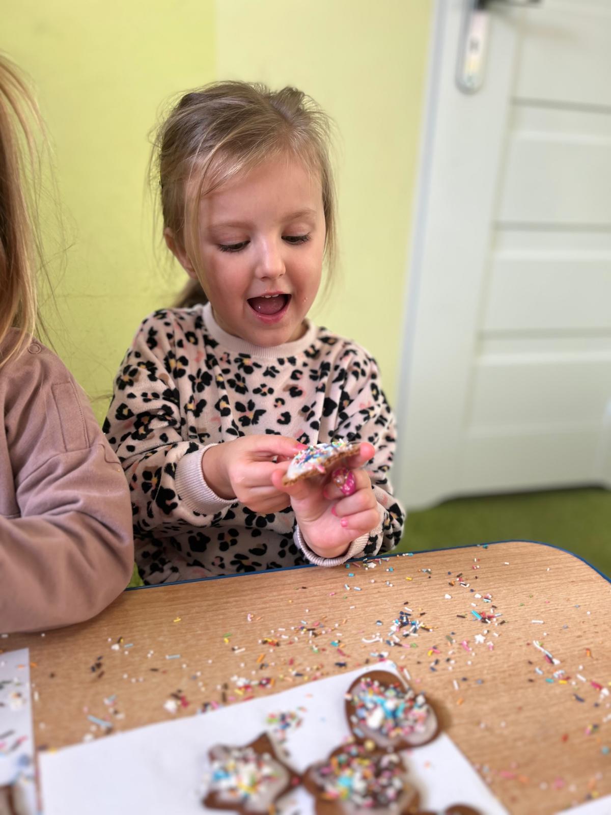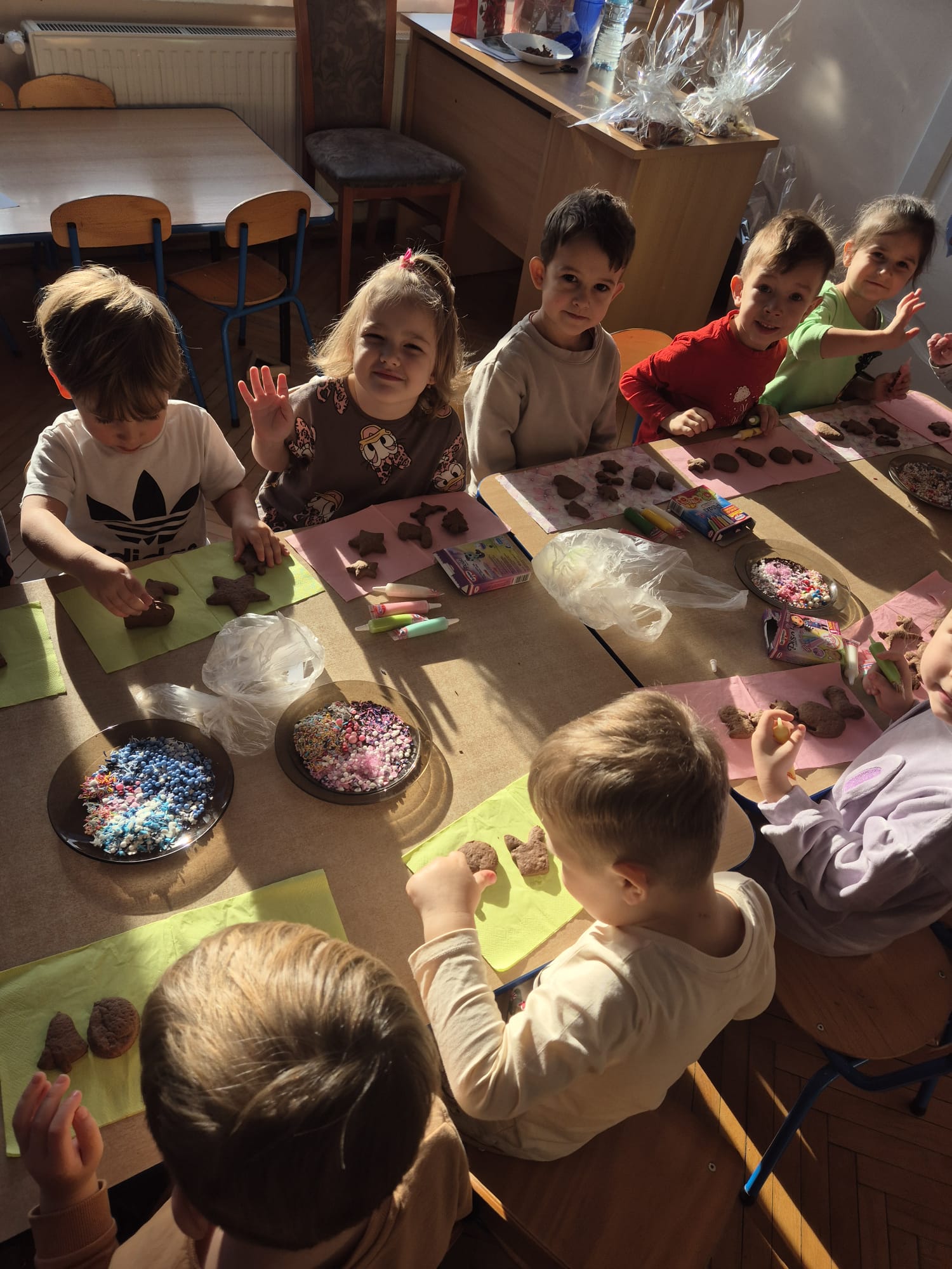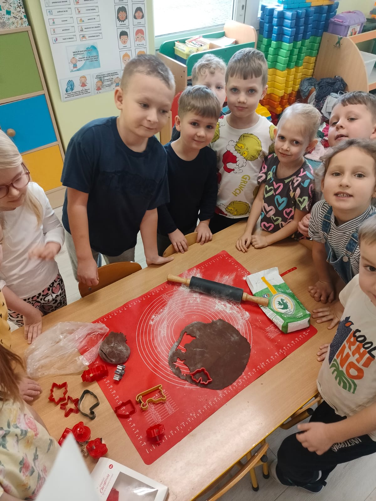 W minionym tygodniu w naszym przedszkolu odbyło się pieczenie pierniczków. Dzieci z poszczególnych grup z ogromnym zaangażowaniem brały udział w przygotowaniach – wałkowały ciasto, wykrawały pierniczki w różnych kształtach oraz ozdabiały je lukrem i kolorowymi posypkami. Zajęcia sprawiły przedszkolakom wiele radości, a jednocześnie były doskonałą okazją do rozwijania sprawności manualnej, samodzielności oraz współpracy w grupie. W całym przedszkolu unosił się przyjemny zapach korzennych przypraw, który wprowadził wszystkich w świąteczny nastrój. Wspólne pieczenie pierniczków było nie tylko świetną zabawą, ale również cennym doświadczeniem edukacyjnym.