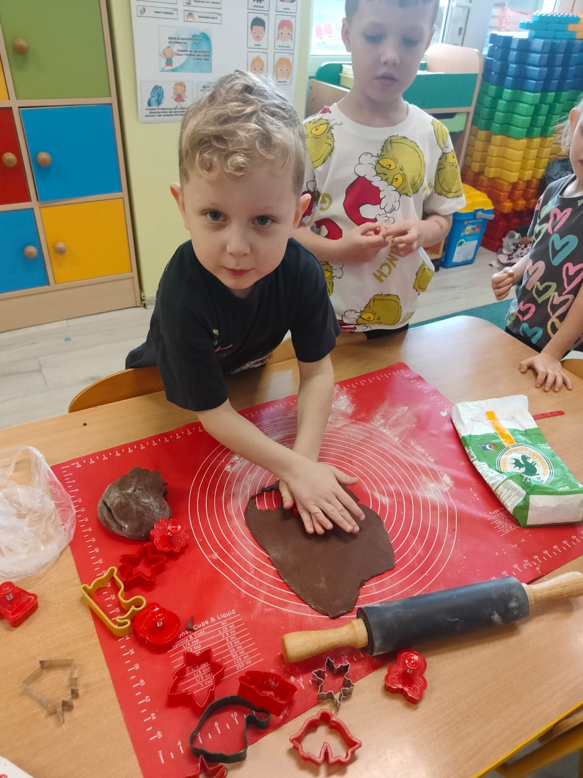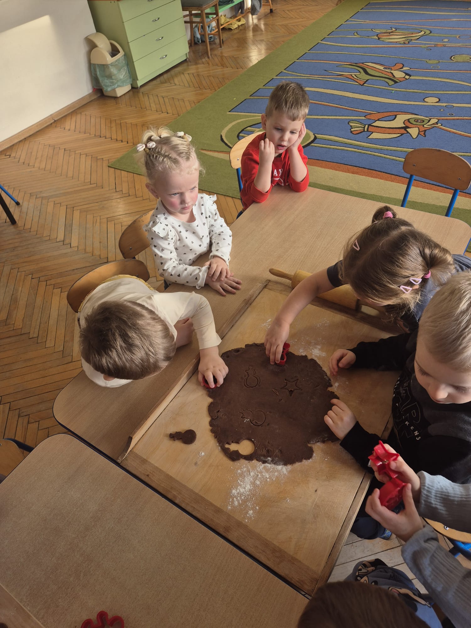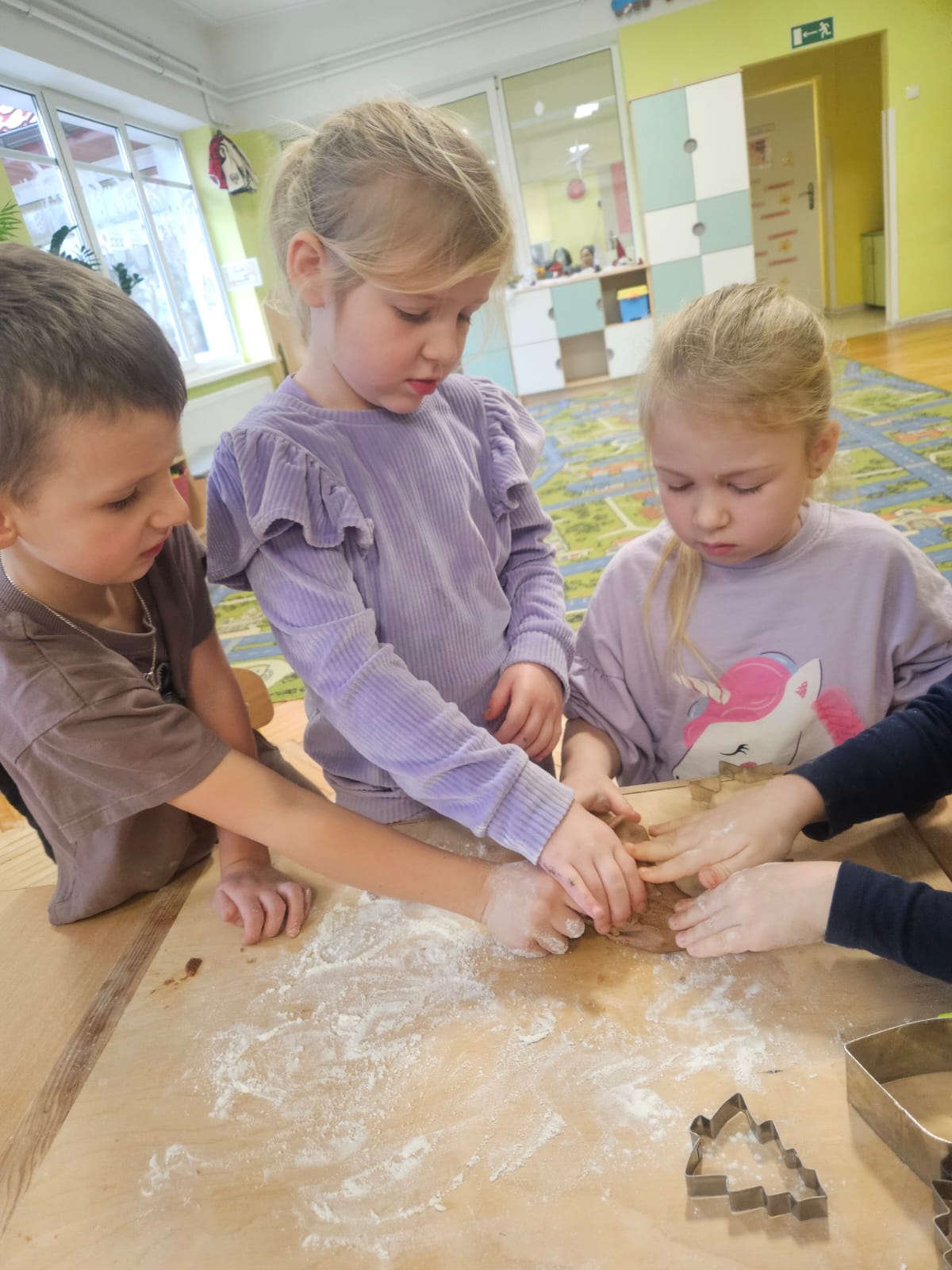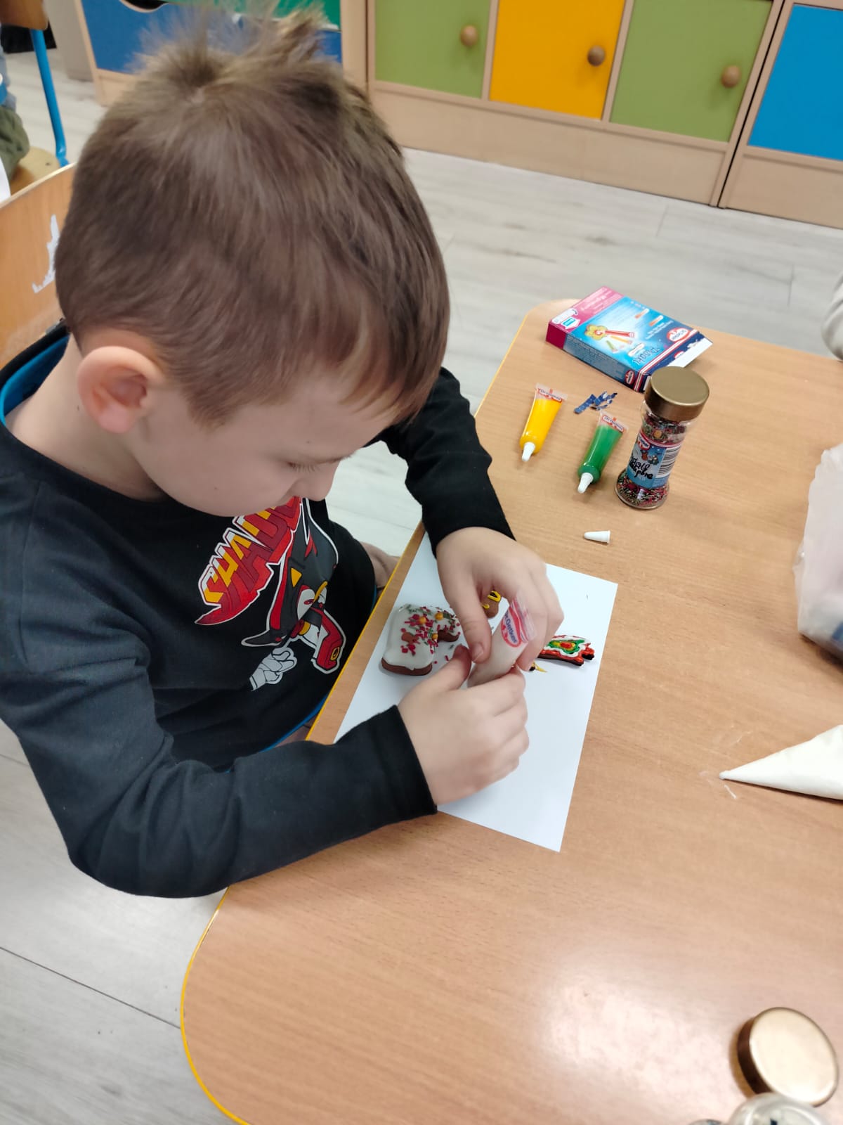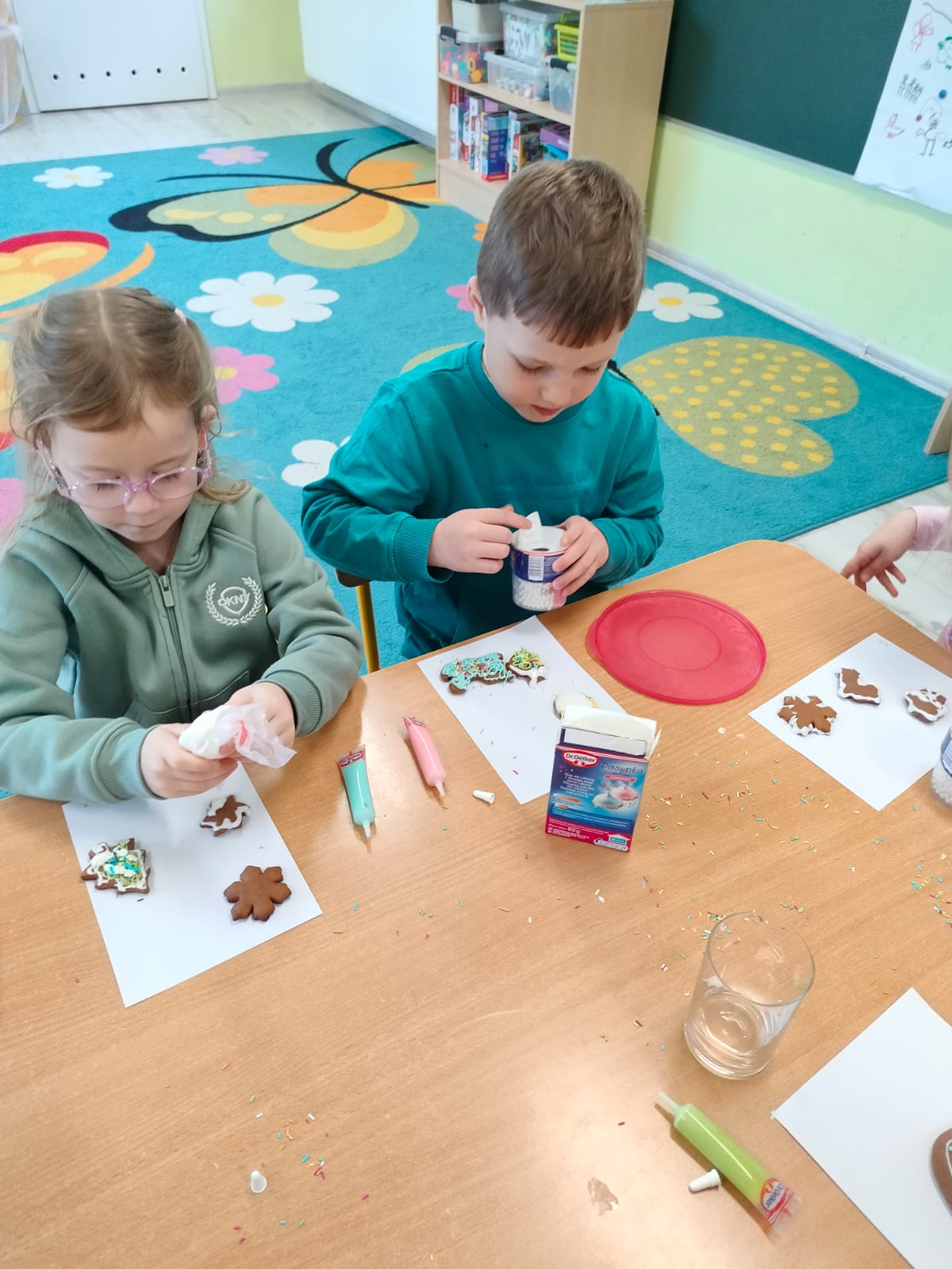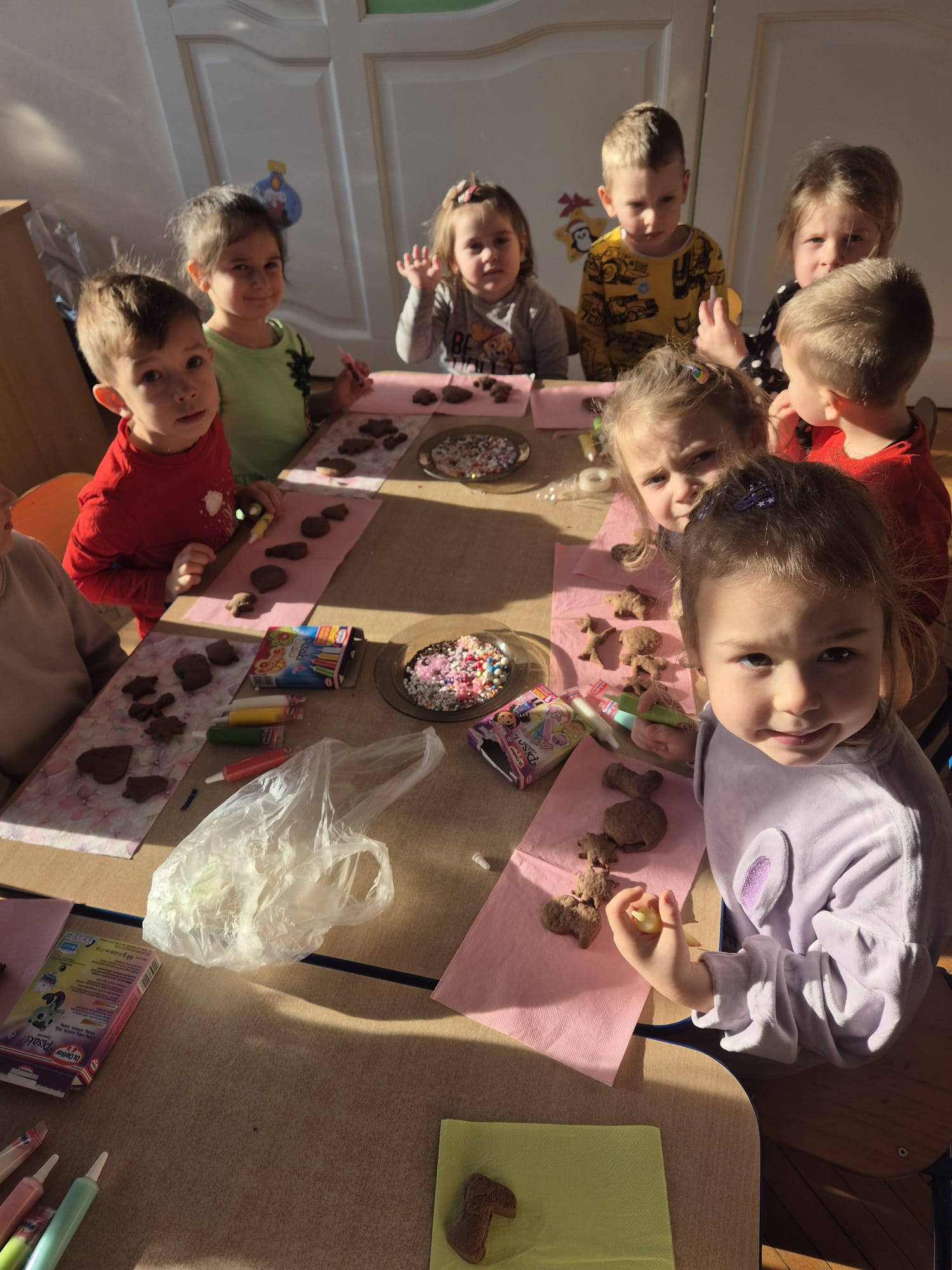 W minionym tygodniu w naszym przedszkolu odbyło się pieczenie pierniczków. Dzieci z poszczególnych grup z ogromnym zaangażowaniem brały udział w przygotowaniach – wałkowały ciasto, wykrawały pierniczki w różnych kształtach oraz ozdabiały je lukrem i kolorowymi posypkami. Zajęcia sprawiły przedszkolakom wiele radości, a jednocześnie były doskonałą okazją do rozwijania sprawności manualnej, samodzielności oraz współpracy w grupie. W całym przedszkolu unosił się przyjemny zapach korzennych przypraw, który wprowadził wszystkich w świąteczny nastrój. Wspólne pieczenie pierniczków było nie tylko świetną zabawą, ale również cennym doświadczeniem edukacyjnym.