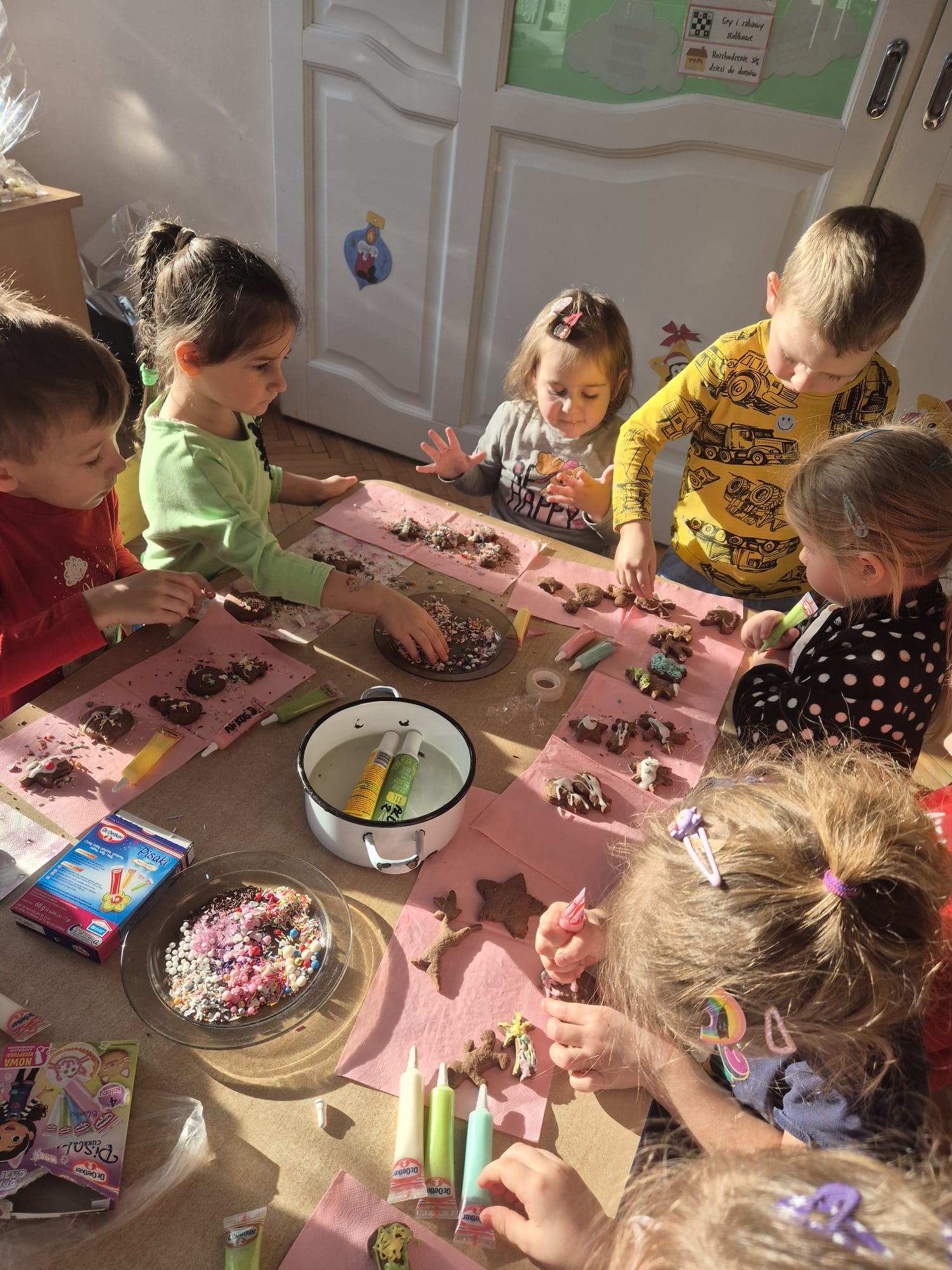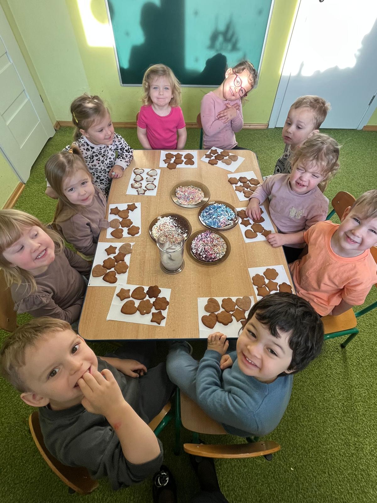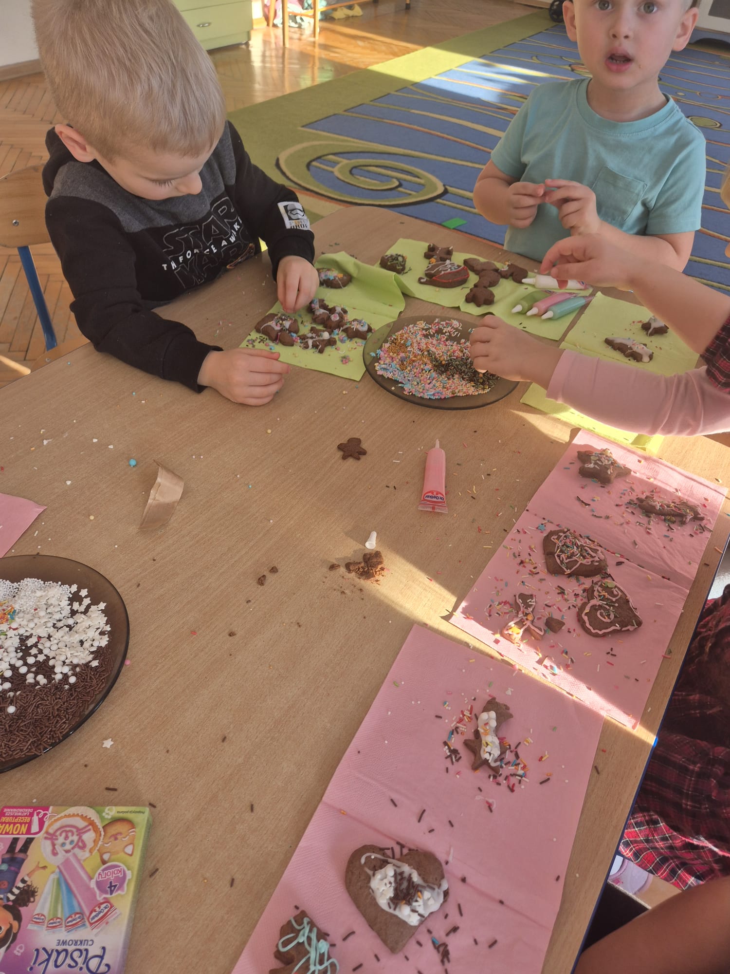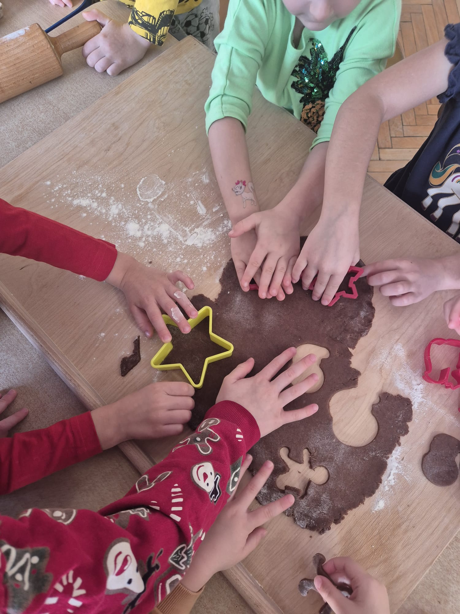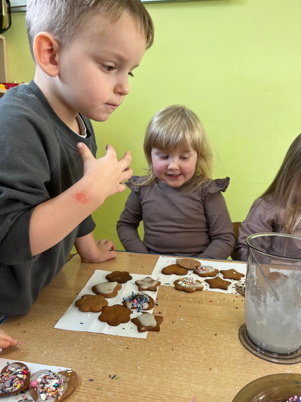 W minionym tygodniu w naszym przedszkolu odbyło się pieczenie pierniczków. Dzieci z poszczególnych grup z ogromnym zaangażowaniem brały udział w przygotowaniach – wałkowały ciasto, wykrawały pierniczki w różnych kształtach oraz ozdabiały je lukrem i kolorowymi posypkami. Zajęcia sprawiły przedszkolakom wiele radości, a jednocześnie były doskonałą okazją do rozwijania sprawności manualnej, samodzielności oraz współpracy w grupie. W całym przedszkolu unosił się przyjemny zapach korzennych przypraw, który wprowadził wszystkich w świąteczny nastrój. Wspólne pieczenie pierniczków było nie tylko świetną zabawą, ale również cennym doświadczeniem edukacyjnym.