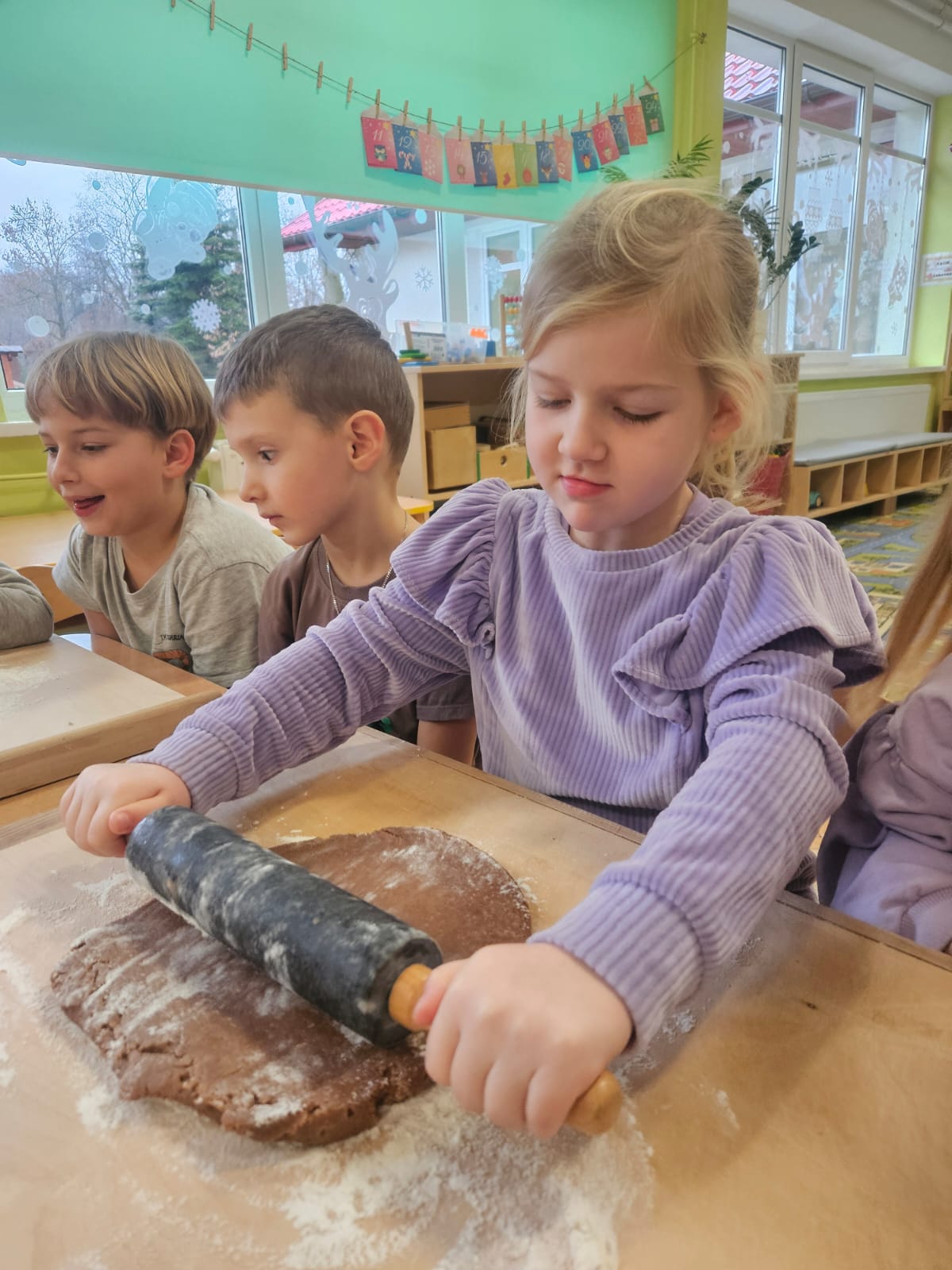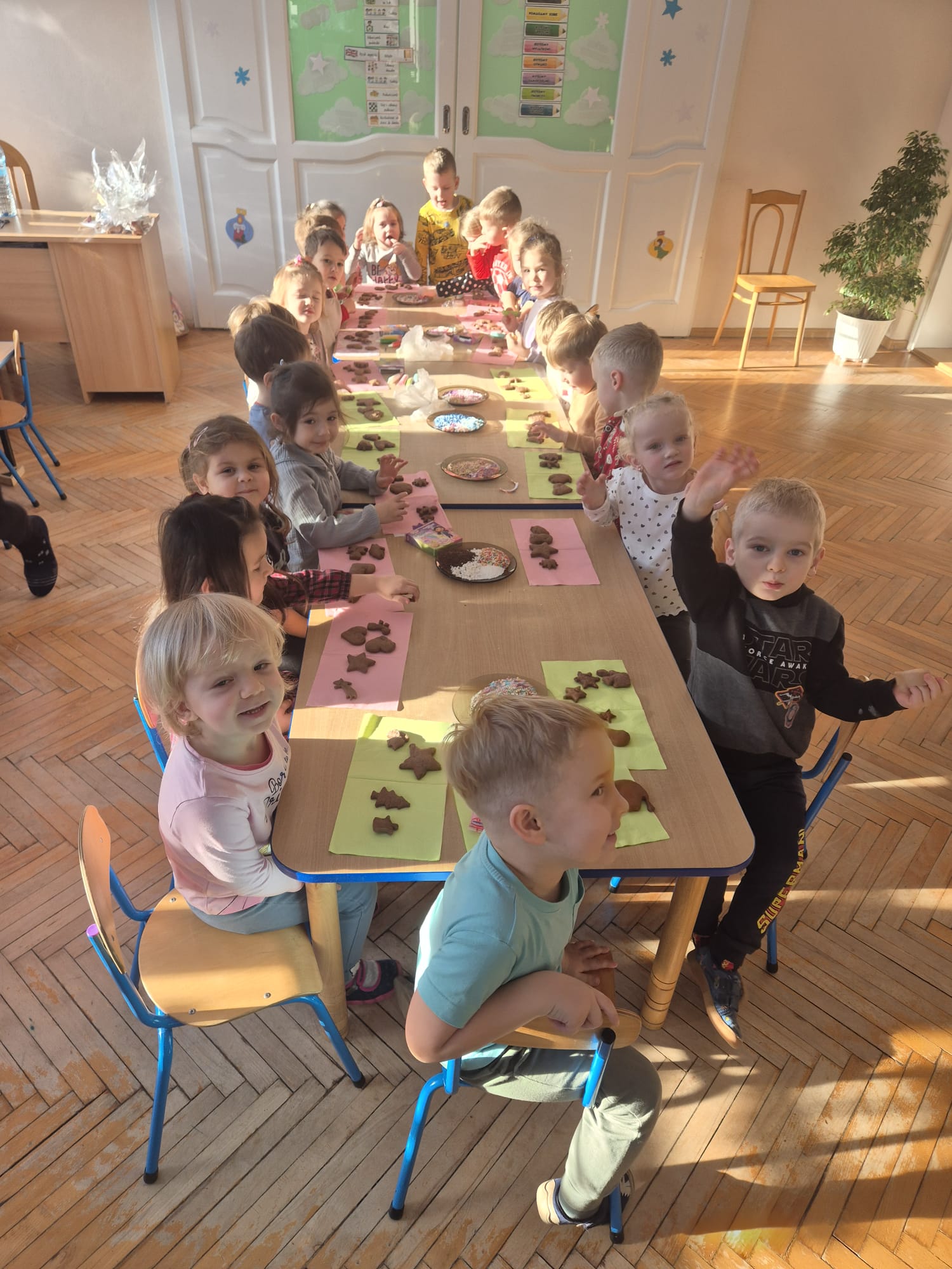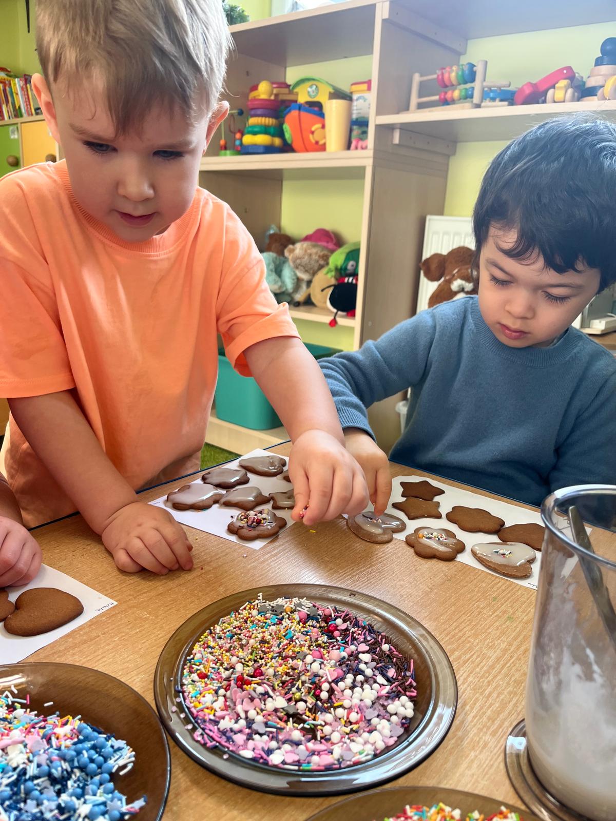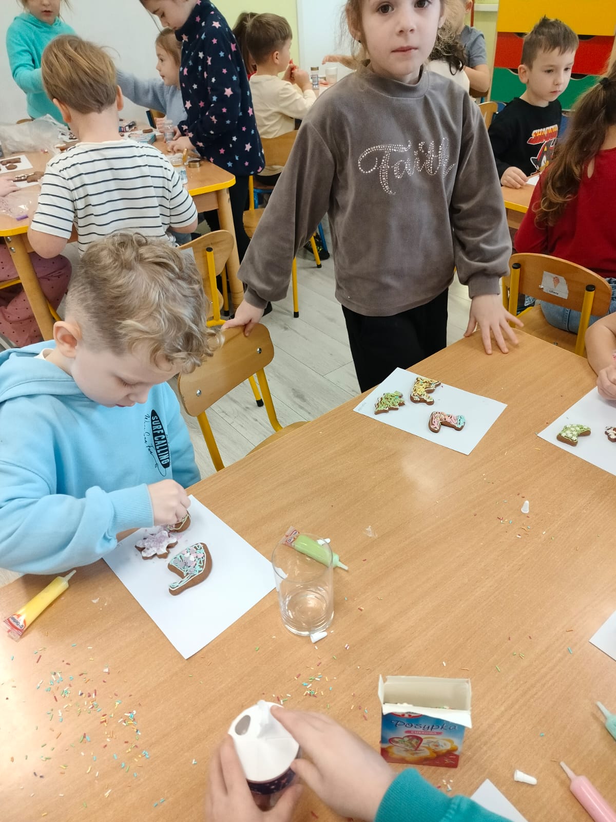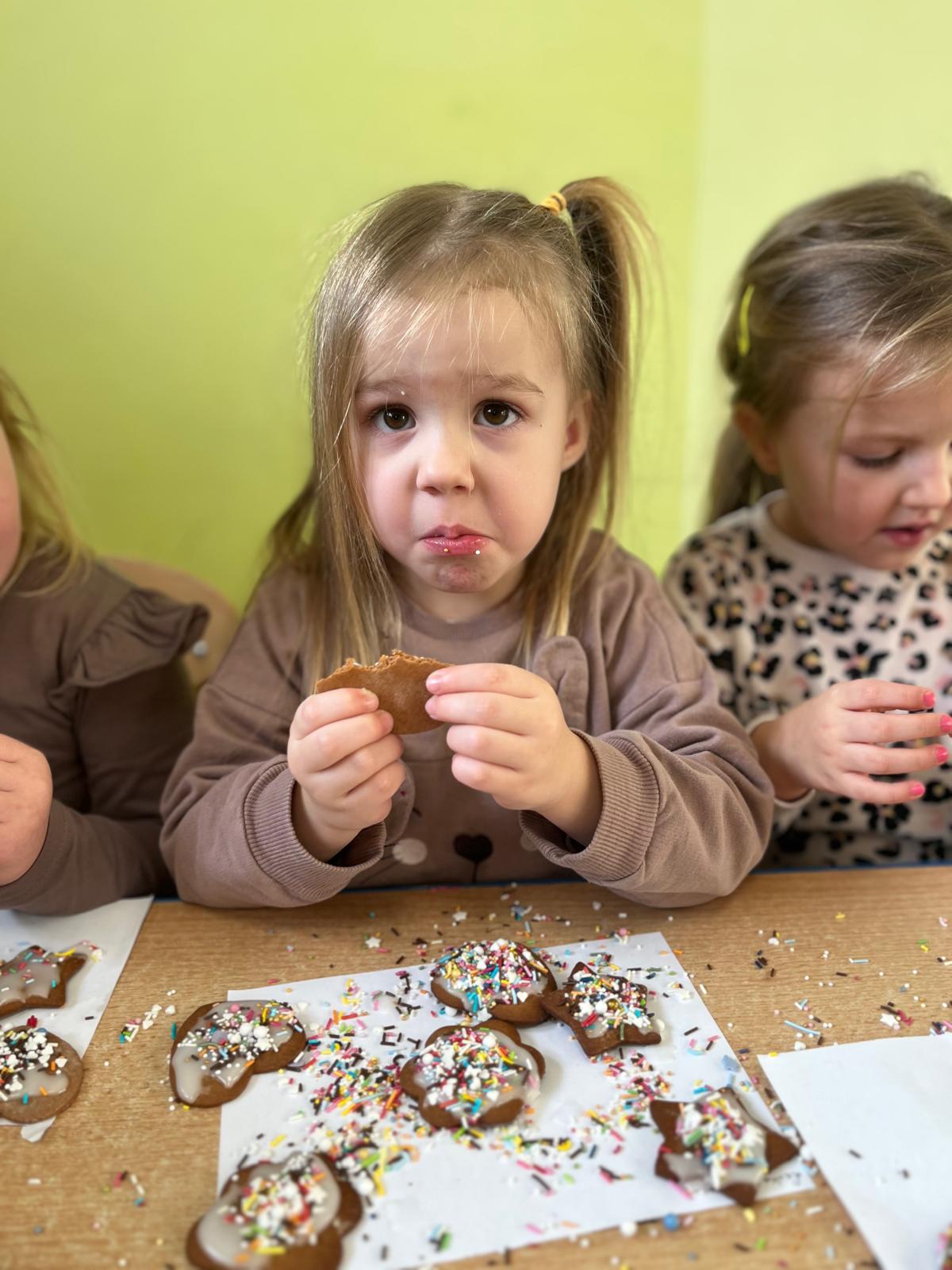 W minionym tygodniu w naszym przedszkolu odbyło się pieczenie pierniczków. Dzieci z poszczególnych grup z ogromnym zaangażowaniem brały udział w przygotowaniach – wałkowały ciasto, wykrawały pierniczki w różnych kształtach oraz ozdabiały je lukrem i kolorowymi posypkami. Zajęcia sprawiły przedszkolakom wiele radości, a jednocześnie były doskonałą okazją do rozwijania sprawności manualnej, samodzielności oraz współpracy w grupie. W całym przedszkolu unosił się przyjemny zapach korzennych przypraw, który wprowadził wszystkich w świąteczny nastrój. Wspólne pieczenie pierniczków było nie tylko świetną zabawą, ale również cennym doświadczeniem edukacyjnym.