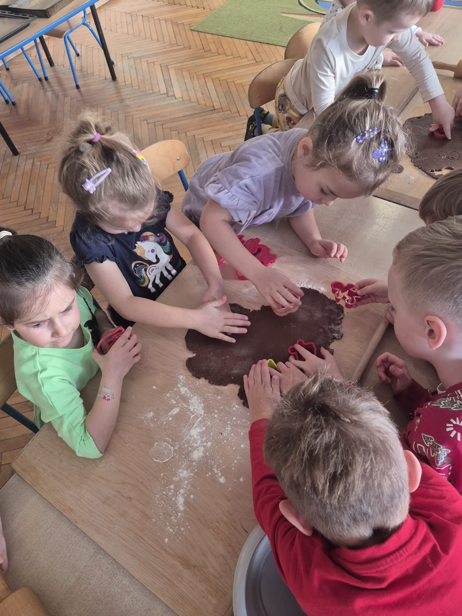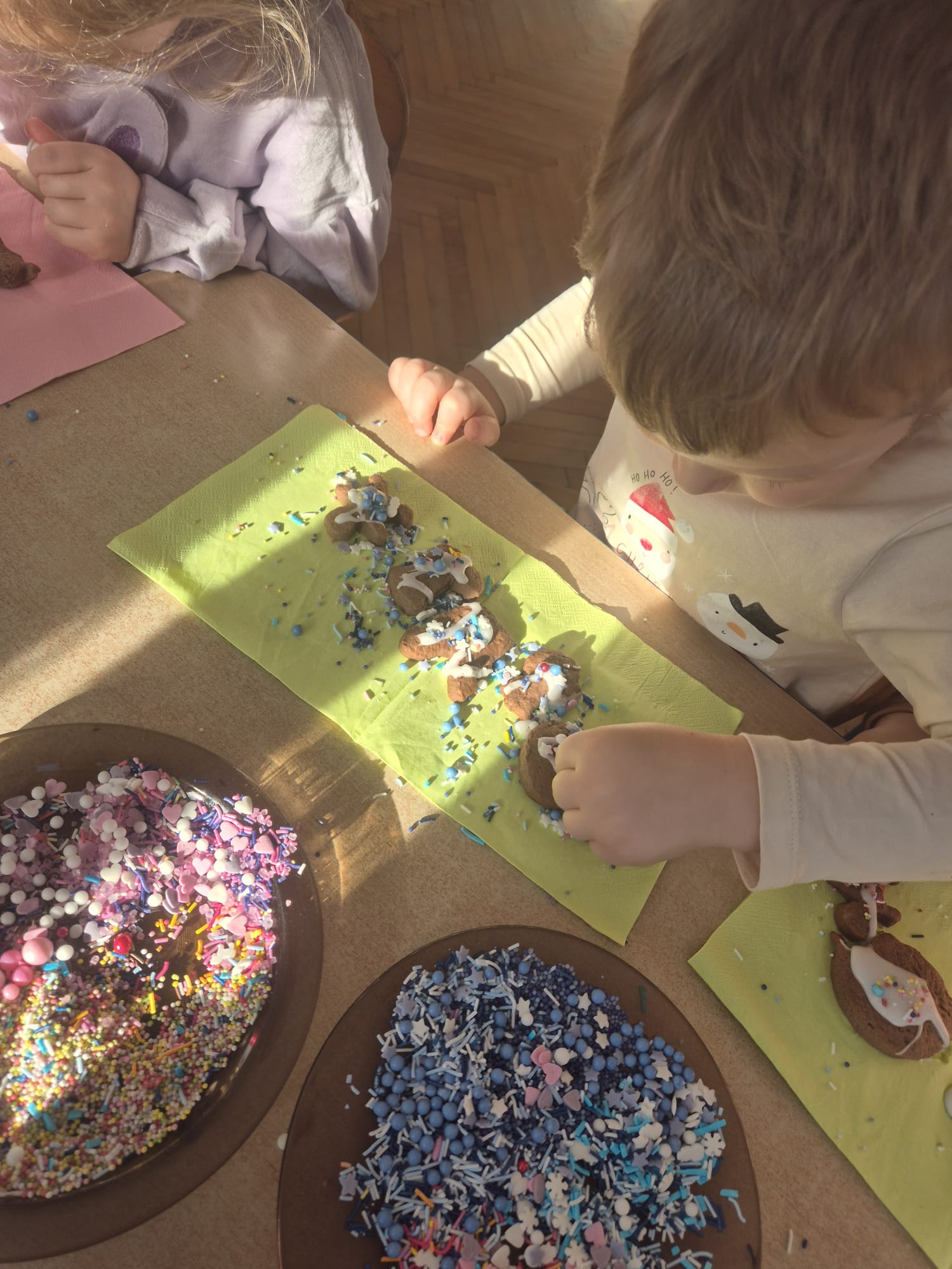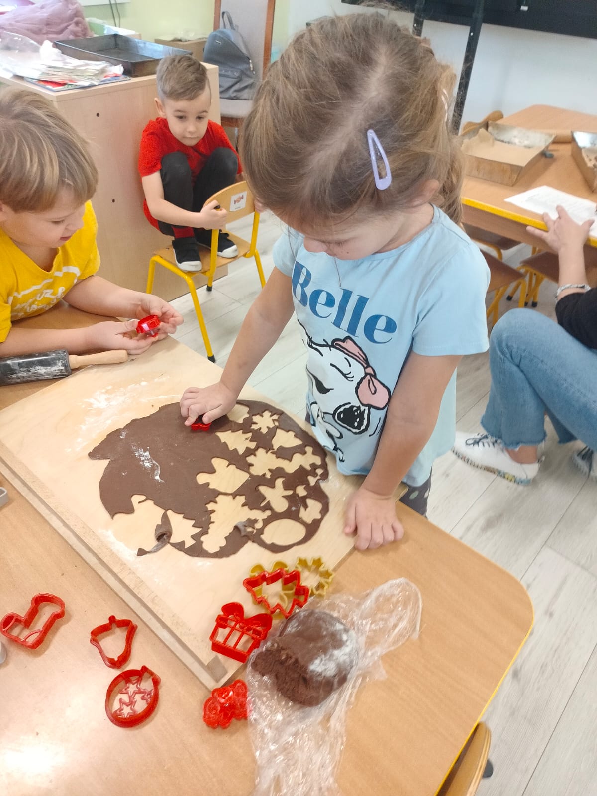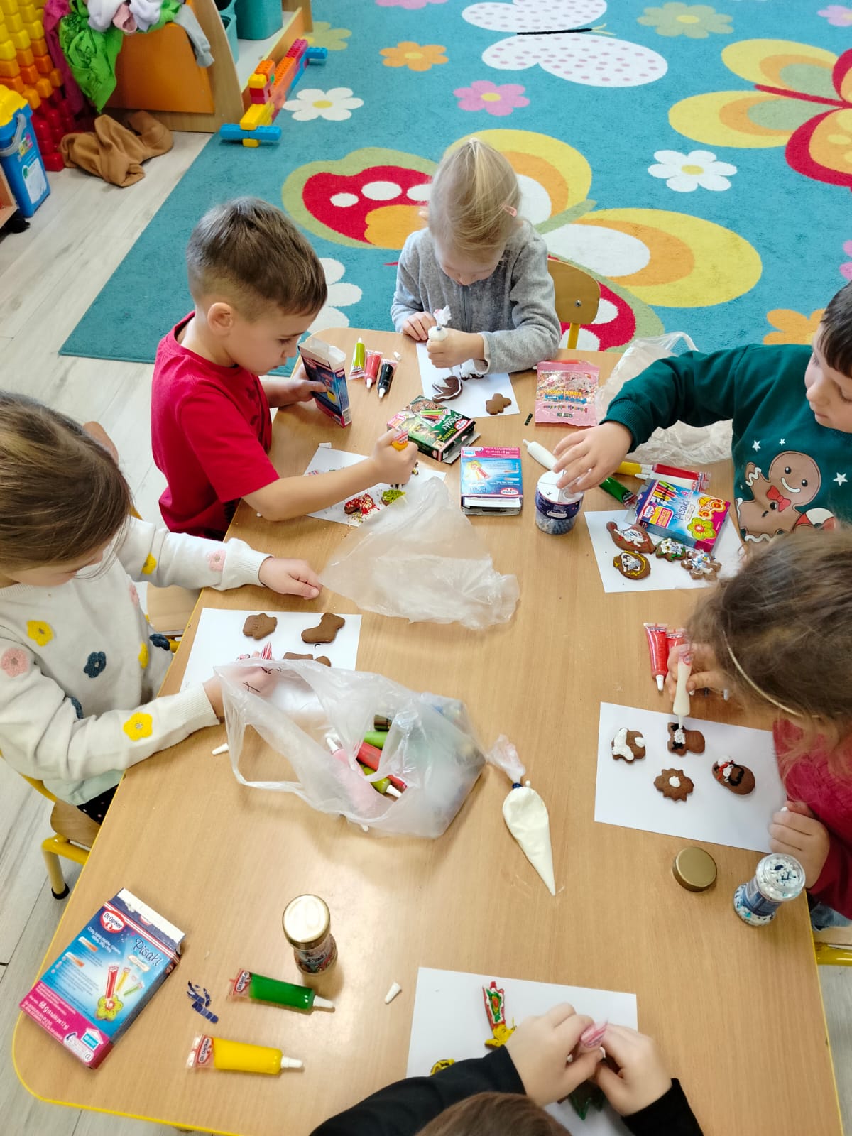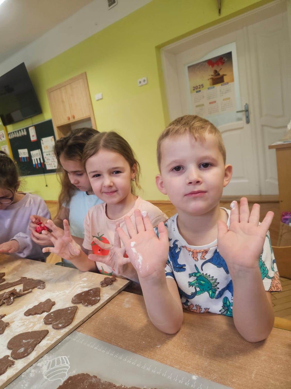 W minionym tygodniu w naszym przedszkolu odbyło się pieczenie pierniczków. Dzieci z poszczególnych grup z ogromnym zaangażowaniem brały udział w przygotowaniach – wałkowały ciasto, wykrawały pierniczki w różnych kształtach oraz ozdabiały je lukrem i kolorowymi posypkami. Zajęcia sprawiły przedszkolakom wiele radości, a jednocześnie były doskonałą okazją do rozwijania sprawności manualnej, samodzielności oraz współpracy w grupie. W całym przedszkolu unosił się przyjemny zapach korzennych przypraw, który wprowadził wszystkich w świąteczny nastrój. Wspólne pieczenie pierniczków było nie tylko świetną zabawą, ale również cennym doświadczeniem edukacyjnym.
