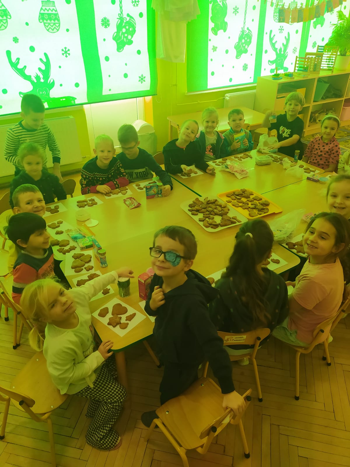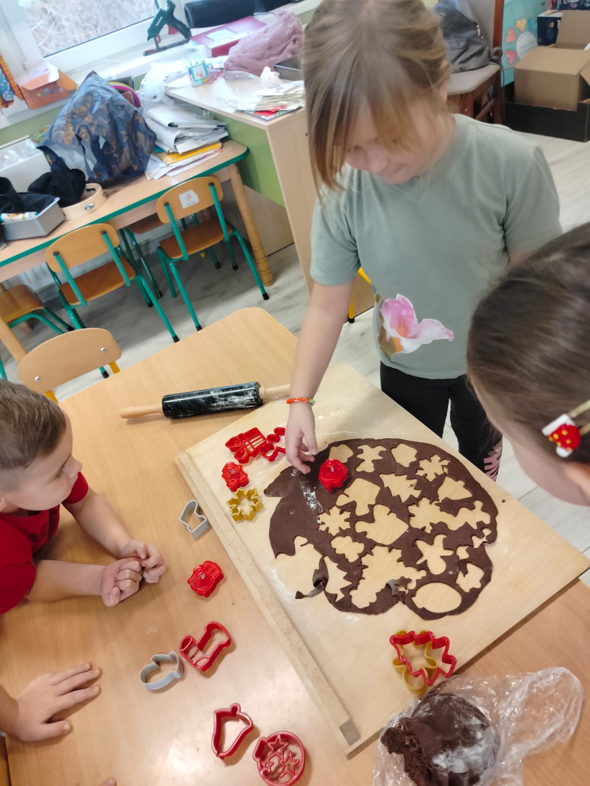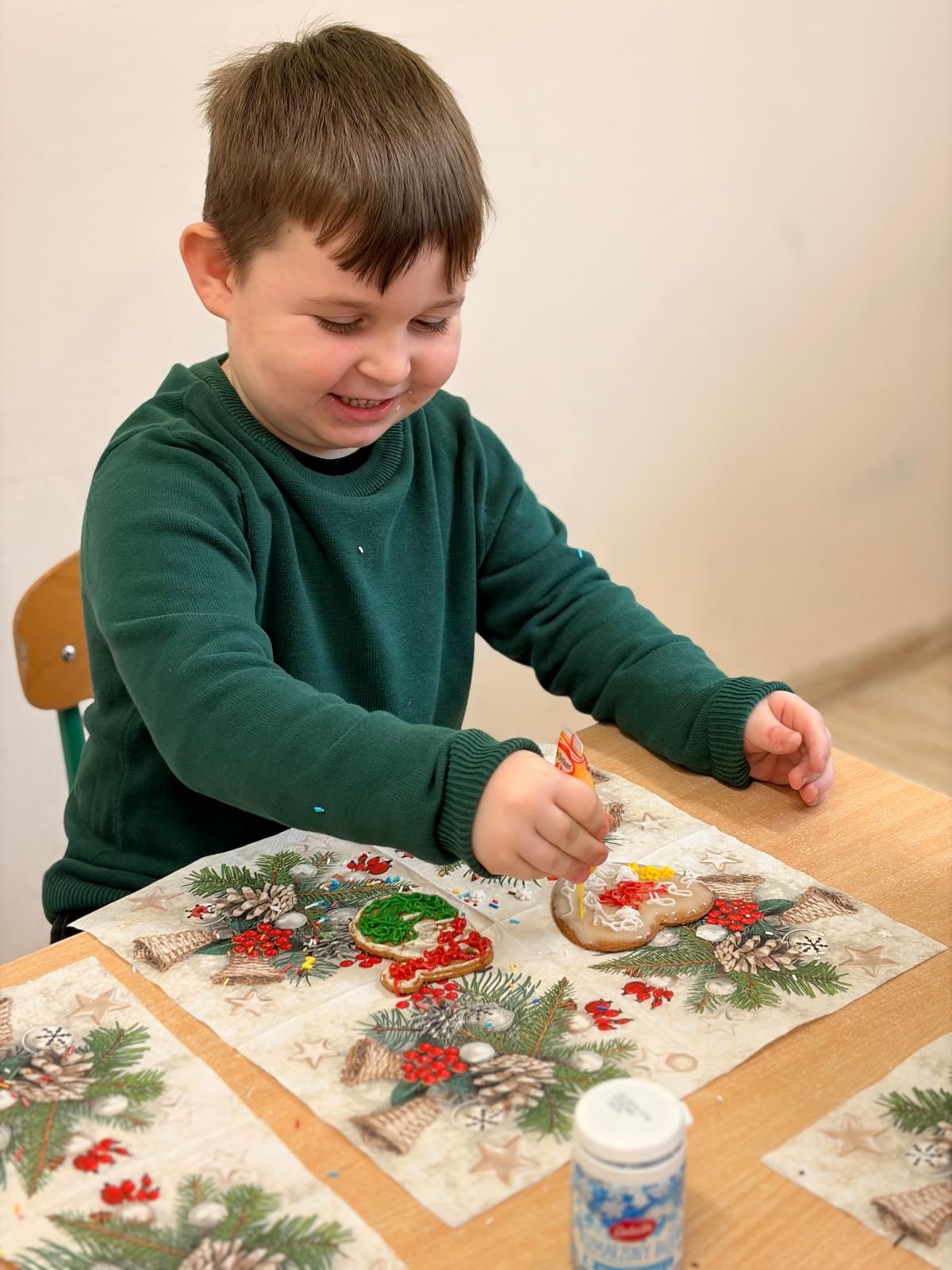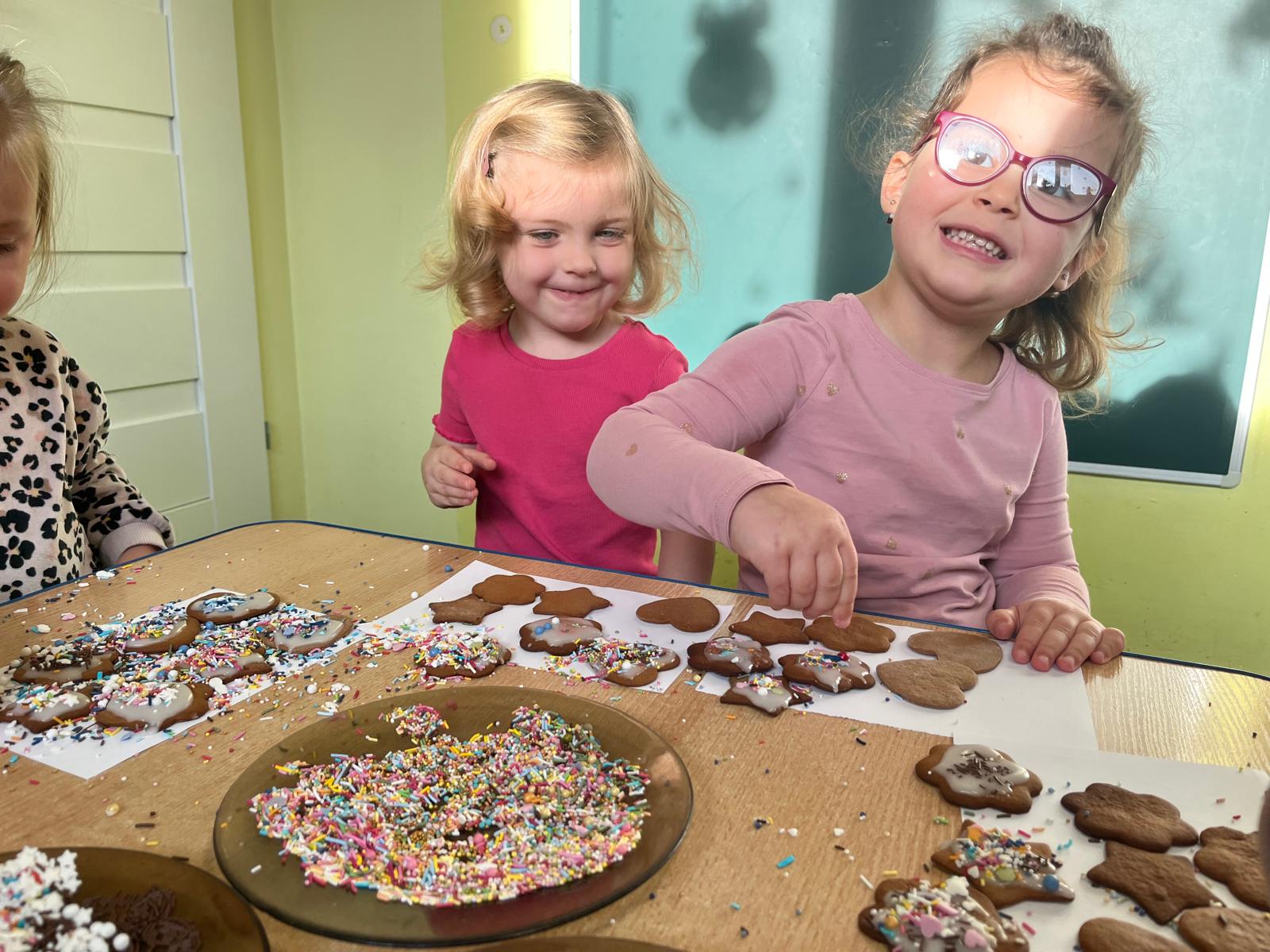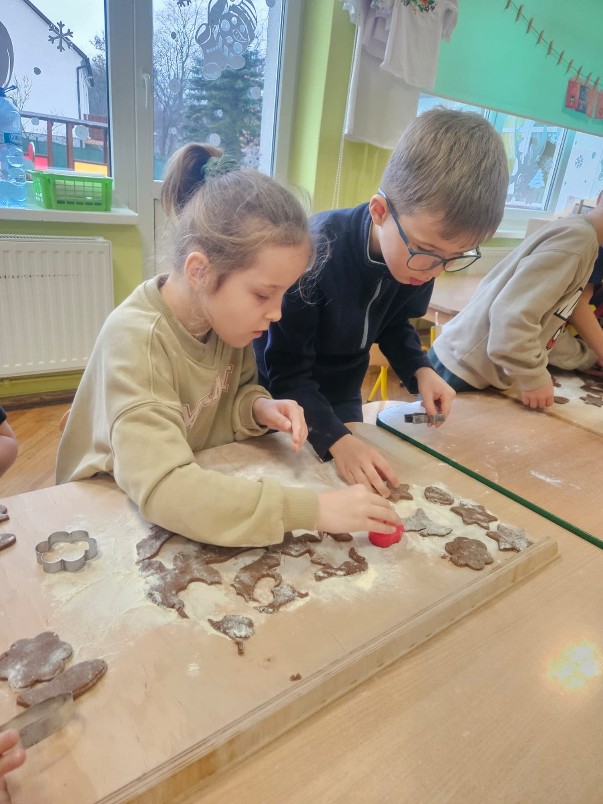 W minionym tygodniu w naszym przedszkolu odbyło się pieczenie pierniczków. Dzieci z poszczególnych grup z ogromnym zaangażowaniem brały udział w przygotowaniach – wałkowały ciasto, wykrawały pierniczki w różnych kształtach oraz ozdabiały je lukrem i kolorowymi posypkami. Zajęcia sprawiły przedszkolakom wiele radości, a jednocześnie były doskonałą okazją do rozwijania sprawności manualnej, samodzielności oraz współpracy w grupie. W całym przedszkolu unosił się przyjemny zapach korzennych przypraw, który wprowadził wszystkich w świąteczny nastrój. Wspólne pieczenie pierniczków było nie tylko świetną zabawą, ale również cennym doświadczeniem edukacyjnym.