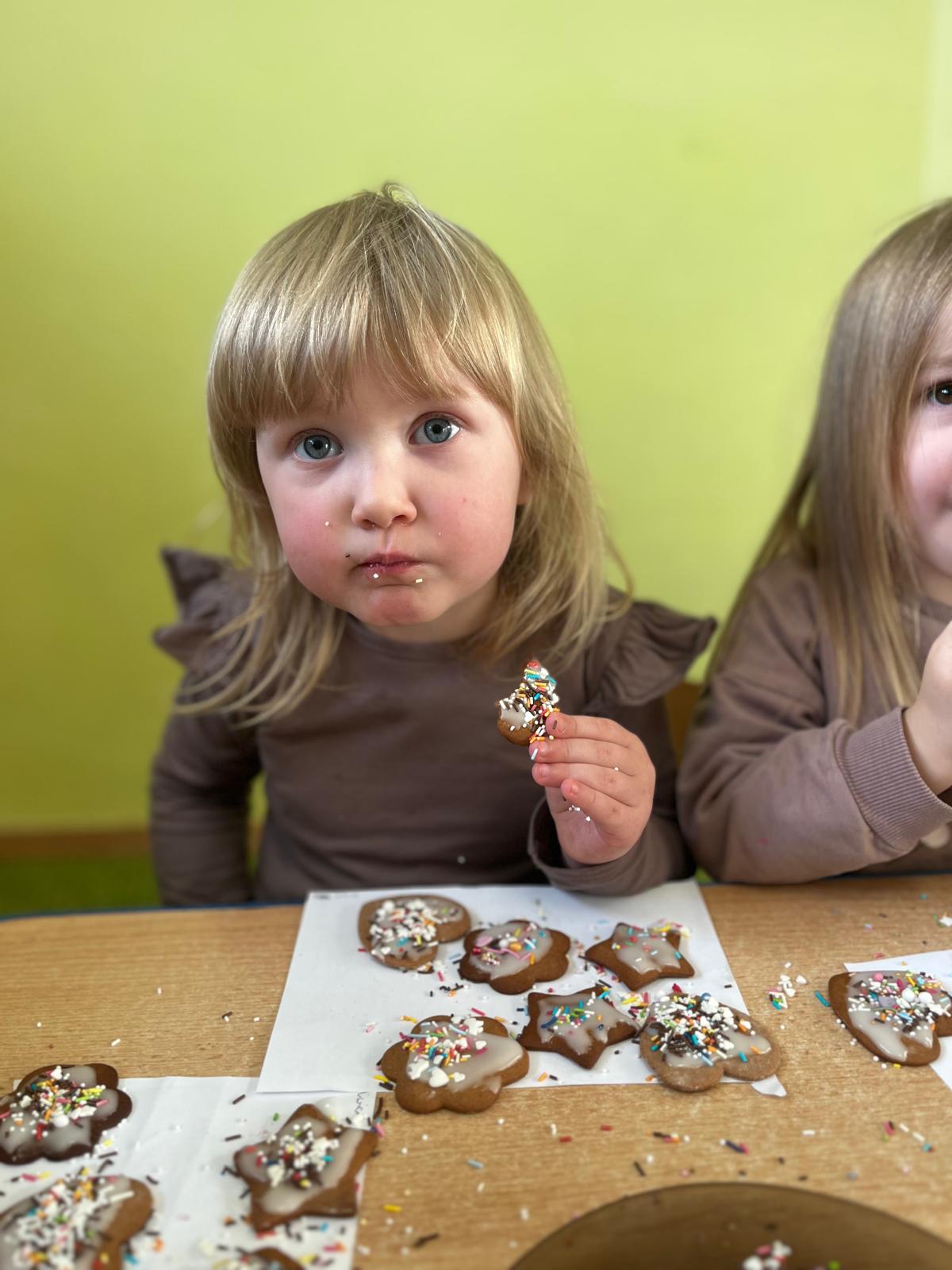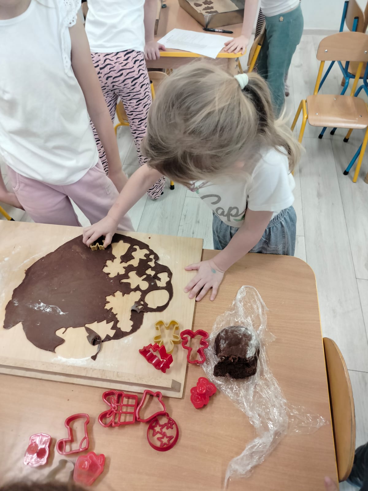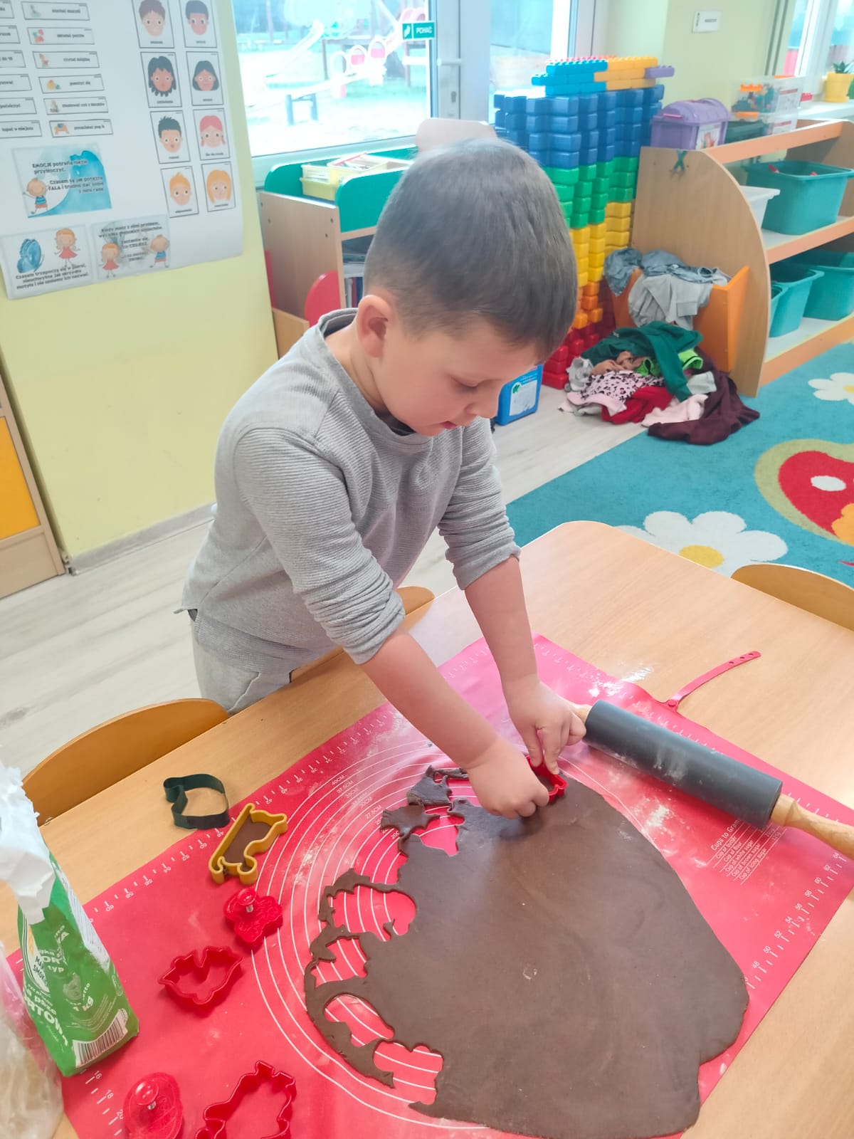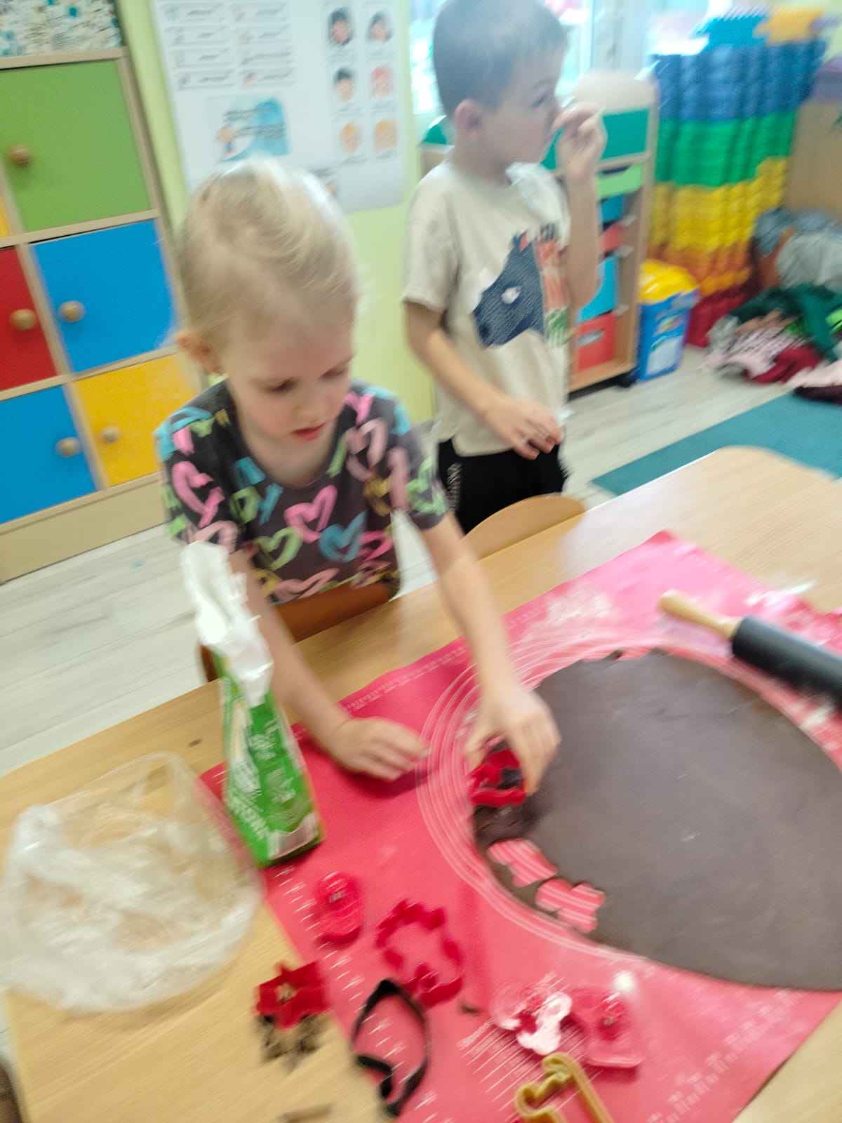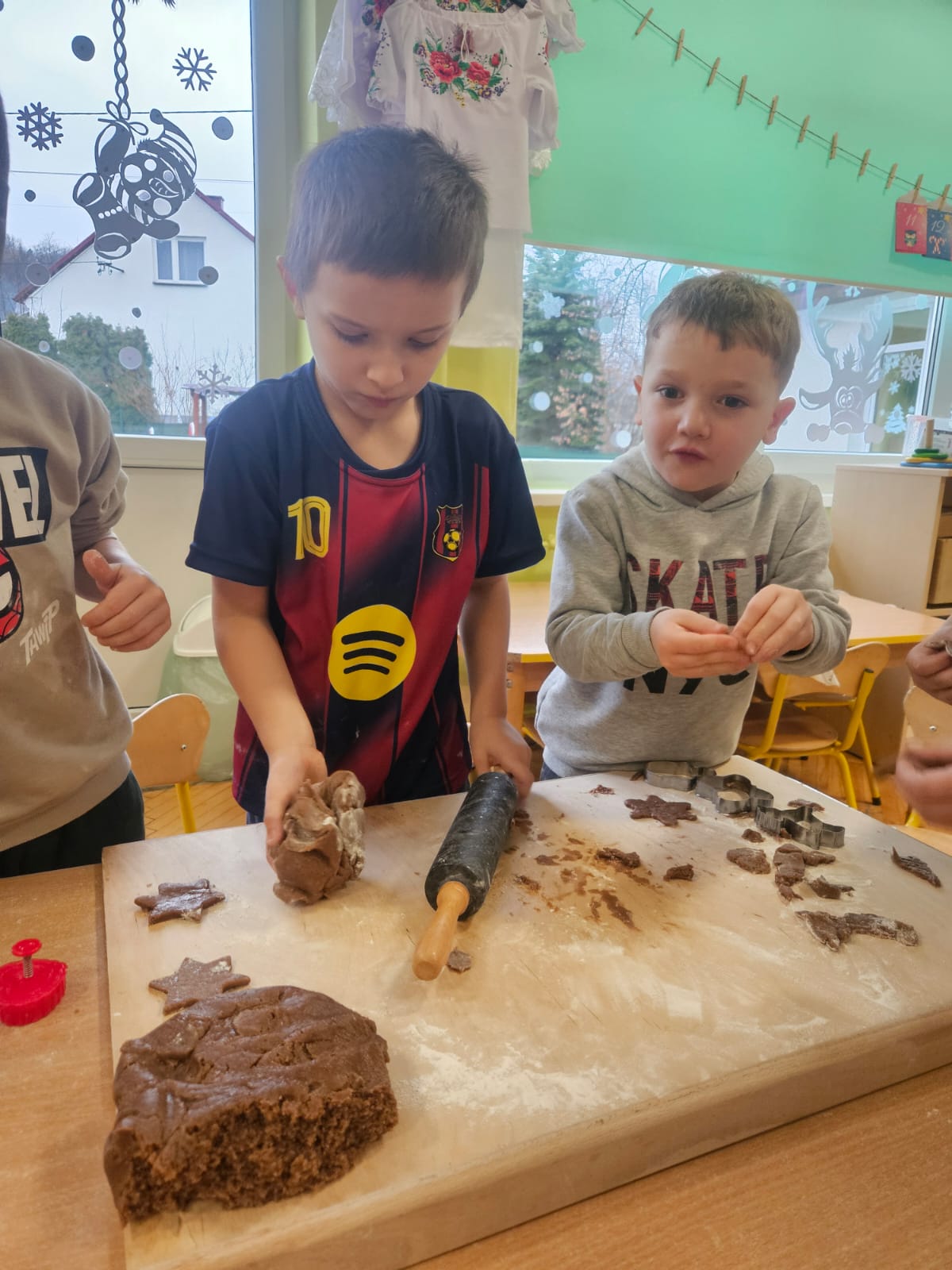 W minionym tygodniu w naszym przedszkolu odbyło się pieczenie pierniczków. Dzieci z poszczególnych grup z ogromnym zaangażowaniem brały udział w przygotowaniach – wałkowały ciasto, wykrawały pierniczki w różnych kształtach oraz ozdabiały je lukrem i kolorowymi posypkami. Zajęcia sprawiły przedszkolakom wiele radości, a jednocześnie były doskonałą okazją do rozwijania sprawności manualnej, samodzielności oraz współpracy w grupie. W całym przedszkolu unosił się przyjemny zapach korzennych przypraw, który wprowadził wszystkich w świąteczny nastrój. Wspólne pieczenie pierniczków było nie tylko świetną zabawą, ale również cennym doświadczeniem edukacyjnym.