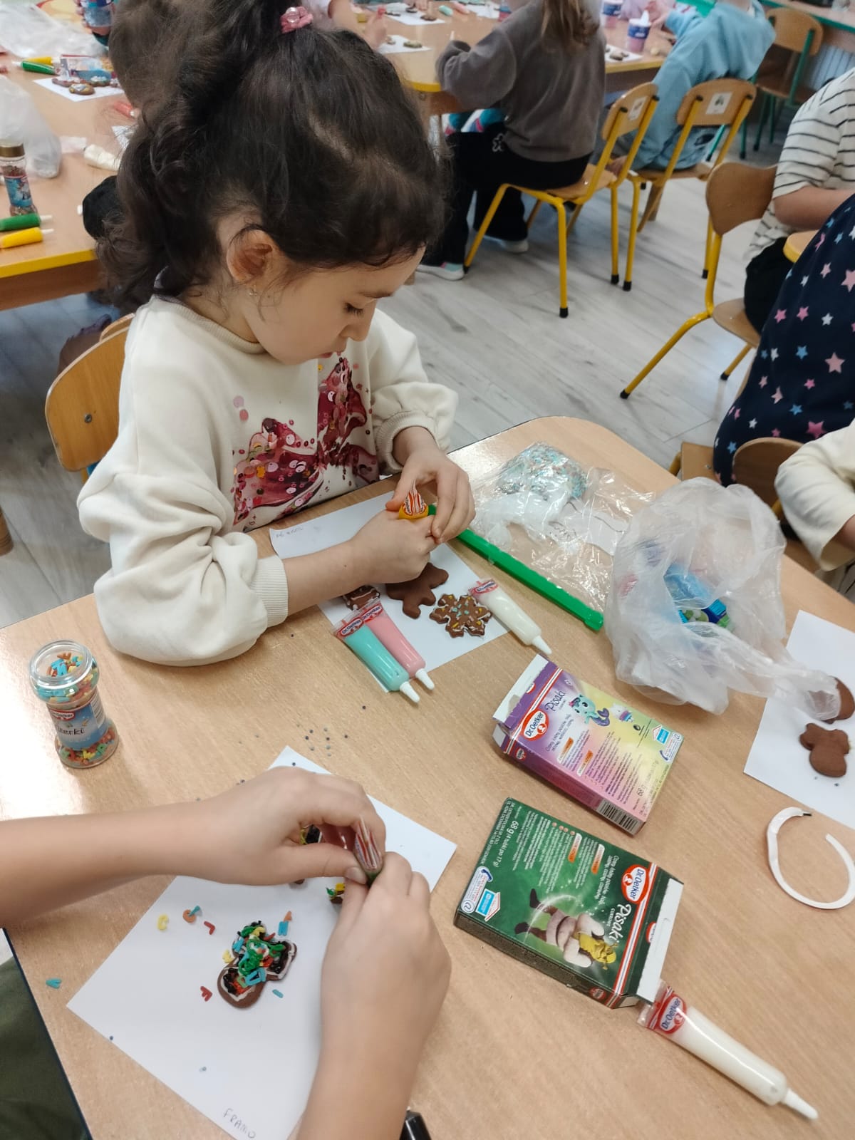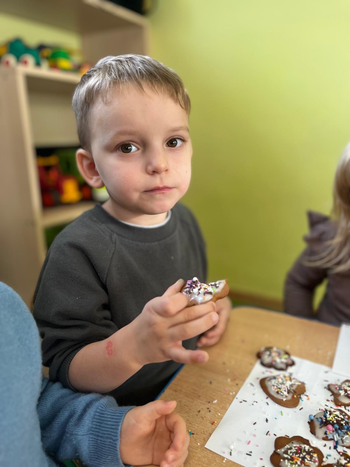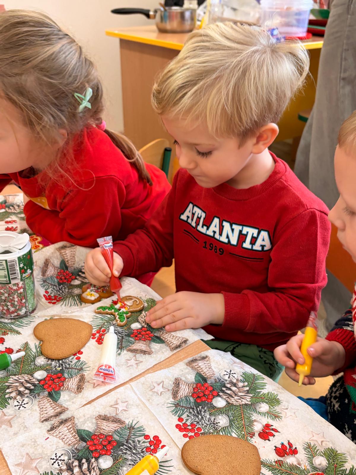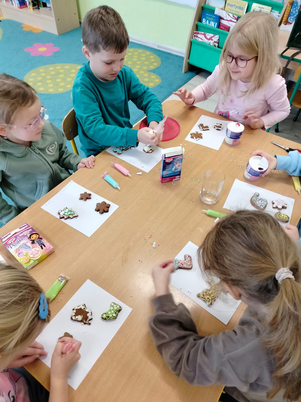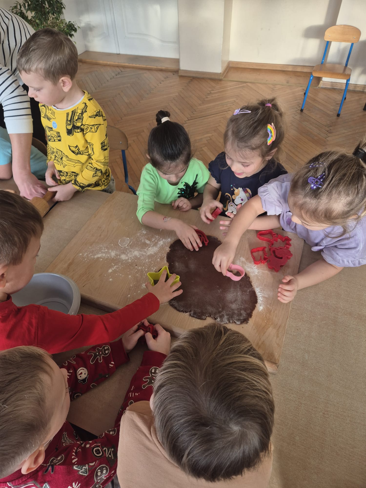 W minionym tygodniu w naszym przedszkolu odbyło się pieczenie pierniczków. Dzieci z poszczególnych grup z ogromnym zaangażowaniem brały udział w przygotowaniach – wałkowały ciasto, wykrawały pierniczki w różnych kształtach oraz ozdabiały je lukrem i kolorowymi posypkami. Zajęcia sprawiły przedszkolakom wiele radości, a jednocześnie były doskonałą okazją do rozwijania sprawności manualnej, samodzielności oraz współpracy w grupie. W całym przedszkolu unosił się przyjemny zapach korzennych przypraw, który wprowadził wszystkich w świąteczny nastrój. Wspólne pieczenie pierniczków było nie tylko świetną zabawą, ale również cennym doświadczeniem edukacyjnym.