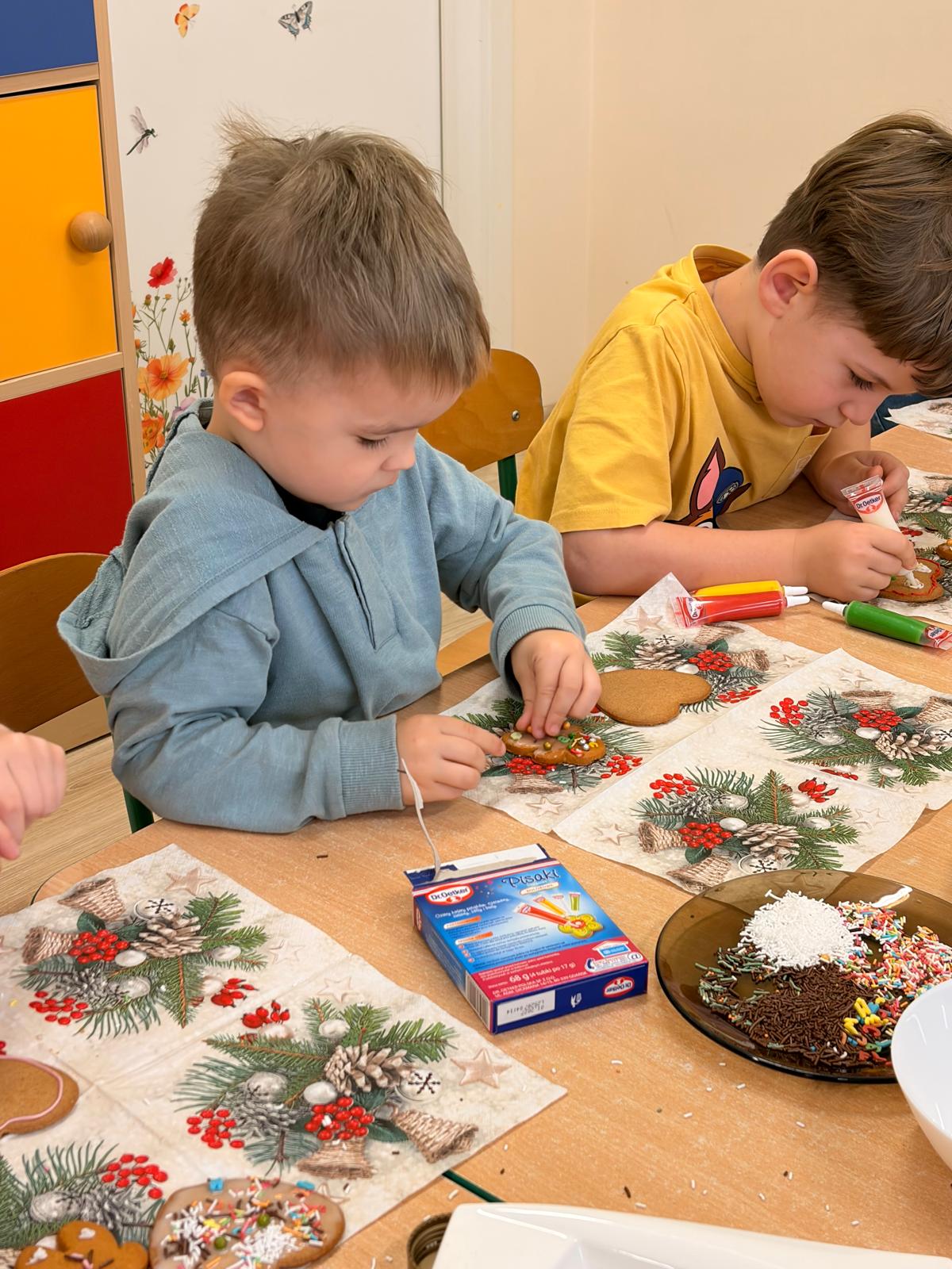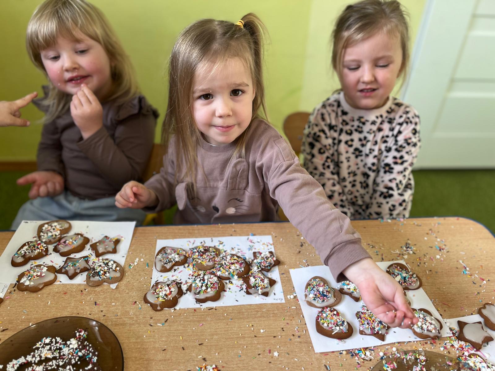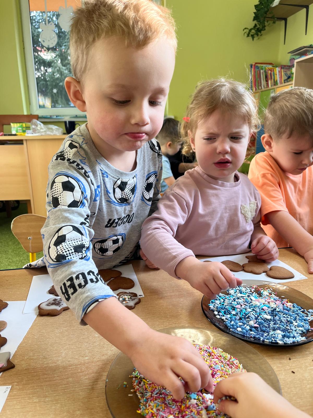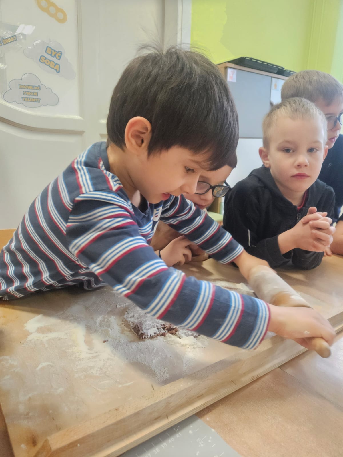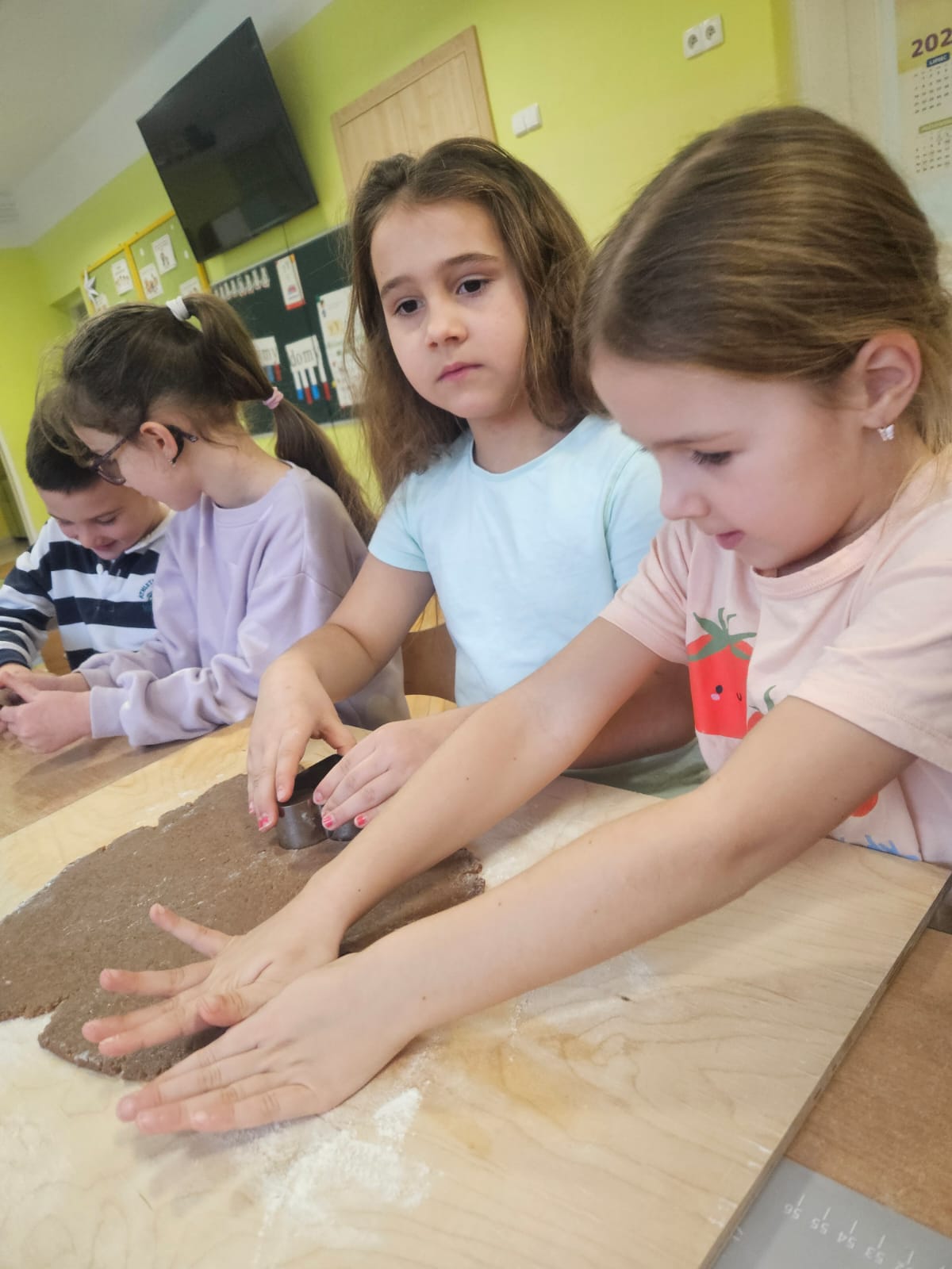 W minionym tygodniu w naszym przedszkolu odbyło się pieczenie pierniczków. Dzieci z poszczególnych grup z ogromnym zaangażowaniem brały udział w przygotowaniach – wałkowały ciasto, wykrawały pierniczki w różnych kształtach oraz ozdabiały je lukrem i kolorowymi posypkami. Zajęcia sprawiły przedszkolakom wiele radości, a jednocześnie były doskonałą okazją do rozwijania sprawności manualnej, samodzielności oraz współpracy w grupie. W całym przedszkolu unosił się przyjemny zapach korzennych przypraw, który wprowadził wszystkich w świąteczny nastrój. Wspólne pieczenie pierniczków było nie tylko świetną zabawą, ale również cennym doświadczeniem edukacyjnym.