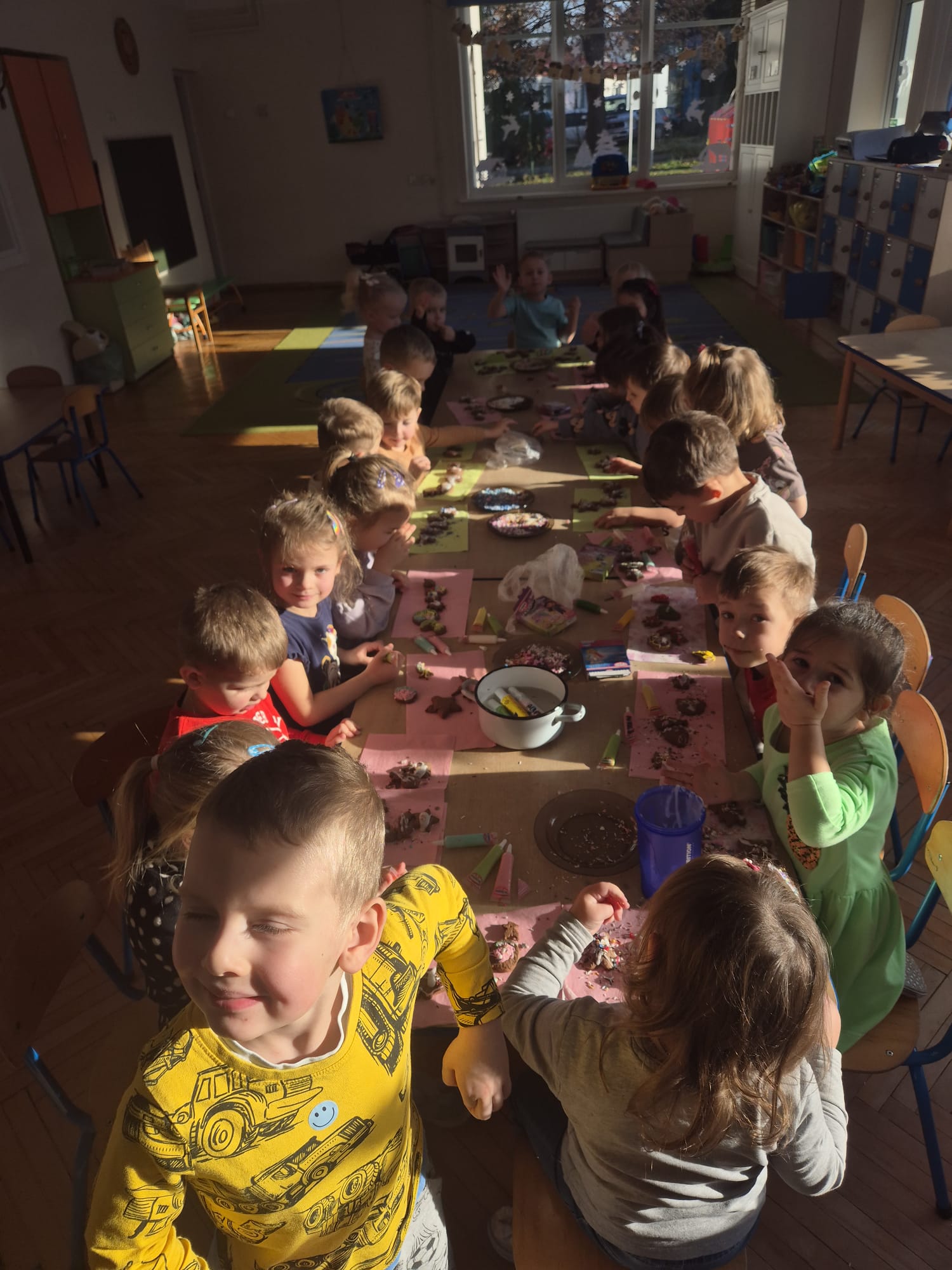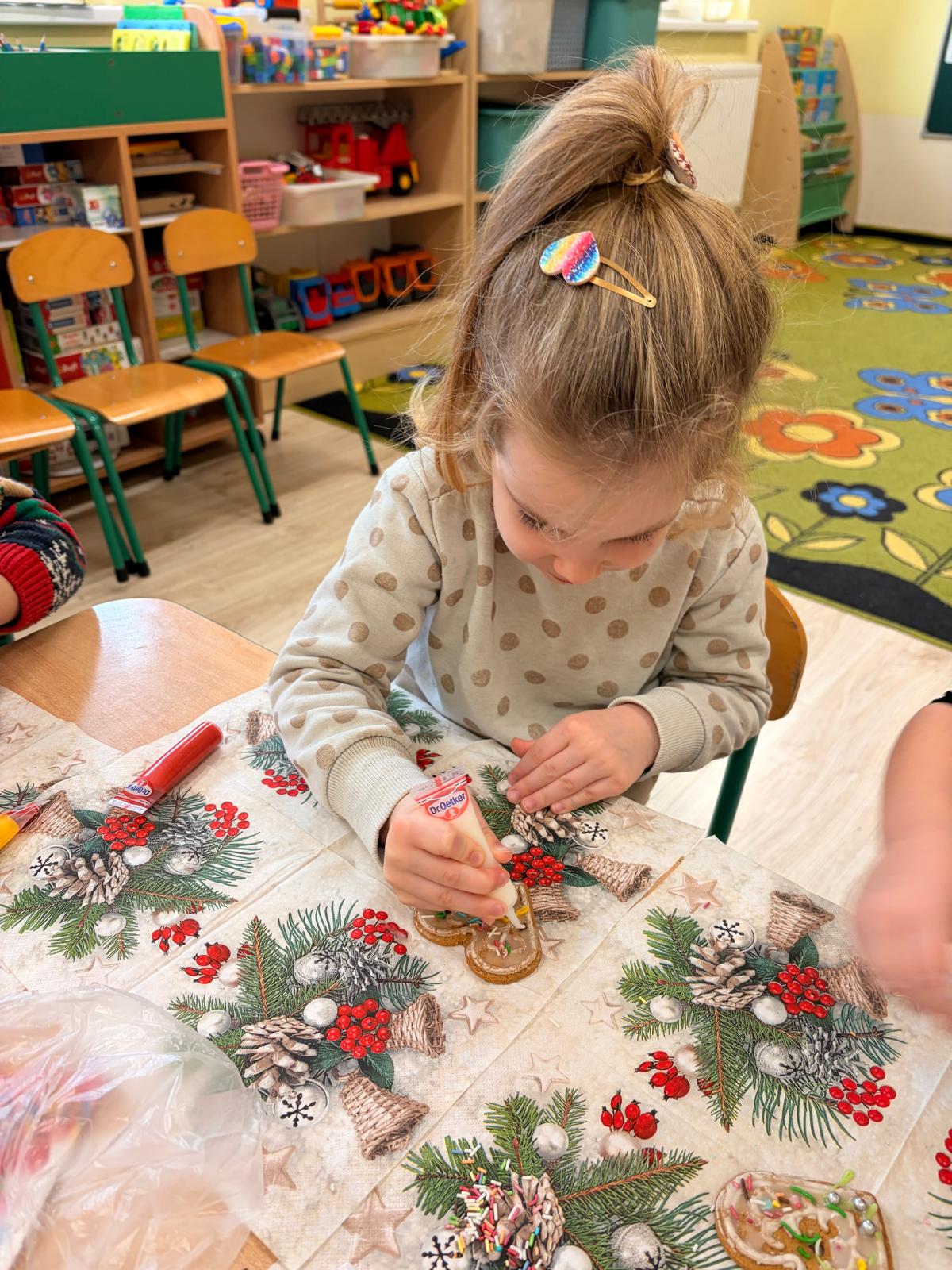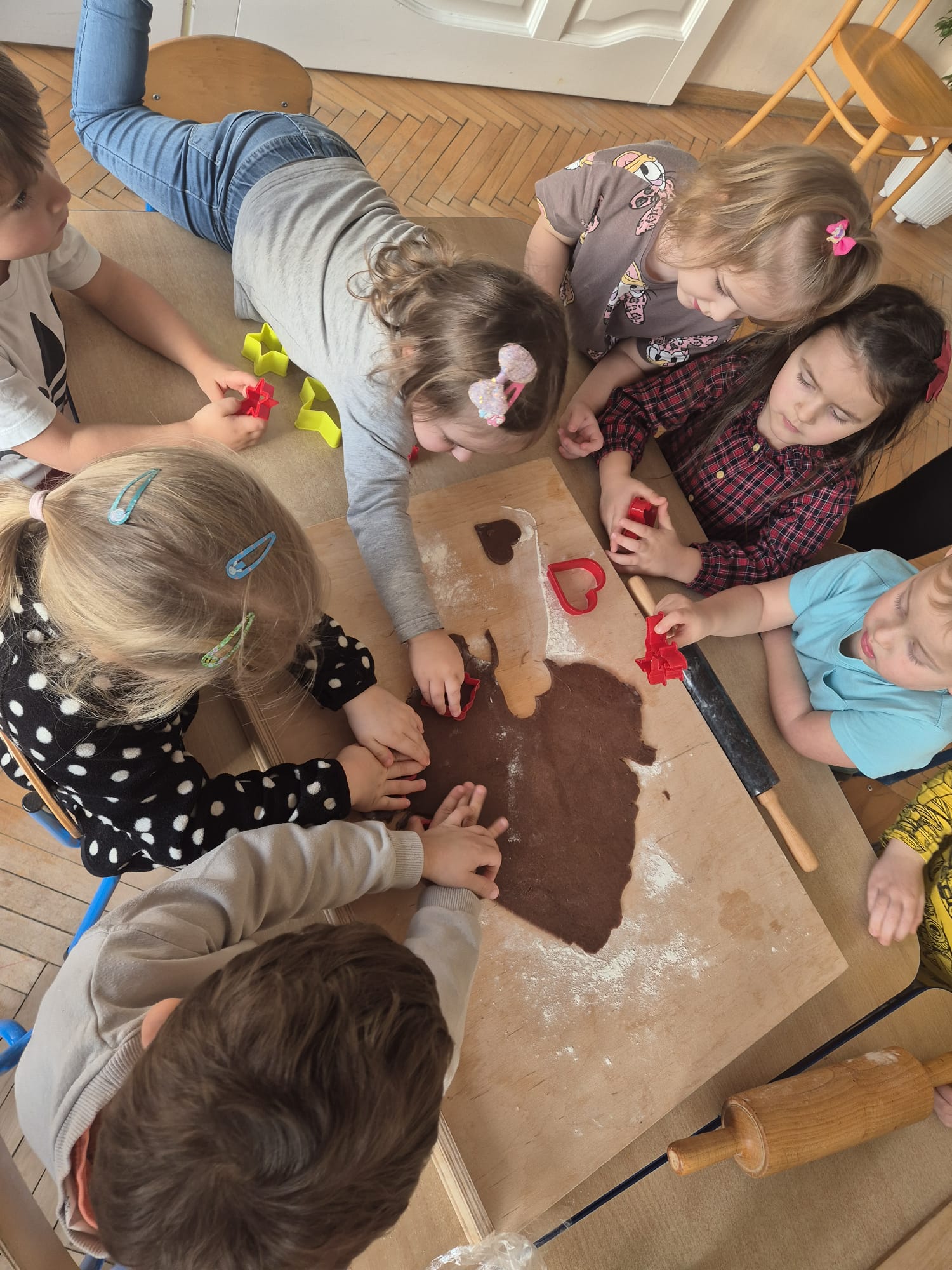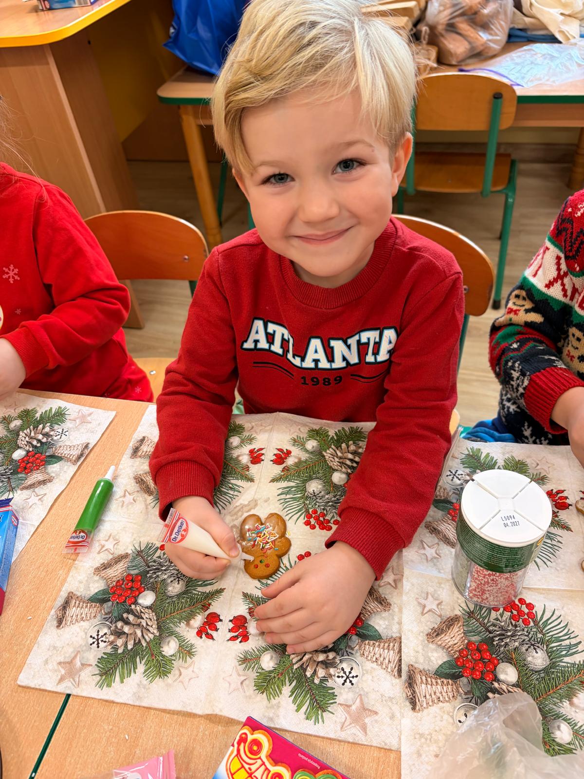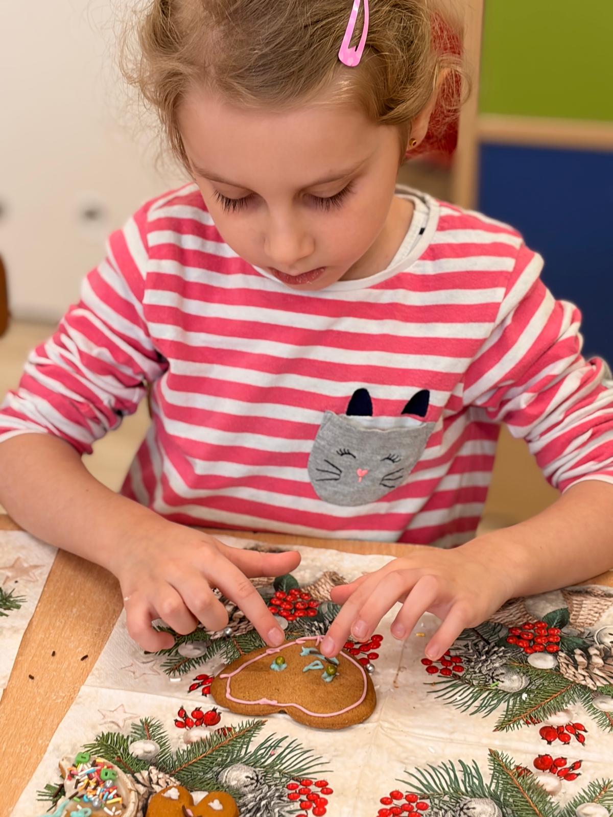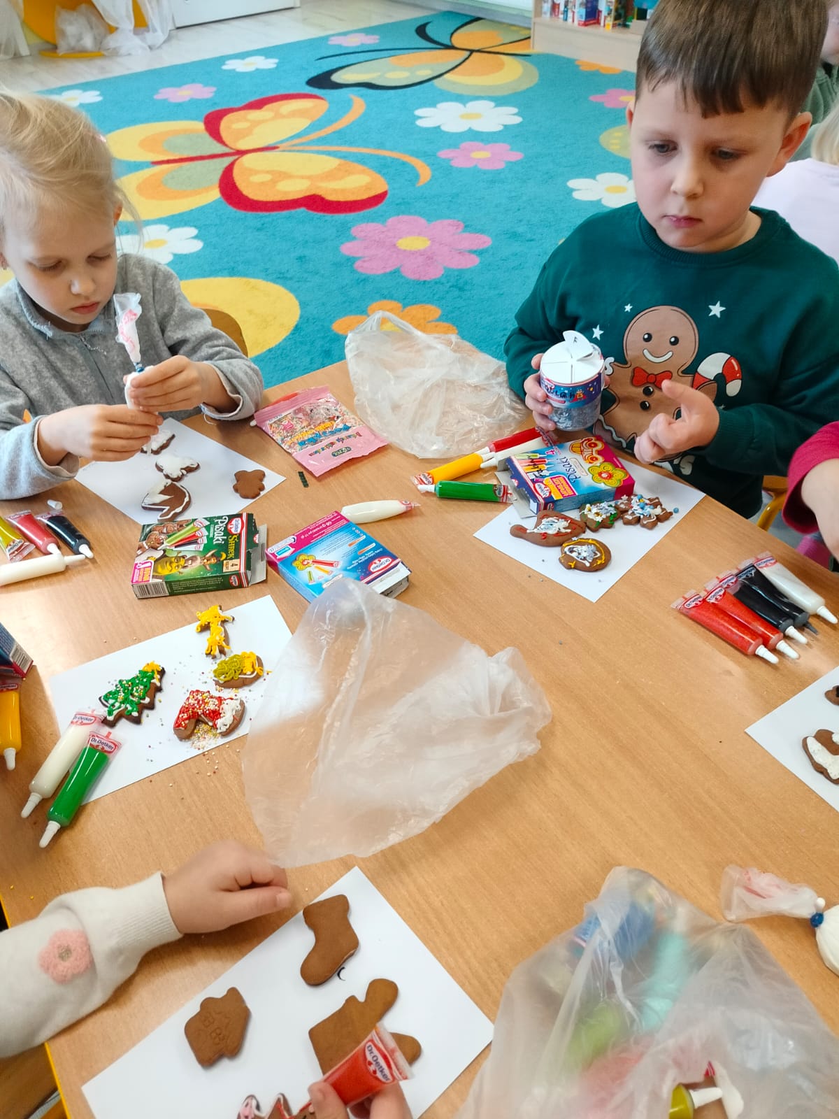 W minionym tygodniu w naszym przedszkolu odbyło się pieczenie pierniczków. Dzieci z poszczególnych grup z ogromnym zaangażowaniem brały udział w przygotowaniach – wałkowały ciasto, wykrawały pierniczki w różnych kształtach oraz ozdabiały je lukrem i kolorowymi posypkami. Zajęcia sprawiły przedszkolakom wiele radości, a jednocześnie były doskonałą okazją do rozwijania sprawności manualnej, samodzielności oraz współpracy w grupie. W całym przedszkolu unosił się przyjemny zapach korzennych przypraw, który wprowadził wszystkich w świąteczny nastrój. Wspólne pieczenie pierniczków było nie tylko świetną zabawą, ale również cennym doświadczeniem edukacyjnym.