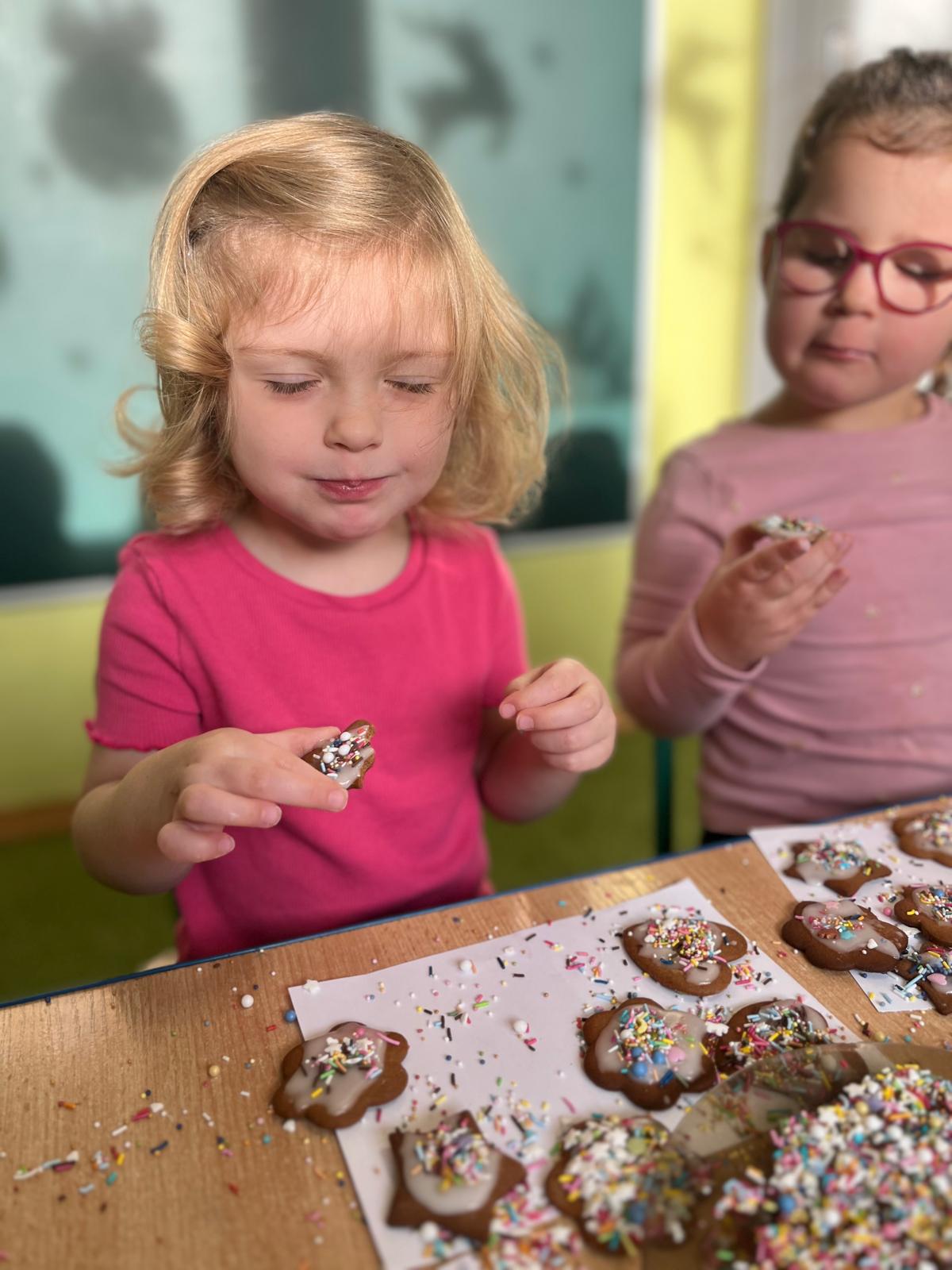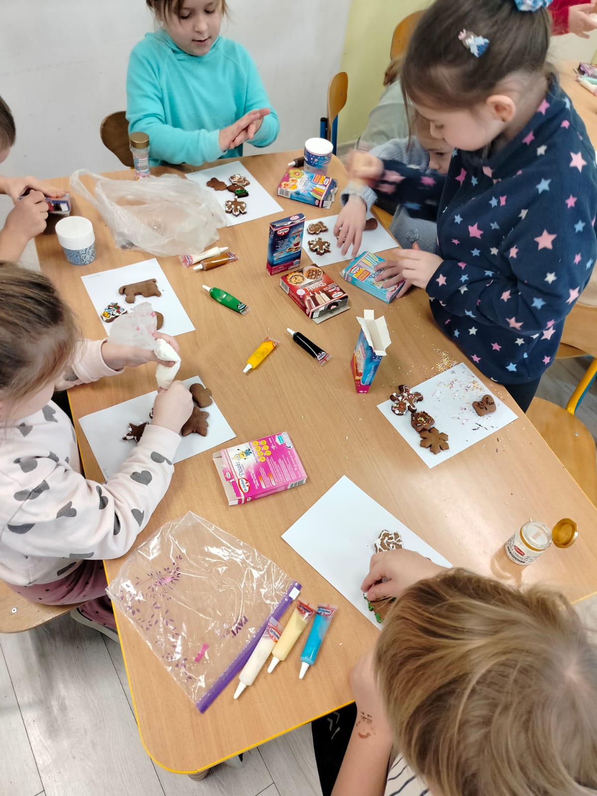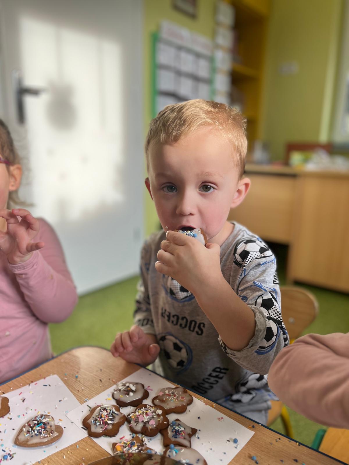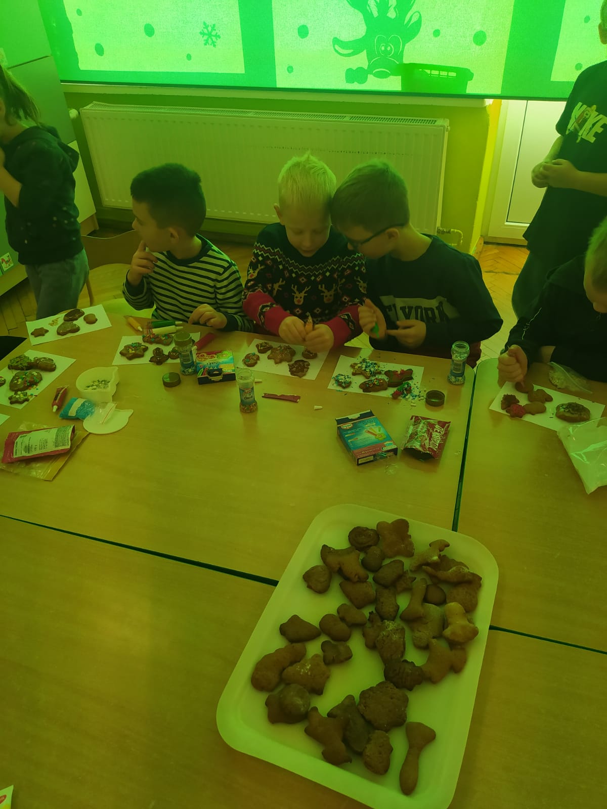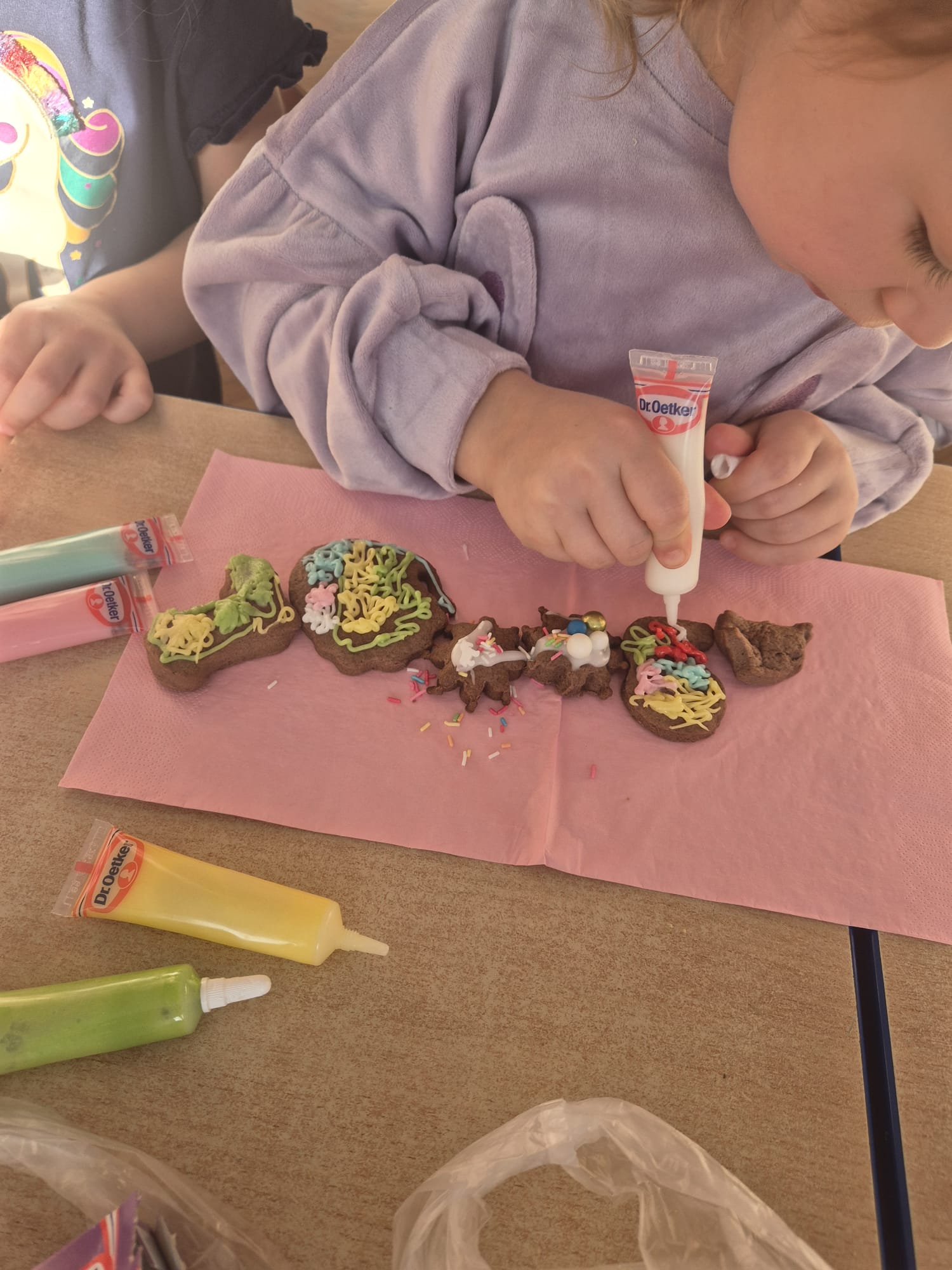 W minionym tygodniu w naszym przedszkolu odbyło się pieczenie pierniczków. Dzieci z poszczególnych grup z ogromnym zaangażowaniem brały udział w przygotowaniach – wałkowały ciasto, wykrawały pierniczki w różnych kształtach oraz ozdabiały je lukrem i kolorowymi posypkami. Zajęcia sprawiły przedszkolakom wiele radości, a jednocześnie były doskonałą okazją do rozwijania sprawności manualnej, samodzielności oraz współpracy w grupie. W całym przedszkolu unosił się przyjemny zapach korzennych przypraw, który wprowadził wszystkich w świąteczny nastrój. Wspólne pieczenie pierniczków było nie tylko świetną zabawą, ale również cennym doświadczeniem edukacyjnym.